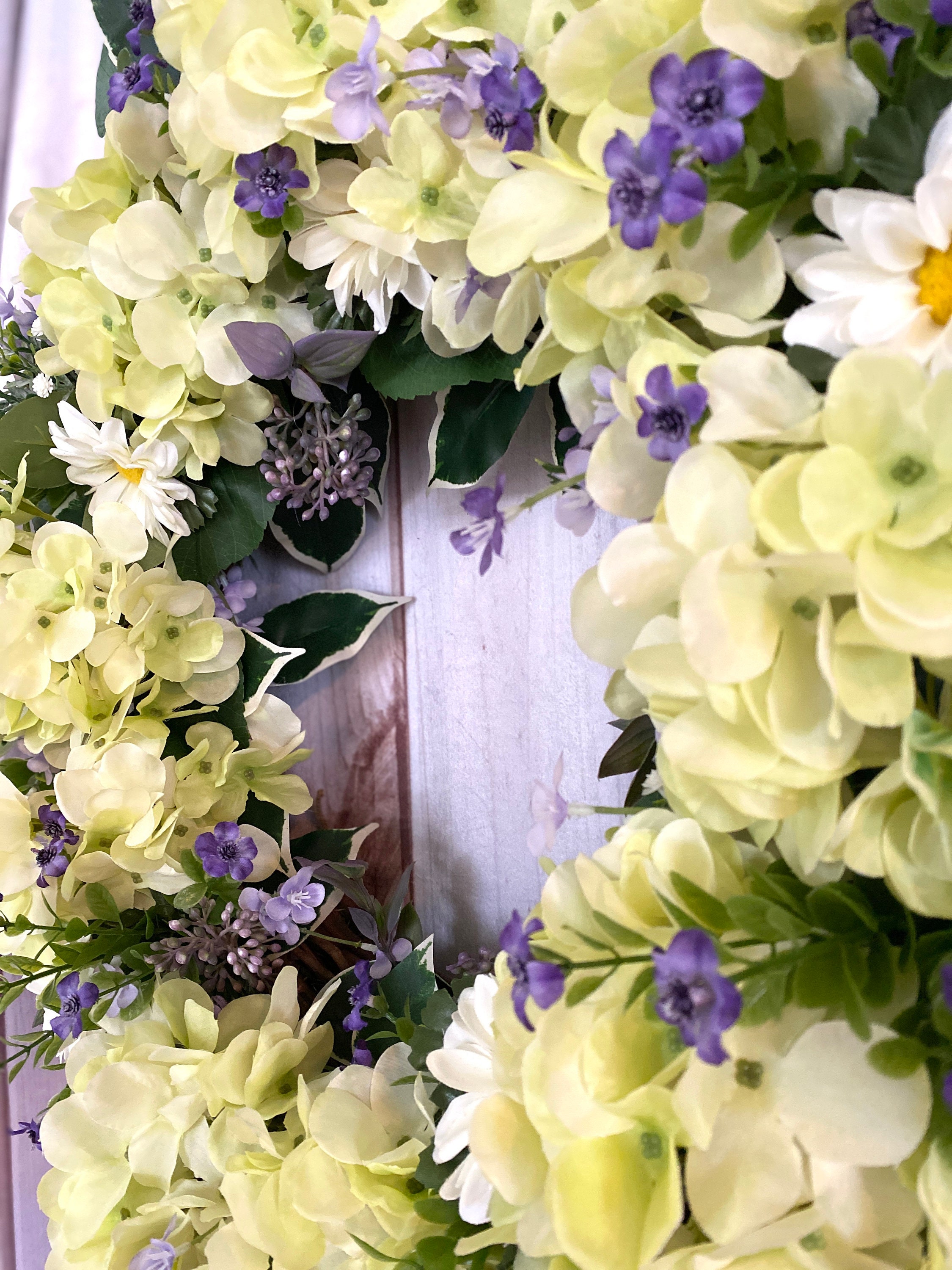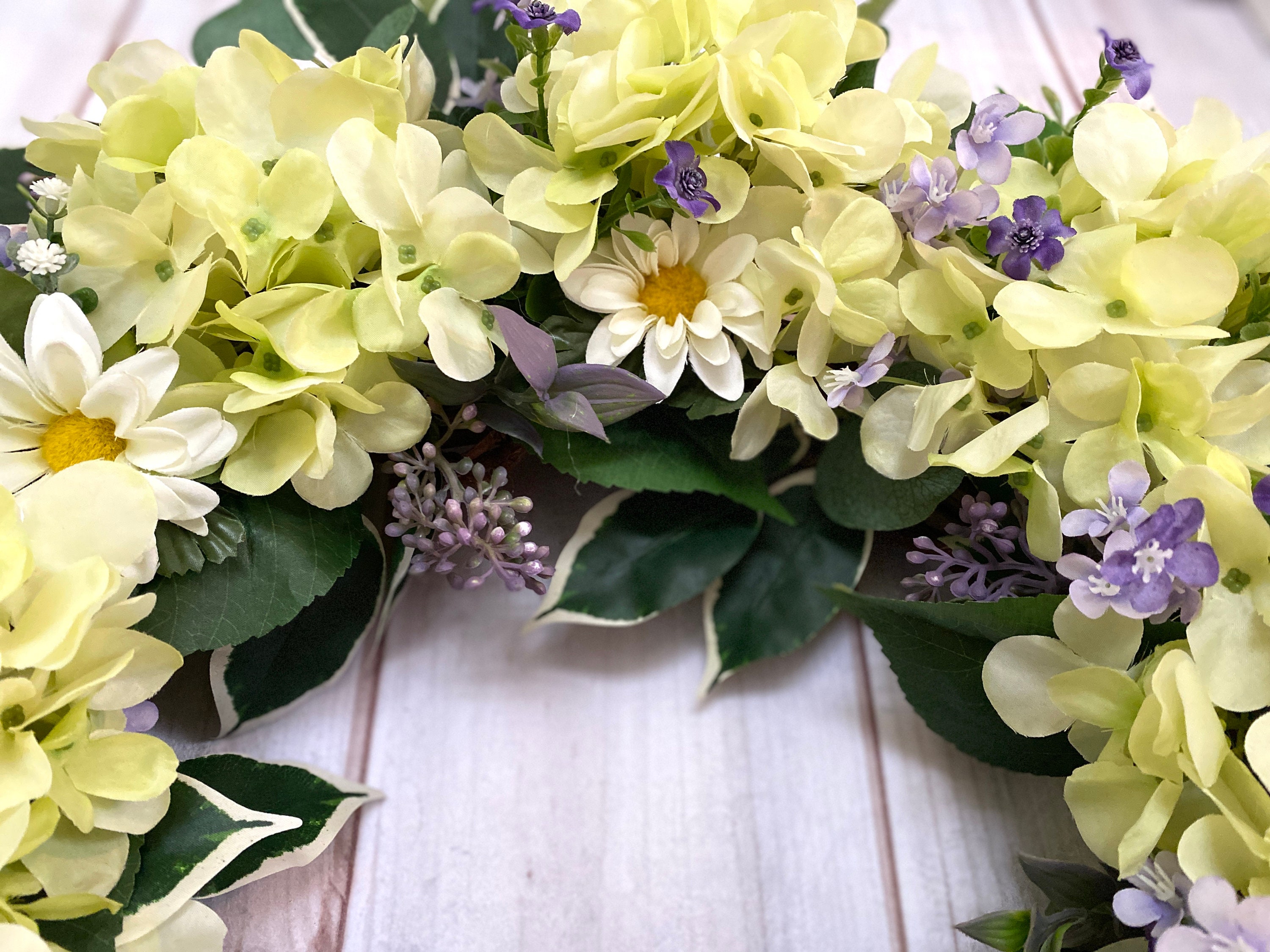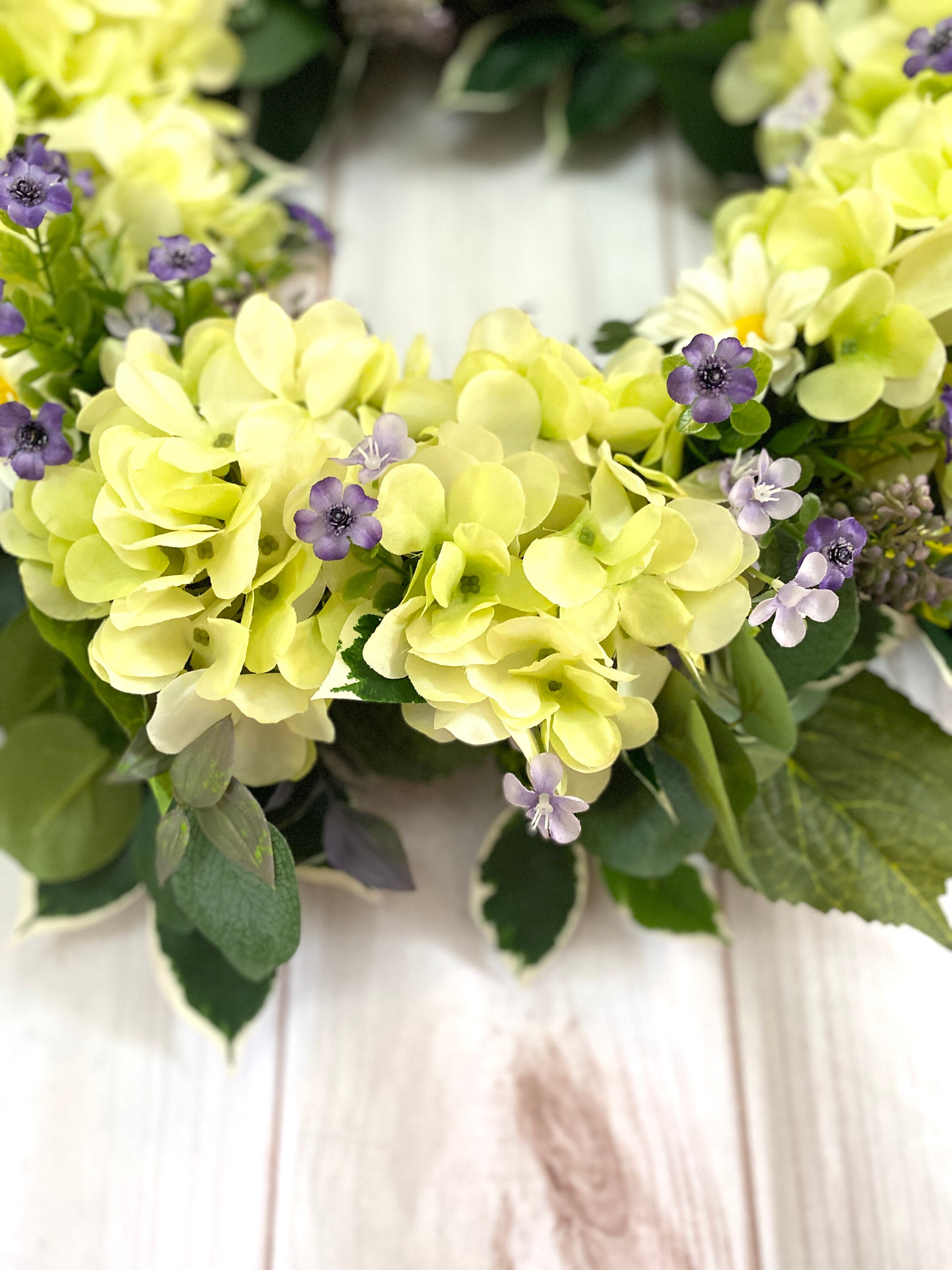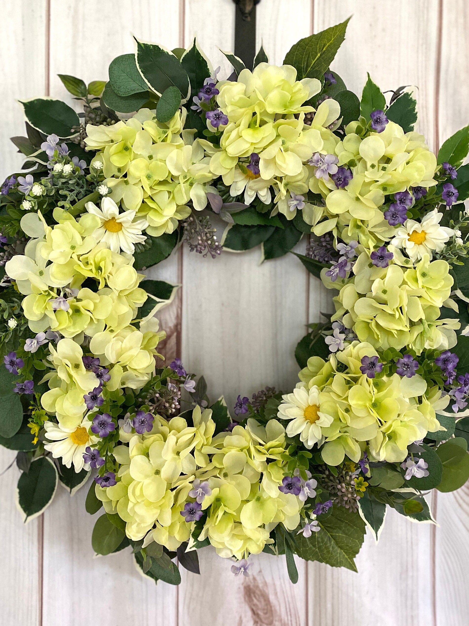 This light green hydrangea flowers are layered on ficus and eucalyptus leaves on an 18" grapevine wreath. Beautifully accented with daisies. MADE TO ORDER - small substitutions may be made and variations may occur. A loop has been added to the back for hanging.