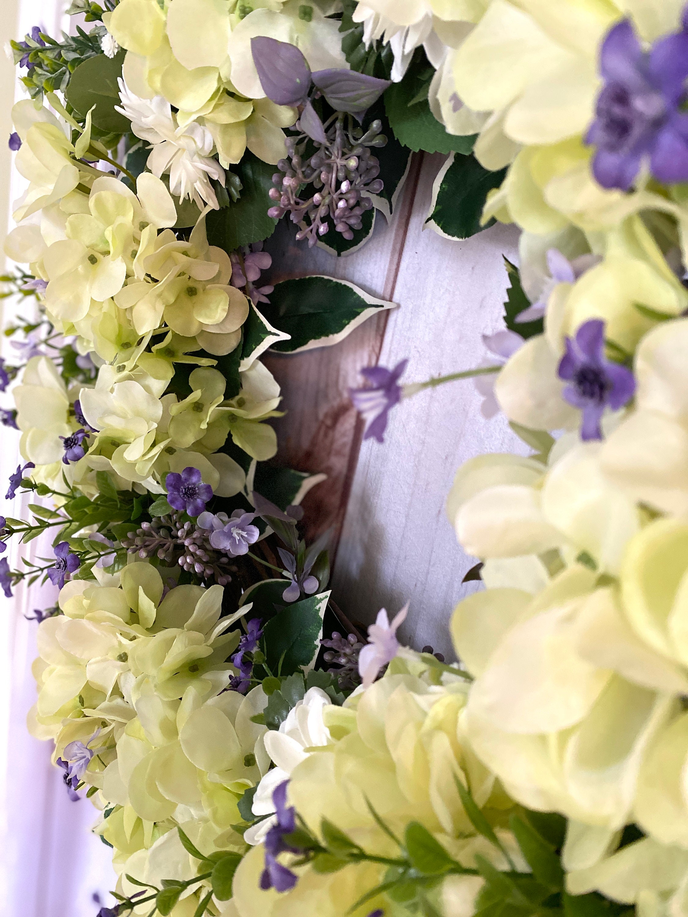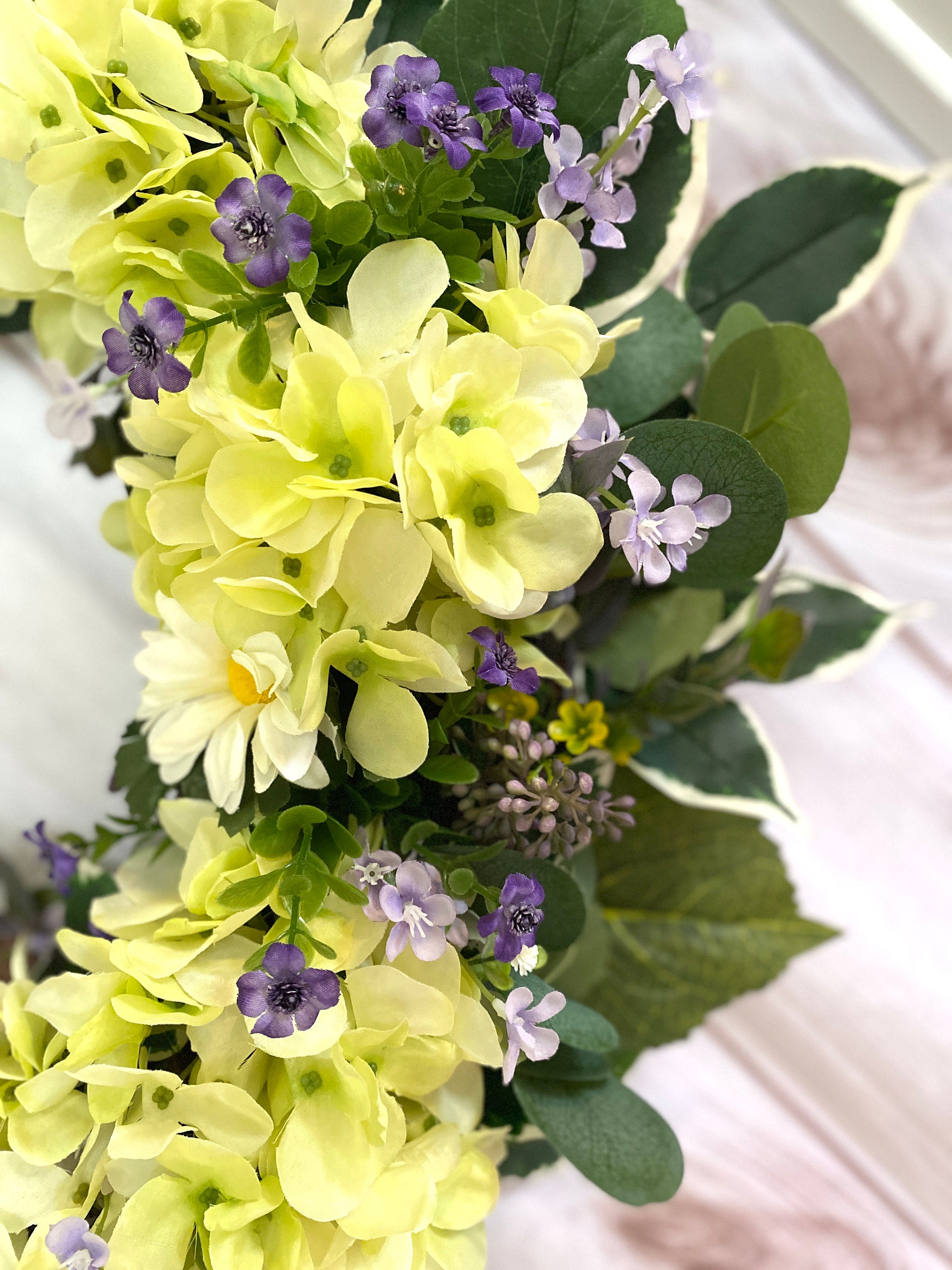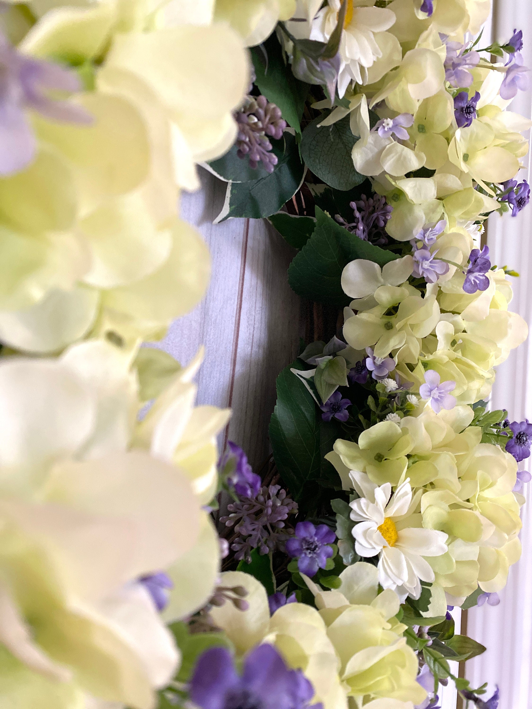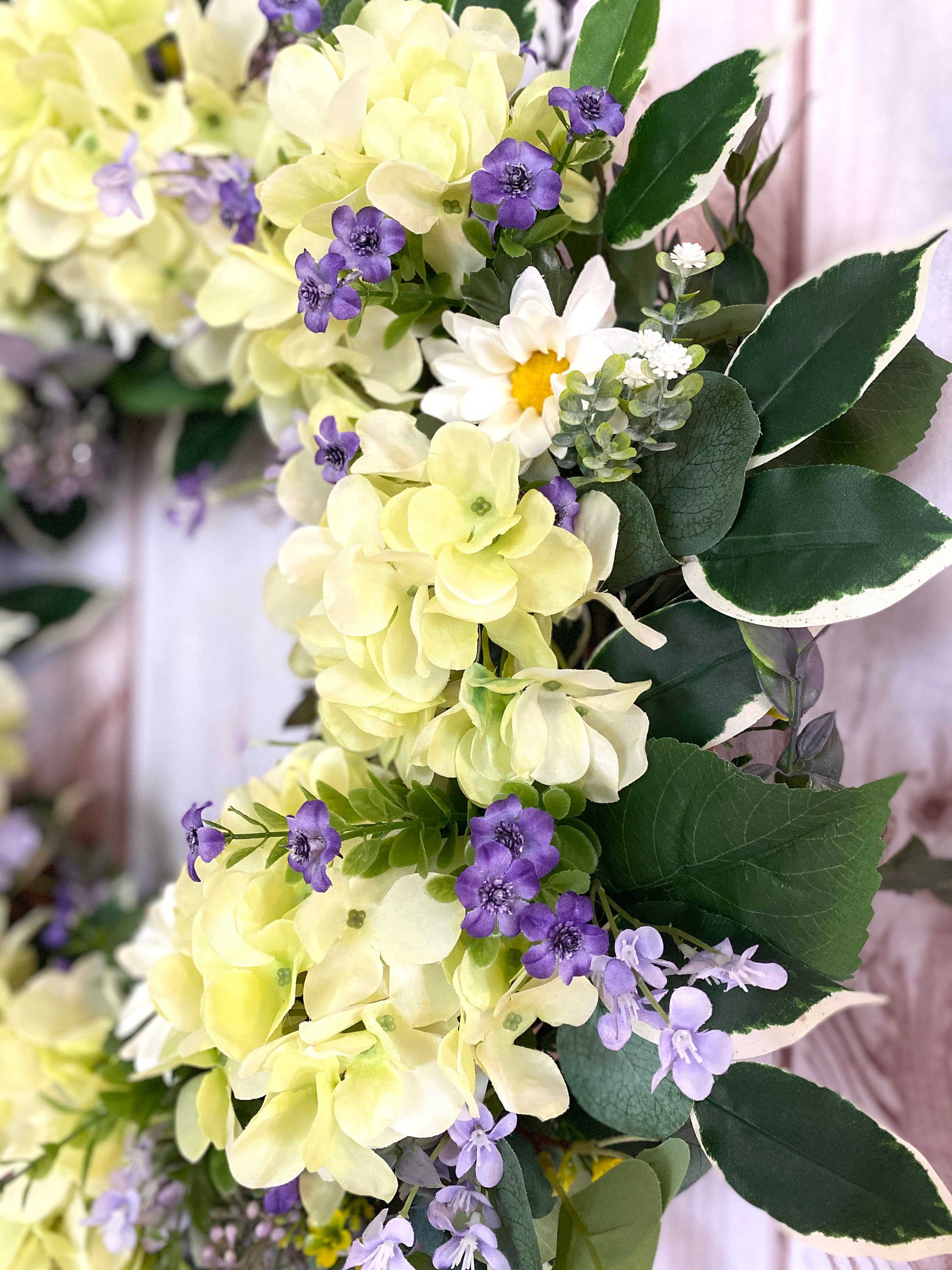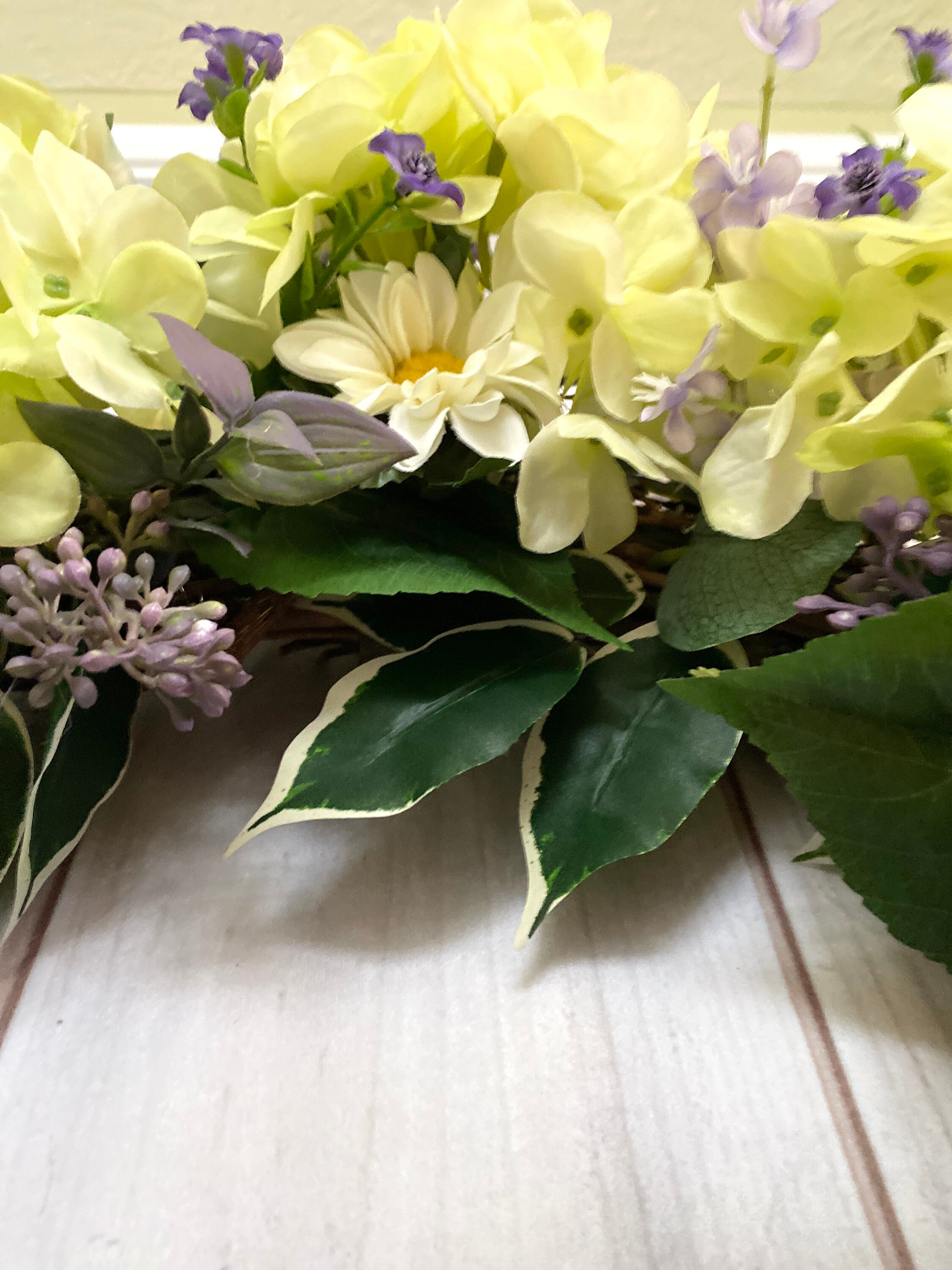 This light green hydrangea flowers are layered on ficus and eucalyptus leaves on an 18" grapevine wreath. Beautifully accented with daisies. MADE TO ORDER - small substitutions may be made and variations may occur. A loop has been added to the back for hanging.