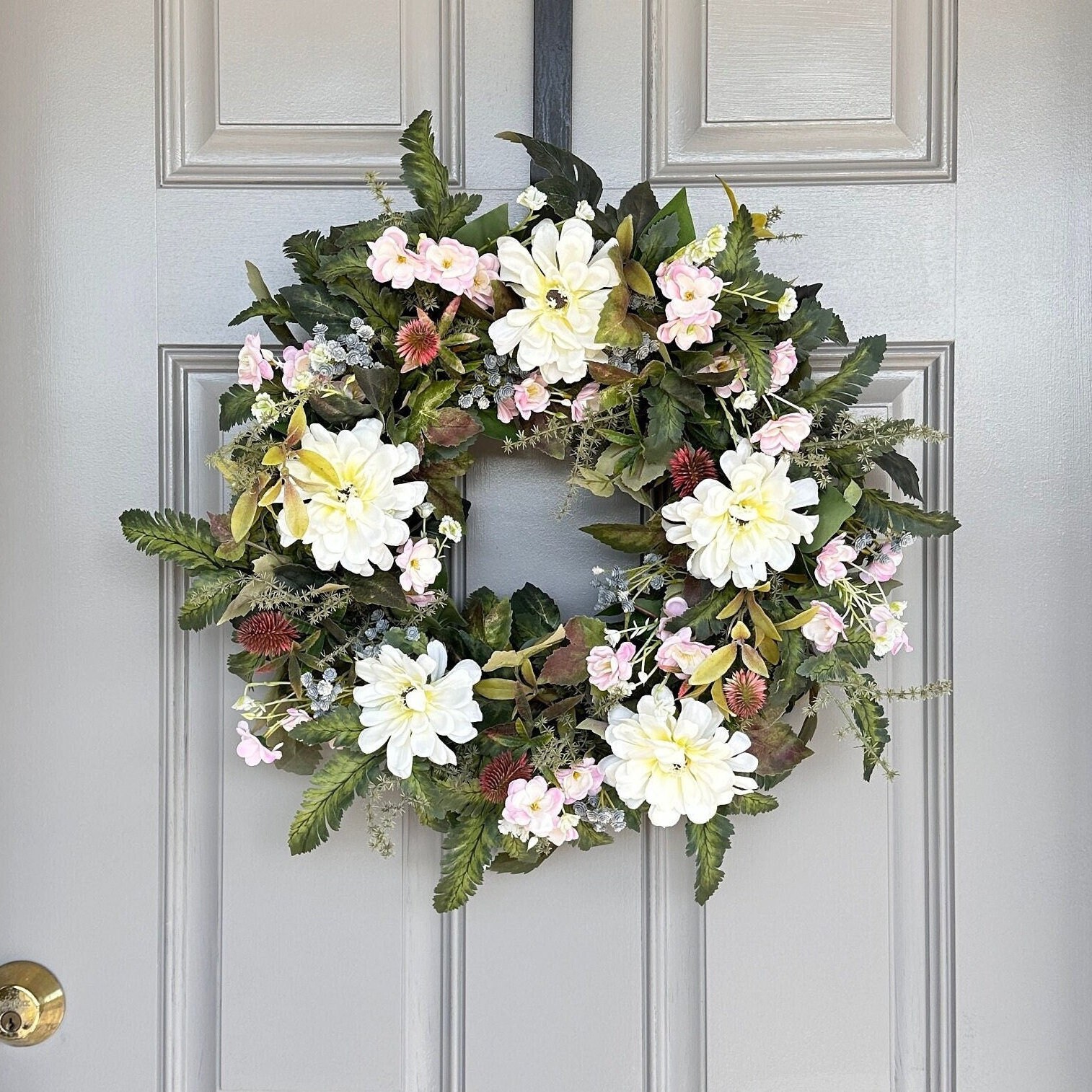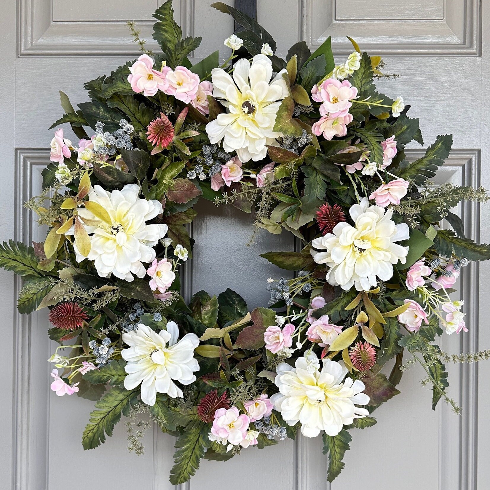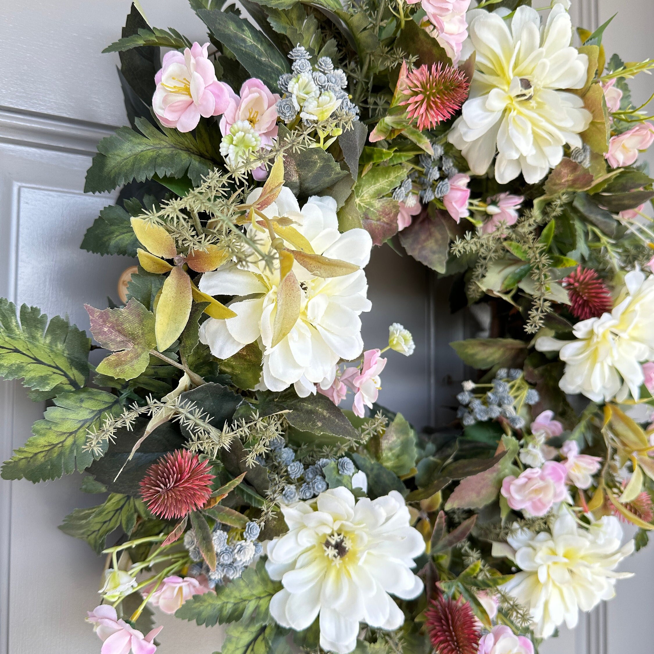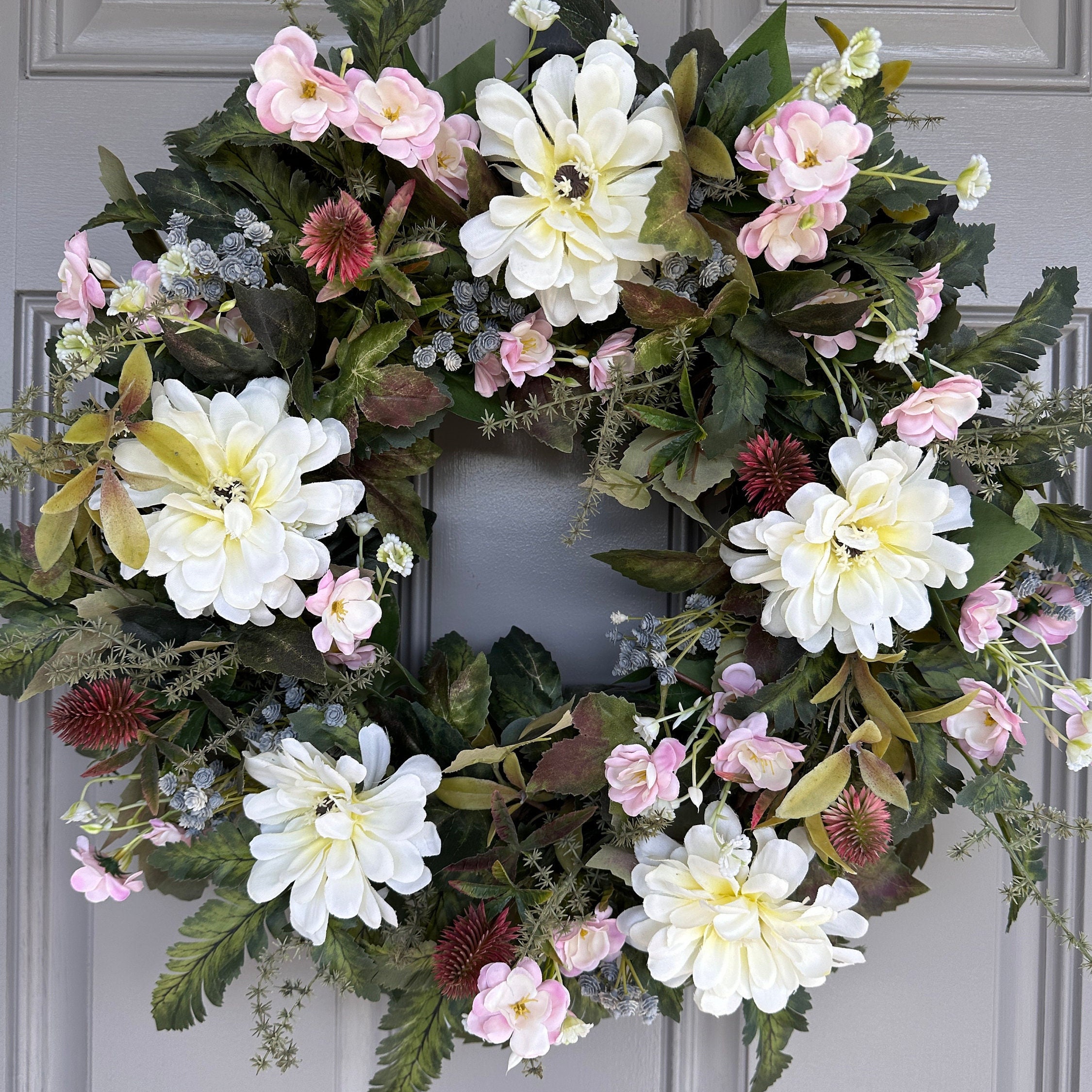 Take a look at the mix of cream white zinnias and pink flowers and thistles. This one of a kind wreath will make an excellent gift as it took two days of carefully selecting and harmonizing quality greenery with profusion white zinnias and life-like reddish pink thistles that are uncommonly found. Painted Fern is very life like making this wreath an all year round decor. Curated on an 14" grapevine measures 22 inches in diameter. Claim it as yours to have a front decor that is none alike in your neighborhood.