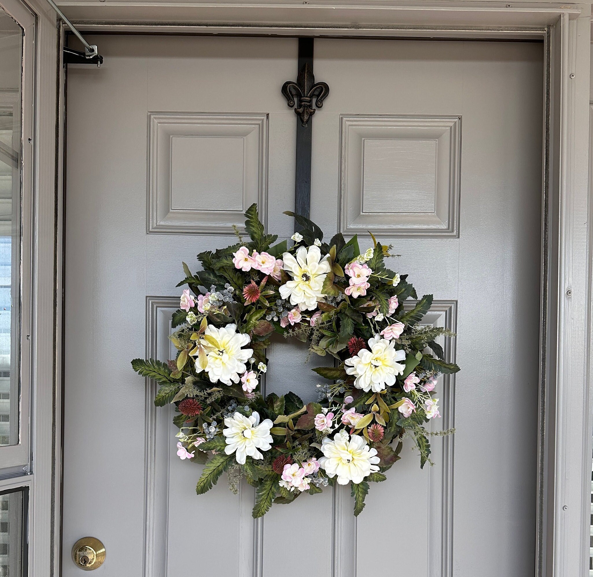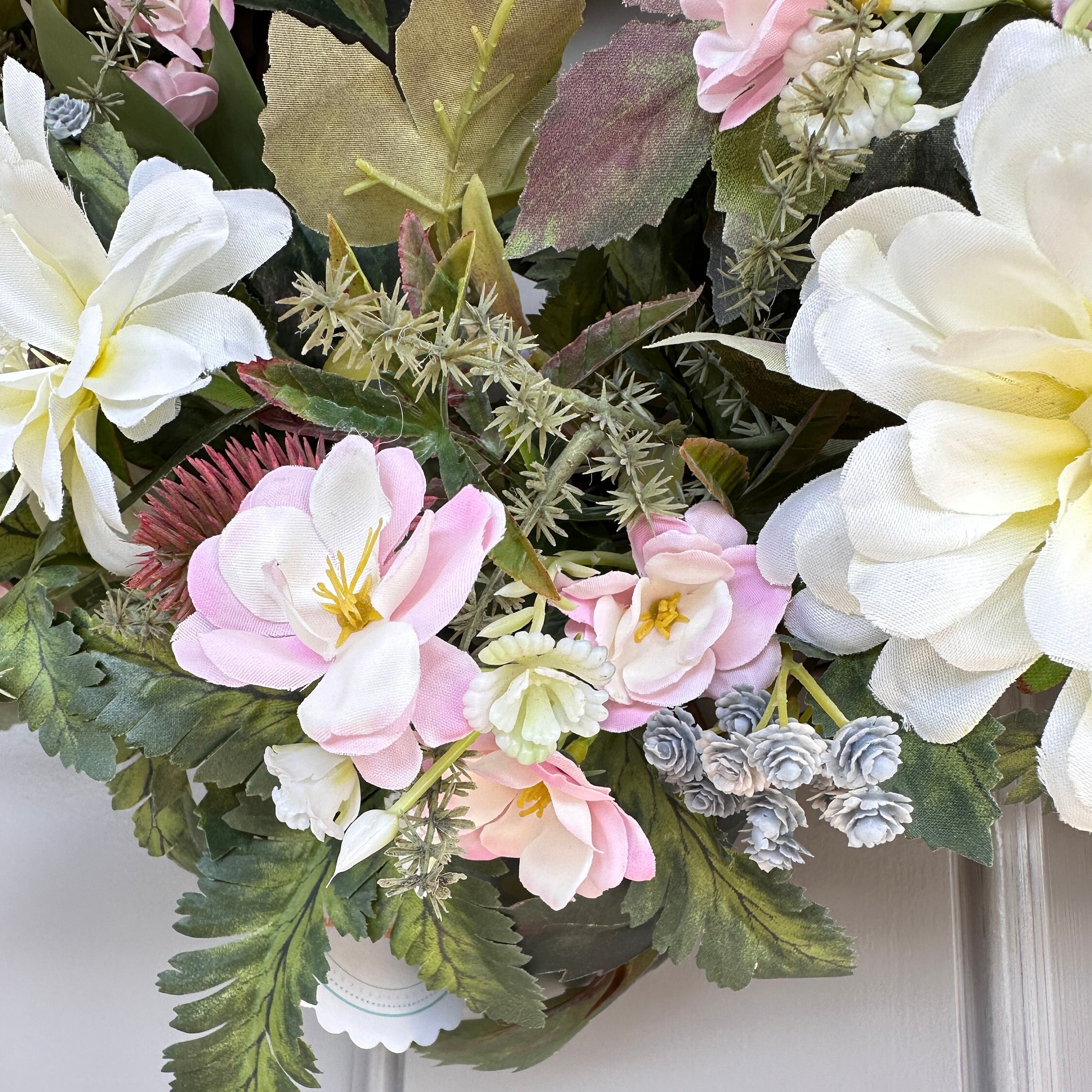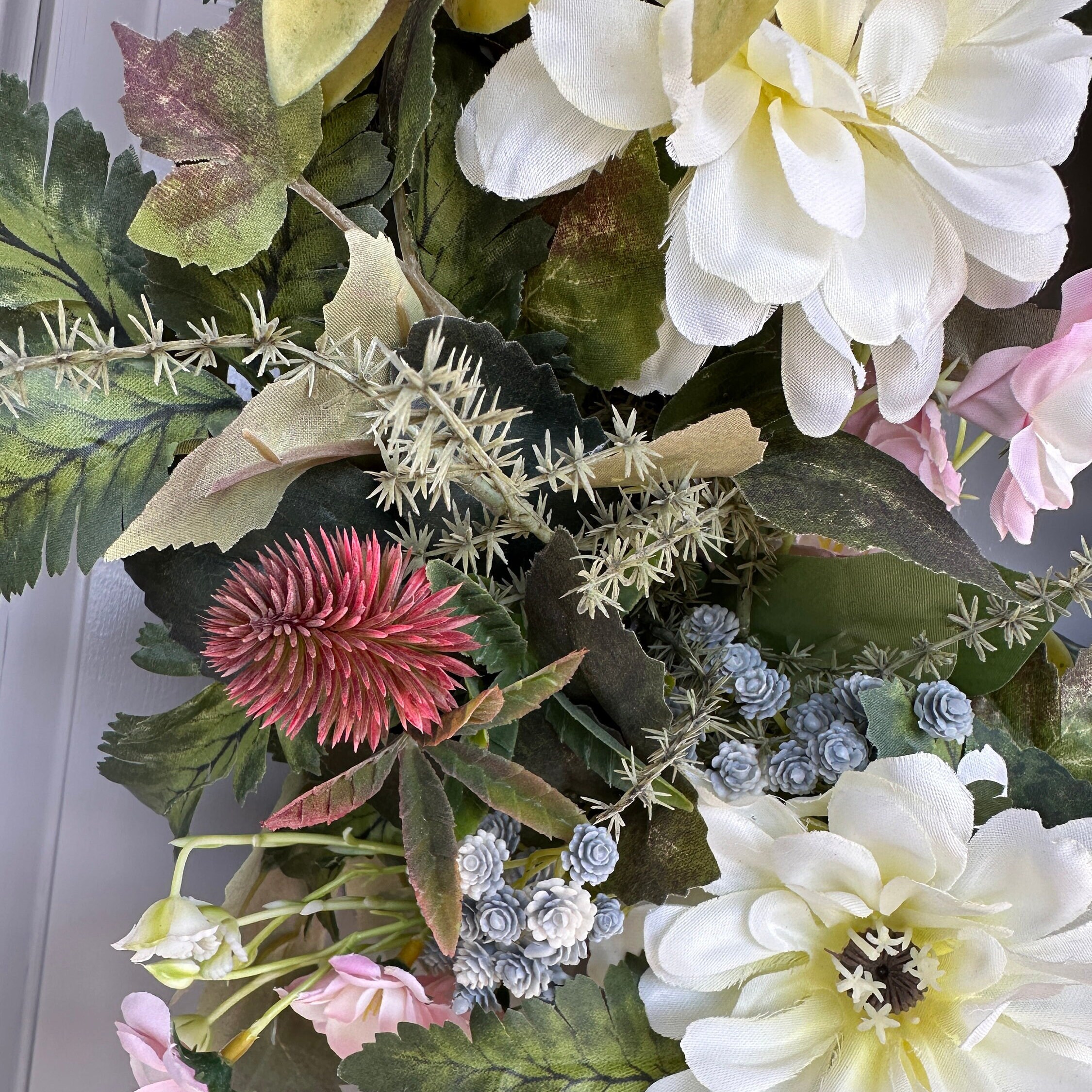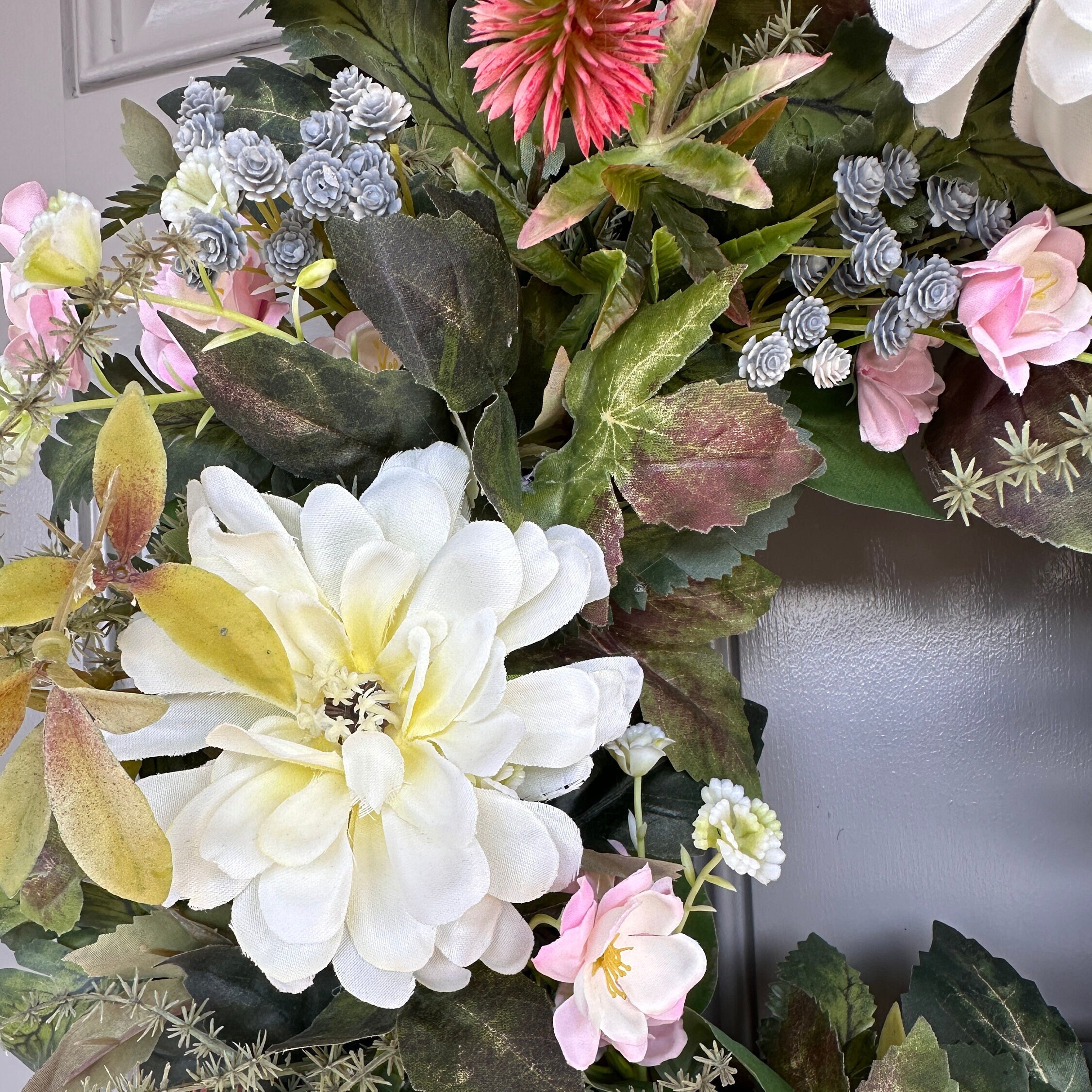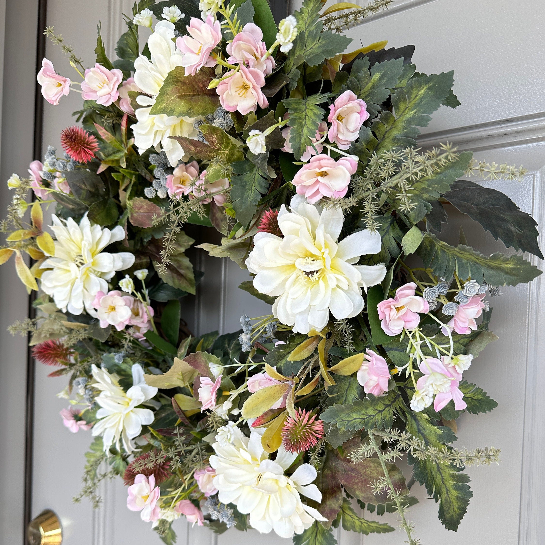 Take a look at the mix of cream white zinnias and pink flowers and thistles. This one of a kind wreath will make an excellent gift as it took two days of carefully selecting and harmonizing quality greenery with profusion white zinnias and life-like reddish pink thistles that are uncommonly found. Painted Fern is very life like making this wreath an all year round decor. Curated on an 14" grapevine measures 22 inches in diameter. Claim it as yours to have a front decor that is none alike in your neighborhood.