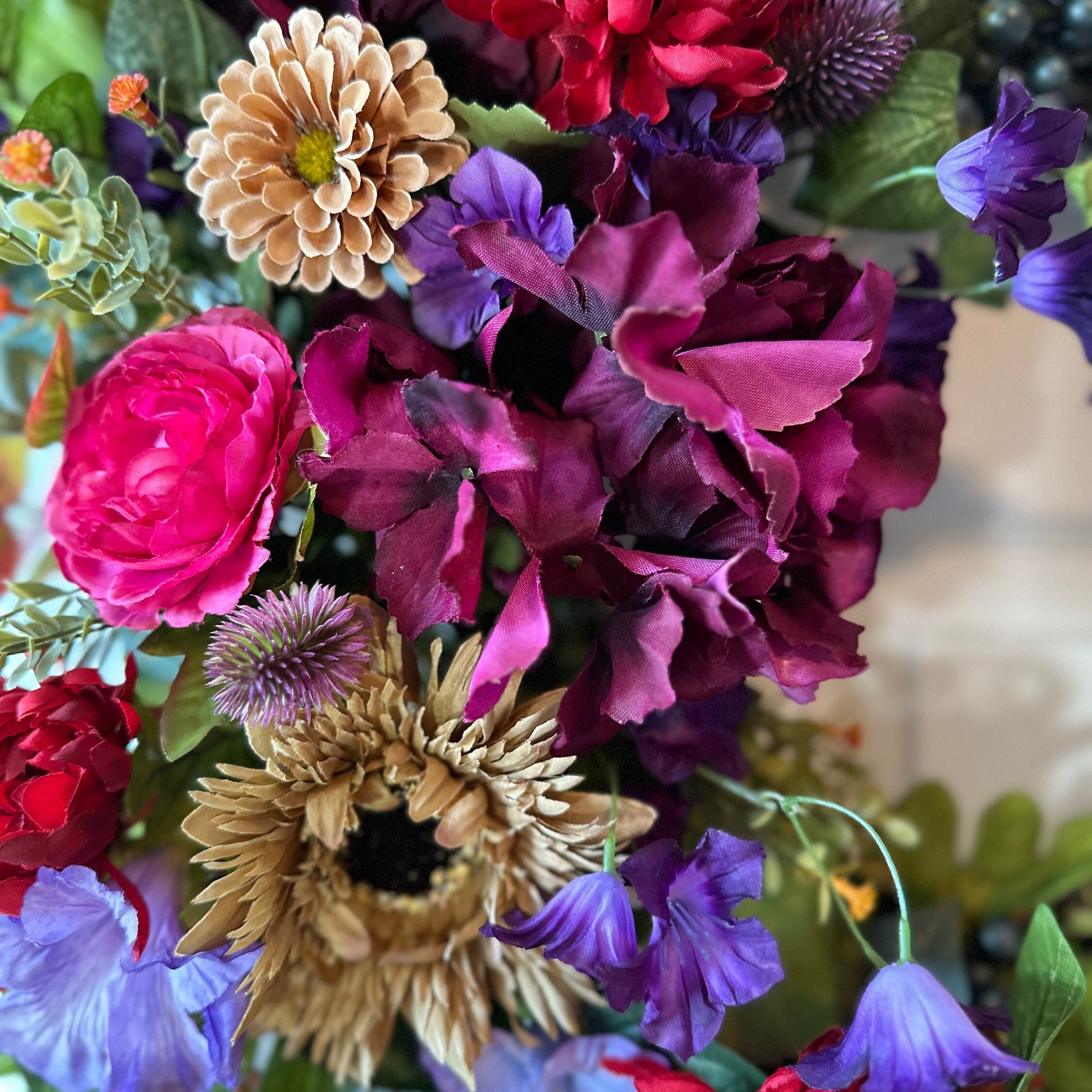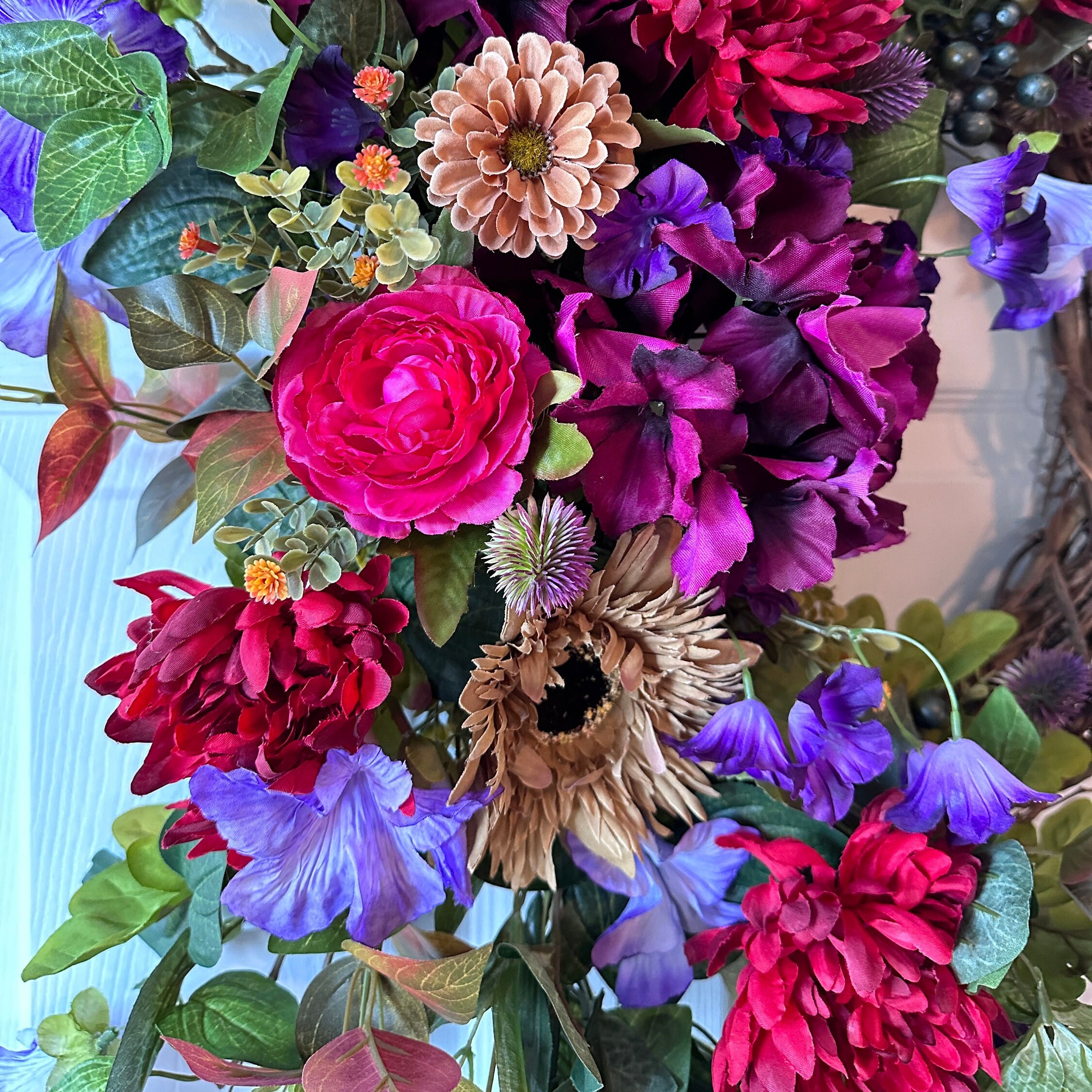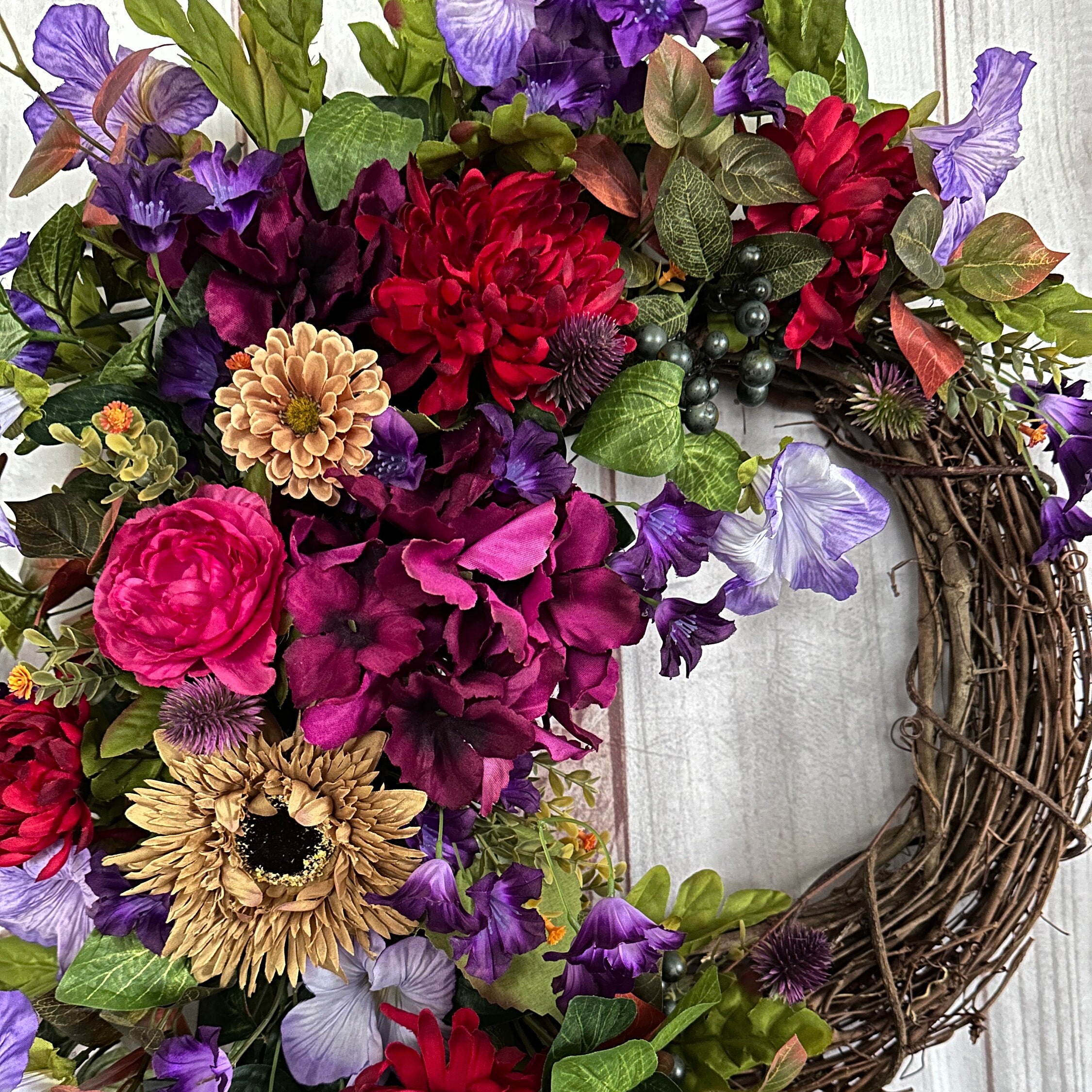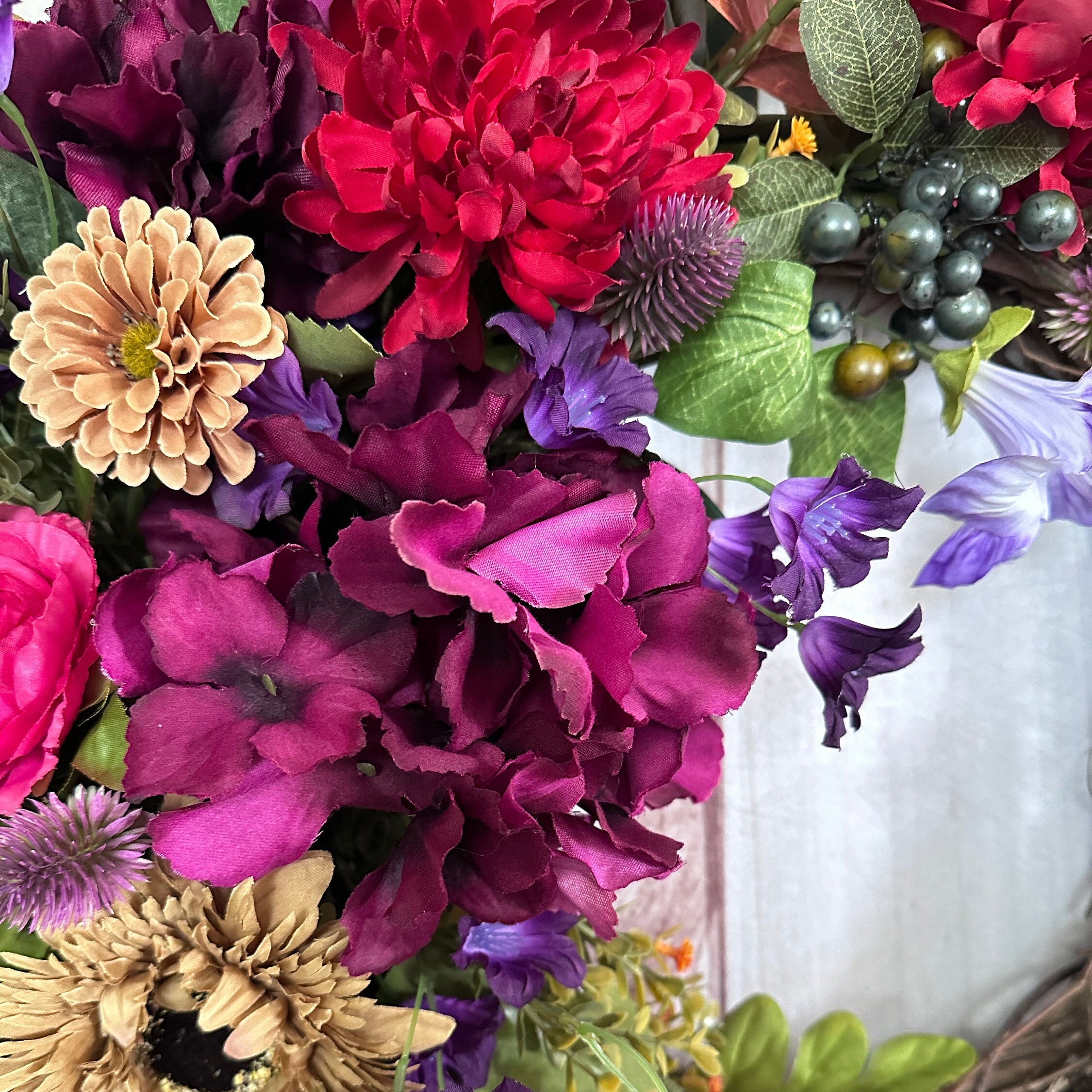 This colorful and vibrant mixed flower wreath (MADE TO ORDER) is a rare find! Welcome your friends and family into your home by setting the stage at the front door with the beautiful harmony of magenta hydrangeas, deep-red chrysanthemum, purple thistles, and bellflowers with tea leaves. Much attention and details have been given to this design along with berries and orange-hue gypso. The wreath measures approximately 30" in height, 21" in width, and 7" in depth on a 14" grapevine base.