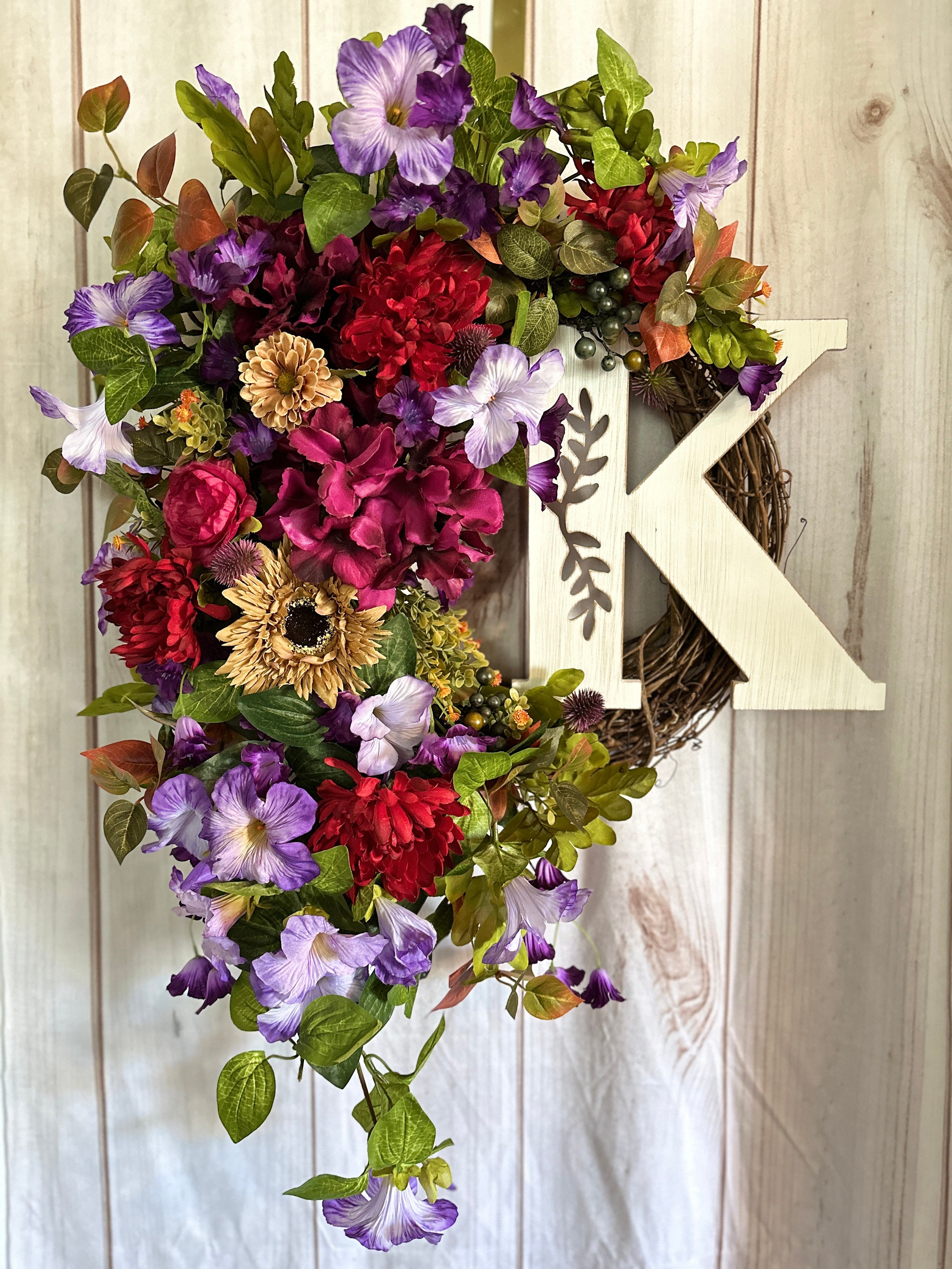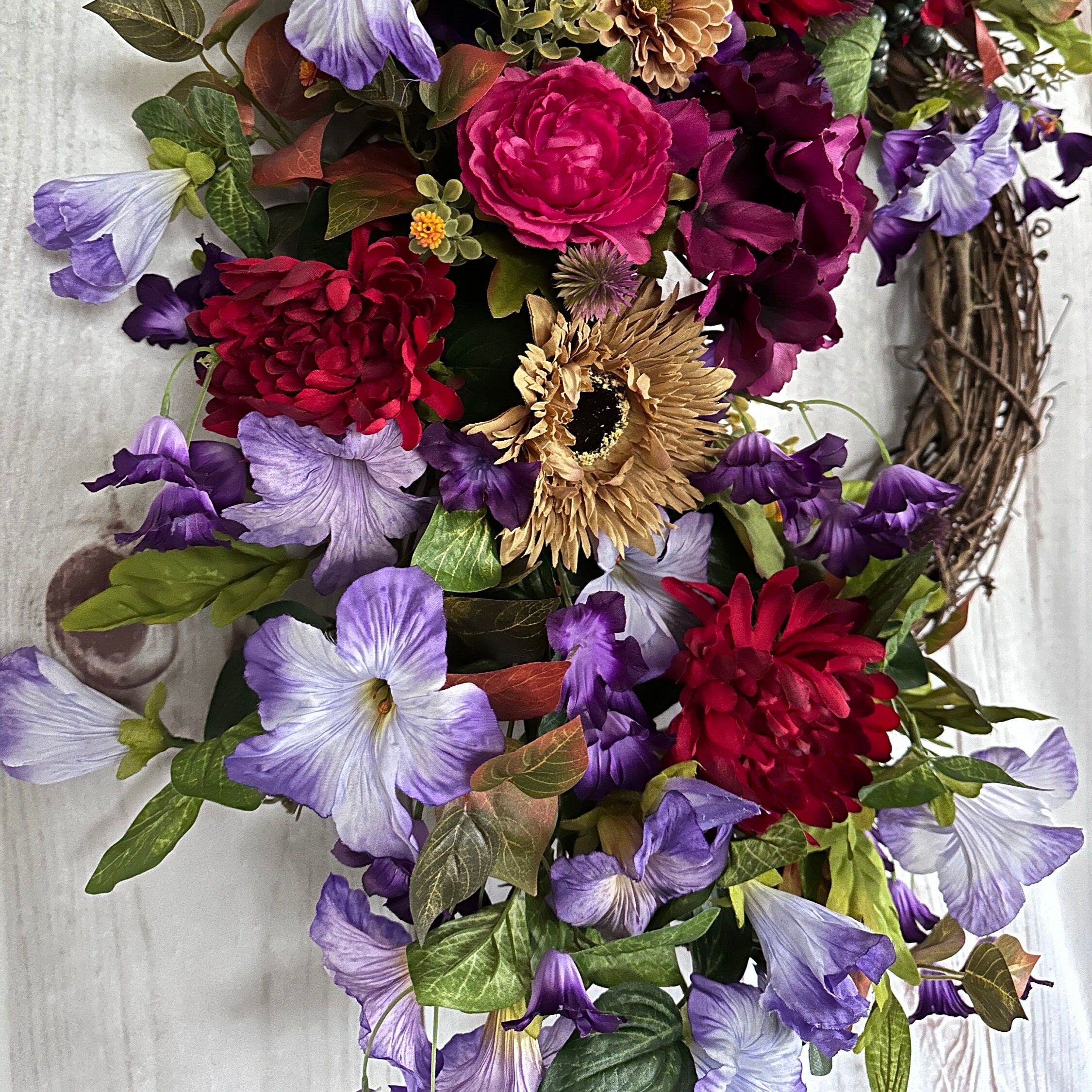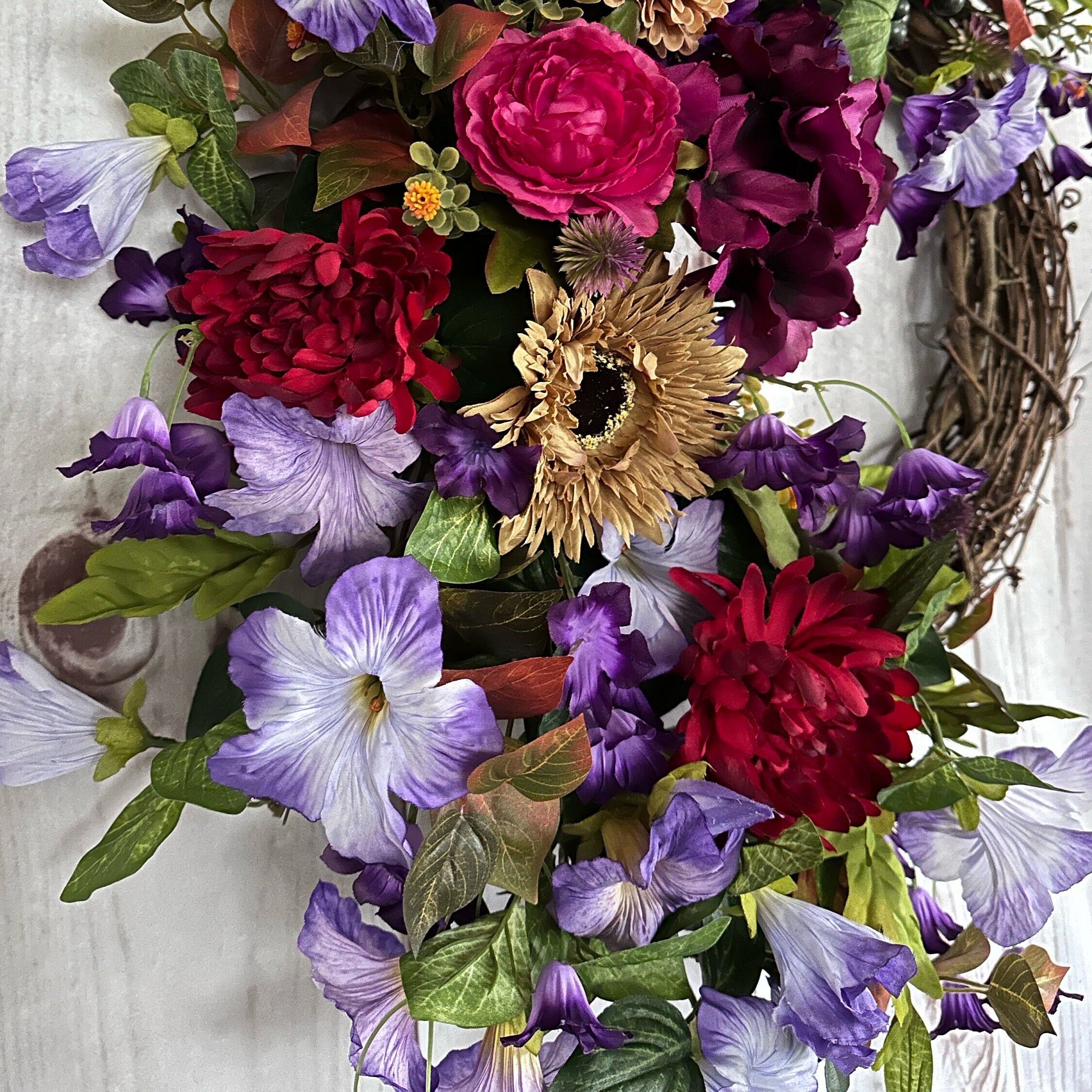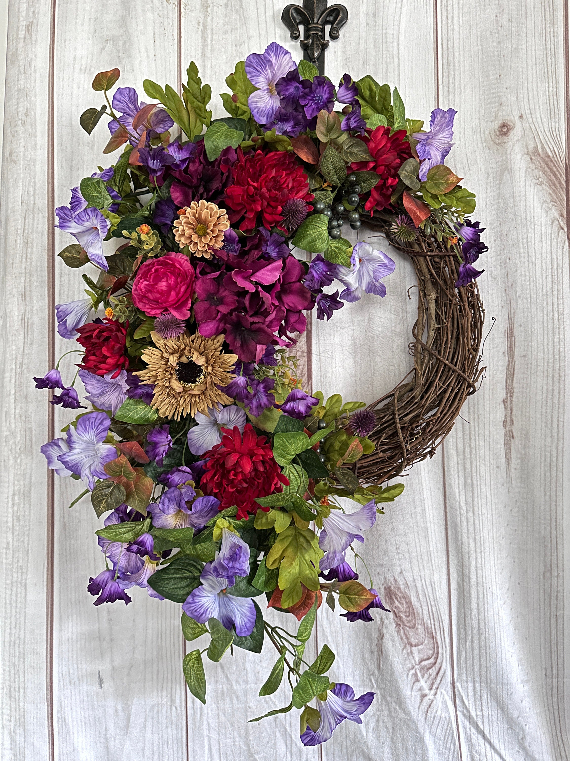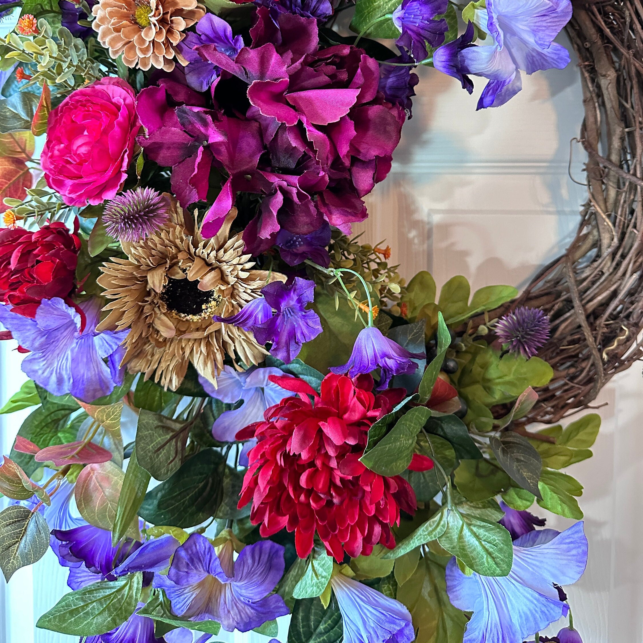 This colorful and vibrant mixed flower wreath (MADE TO ORDER) is a rare find! Welcome your friends and family into your home by setting the stage at the front door with the beautiful harmony of magenta hydrangeas, deep-red chrysanthemum, purple thistles, and bellflowers with tea leaves. Much attention and details have been given to this design along with berries and orange-hue gypso. The wreath measures approximately 30" in height, 21" in width, and 7" in depth on a 14" grapevine base.
