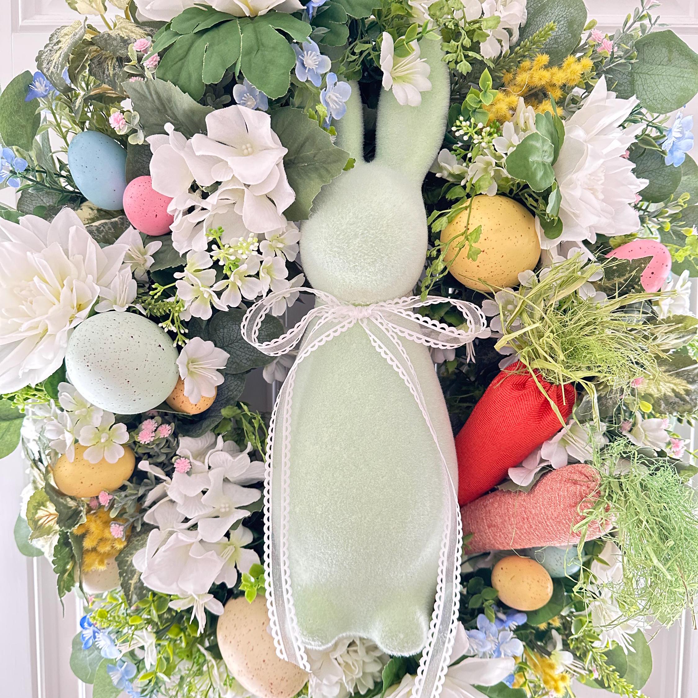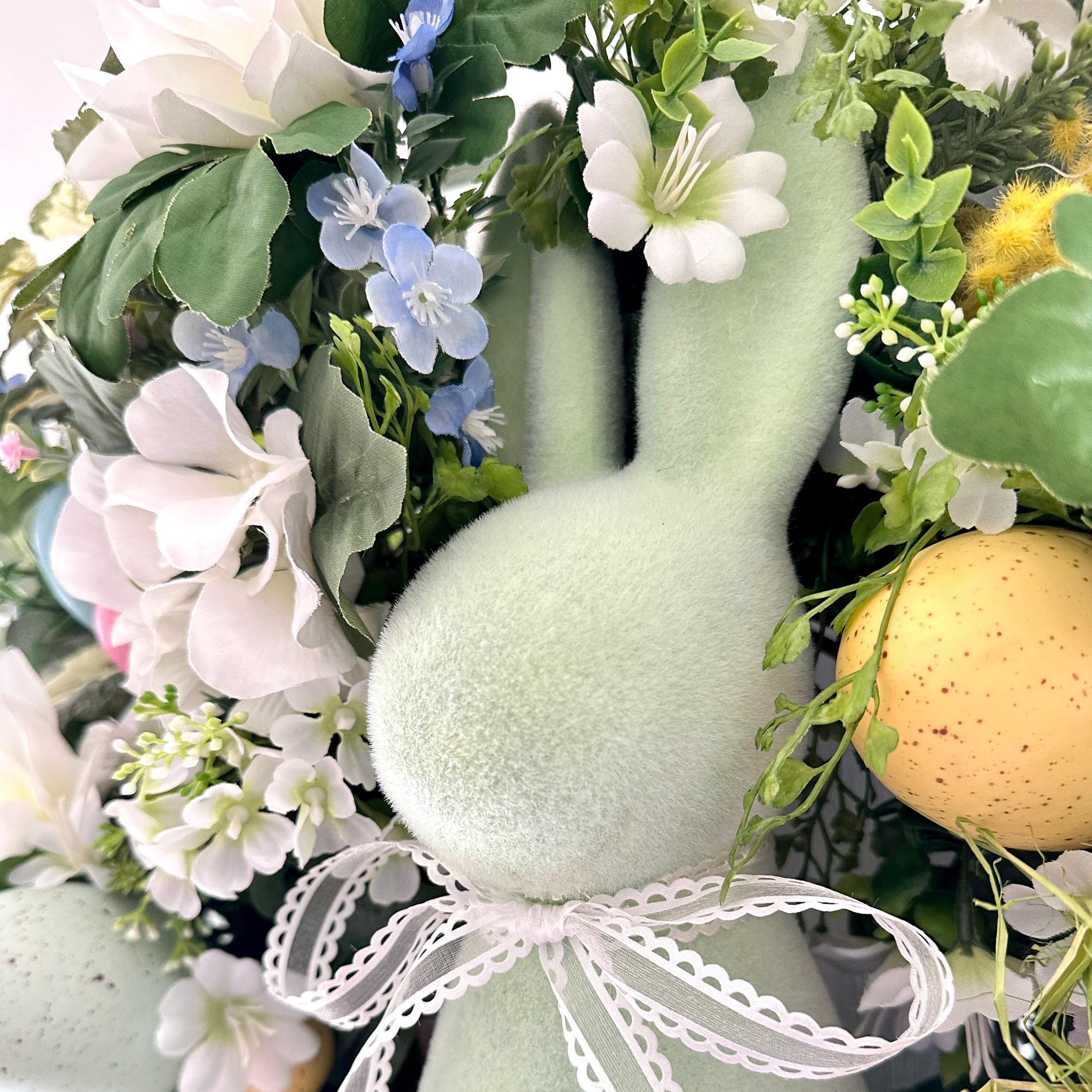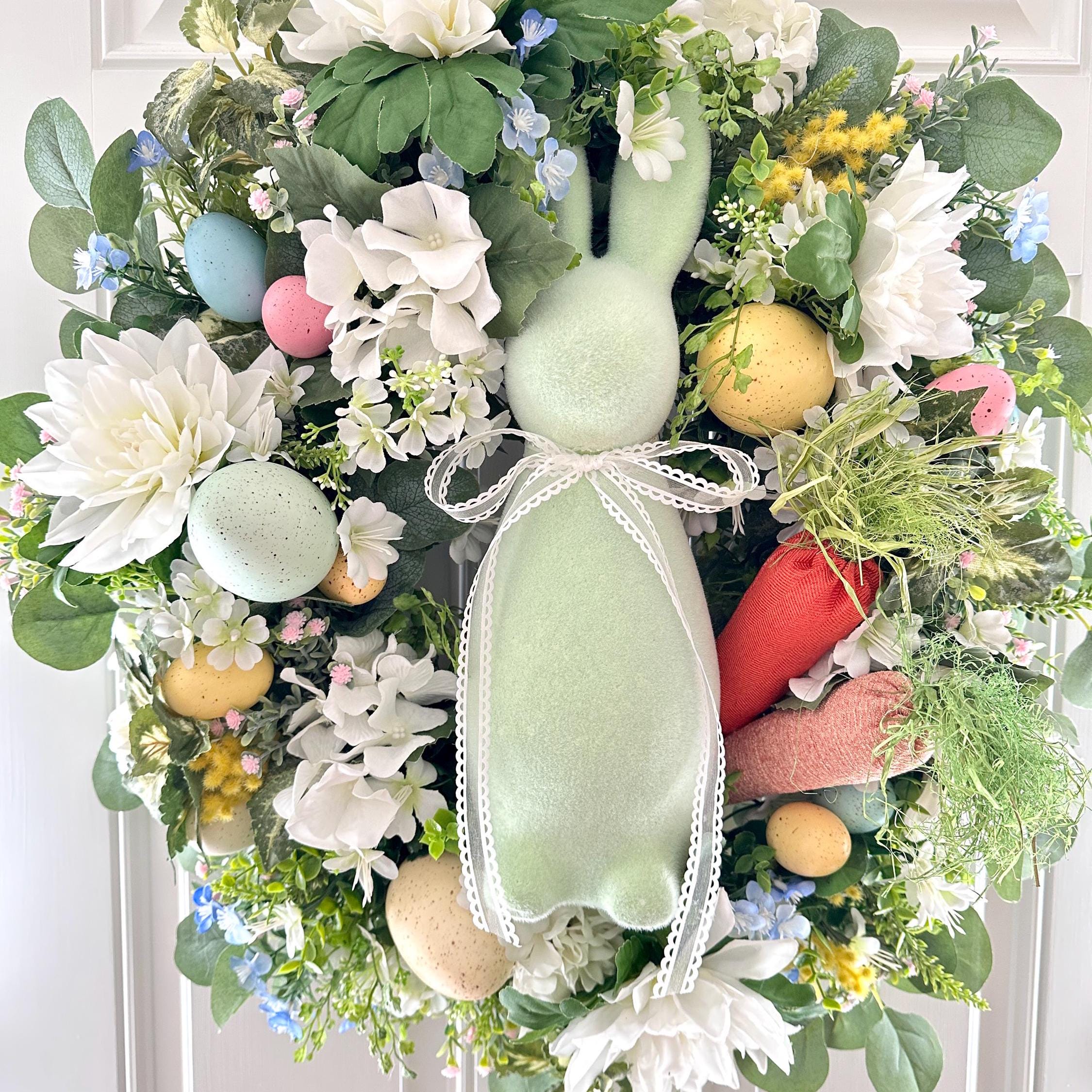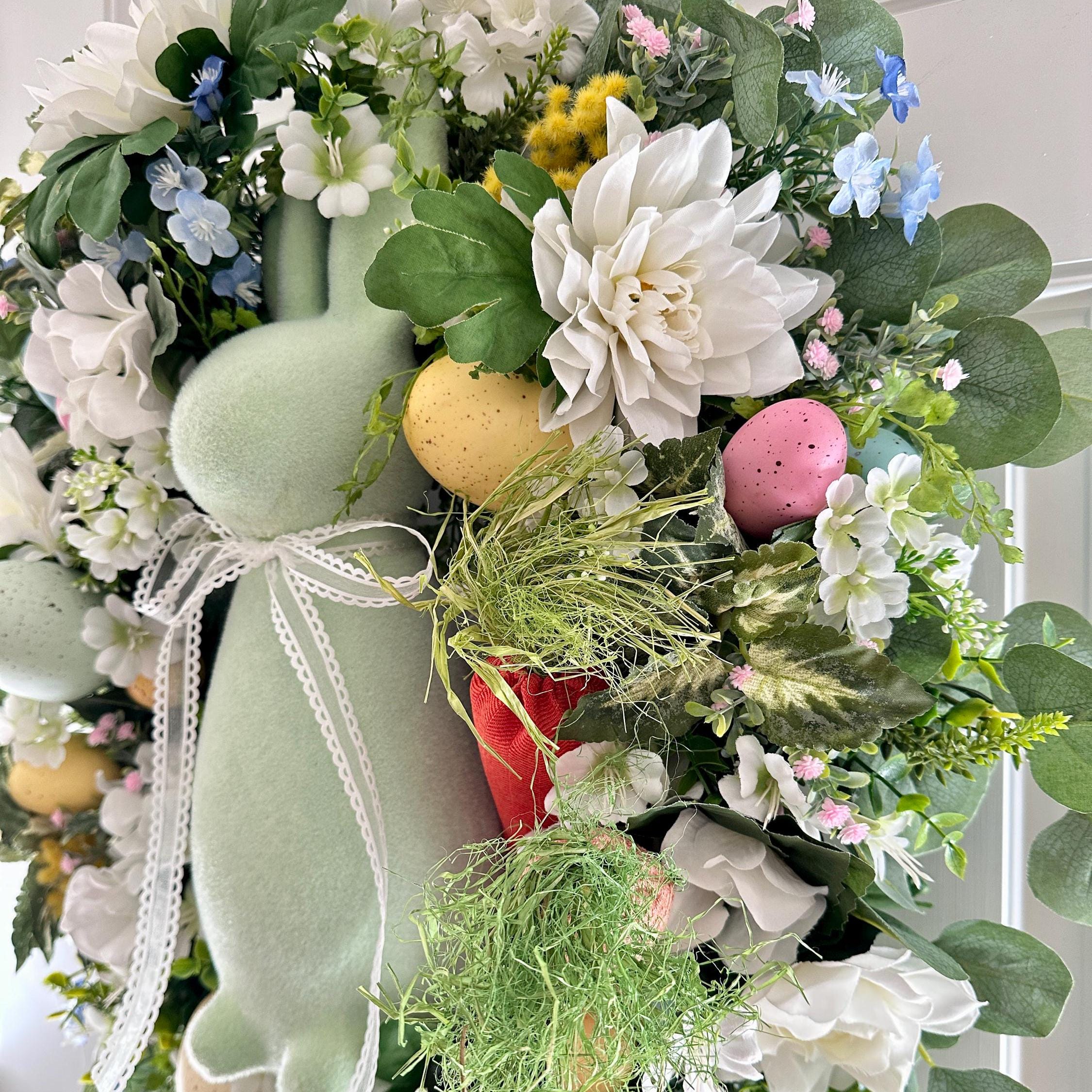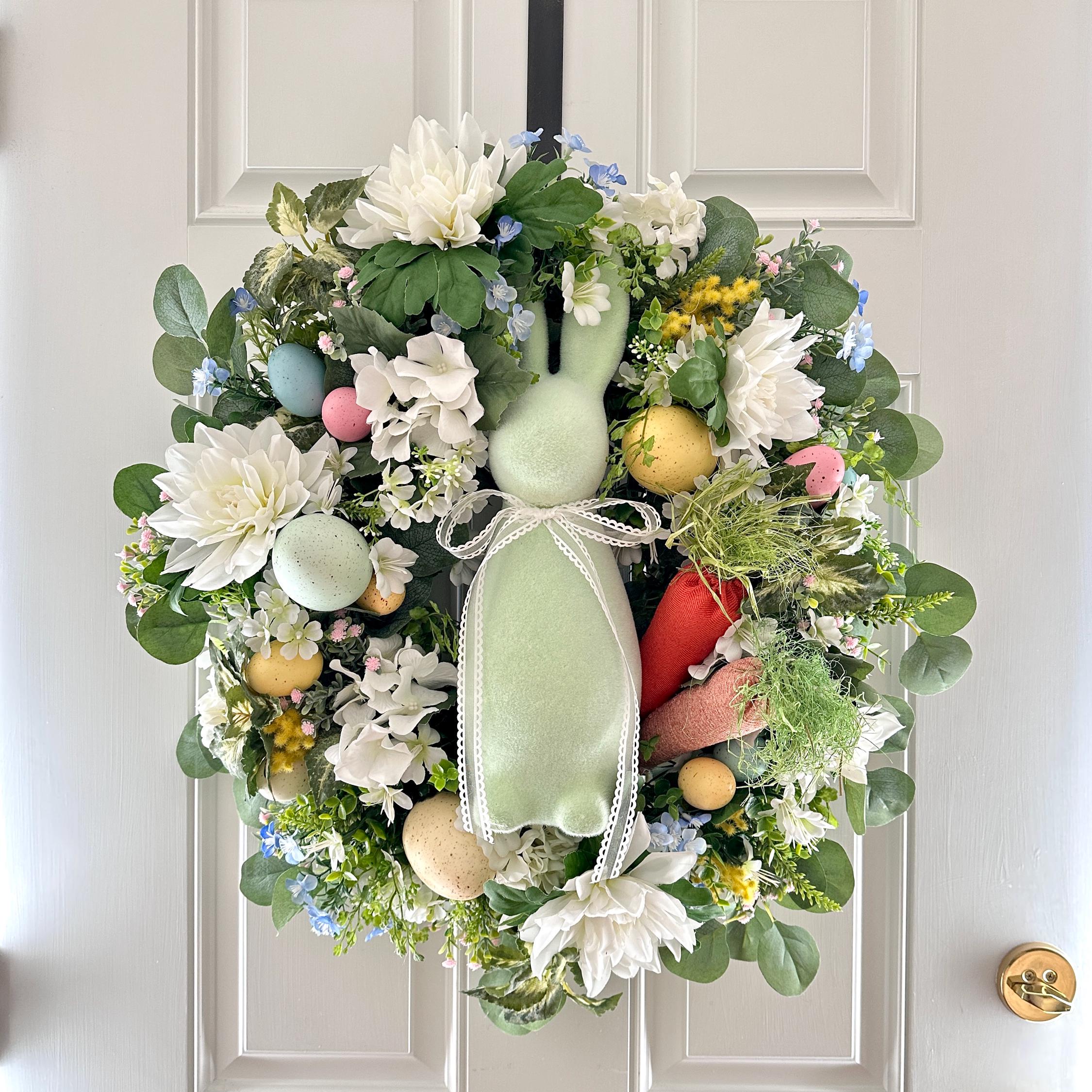 Flocked mint green bunny Spring Easter wreath for your front door has a mix of white dahlias and phlox with silver dollar eucalyptus. This is a one of kind wreath curated on a 14" grapevine wreath base. It measures approximately 24" across.