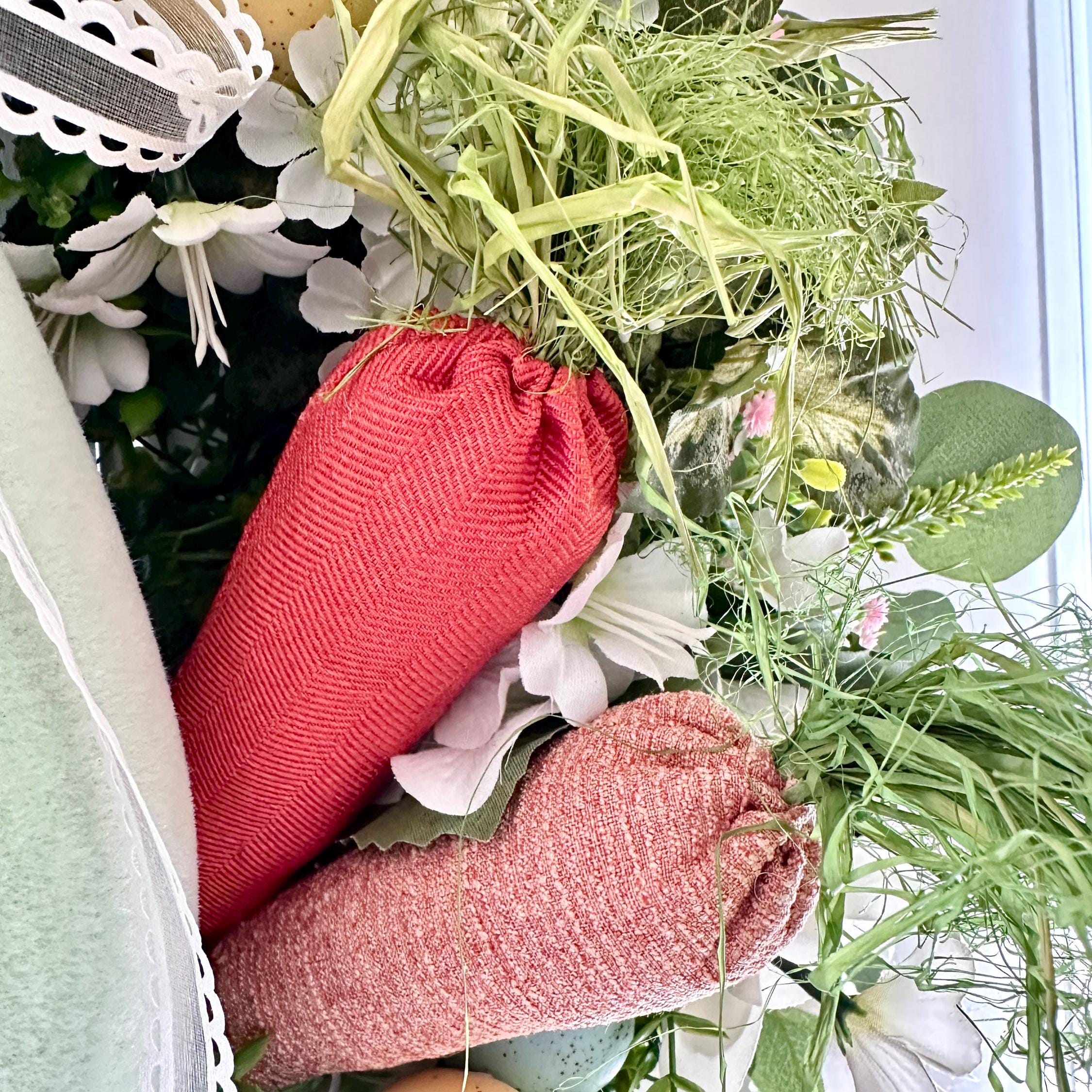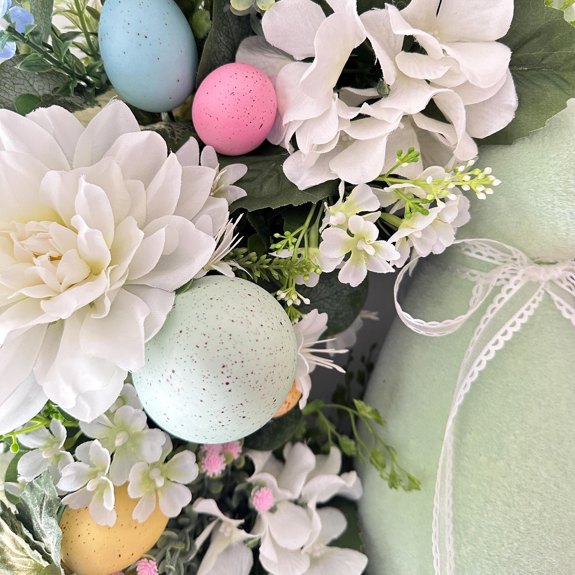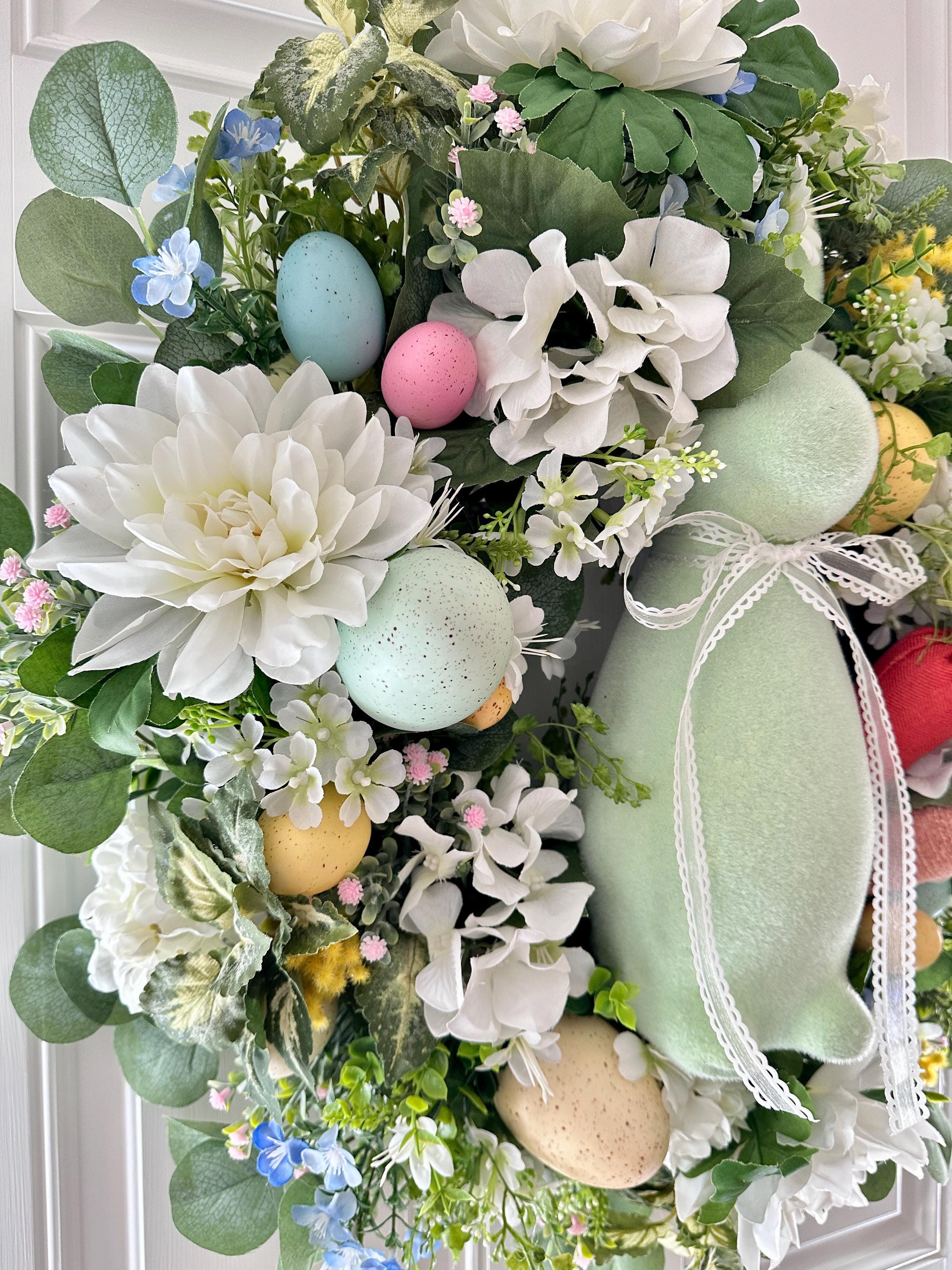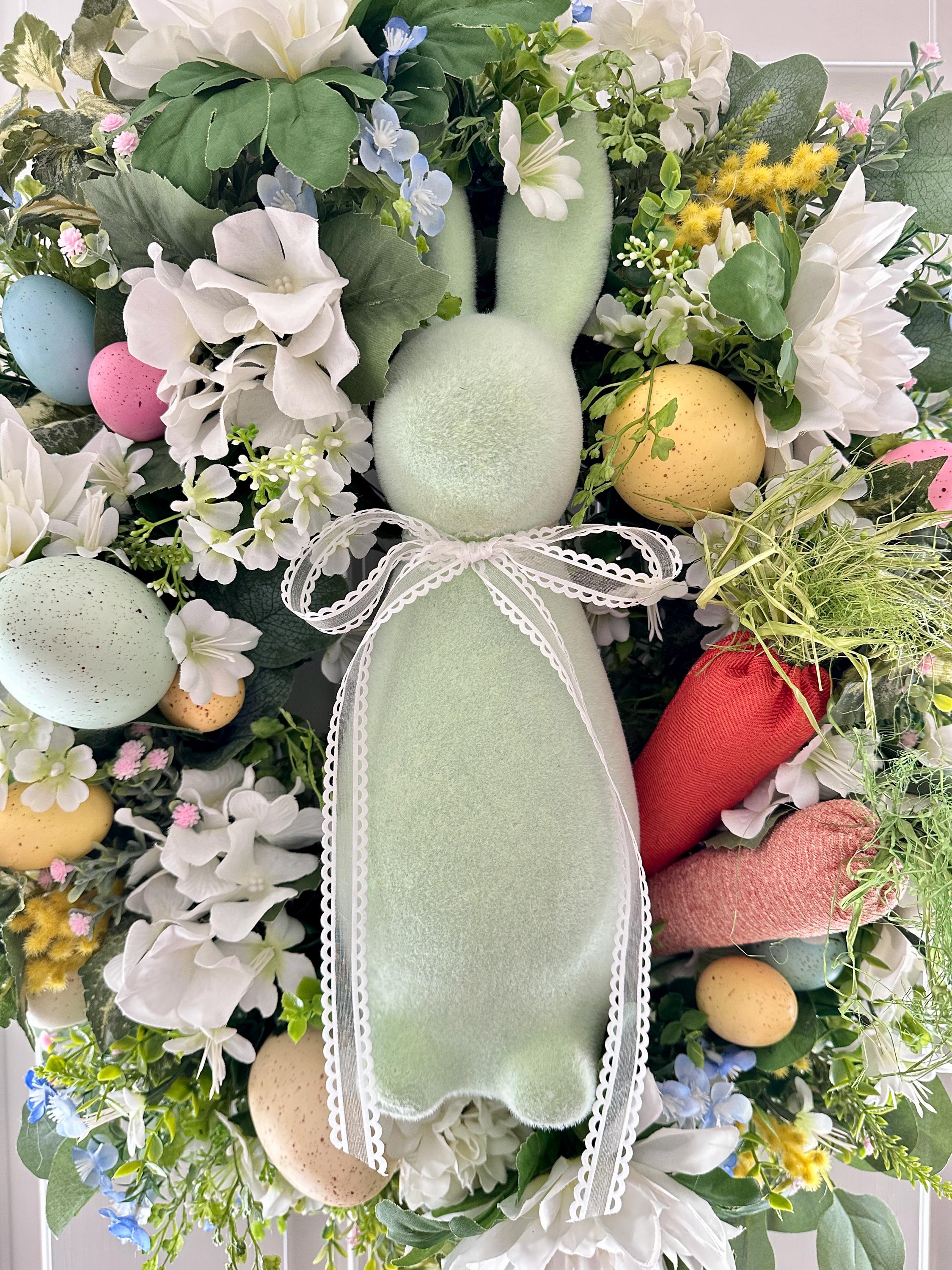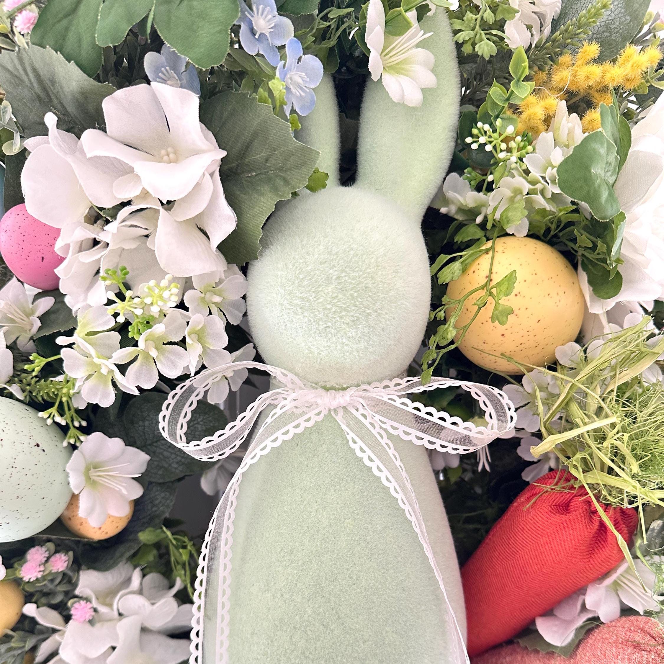 Flocked mint green bunny Spring Easter wreath for your front door has a mix of white dahlias and phlox with silver dollar eucalyptus. This is a one of kind wreath curated on a 14" grapevine wreath base. It measures approximately 24" across.