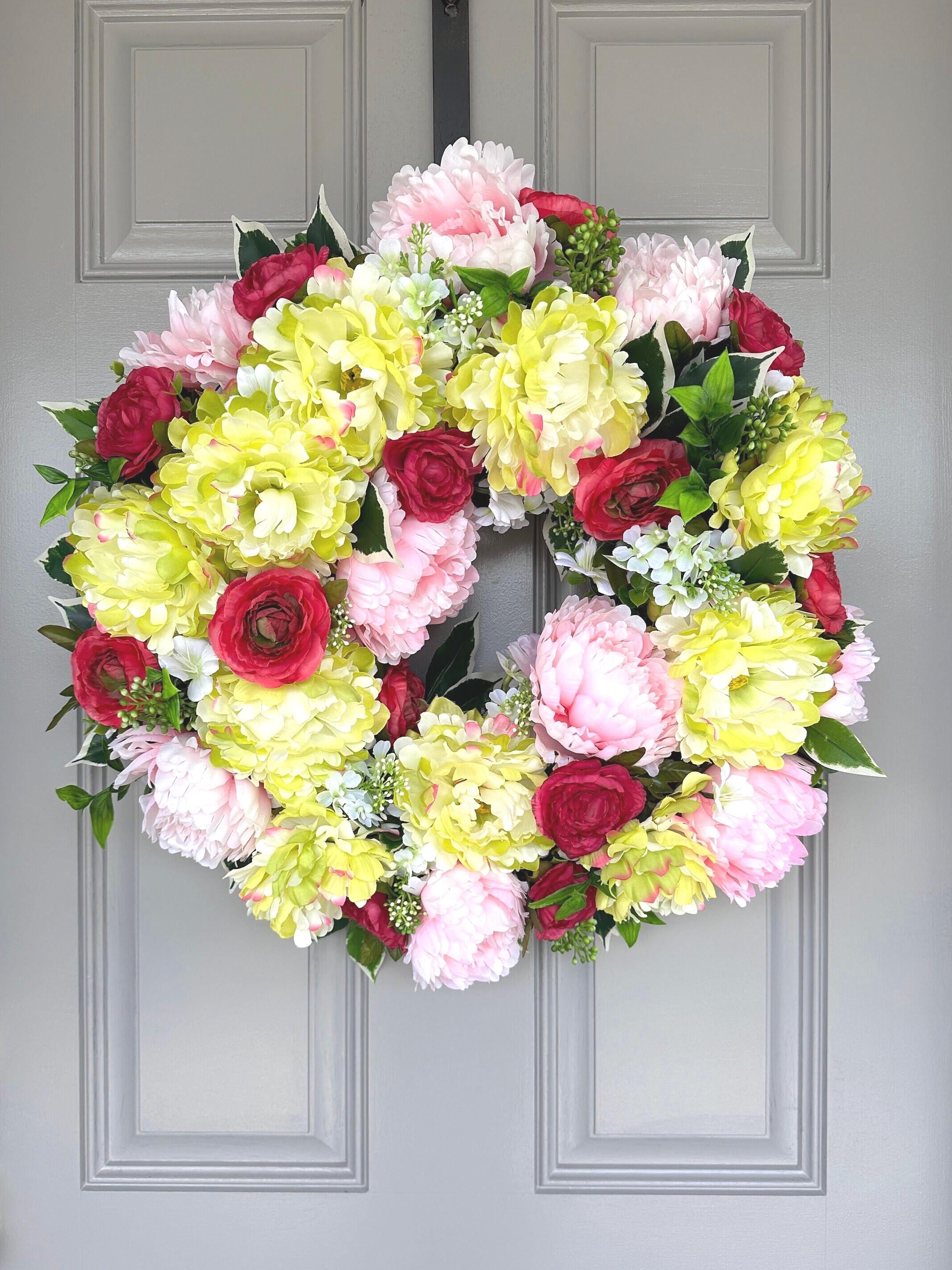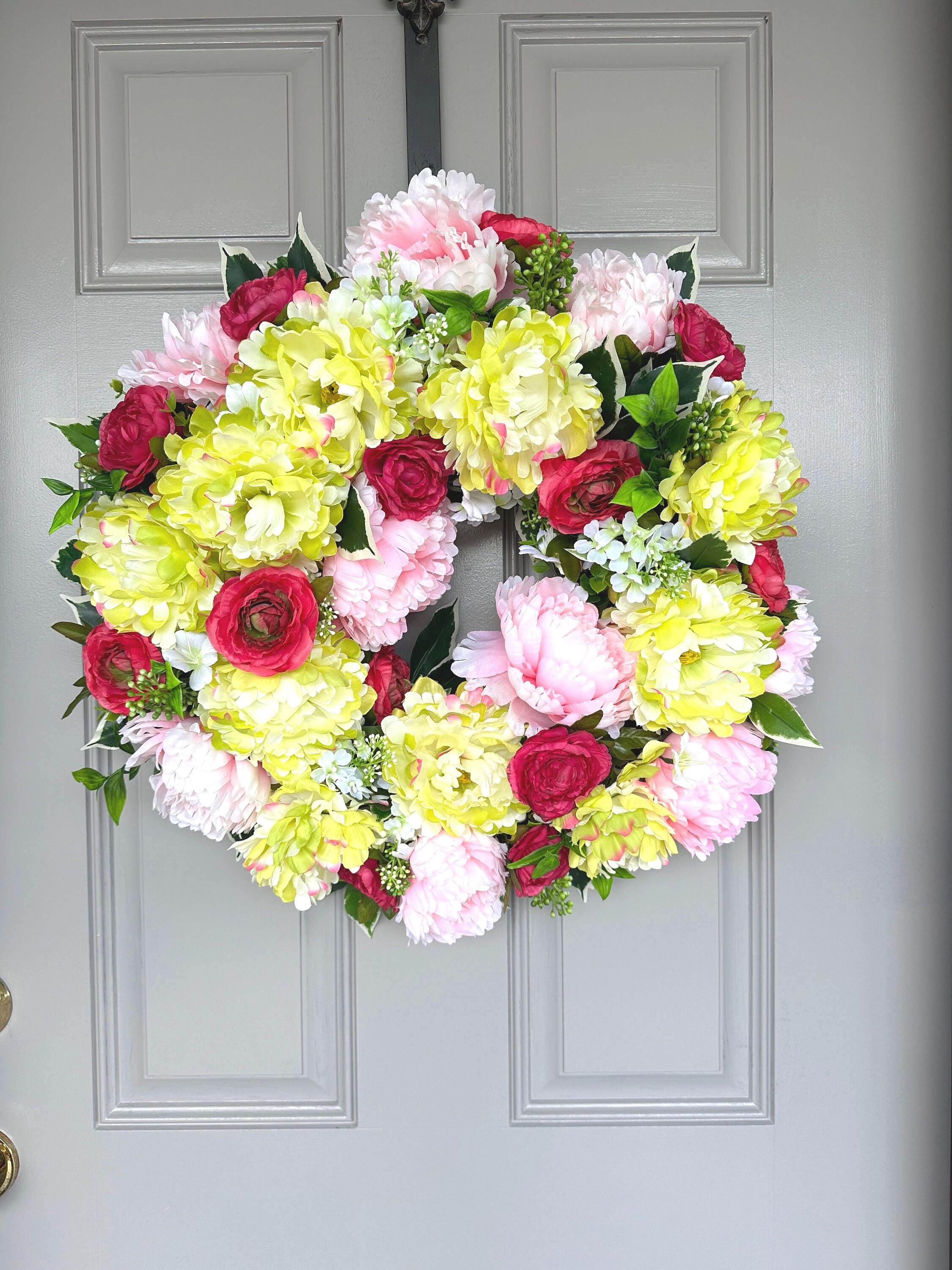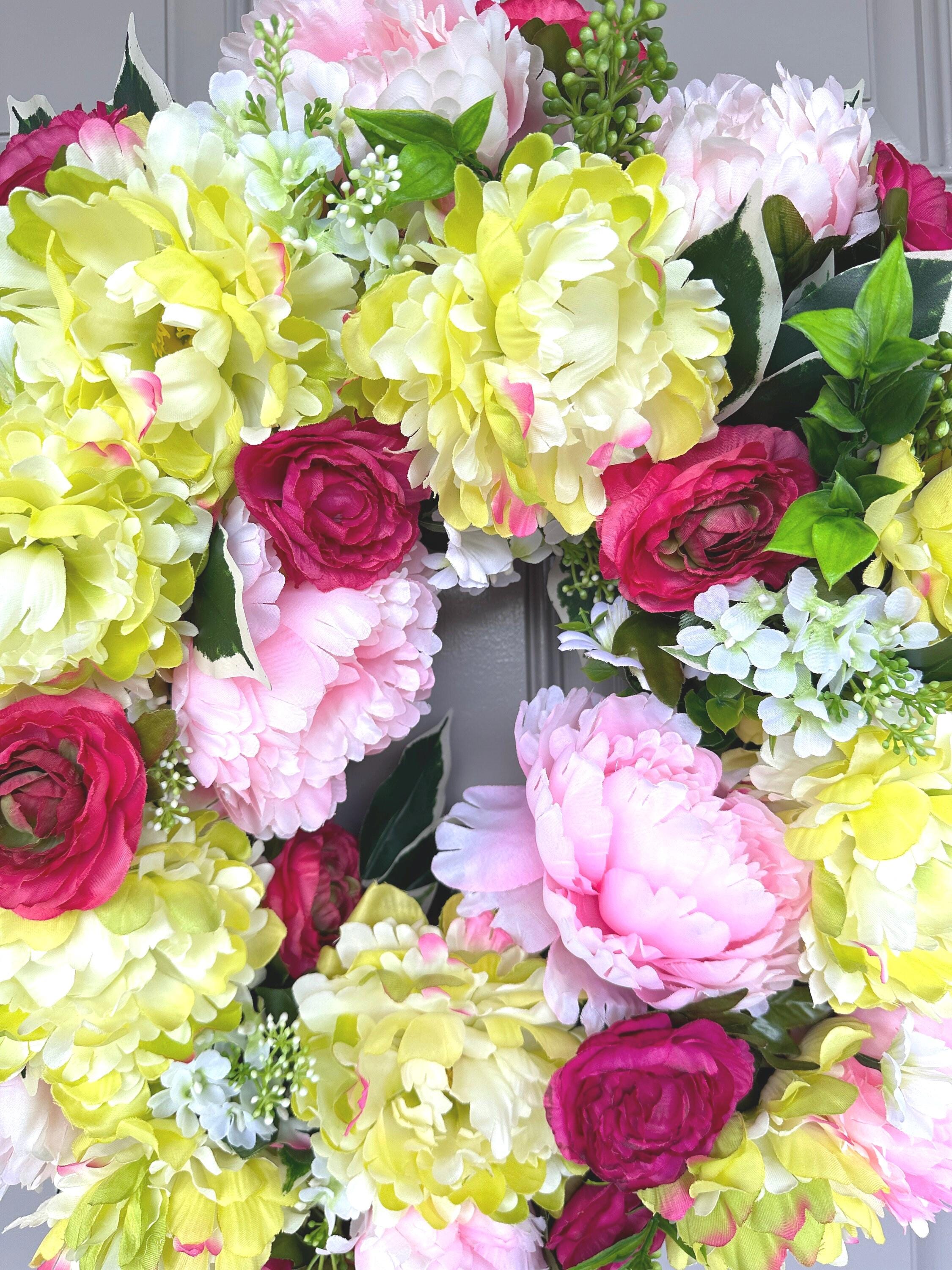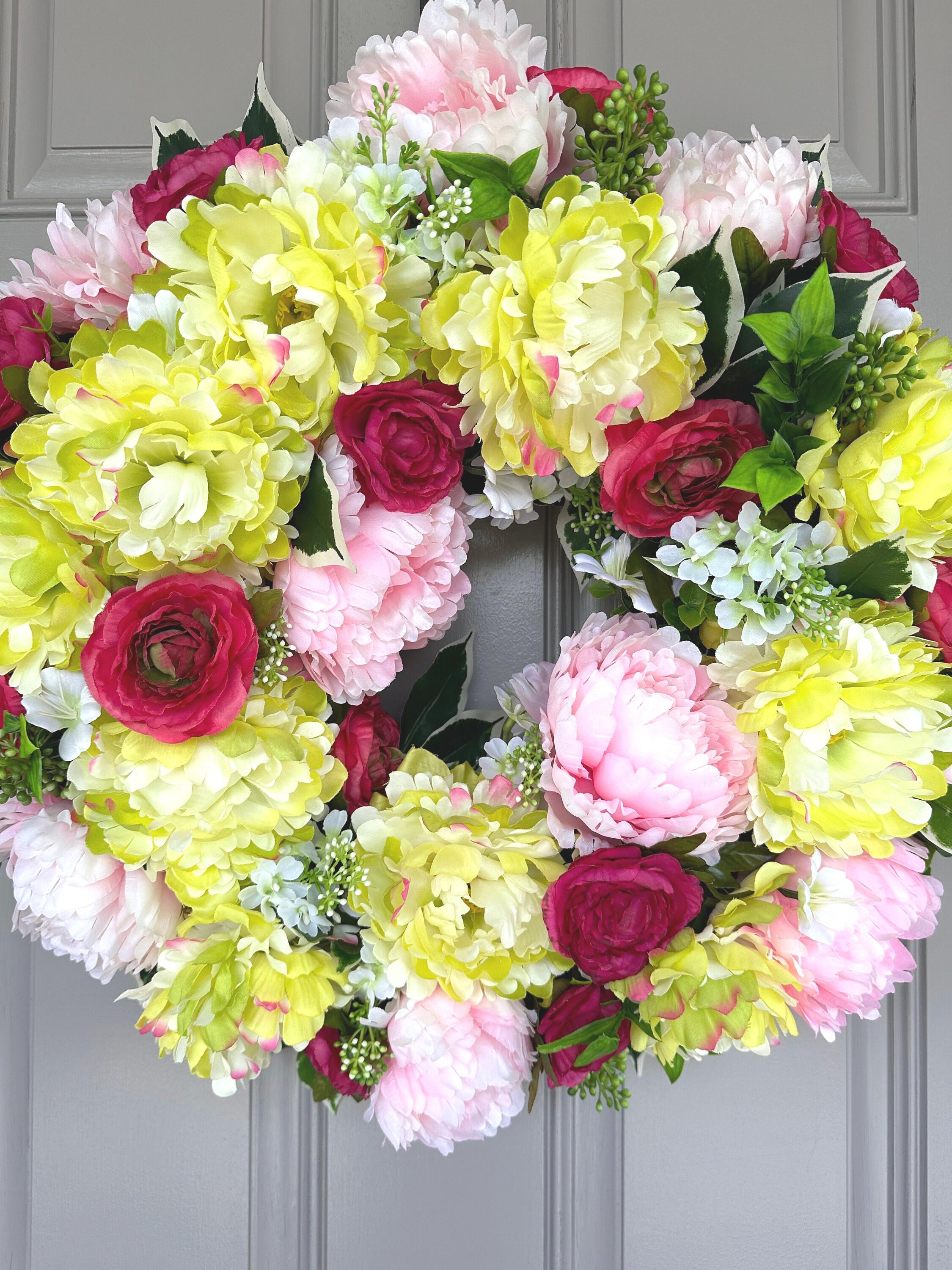 Colorful spring and summer mix of eye catching yellow lime and pink peonies with hot pink-red ranunculus wreath is a fun and inviting welcome door decor for all. It measures 22-inches across and 7-inches deep.