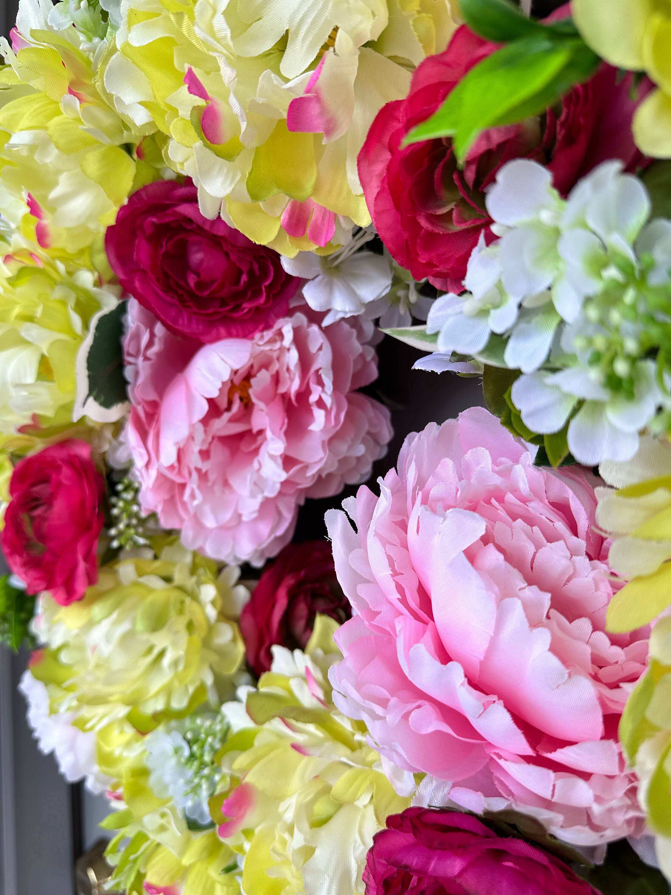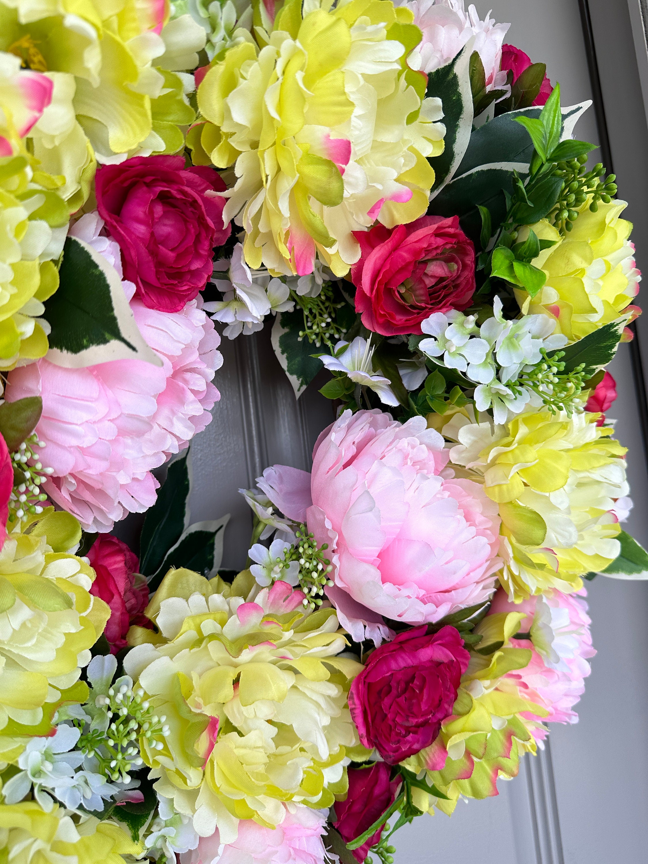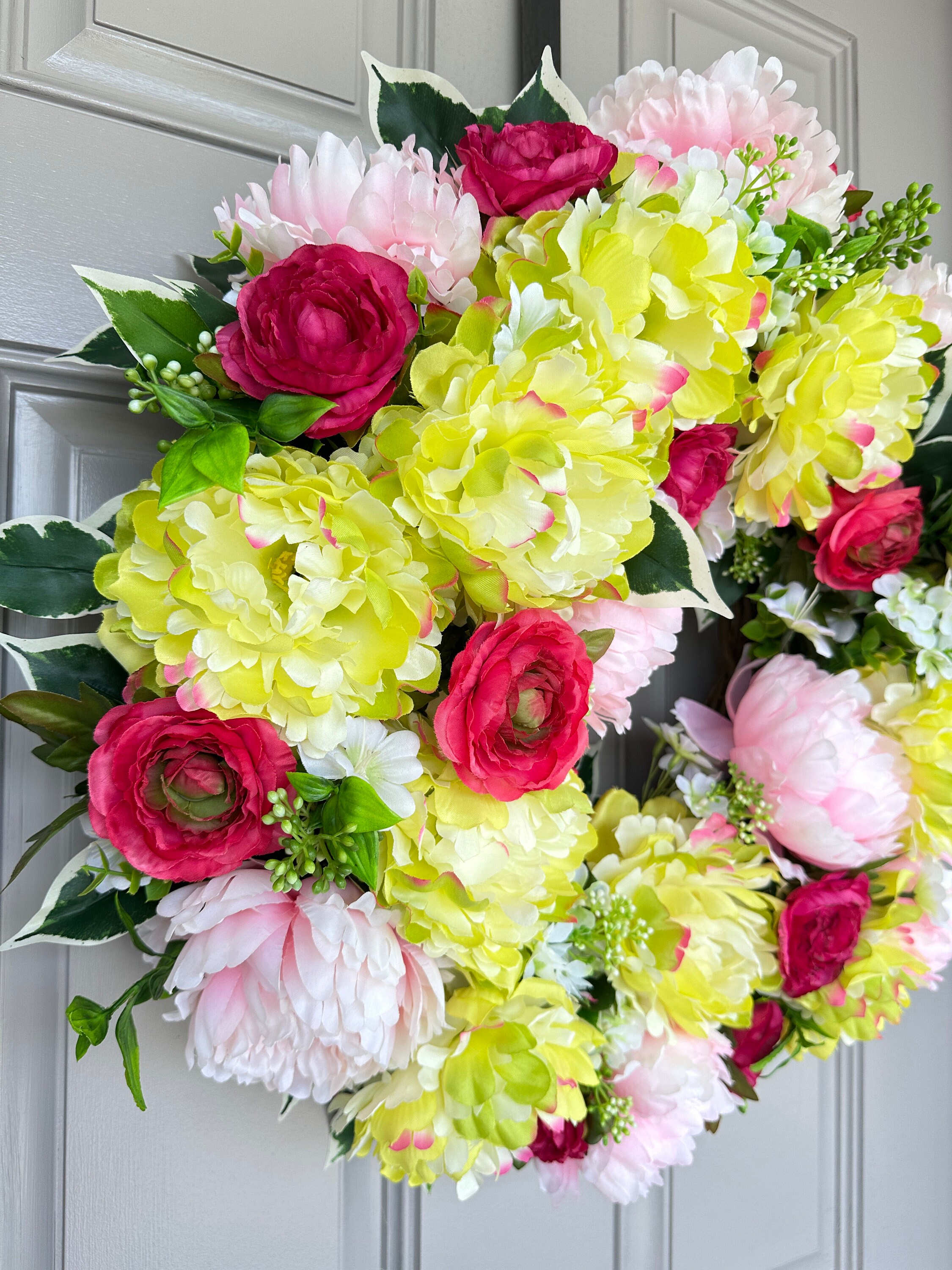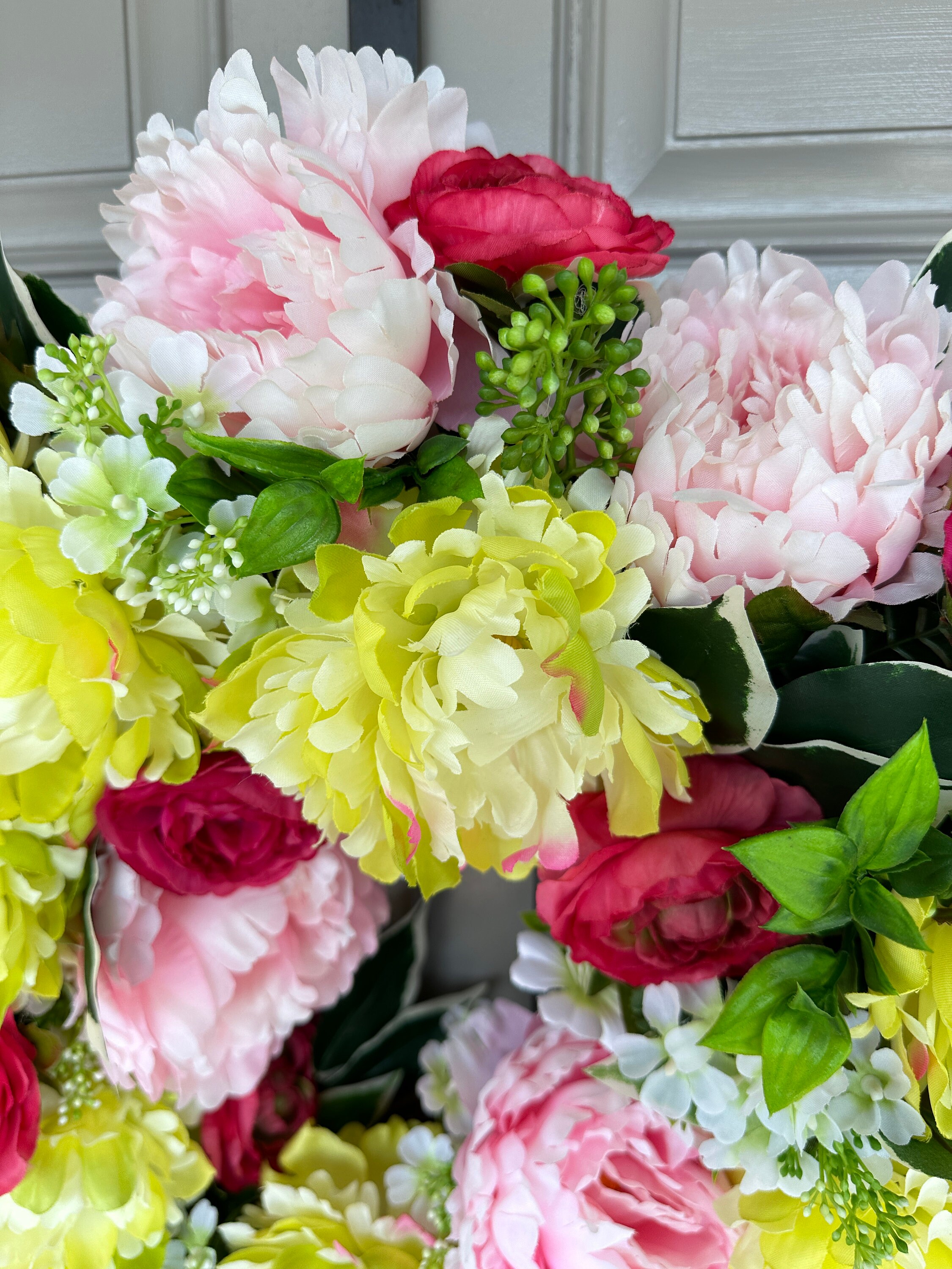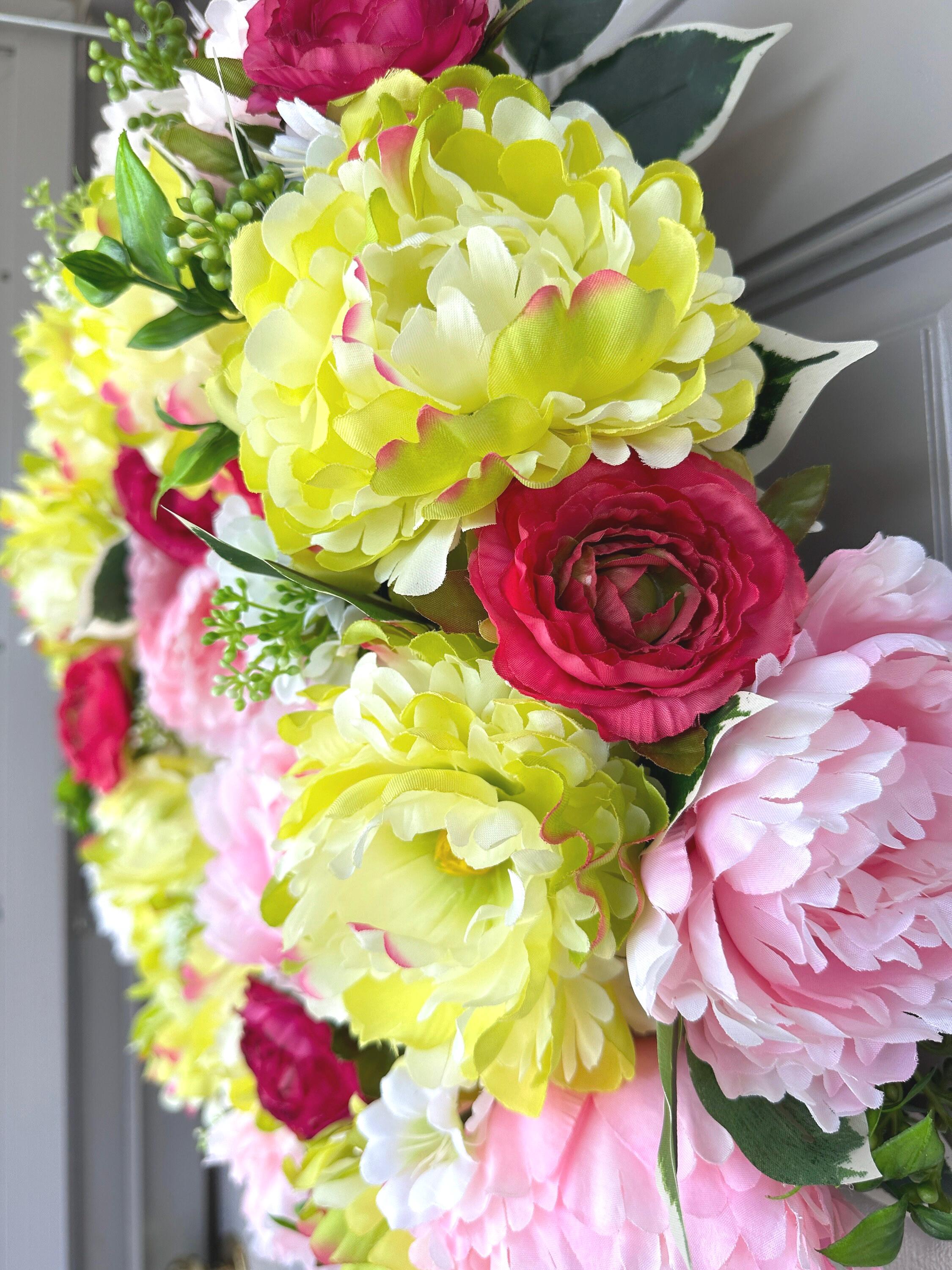Colorful spring and summer mix of eye catching yellow lime and pink peonies with hot pink-red ranunculus wreath is a fun and inviting welcome door decor for all. It measures 22-inches across and 7-inches deep.