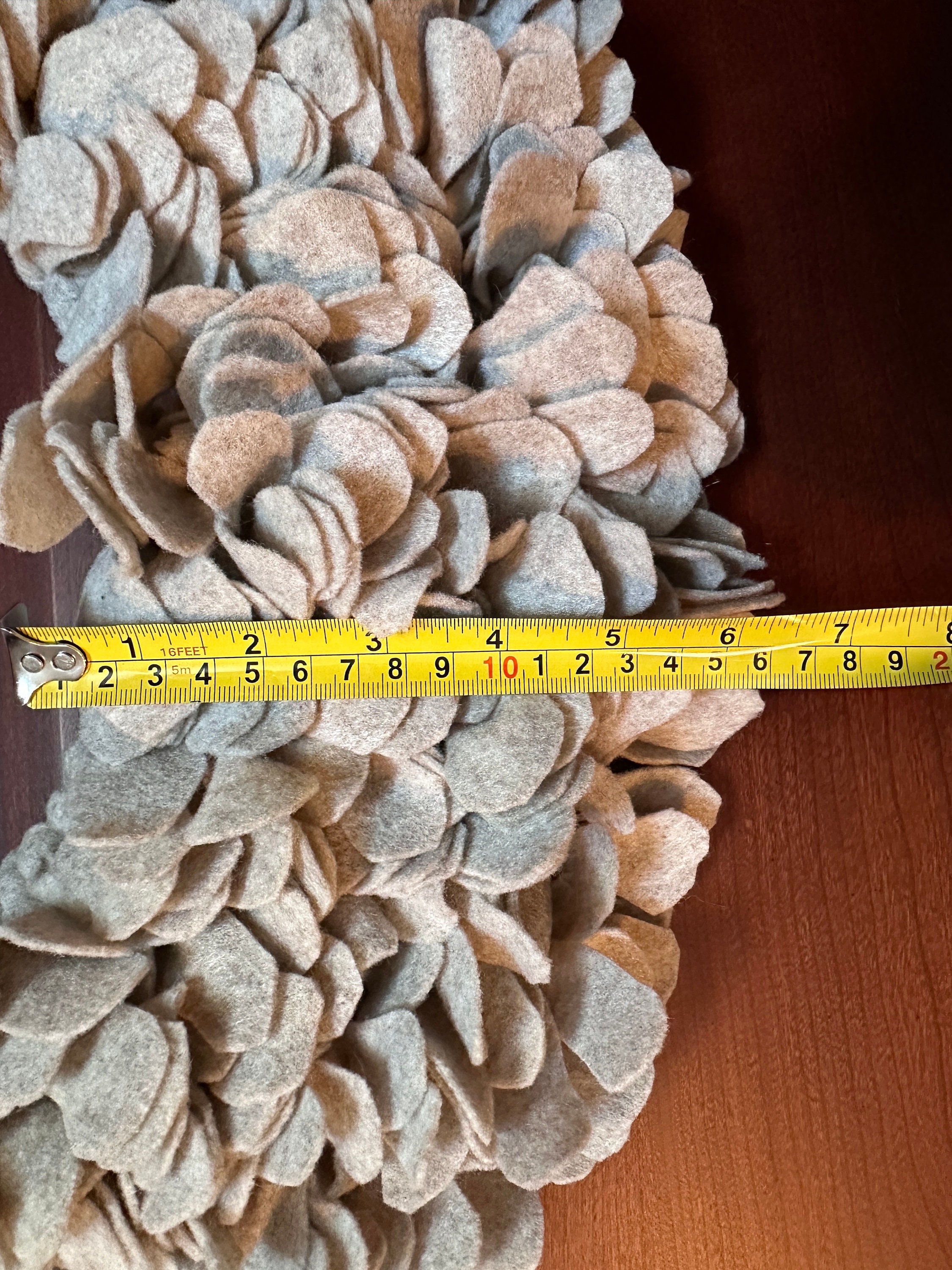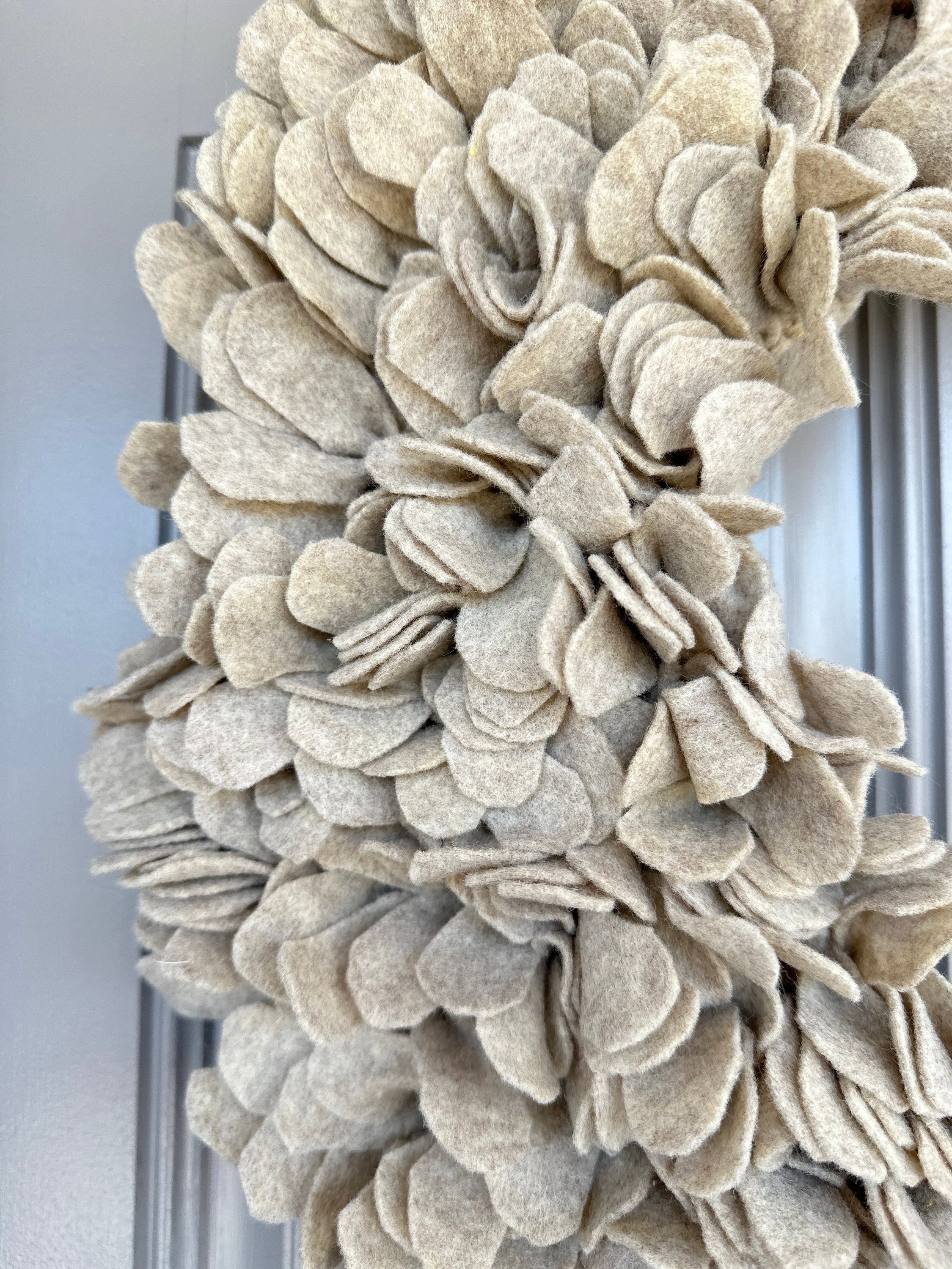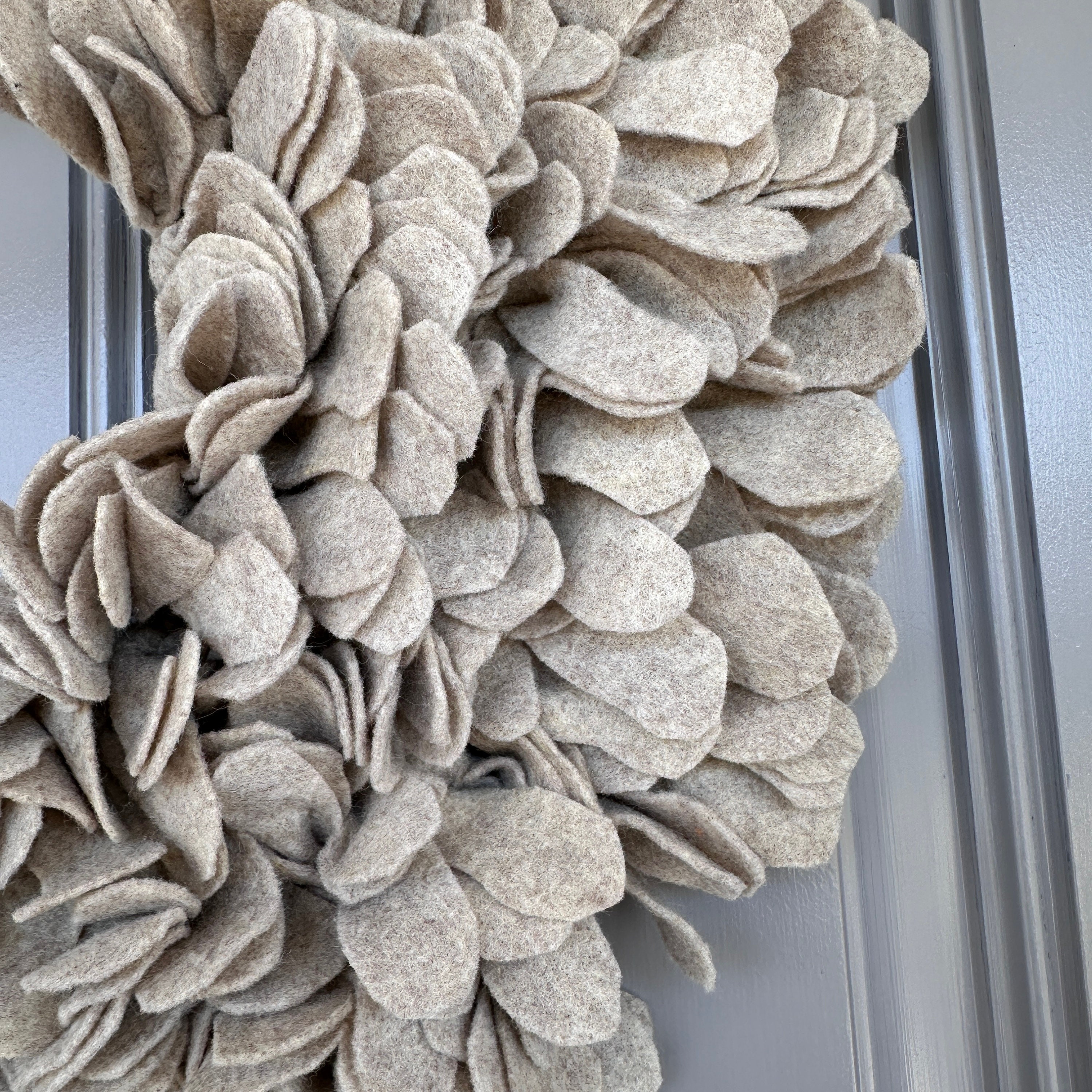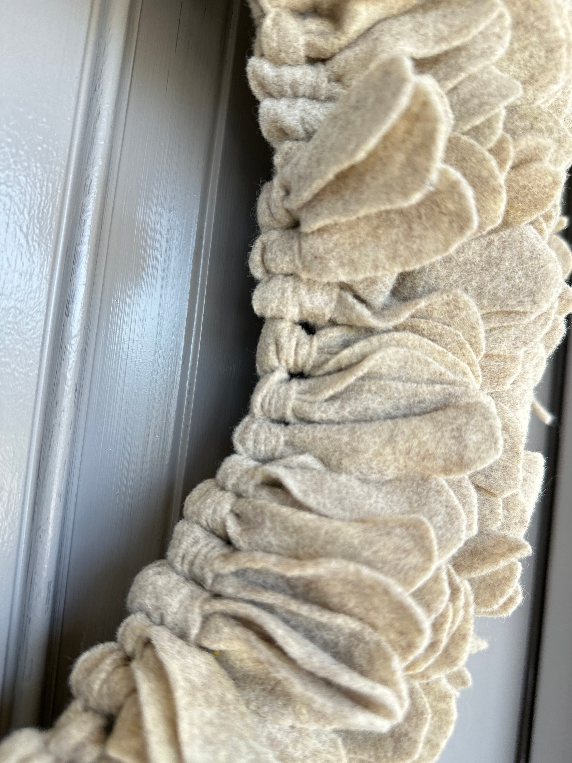 Leaves on this wreath are individually hand-cut from a polyester fabric felt into squiggly strips then hand tied. A total of 600 leaves are tied onto 6 metal base rings (see picture of back). This wreath is a unique and rare one of a kind. It is lightweight and shallow in depth of 3” and can comfortably fit behind a glass storm door.