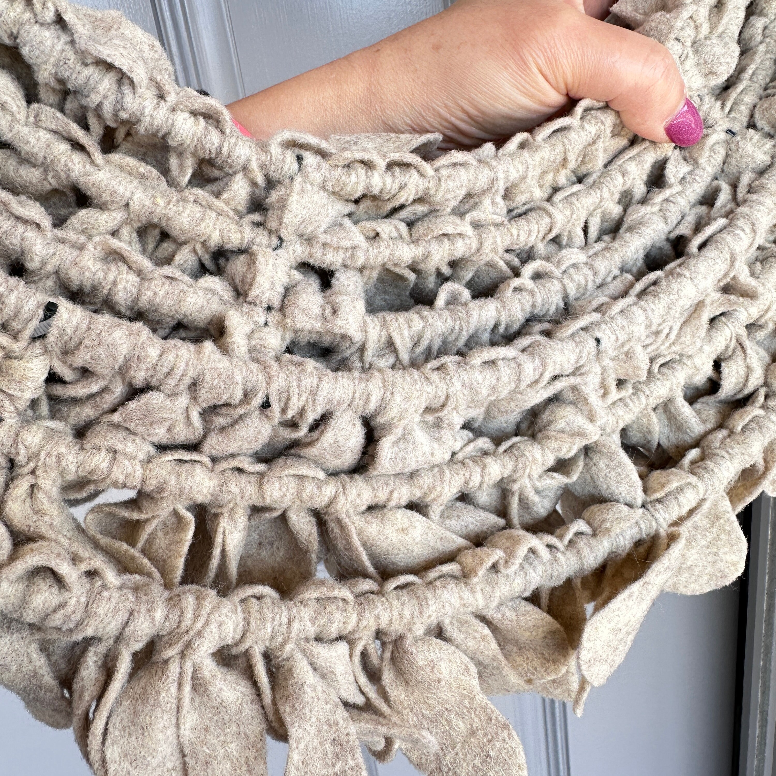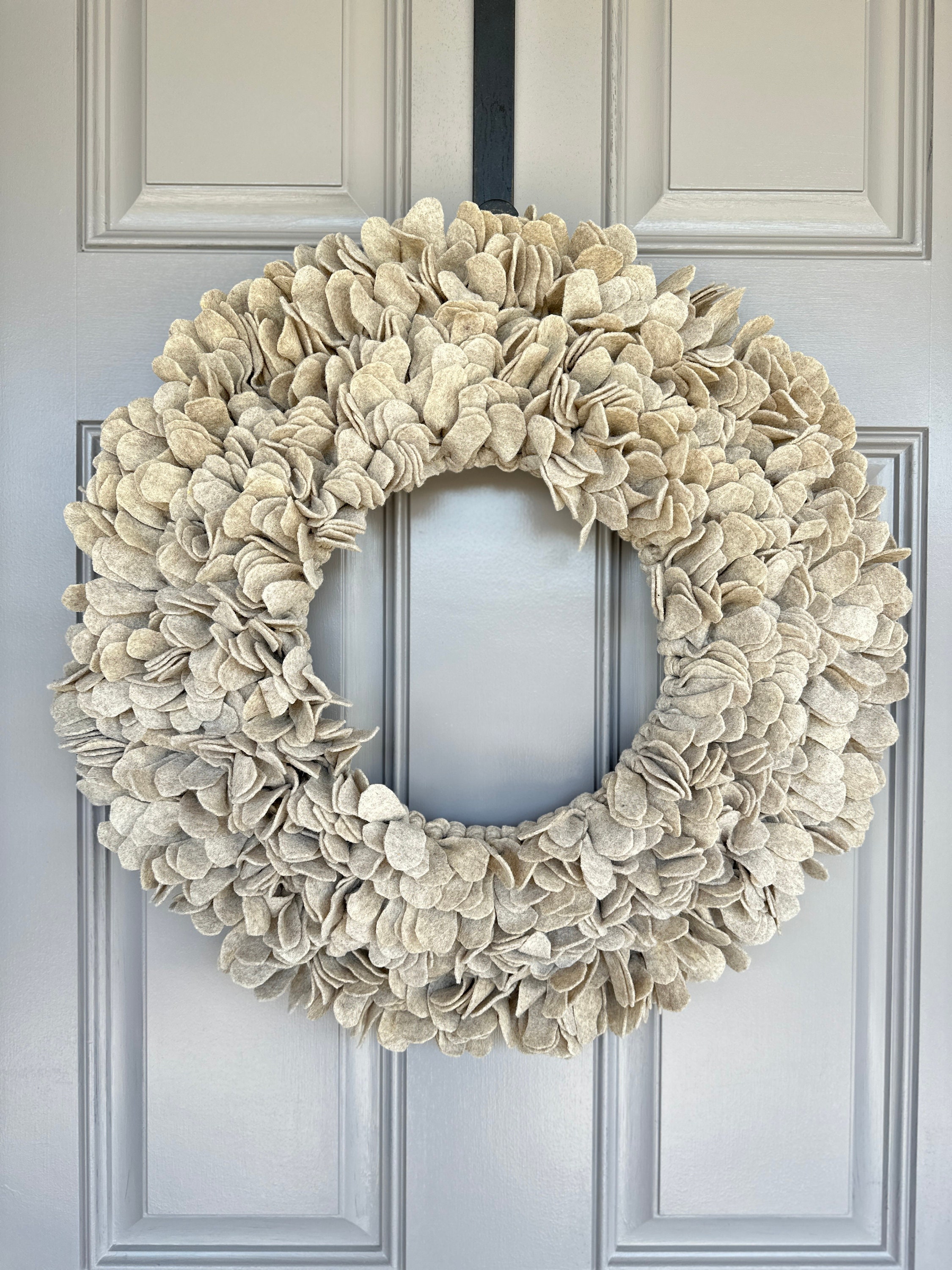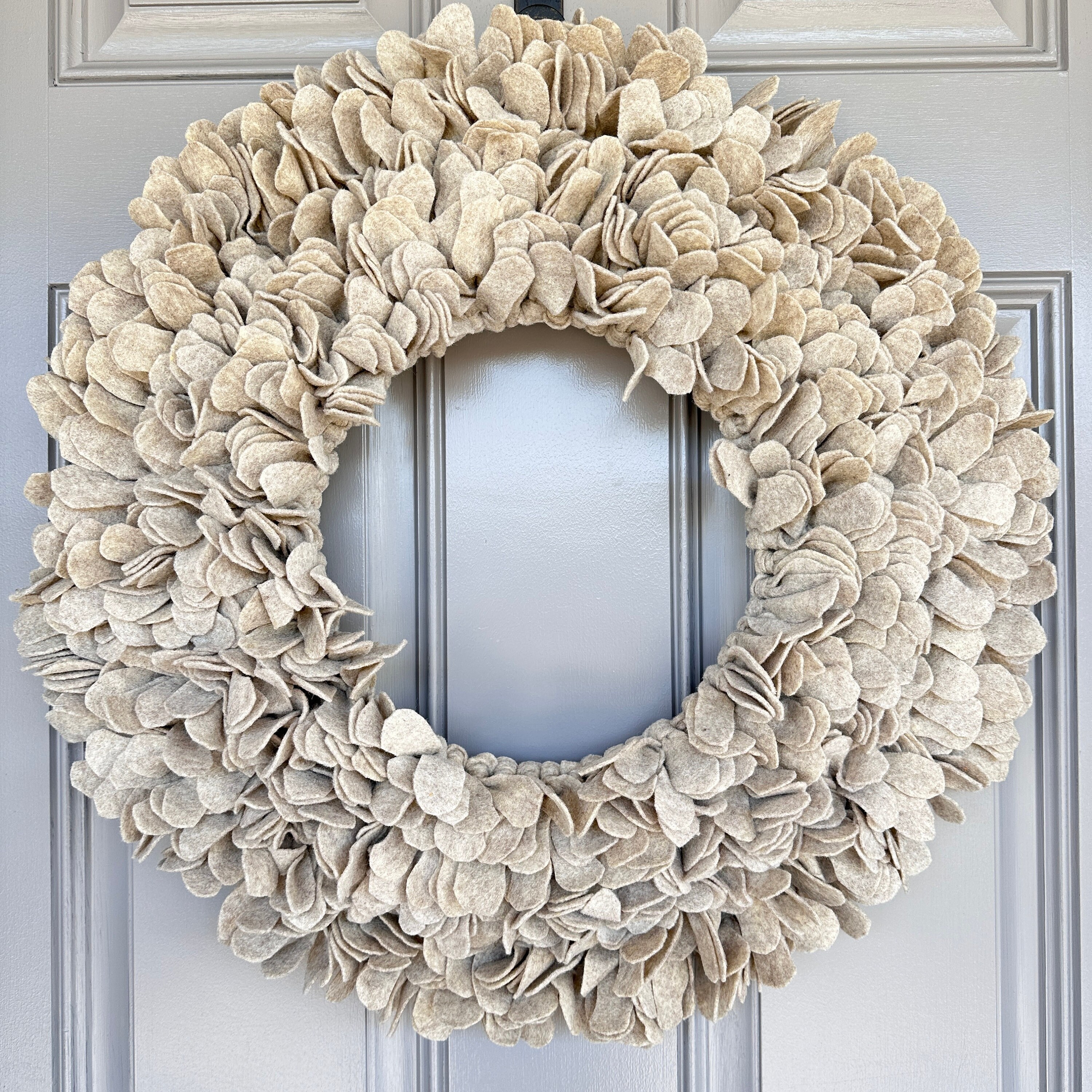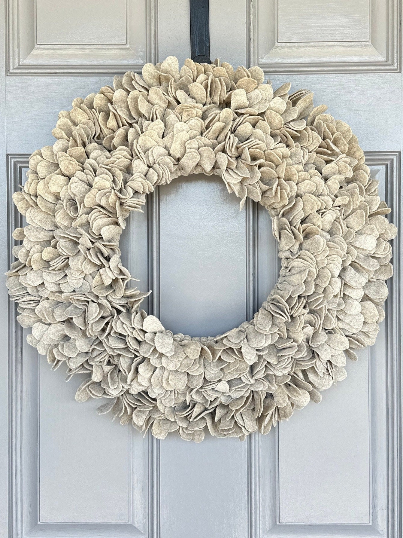 Leaves on this wreath are individually hand-cut from a polyester fabric felt into squiggly strips then hand tied. A total of 600 leaves are tied onto 6 metal base rings (see picture of back). This wreath is a unique and rare one of a kind. It is lightweight and shallow in depth of 3” and can comfortably fit behind a glass storm door.