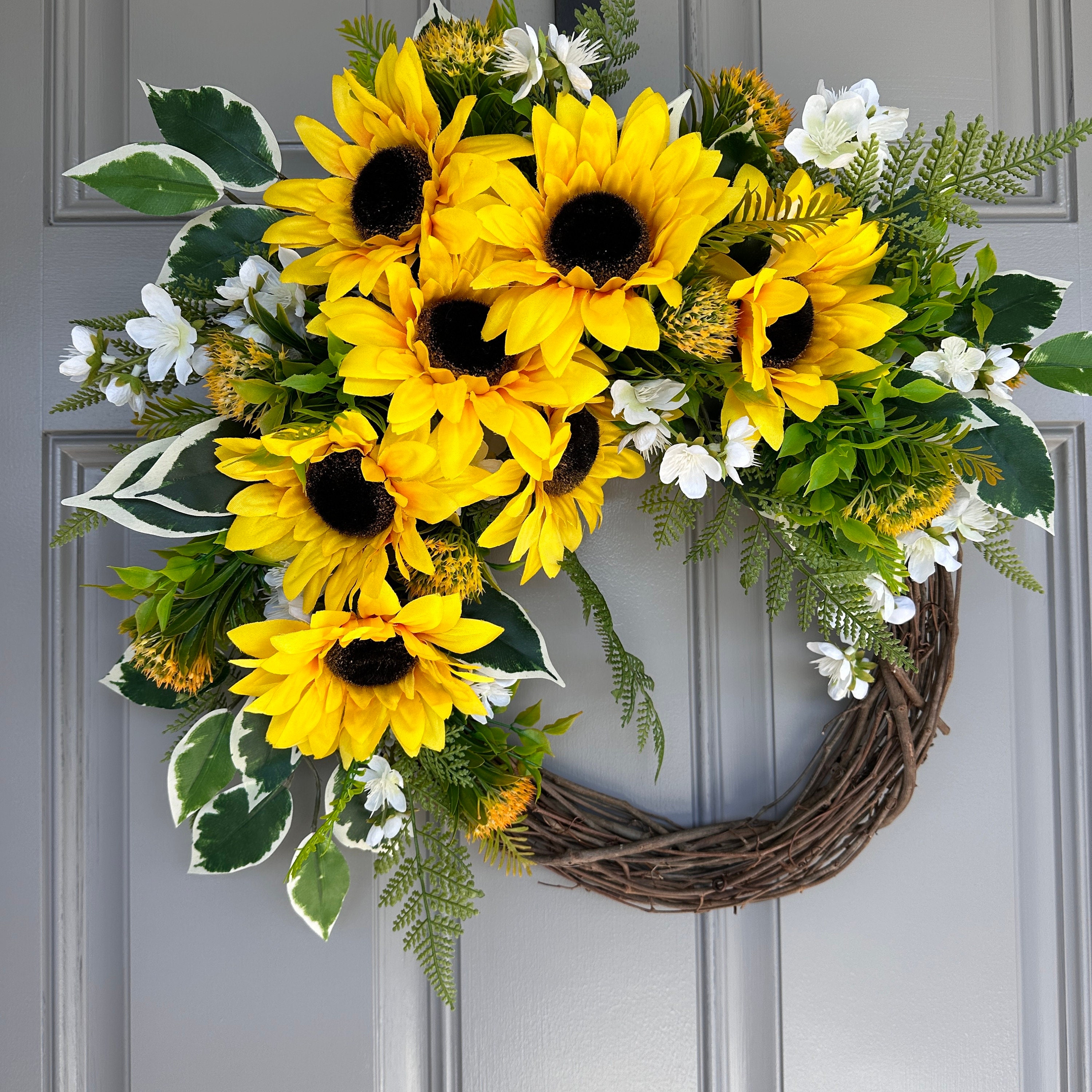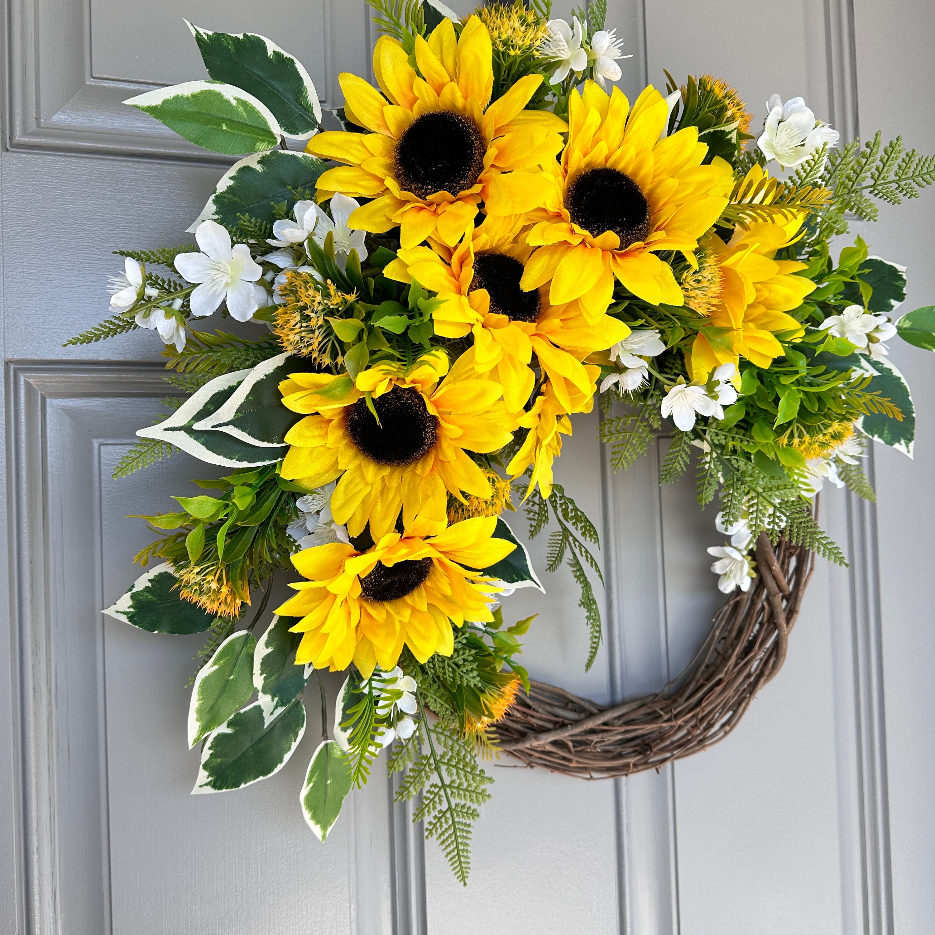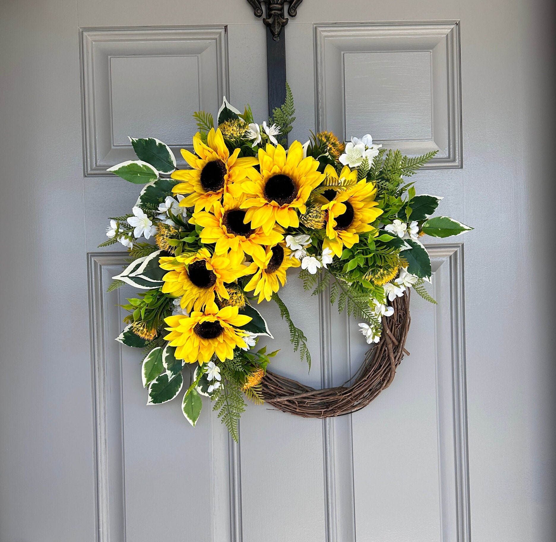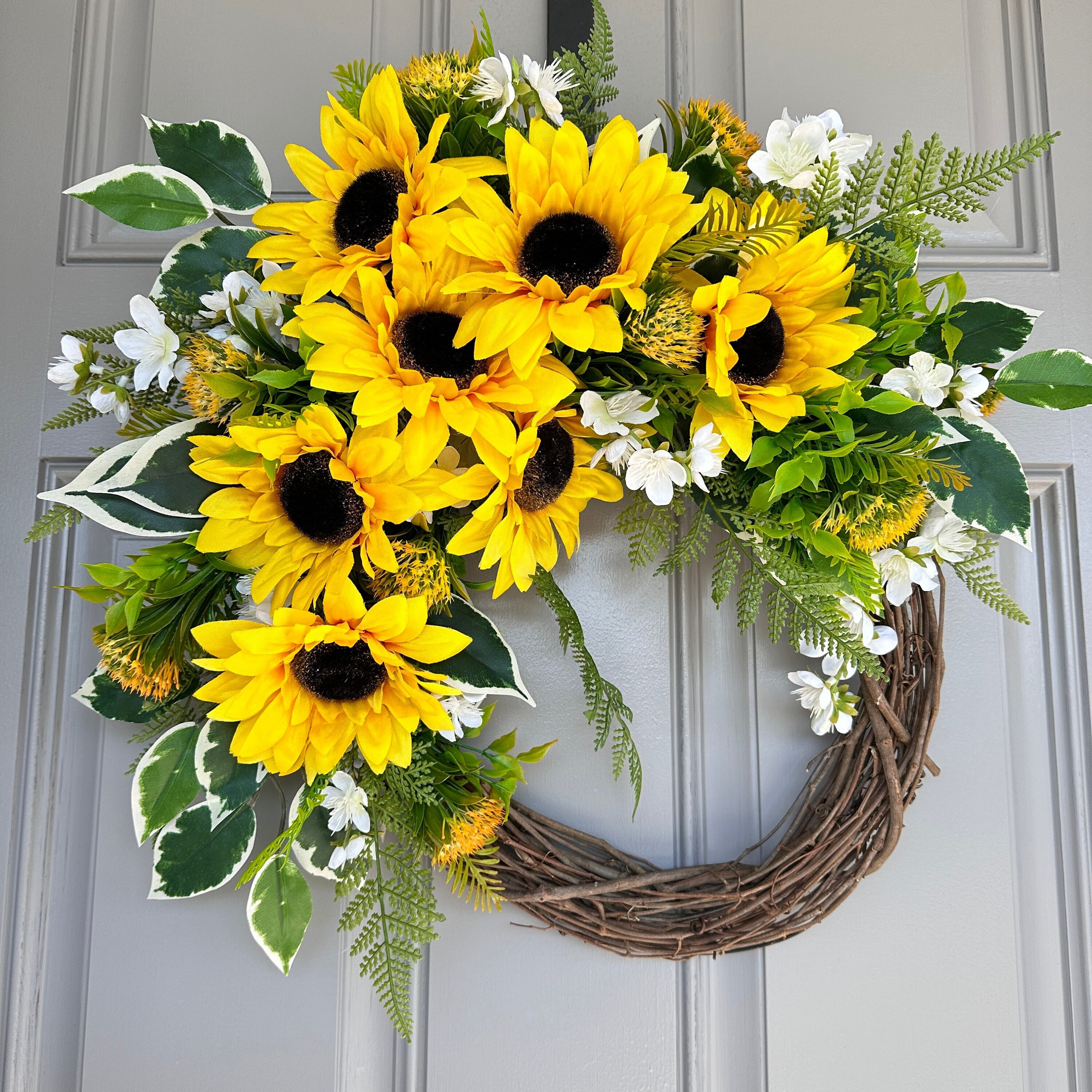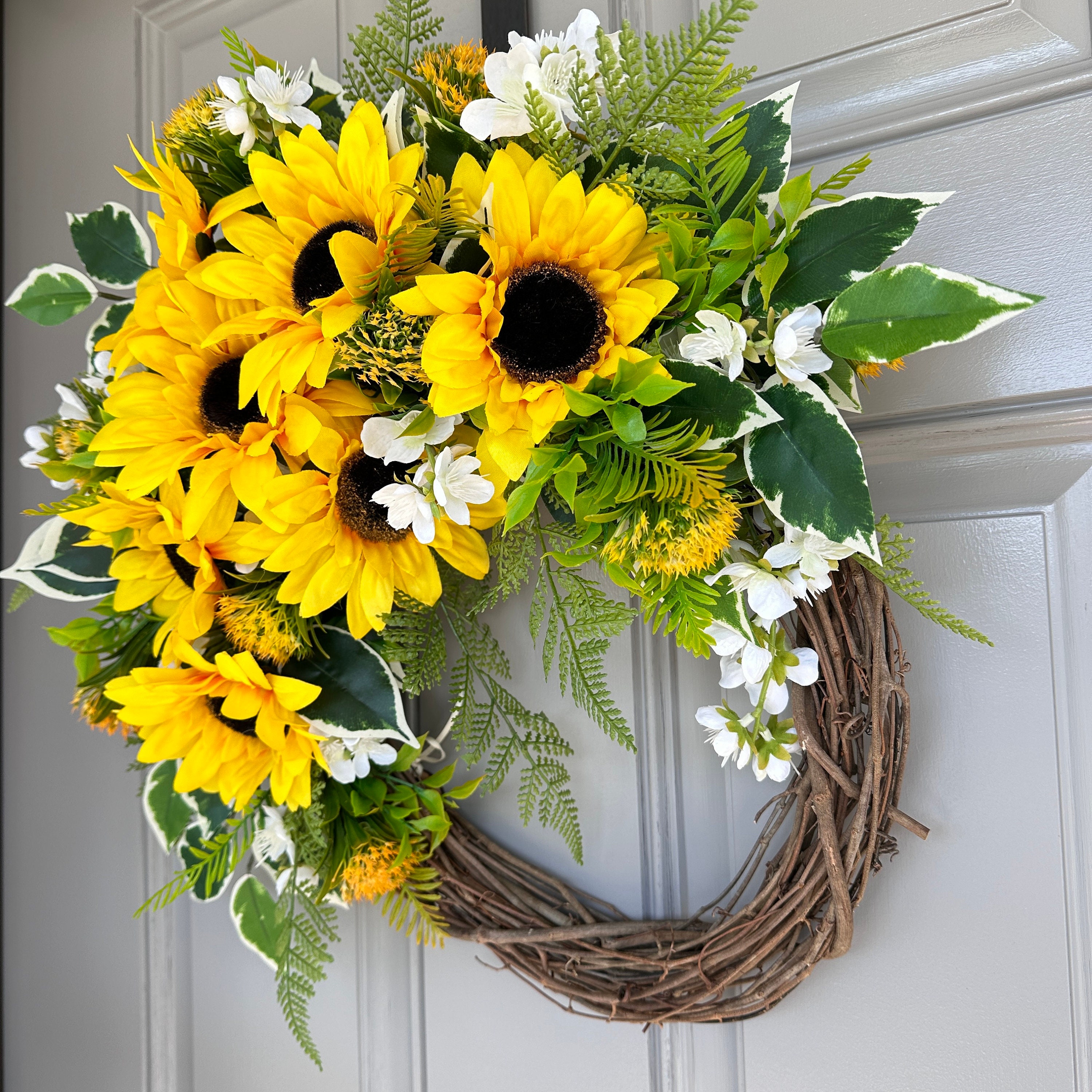 Rustic modern country farmhouse style yellow sunflower wreath for simple yet classic elegance has been designed for your home. This beautiful quality wreath was curated on a 14-inch grapevine and makes a perfect gift for yourself or for a loved one. **made to order - white myrtles may be substituted depending on supply.