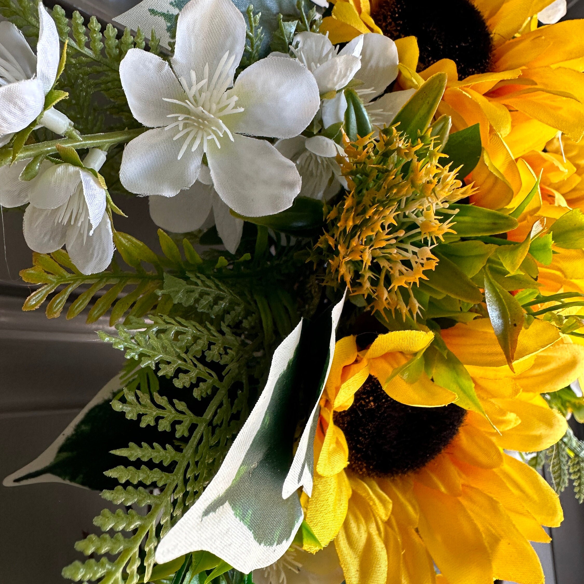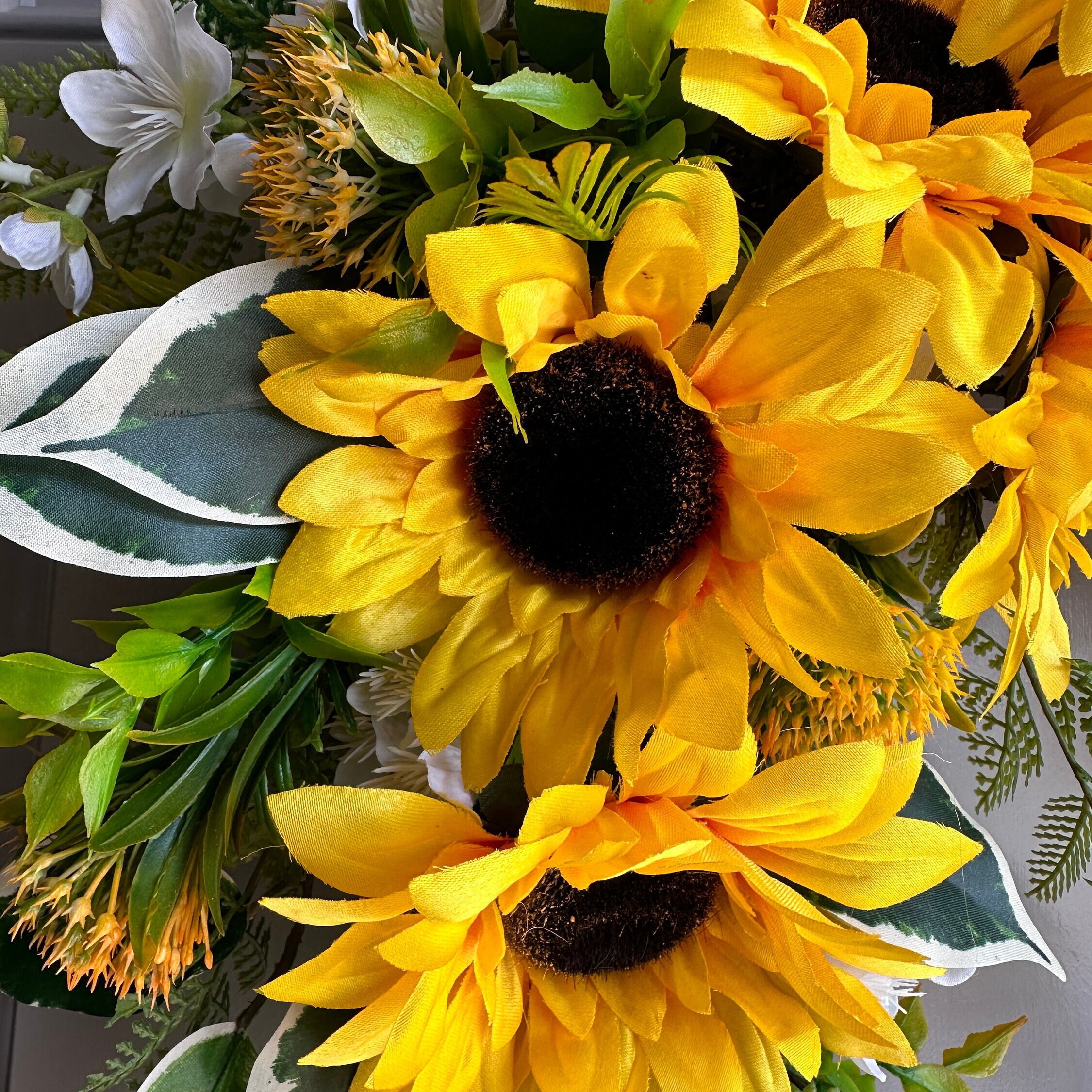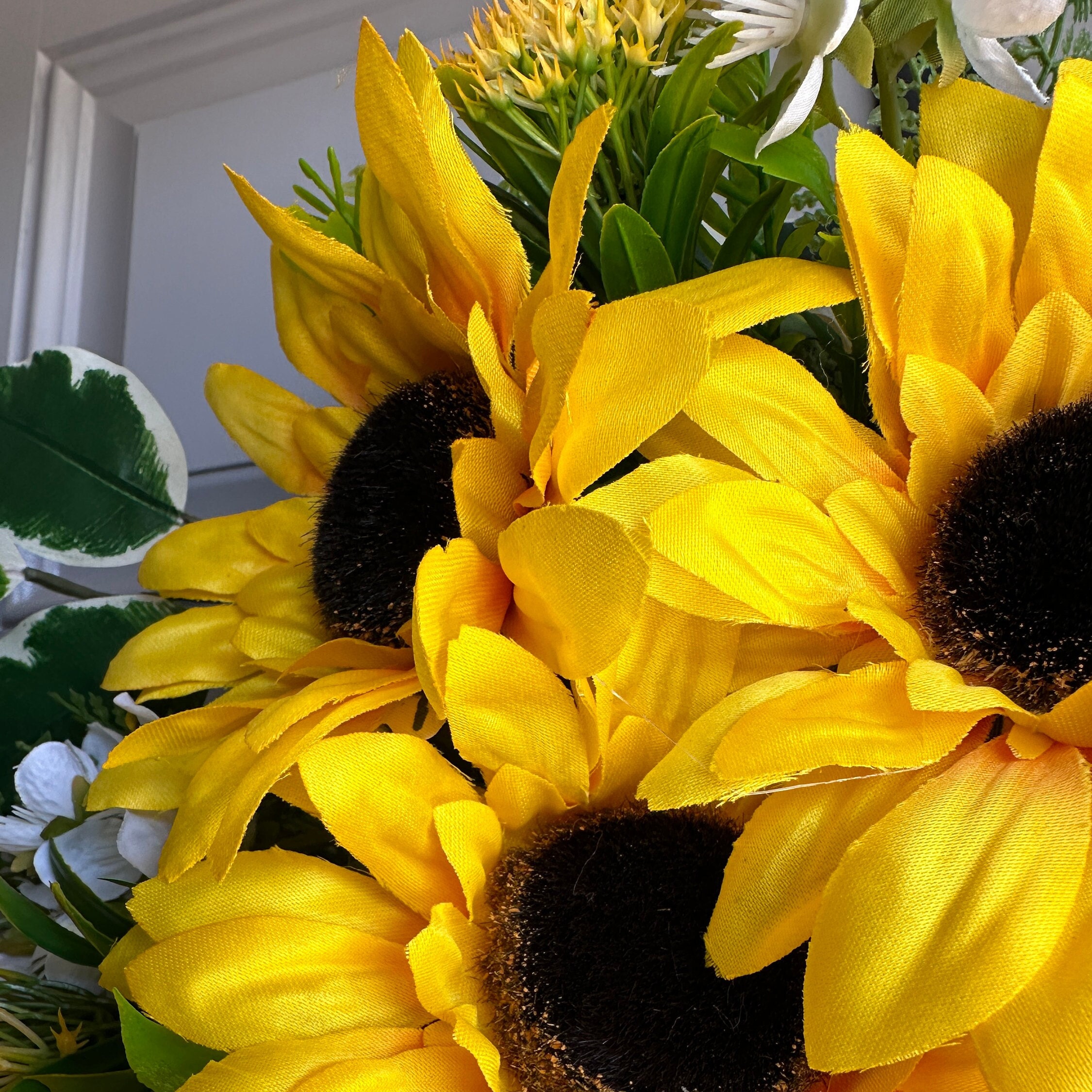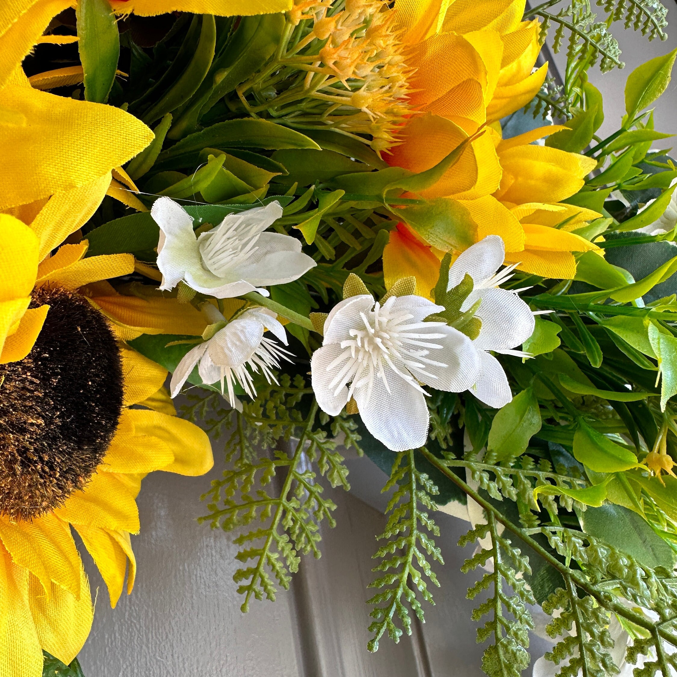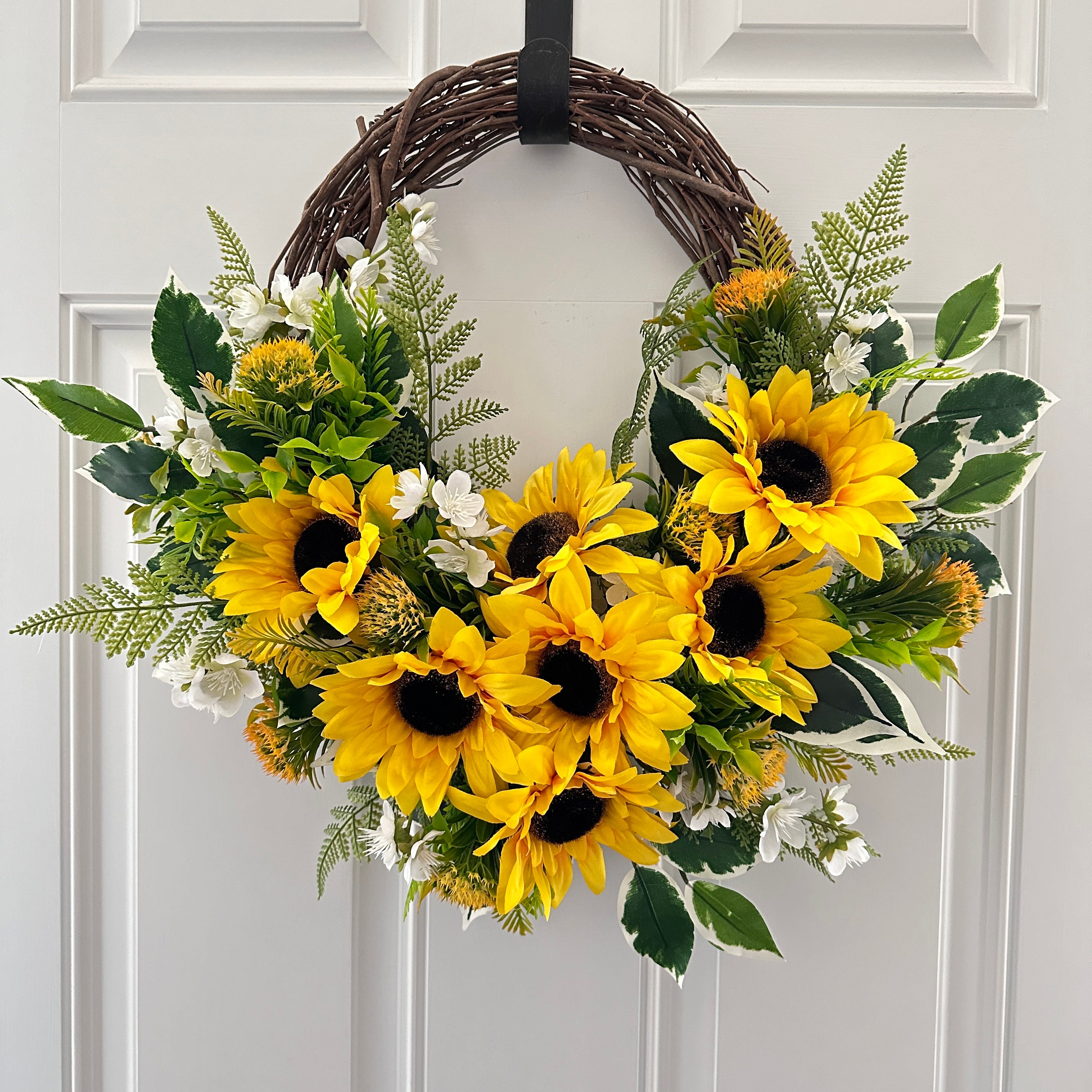 Rustic modern country farmhouse style yellow sunflower wreath for simple yet classic elegance has been designed for your home. This beautiful quality wreath was curated on a 14-inch grapevine and makes a perfect gift for yourself or for a loved one. **made to order - white myrtles may be substituted depending on supply.