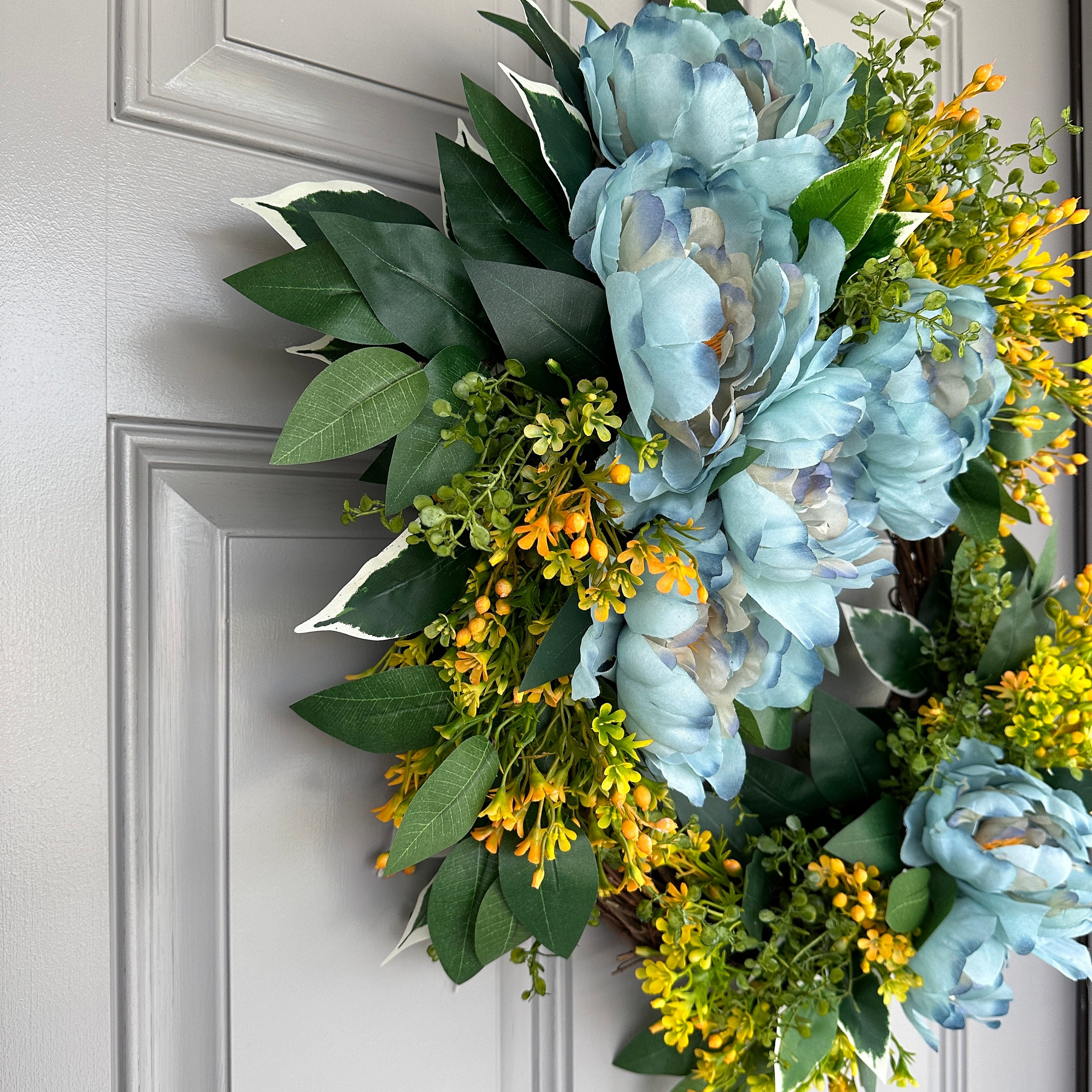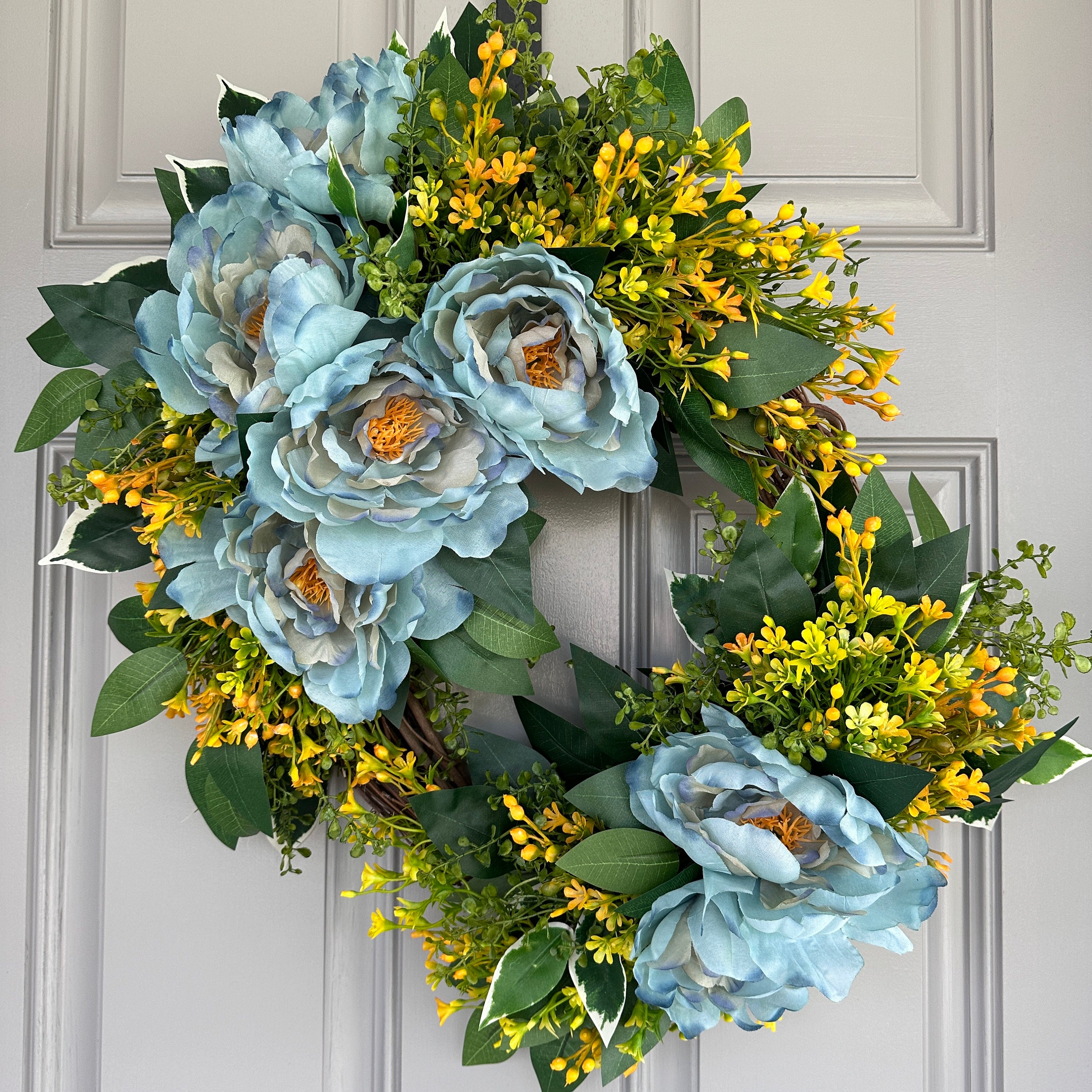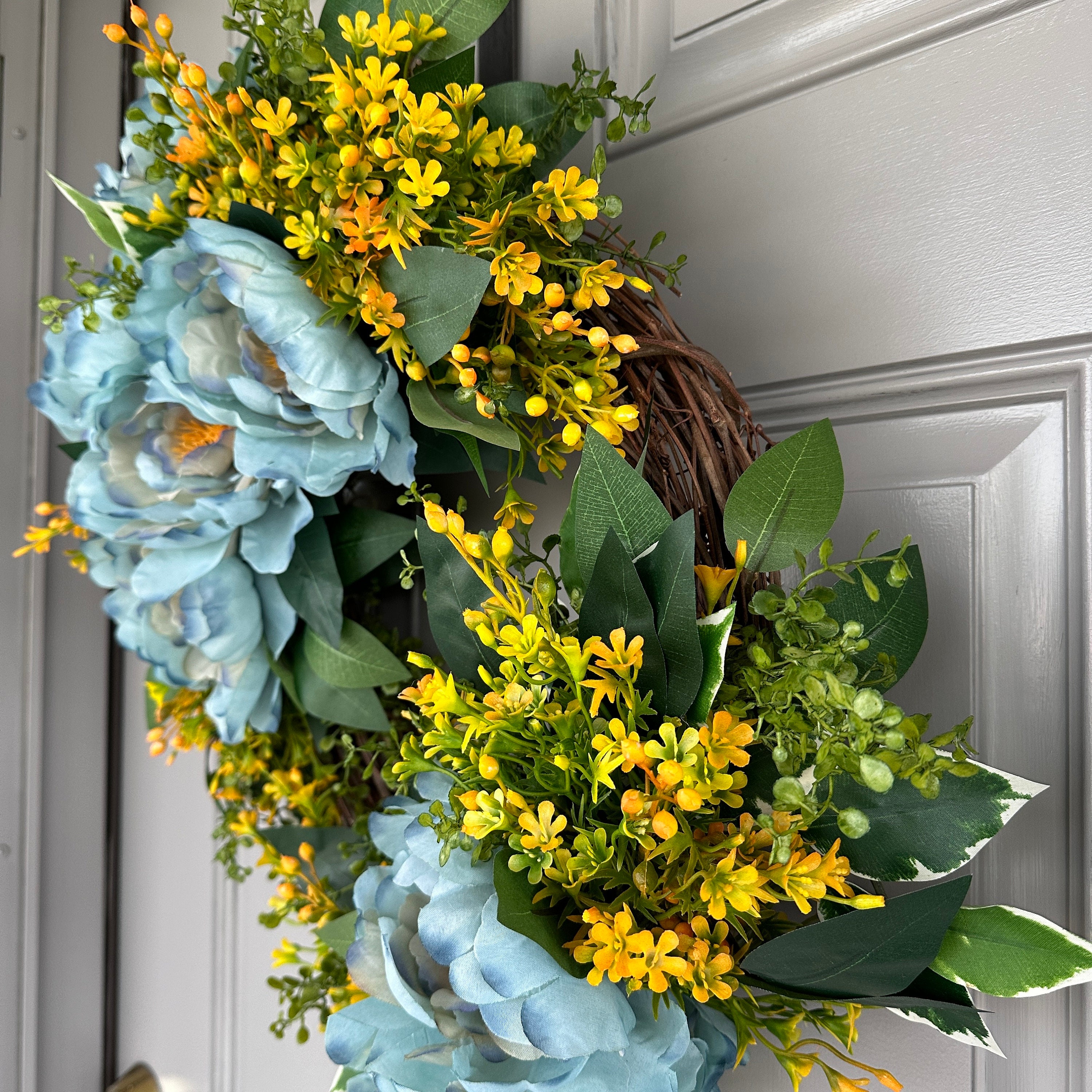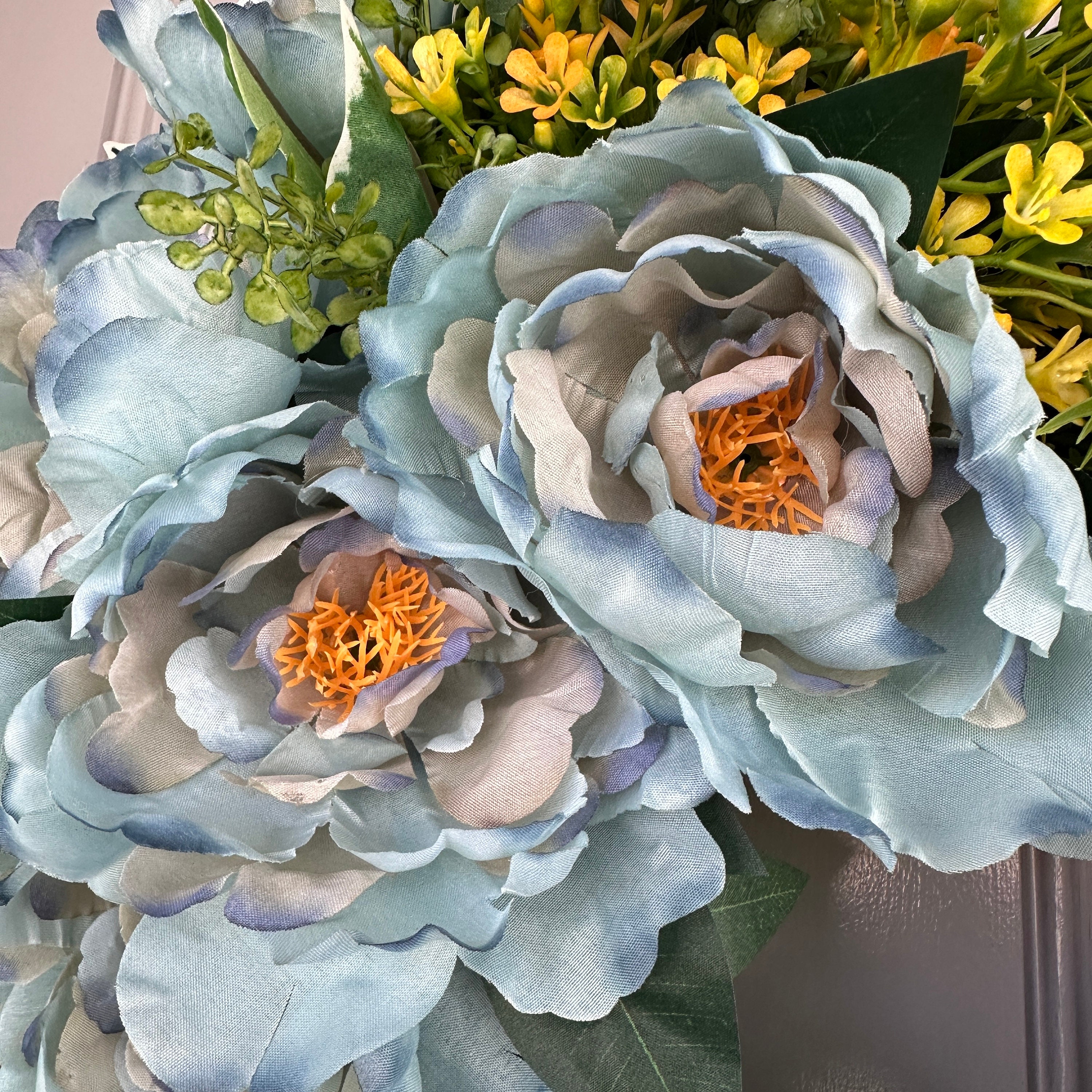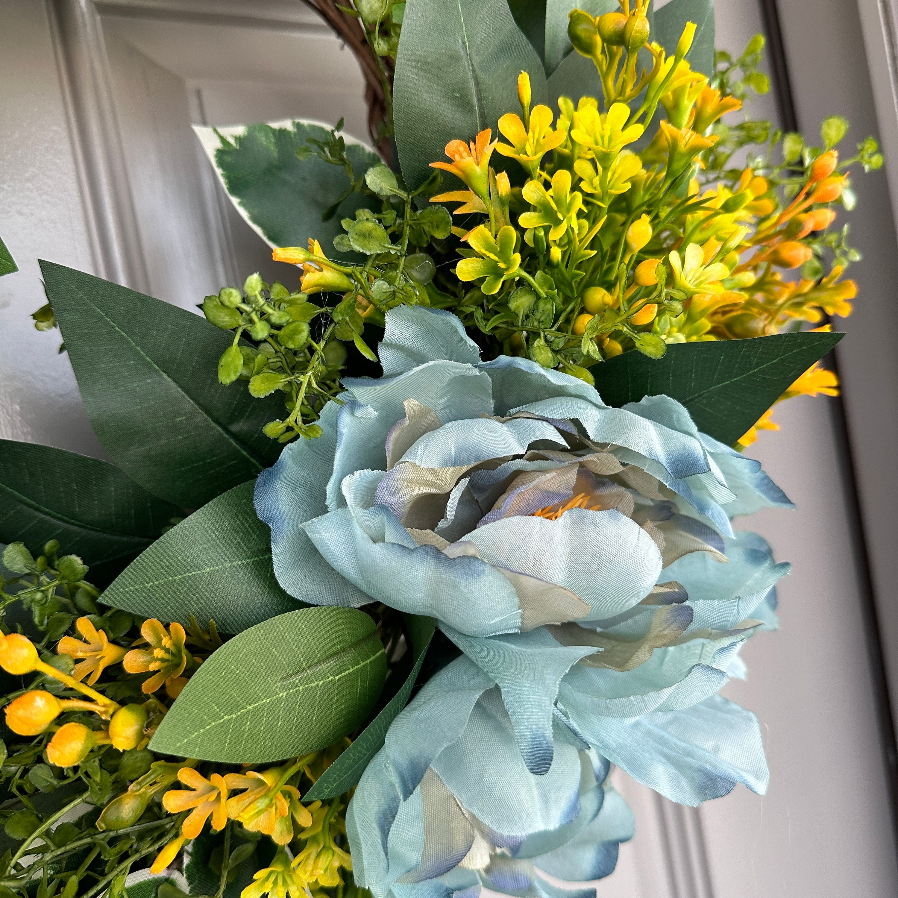 Trending blue and yellow mixed flowers in biased style newly designed this spring. Dusty blue peonies with yellow centers accompanied by small yellow flowers joyfully welcomes your friends and guests. A perfect multi season decor for your home. It measures approximately 24 inches from leaf tip to leaf tip, and 6 inches deep. This wreath will be treated with a coat of UV protectant spray as a service to protect your investment and to lengthen its longevity. However, this does not guarantee or fully protect your wreath from climate conditions or moisture.