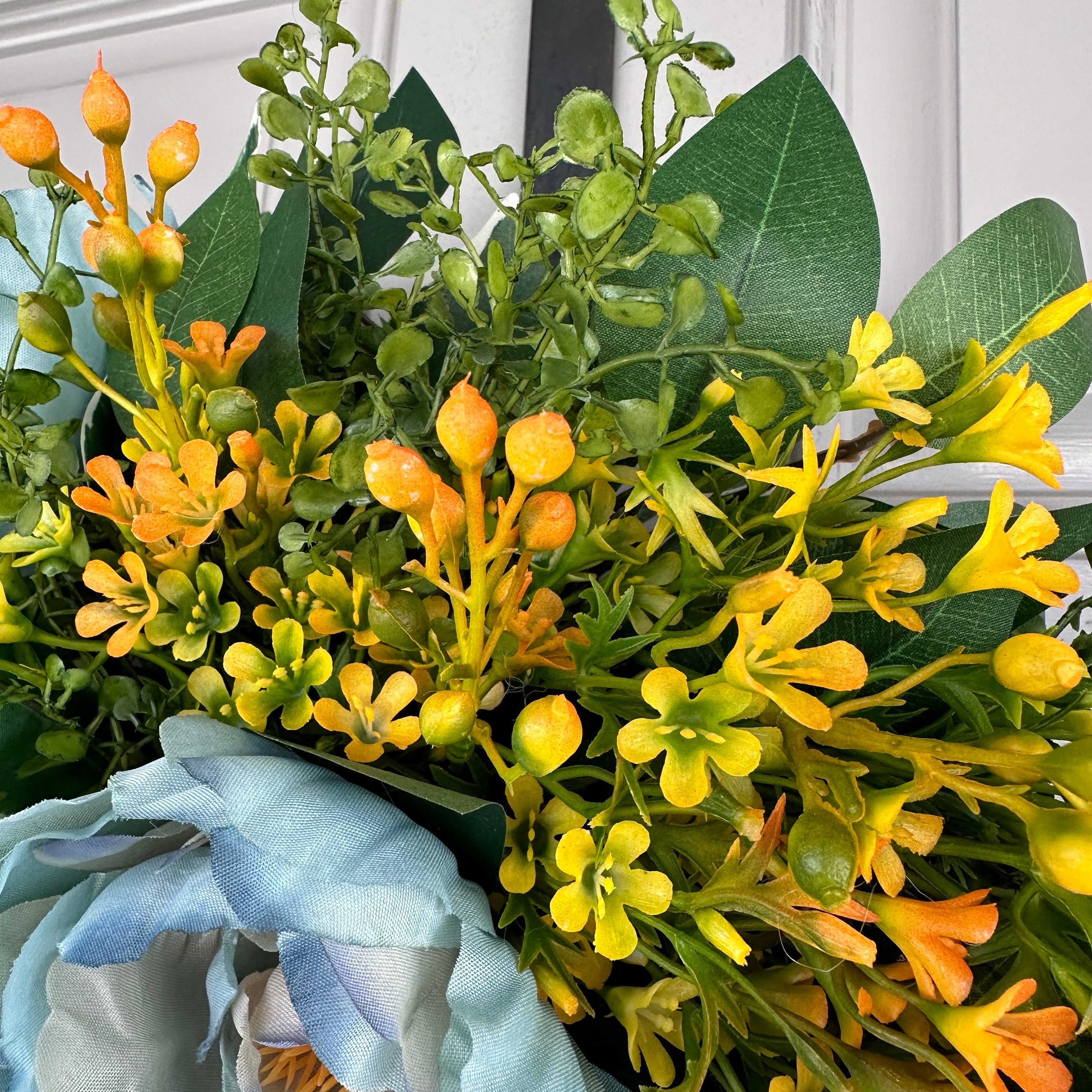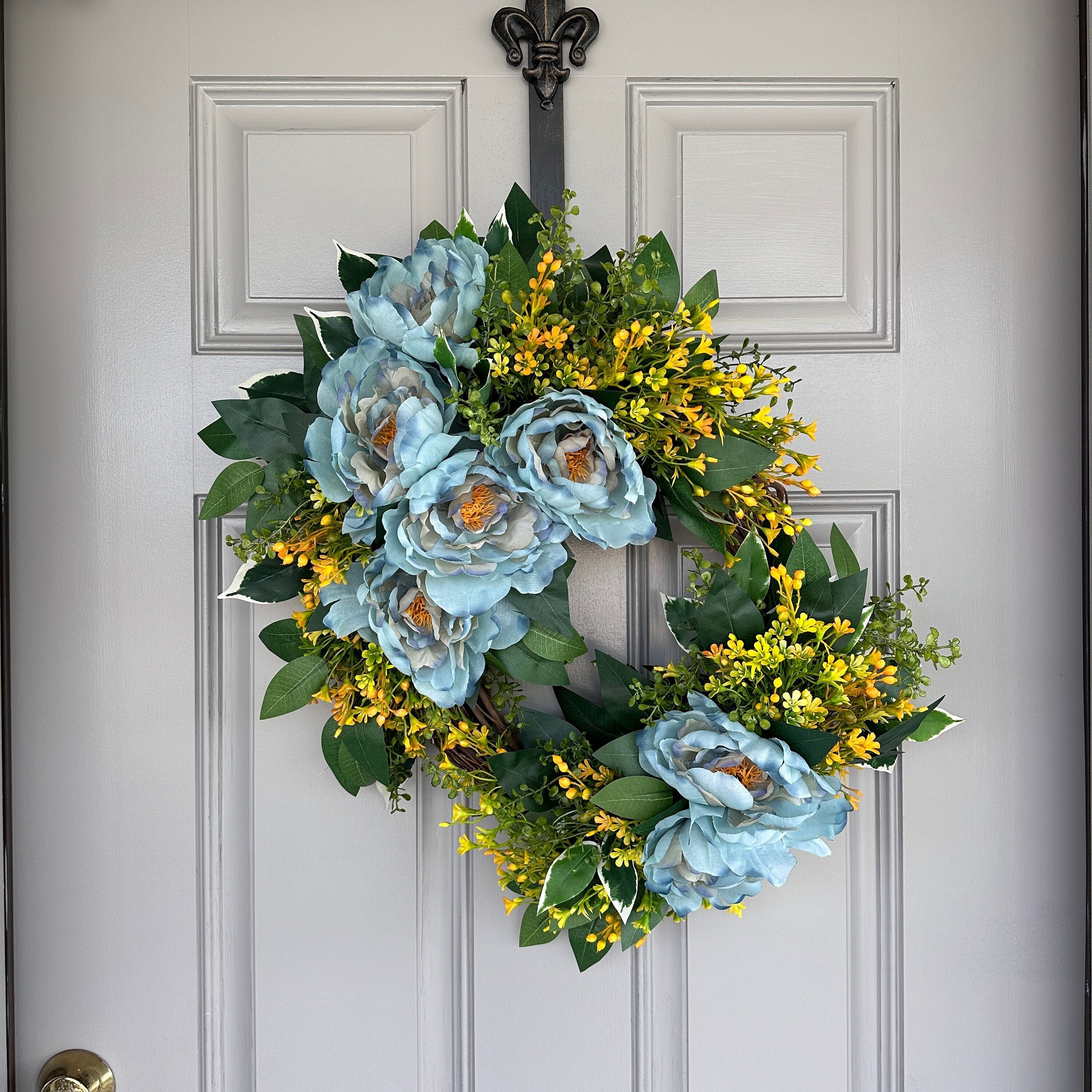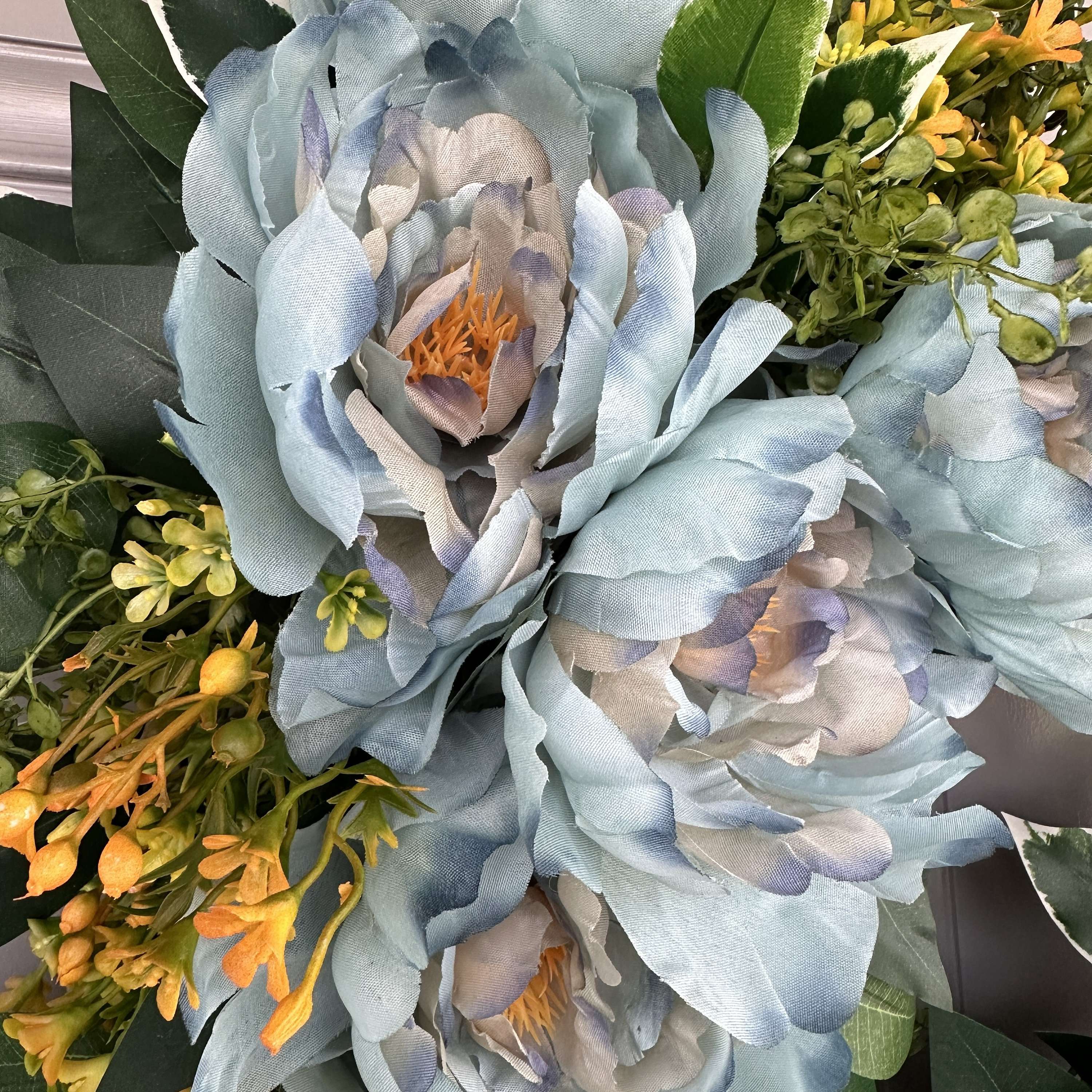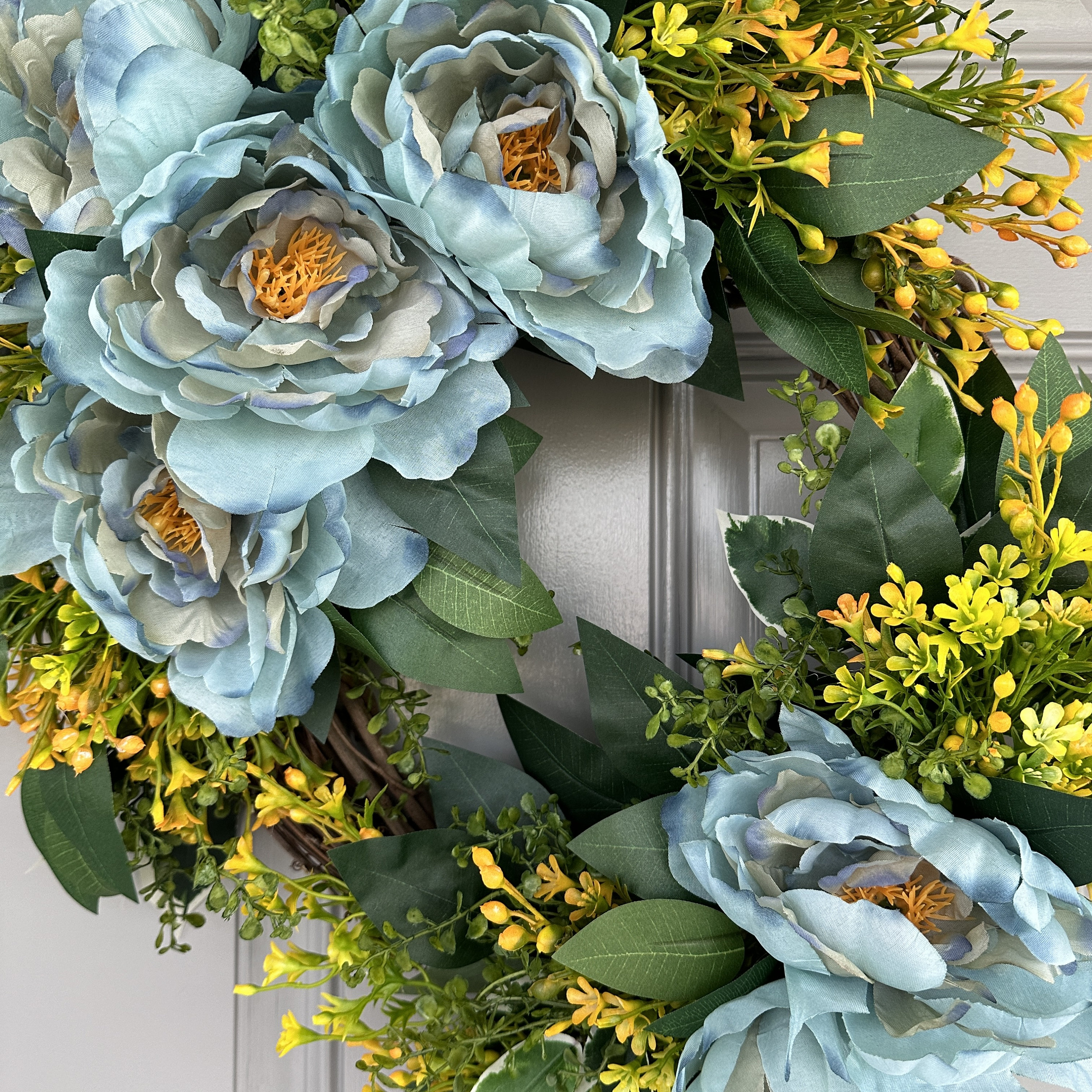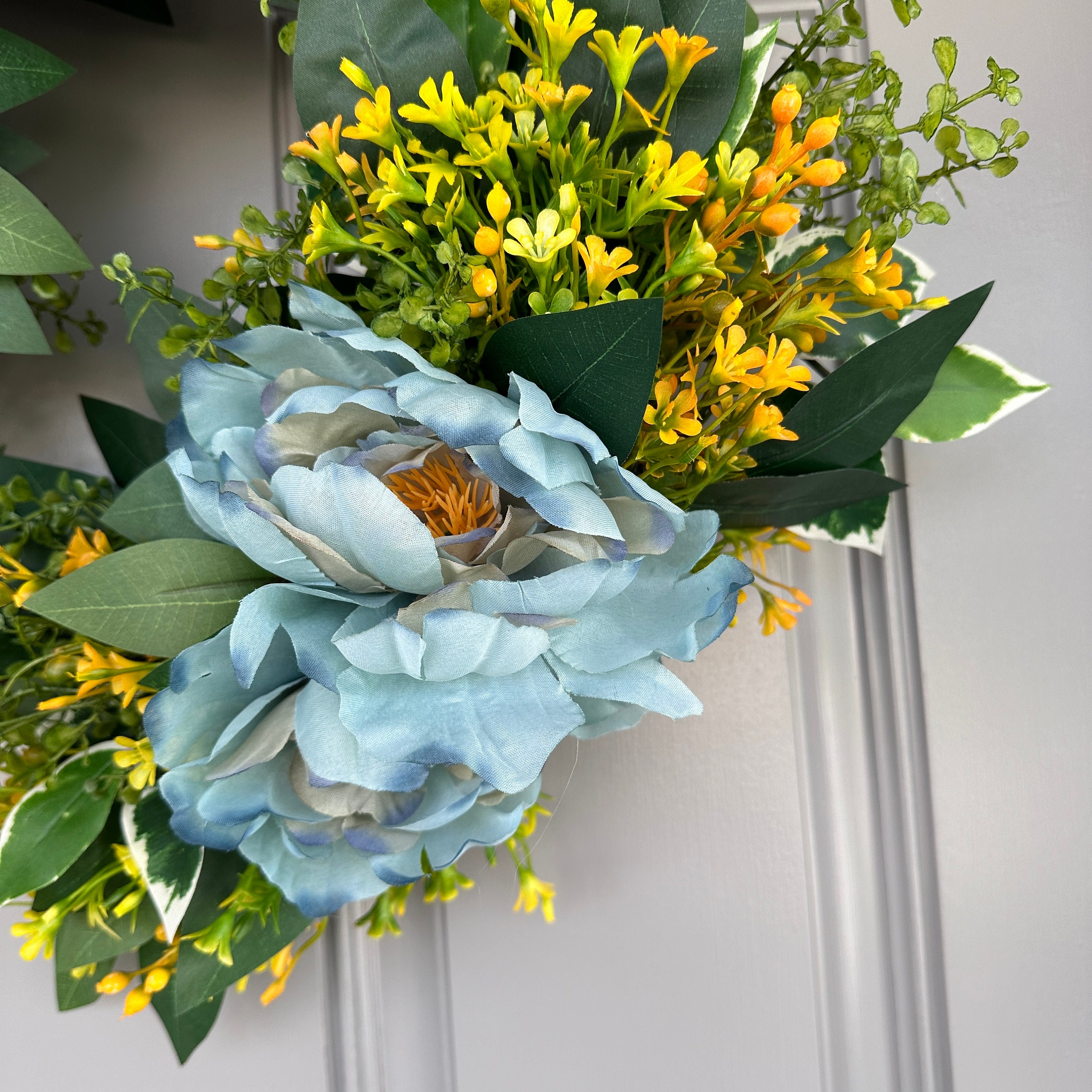 Trending blue and yellow mixed flowers in biased style newly designed this spring. Dusty blue peonies with yellow centers accompanied by small yellow flowers joyfully welcomes your friends and guests. A perfect multi season decor for your home. It measures approximately 24 inches from leaf tip to leaf tip, and 6 inches deep. This wreath will be treated with a coat of UV protectant spray as a service to protect your investment and to lengthen its longevity. However, this does not guarantee or fully protect your wreath from climate conditions or moisture.