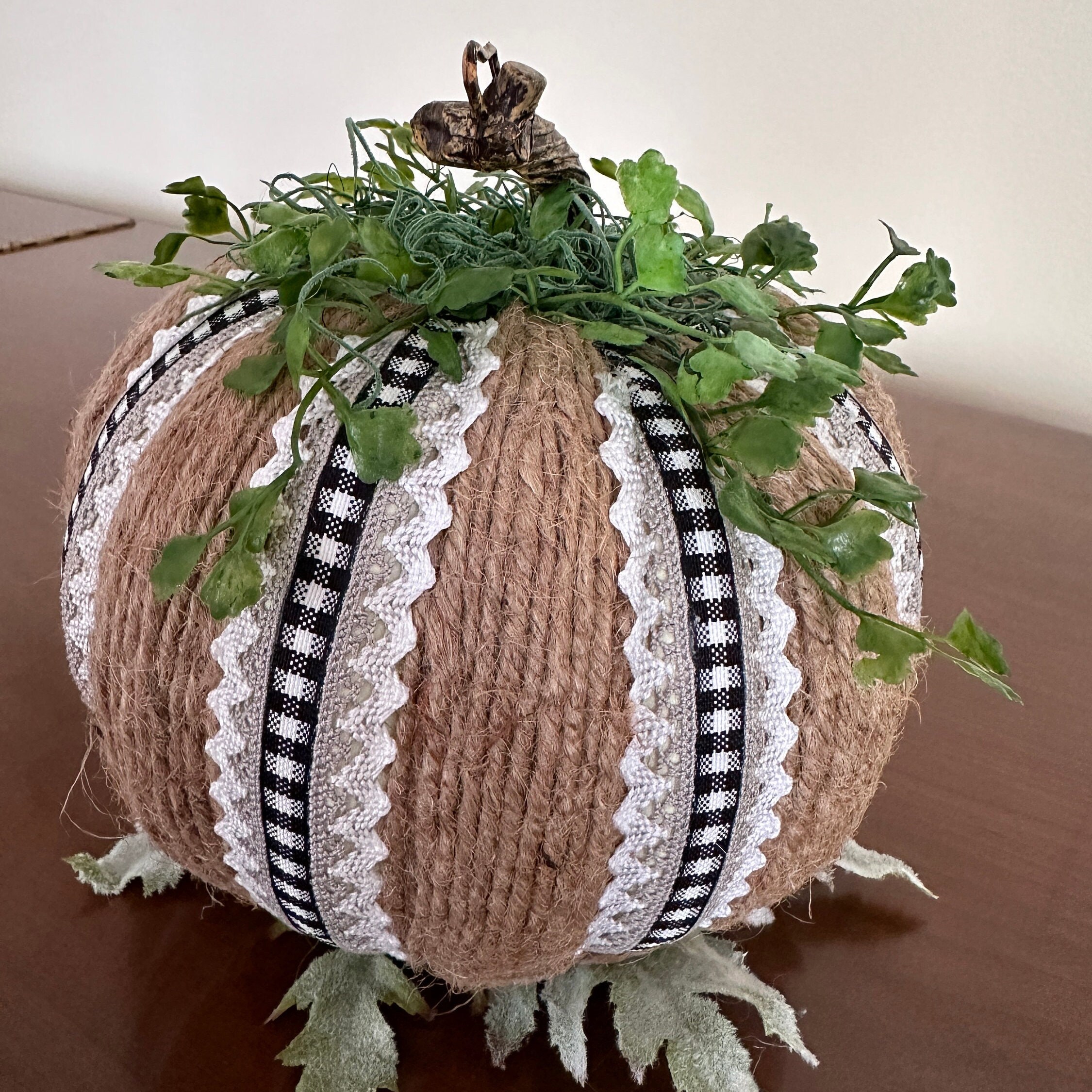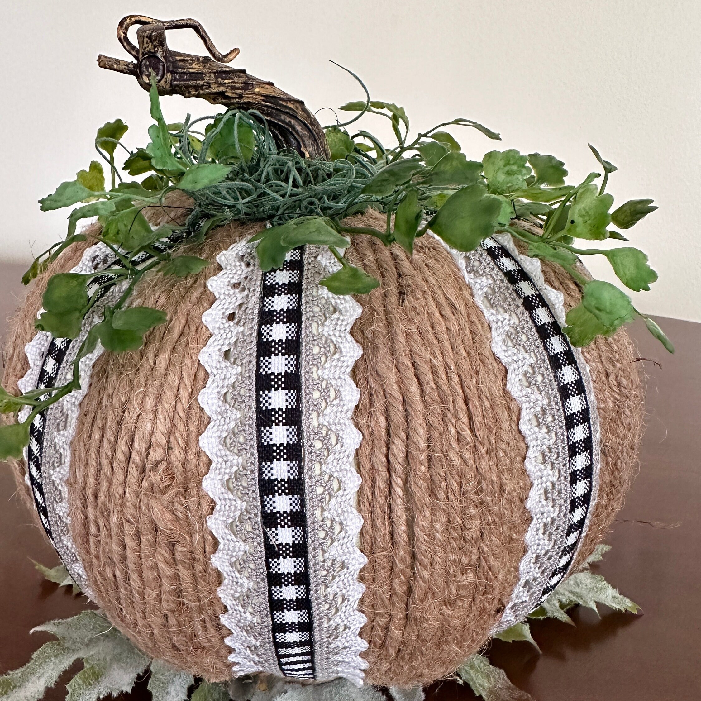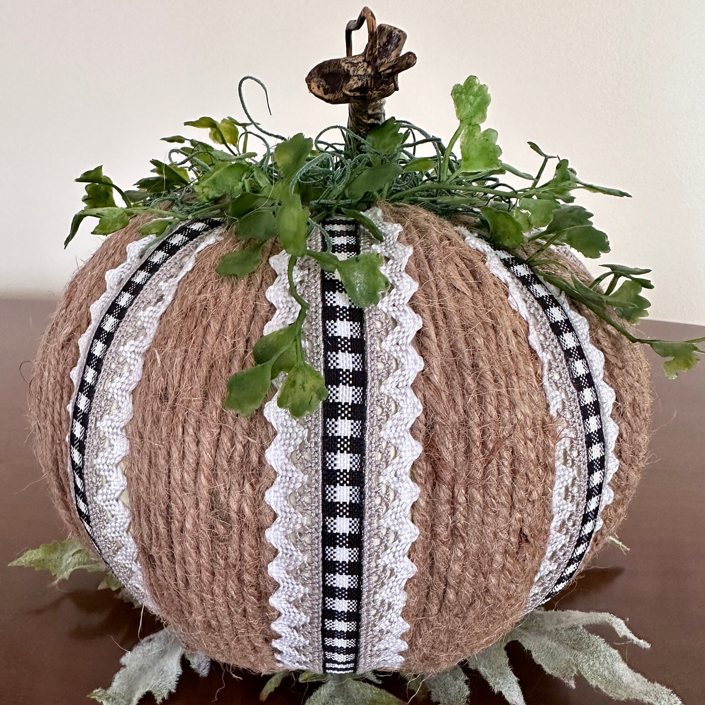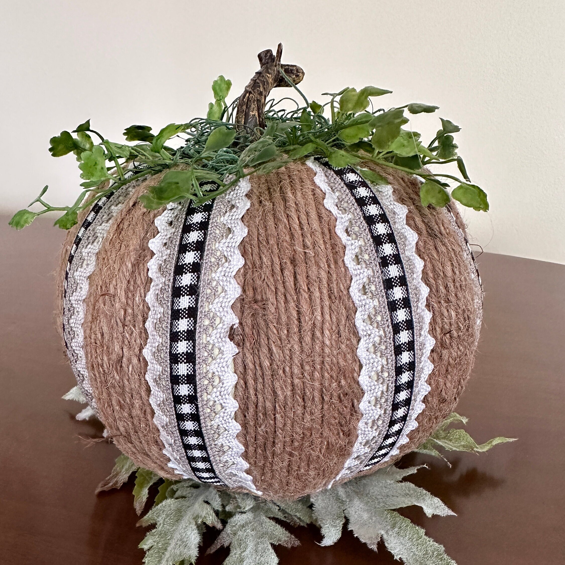 This pumpkin evokes the feeling of a pumpkin patch and features a stem covered with moss and herb leaves adding a natural, rustic charm to your fall decor. Jute twine rope and lace ribbon with buffalo check accent were carefully glued on by hand. Beautiful and unique one of a kind. Approximately 8" wide, and 8-1/2" with stem (7 " tall without stem).