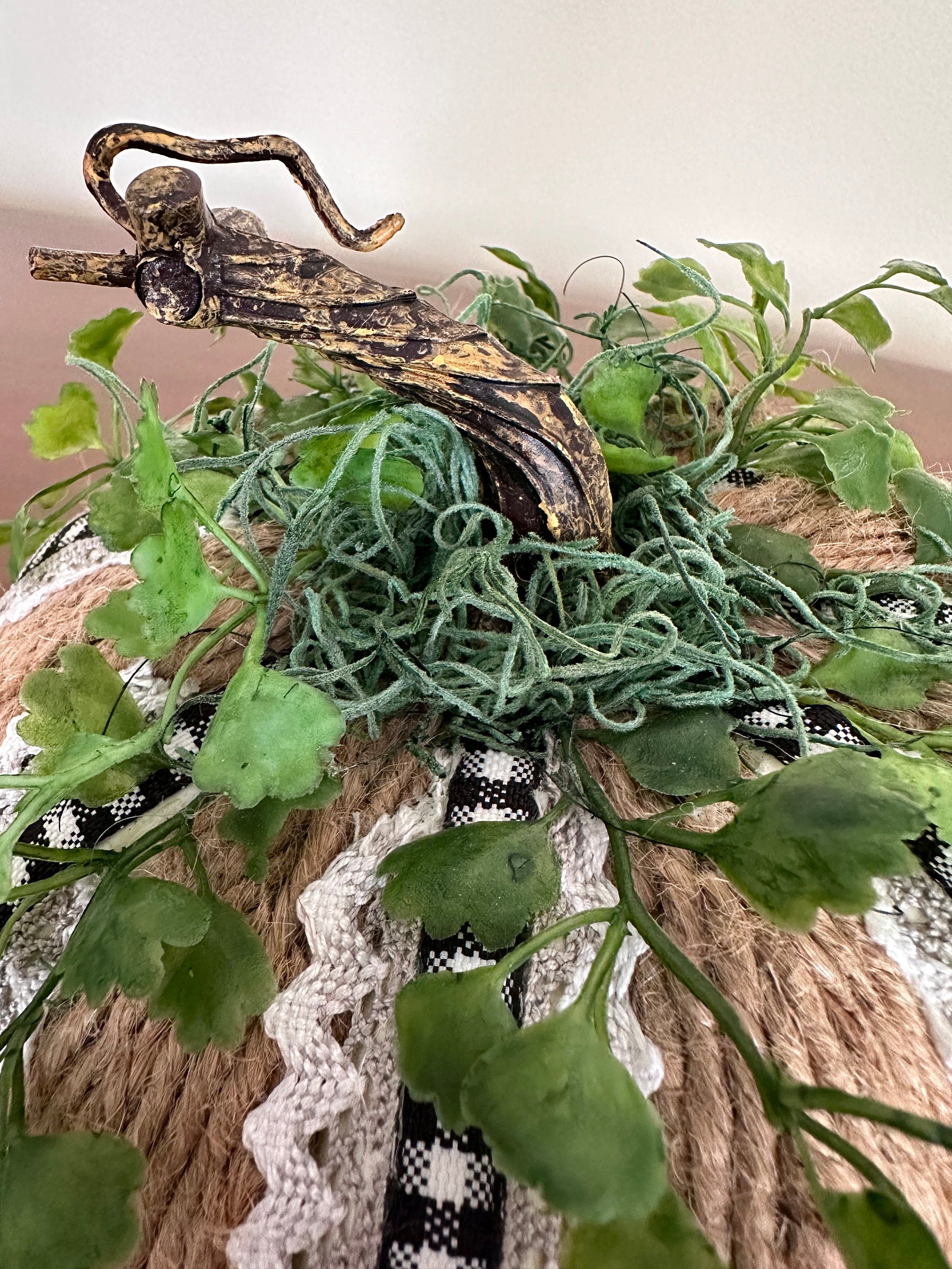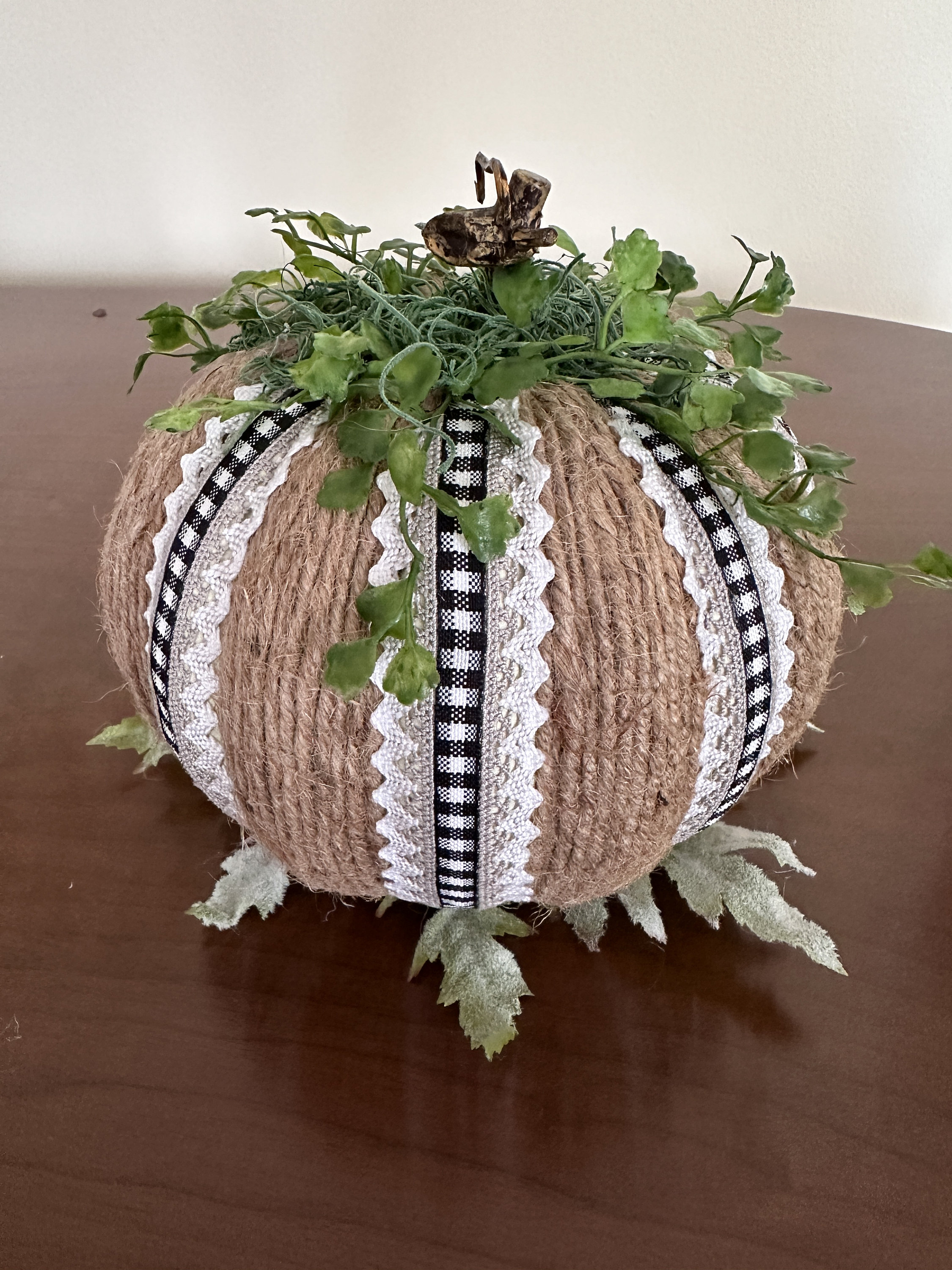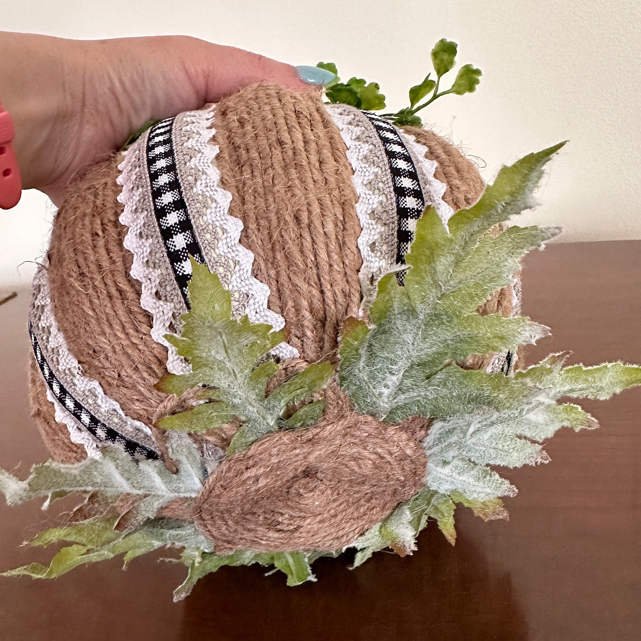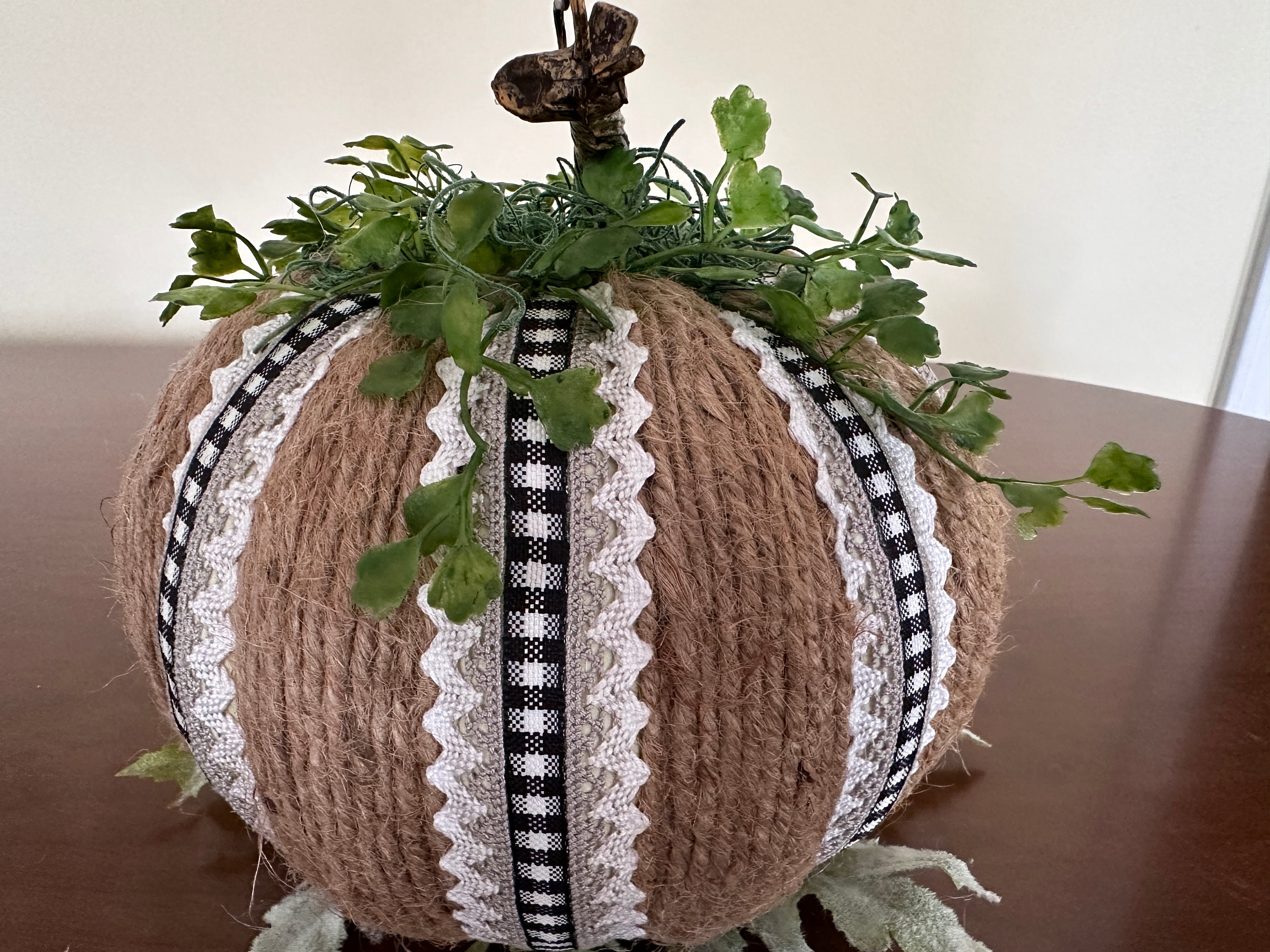 This pumpkin evokes the feeling of a pumpkin patch and features a stem covered with moss and herb leaves adding a natural, rustic charm to your fall decor. Jute twine rope and lace ribbon with buffalo check accent were carefully glued on by hand. Beautiful and unique one of a kind. Approximately 8" wide, and 8-1/2" with stem (7 " tall without stem).