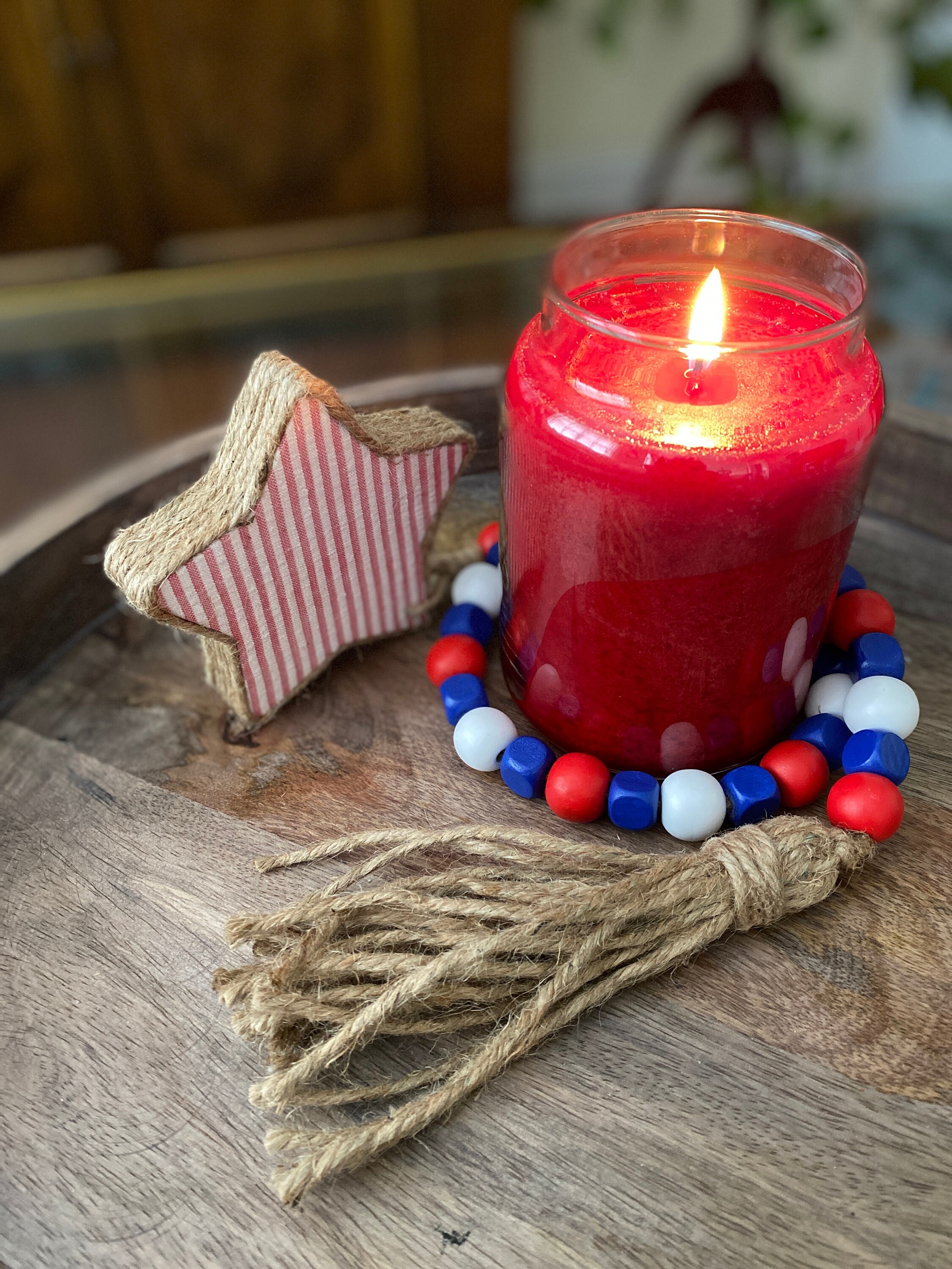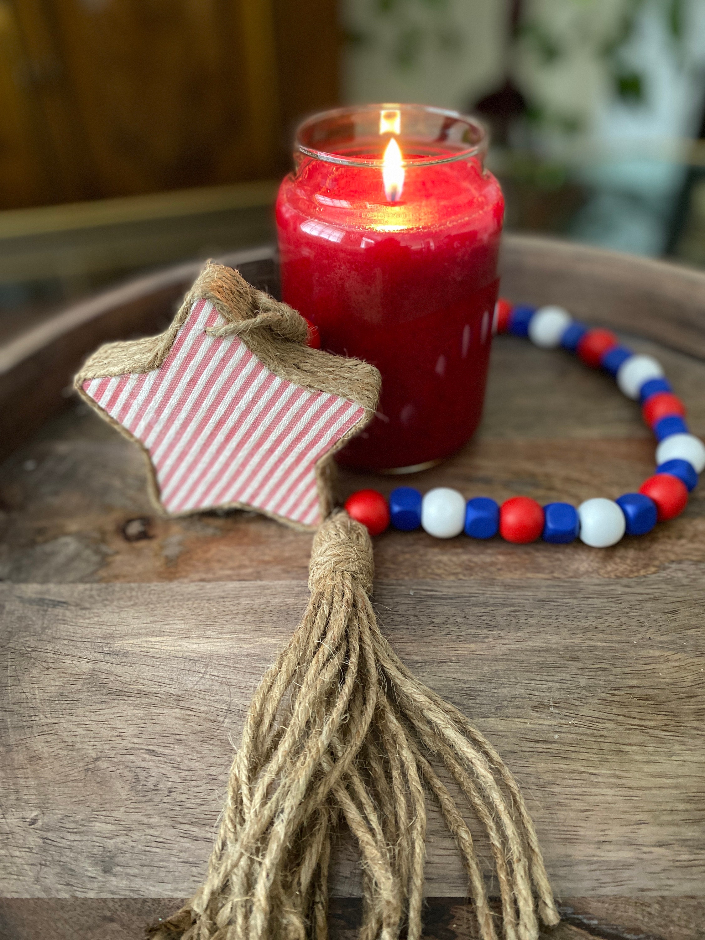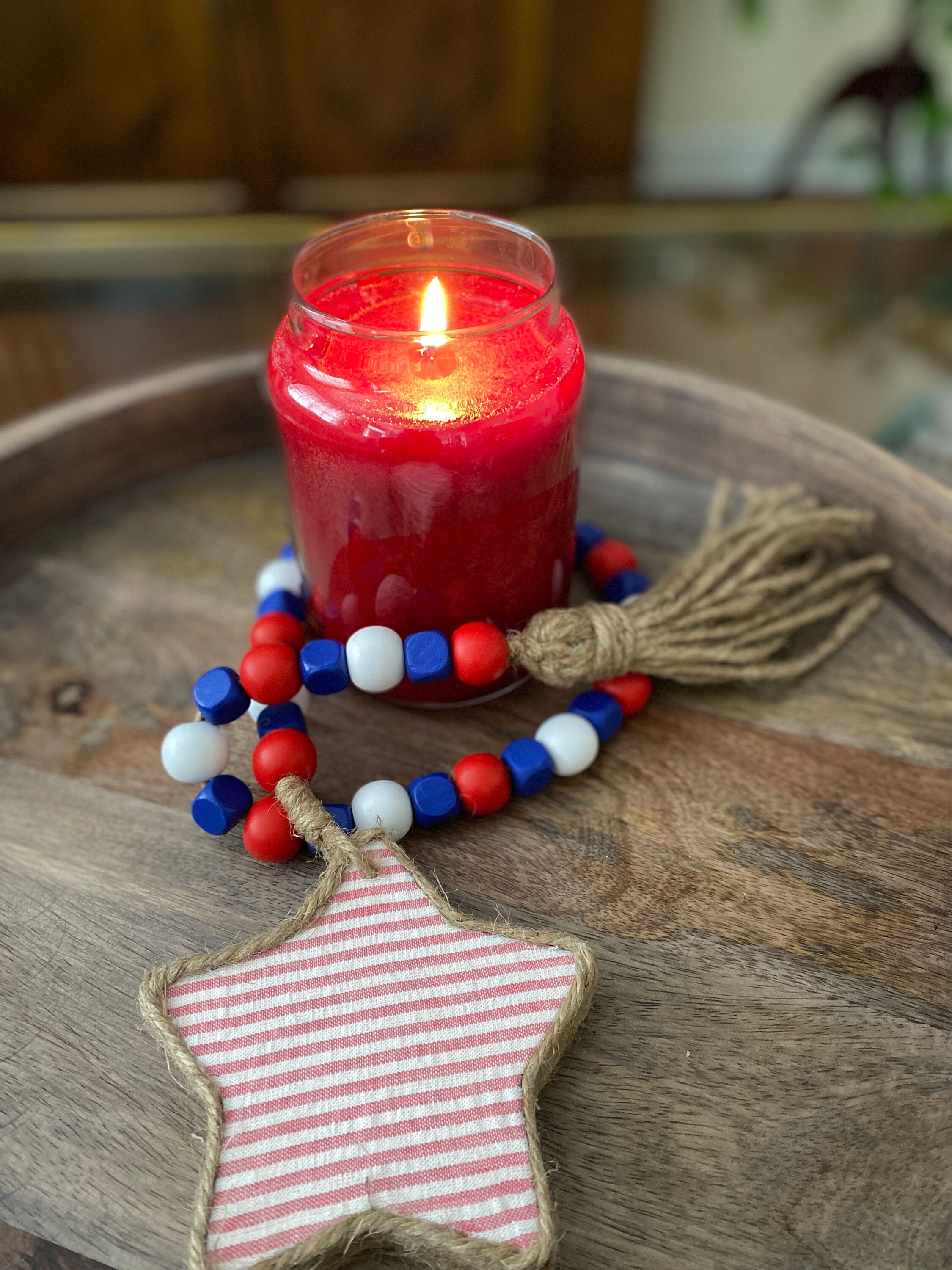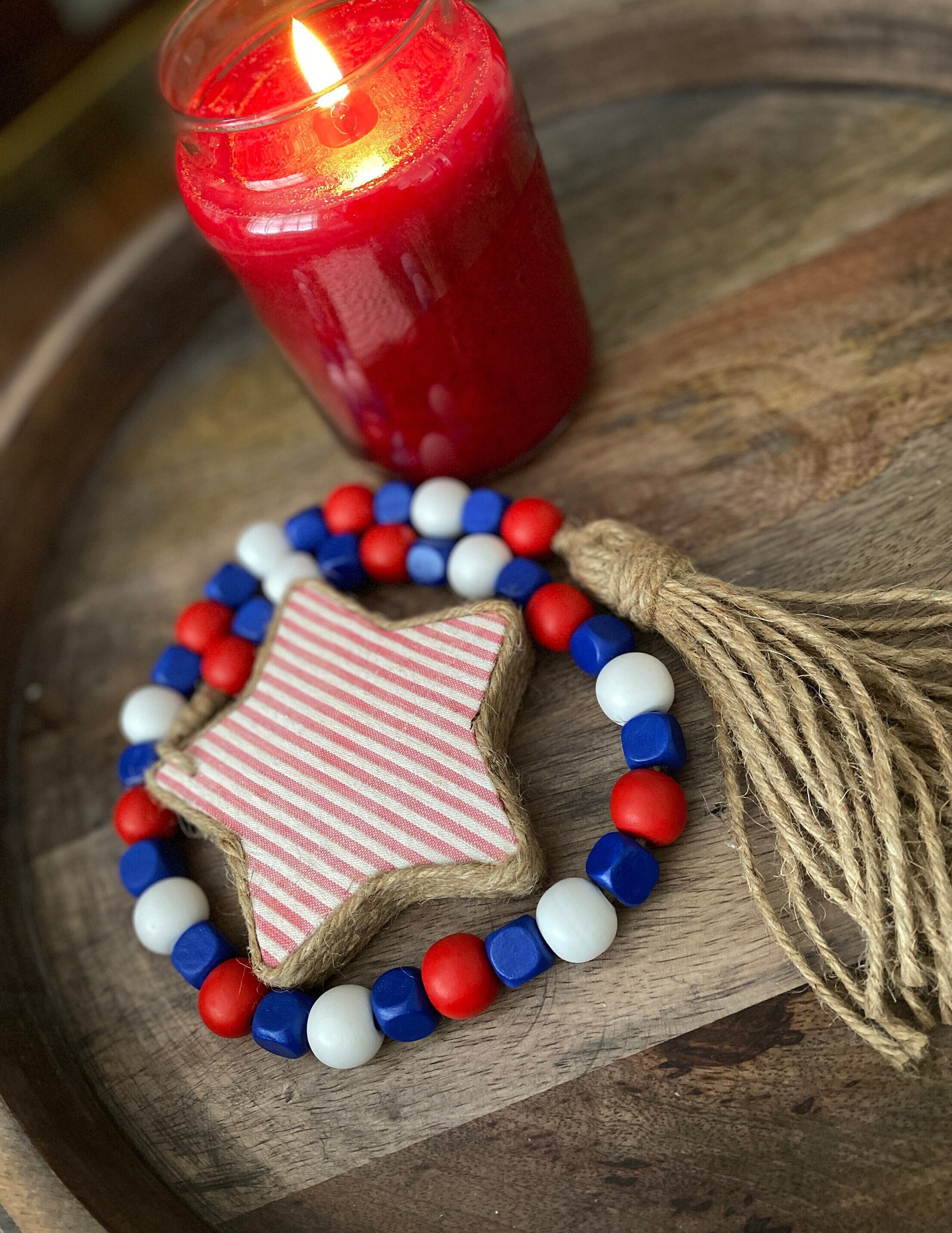 Perfect for 4th of July celebration: this Red White and hand-painted Blue wood bead garland to showcase your patriotism. The attention to detail with the red-striped cotton fabric and jute cord adds a rustic touch that enhances its appeal. This makes an excellent thoughtful gift for a patriot. It's 36" long from end of the star to the end of the tassel. The star is approximately 4.5 inches across and the tassel is about 6 inches long. Candle NOT included