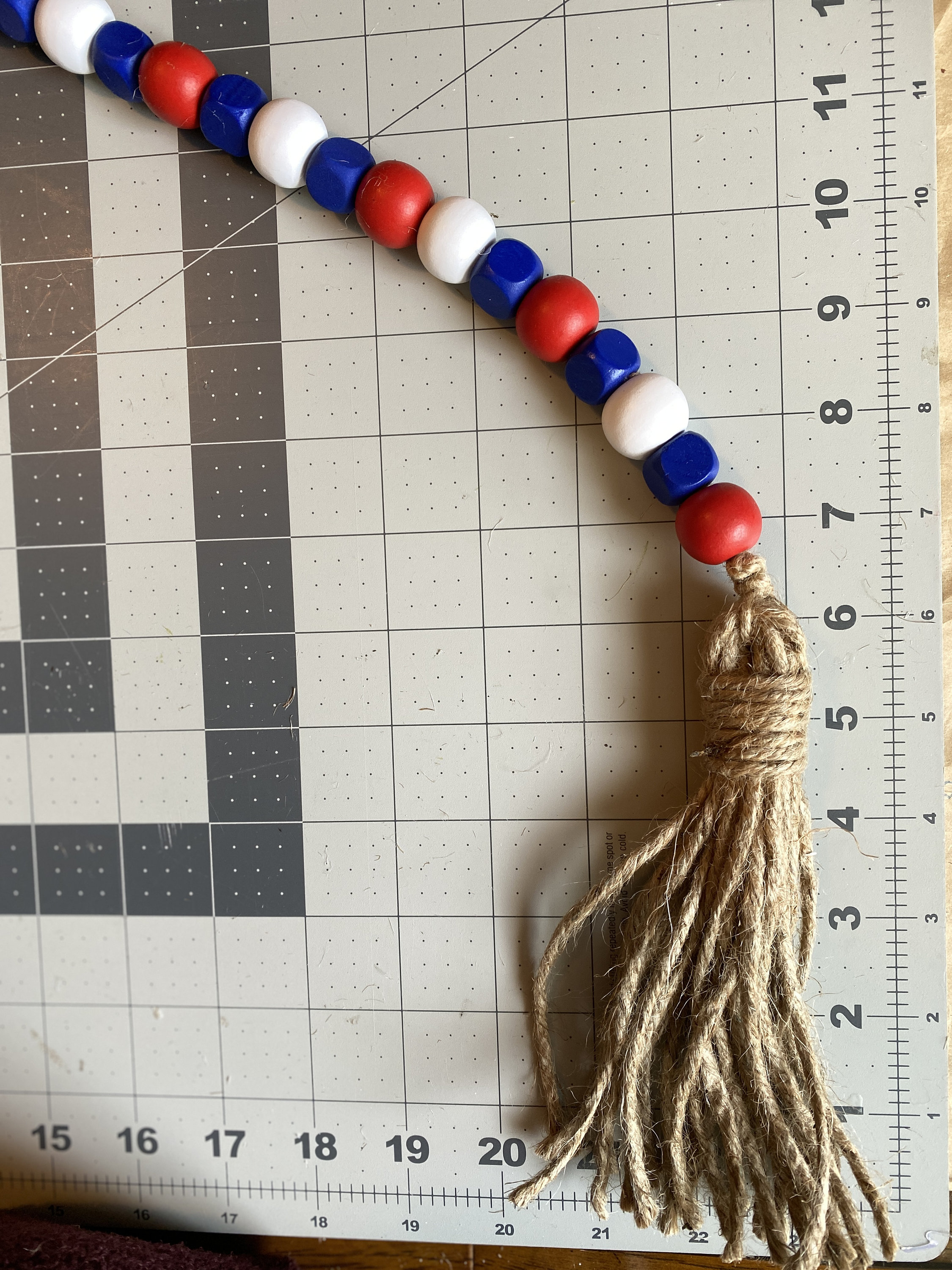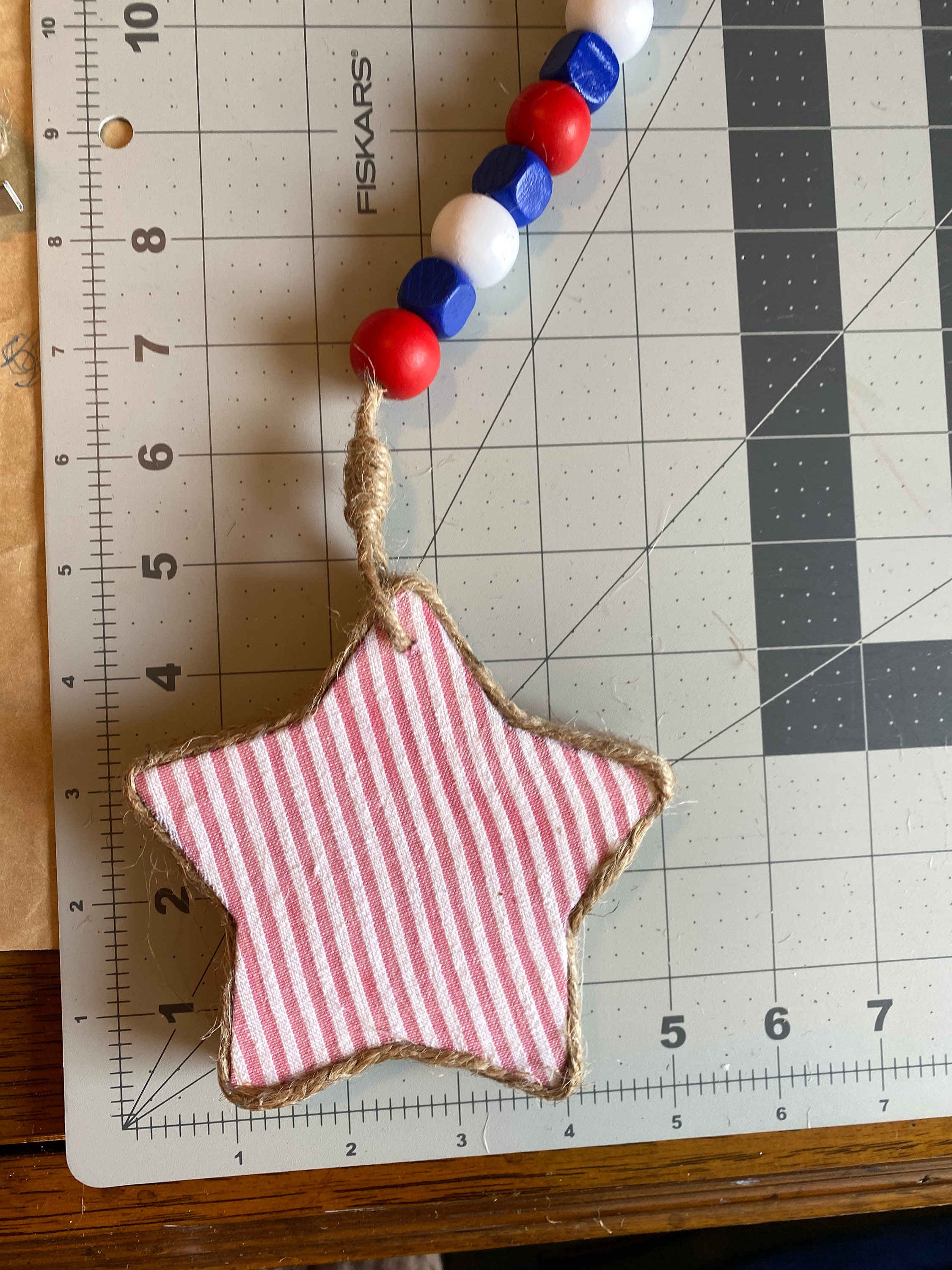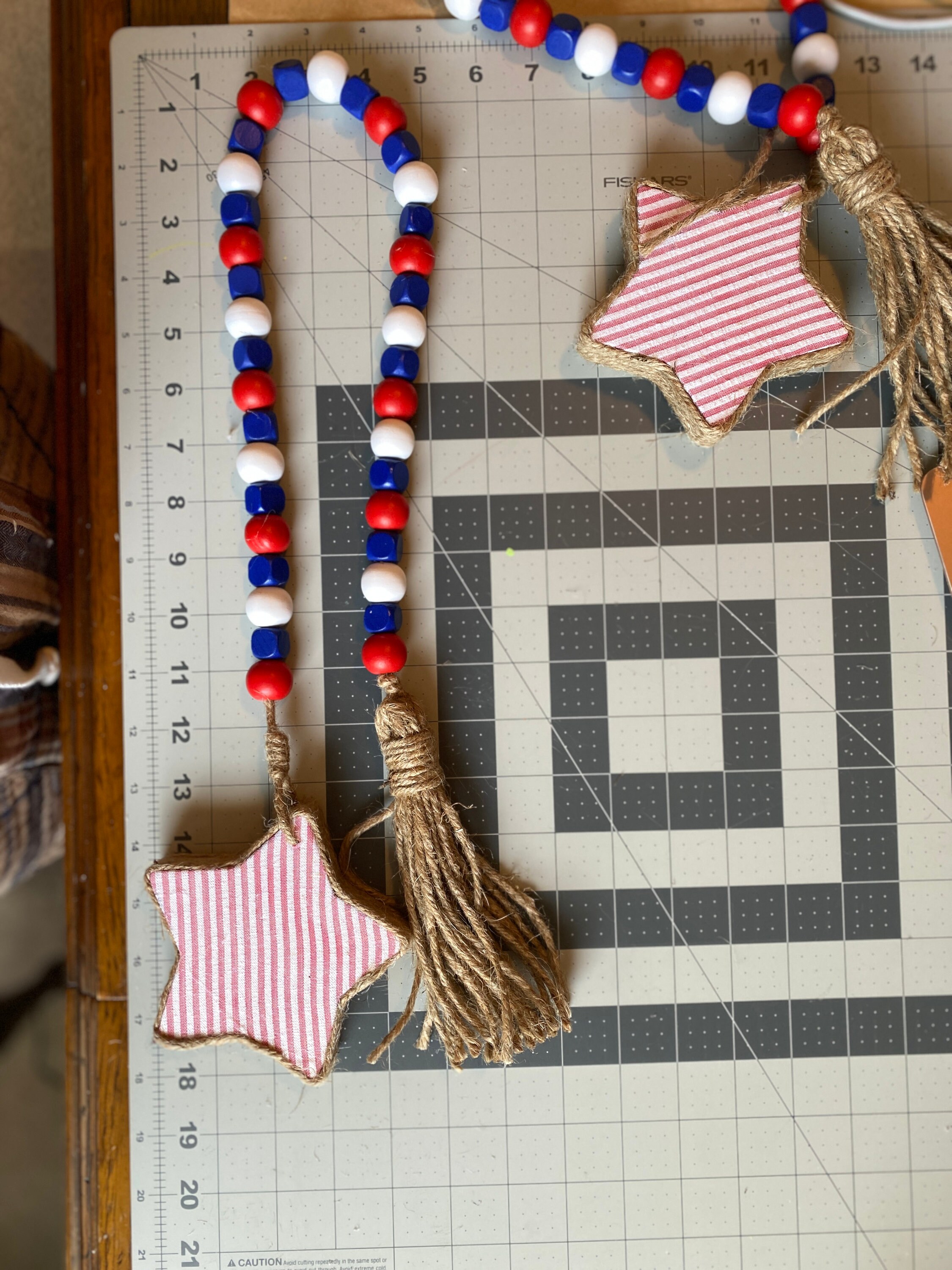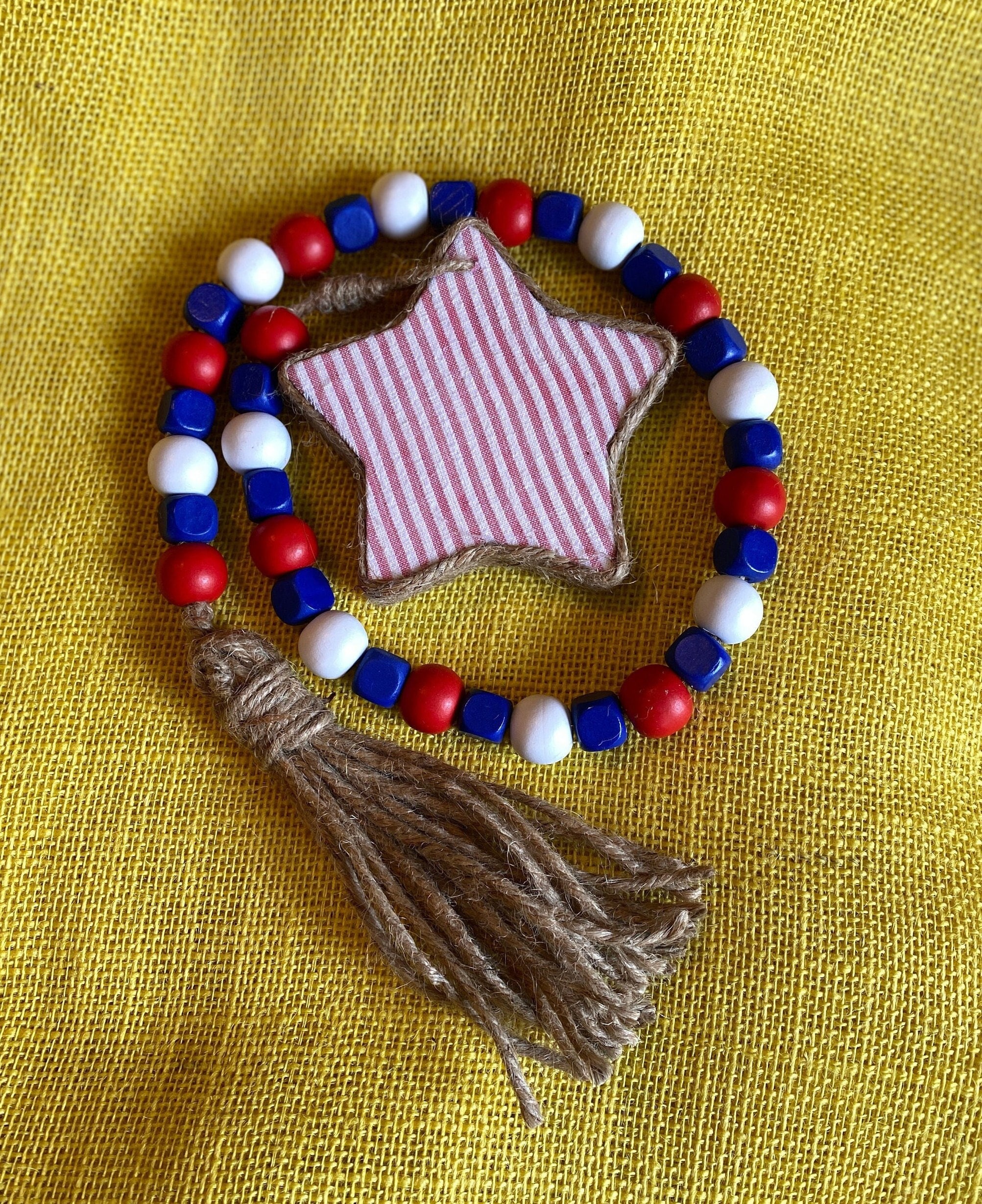 Perfect for 4th of July celebration: this Red White and hand-painted Blue wood bead garland to showcase your patriotism. The attention to detail with the red-striped cotton fabric and jute cord adds a rustic touch that enhances its appeal. This makes an excellent thoughtful gift for a patriot. It's 36" long from end of the star to the end of the tassel. The star is approximately 4.5 inches across and the tassel is about 6 inches long. Candle NOT included