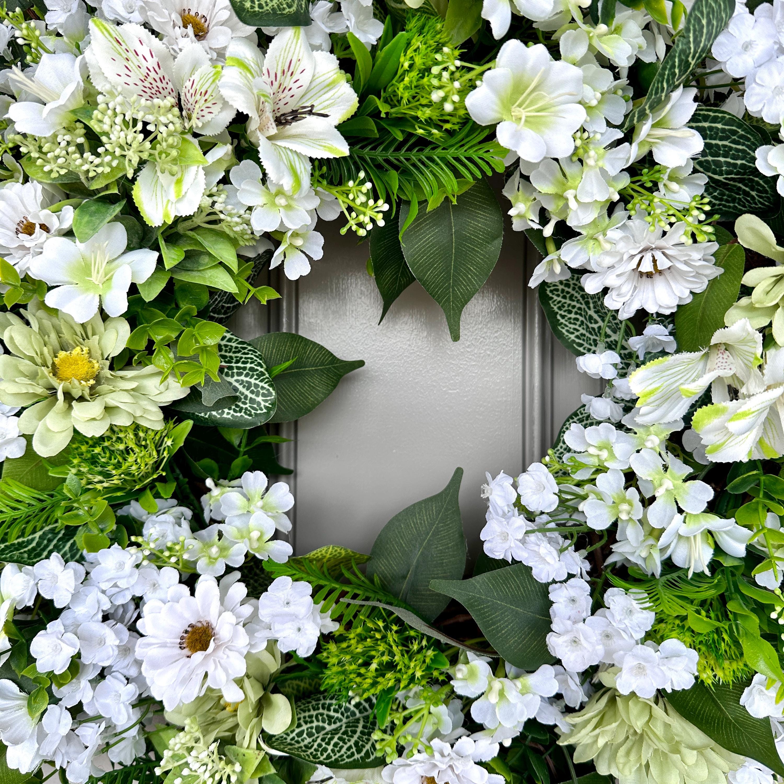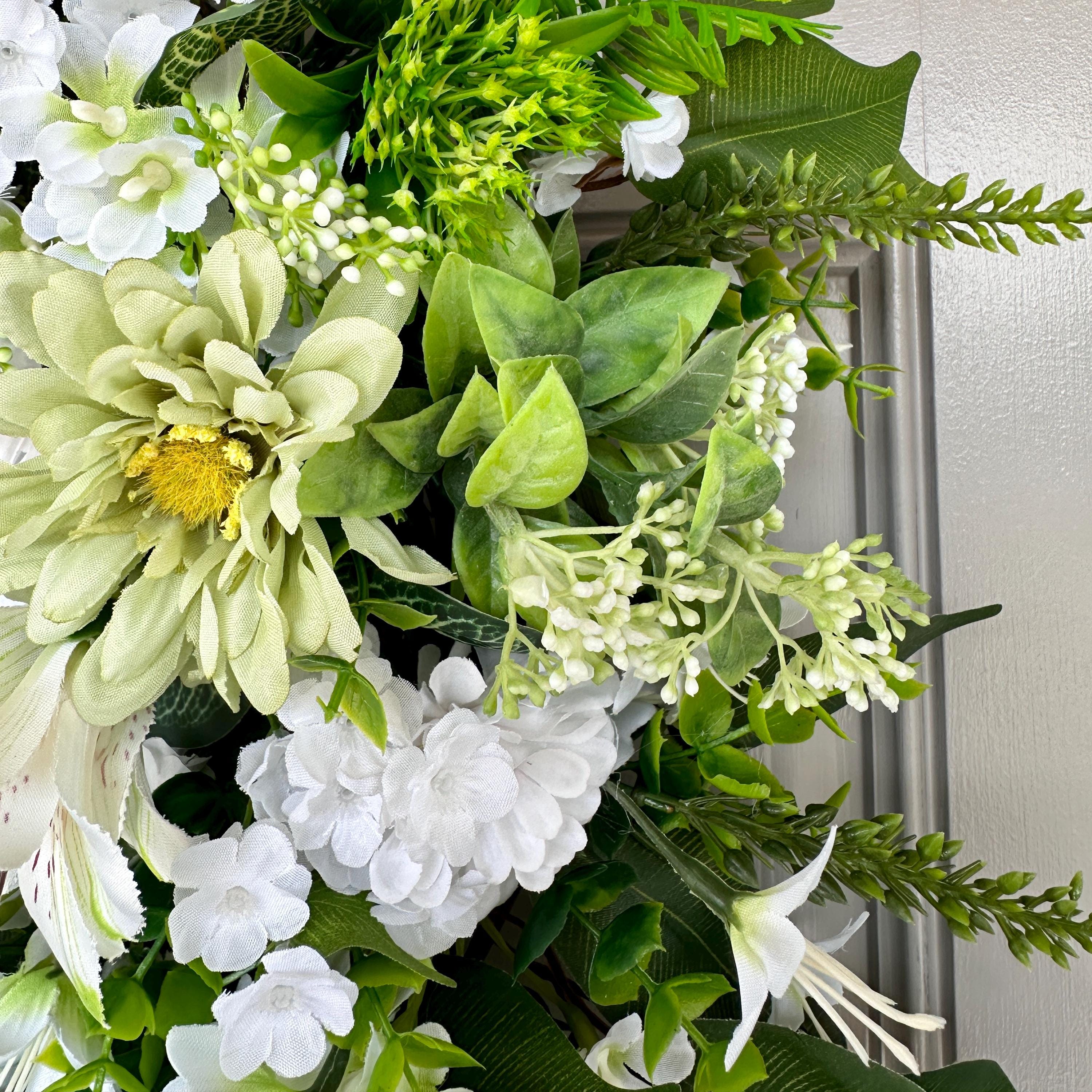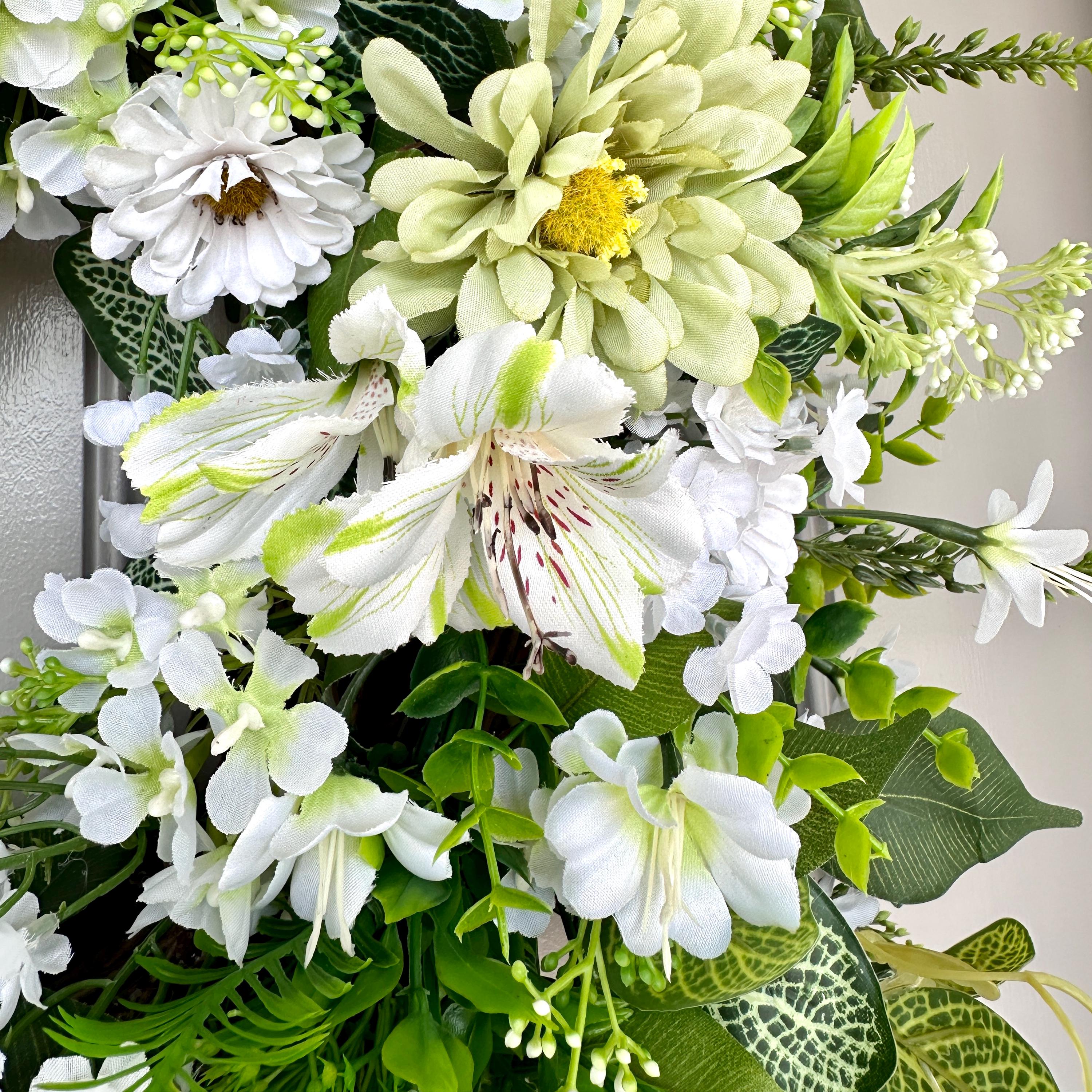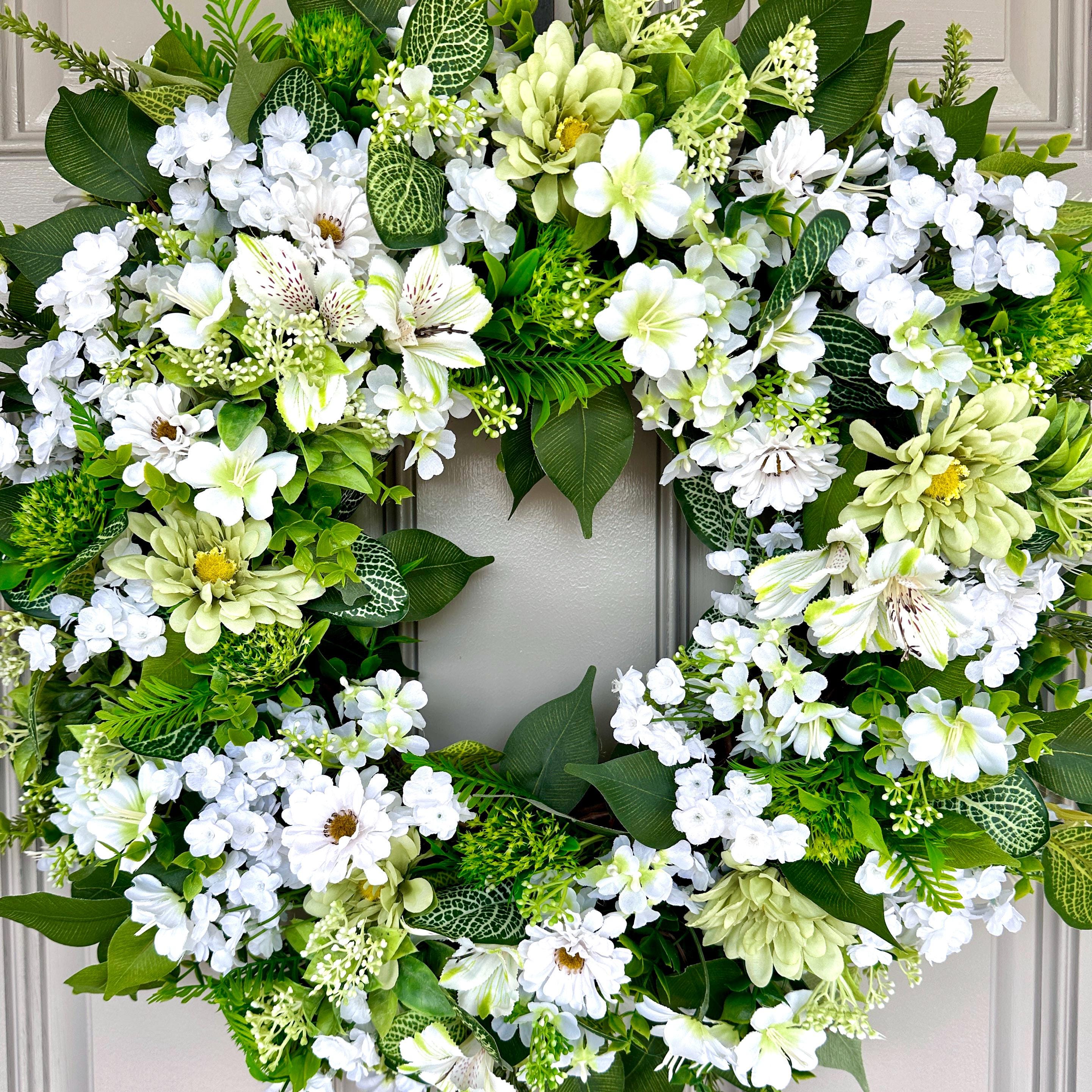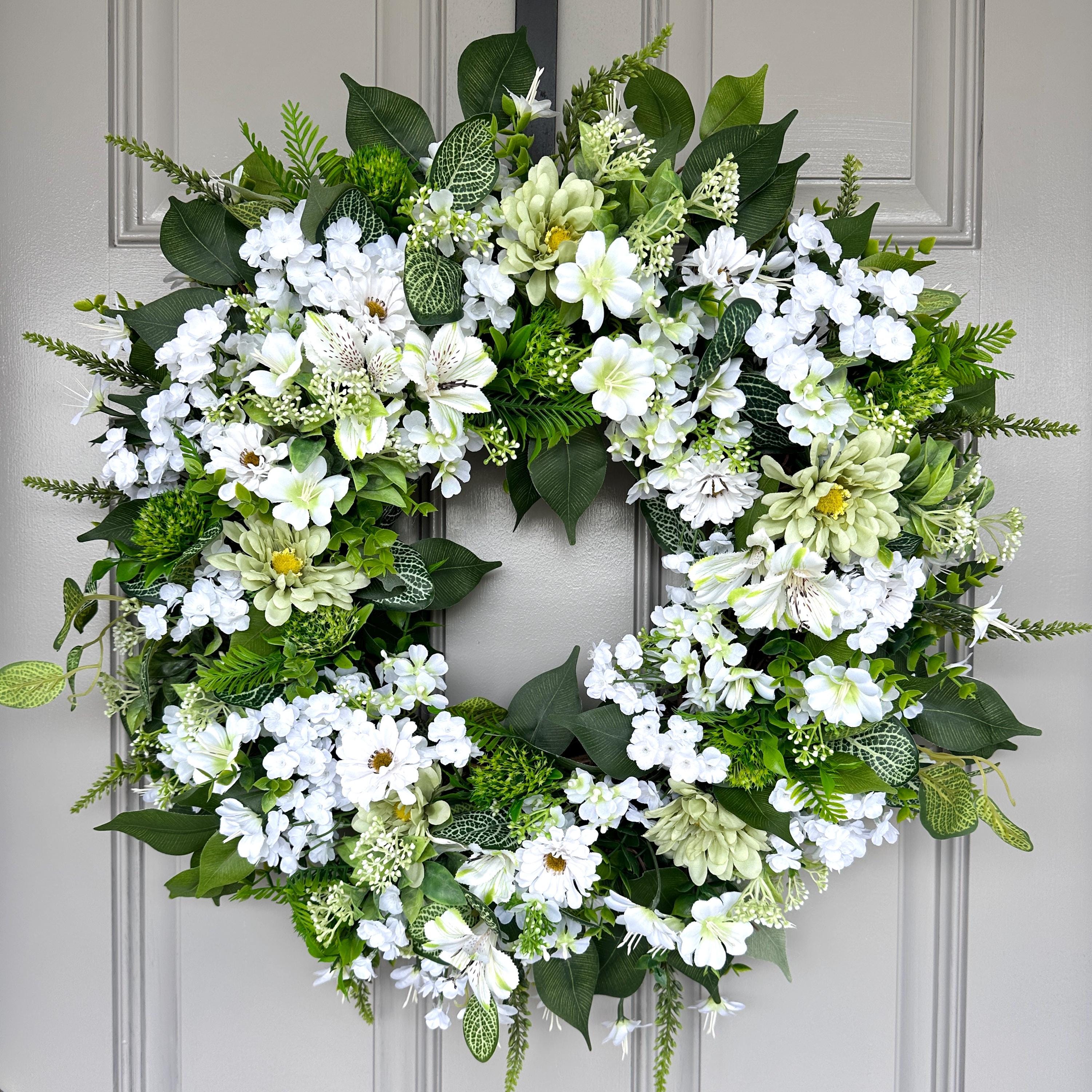 Mixed white flowers creating a peaceful entryway for multiple seasons. Crafted with meticulous attention to detail, this wreath blends an assortment of white blooms. Whether adorning a front door, or mantelpiece, this wreath exudes sophistication and charm. Approximately 22 inches across. A loop has been added to the back for hanging.