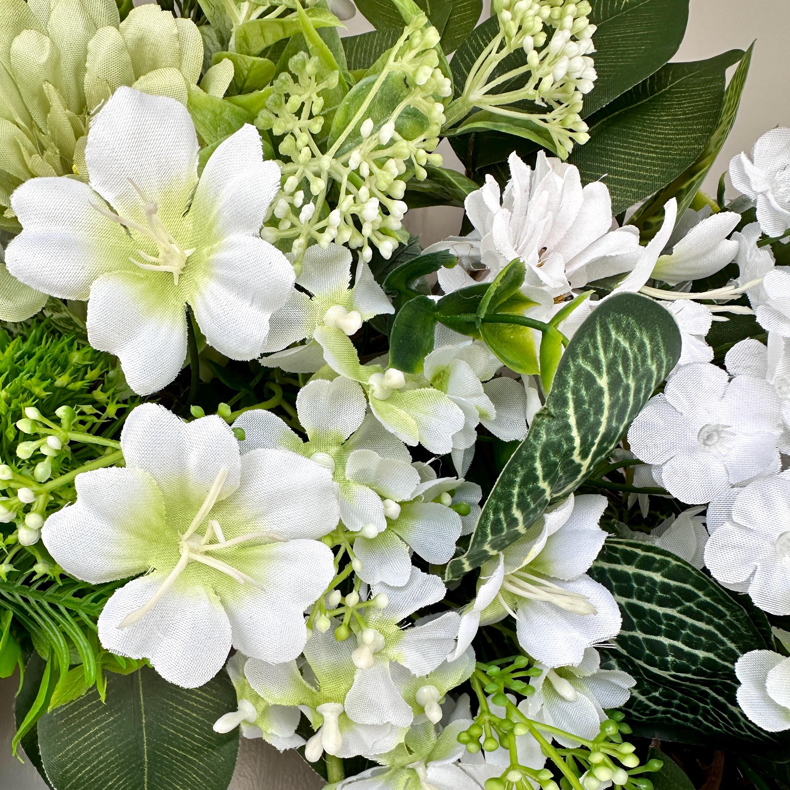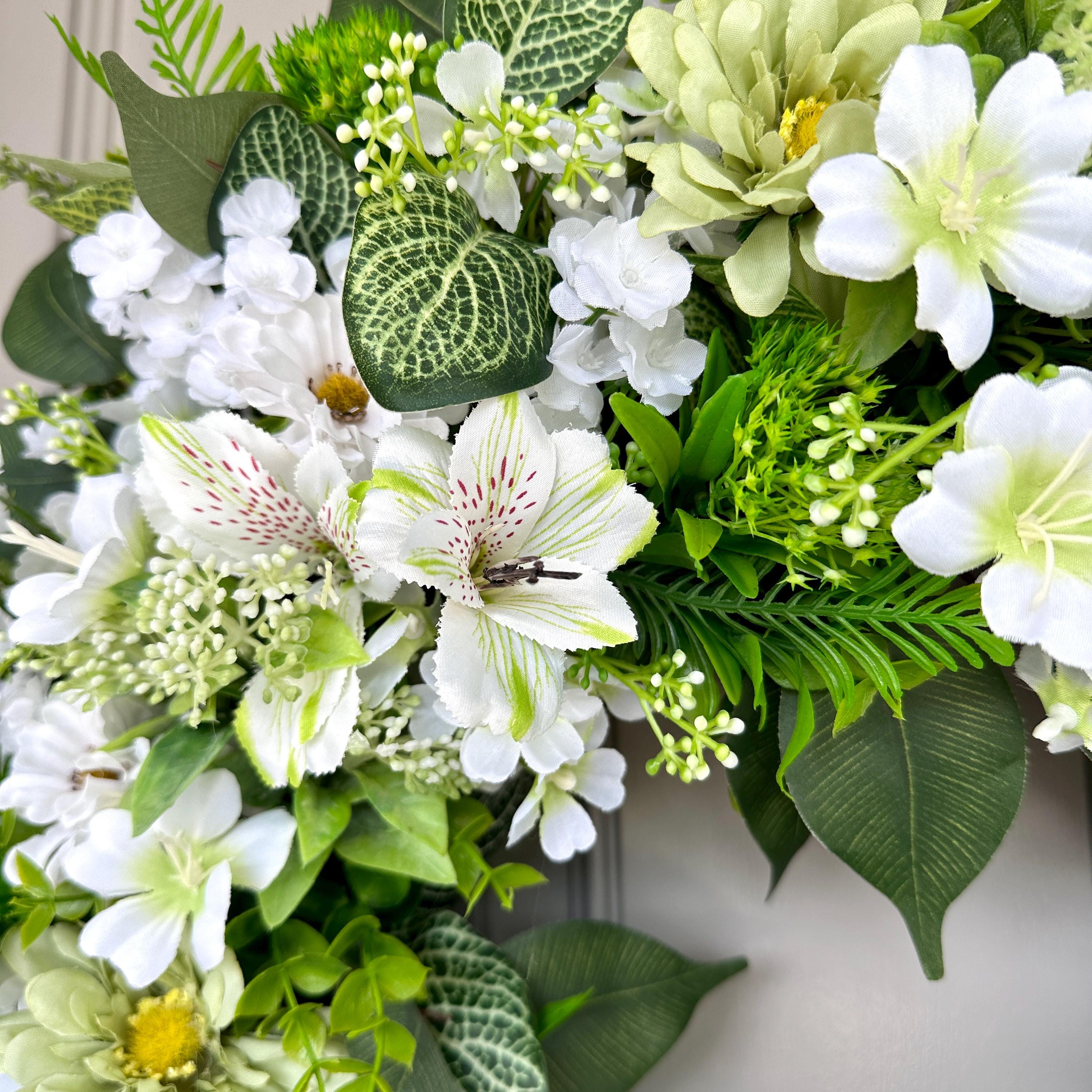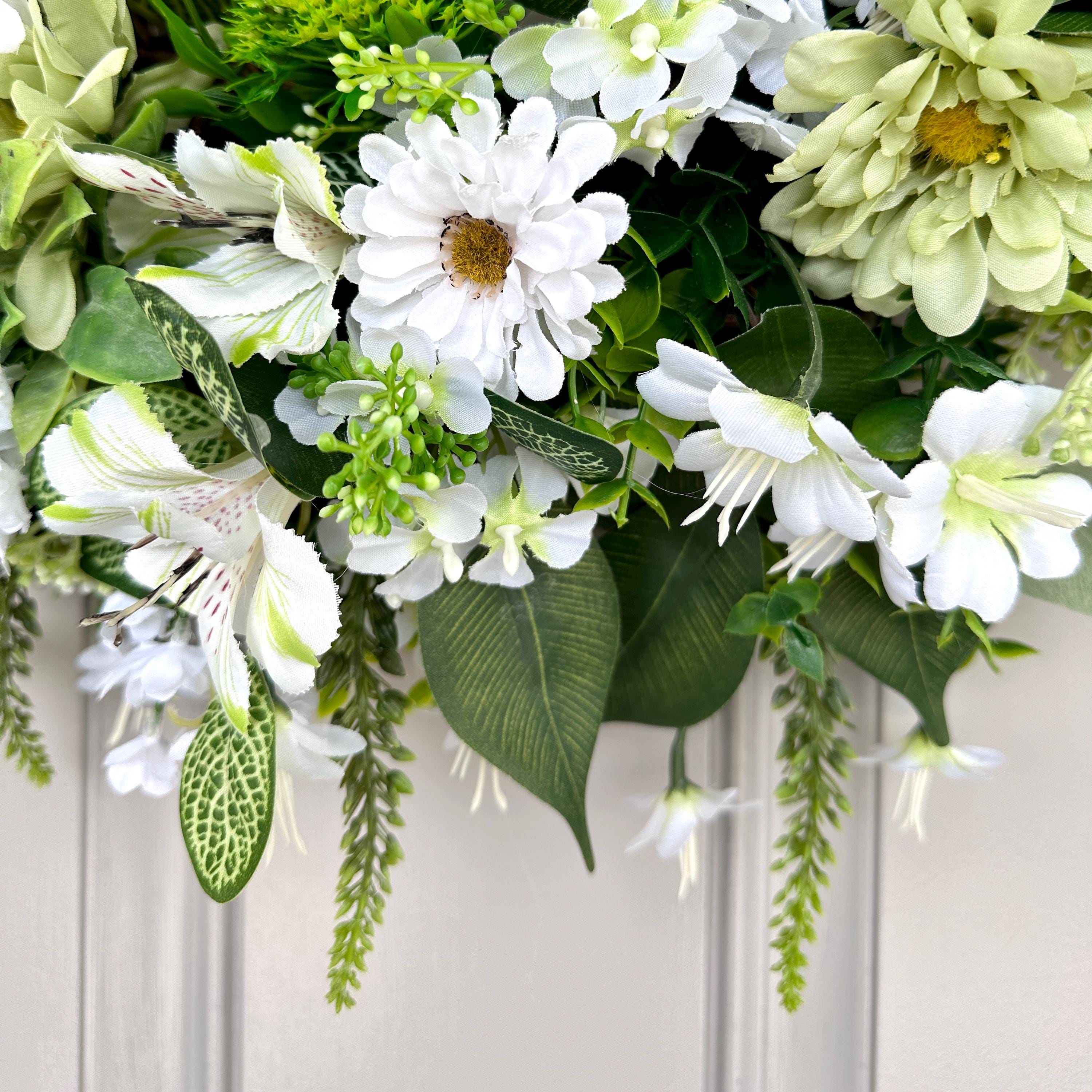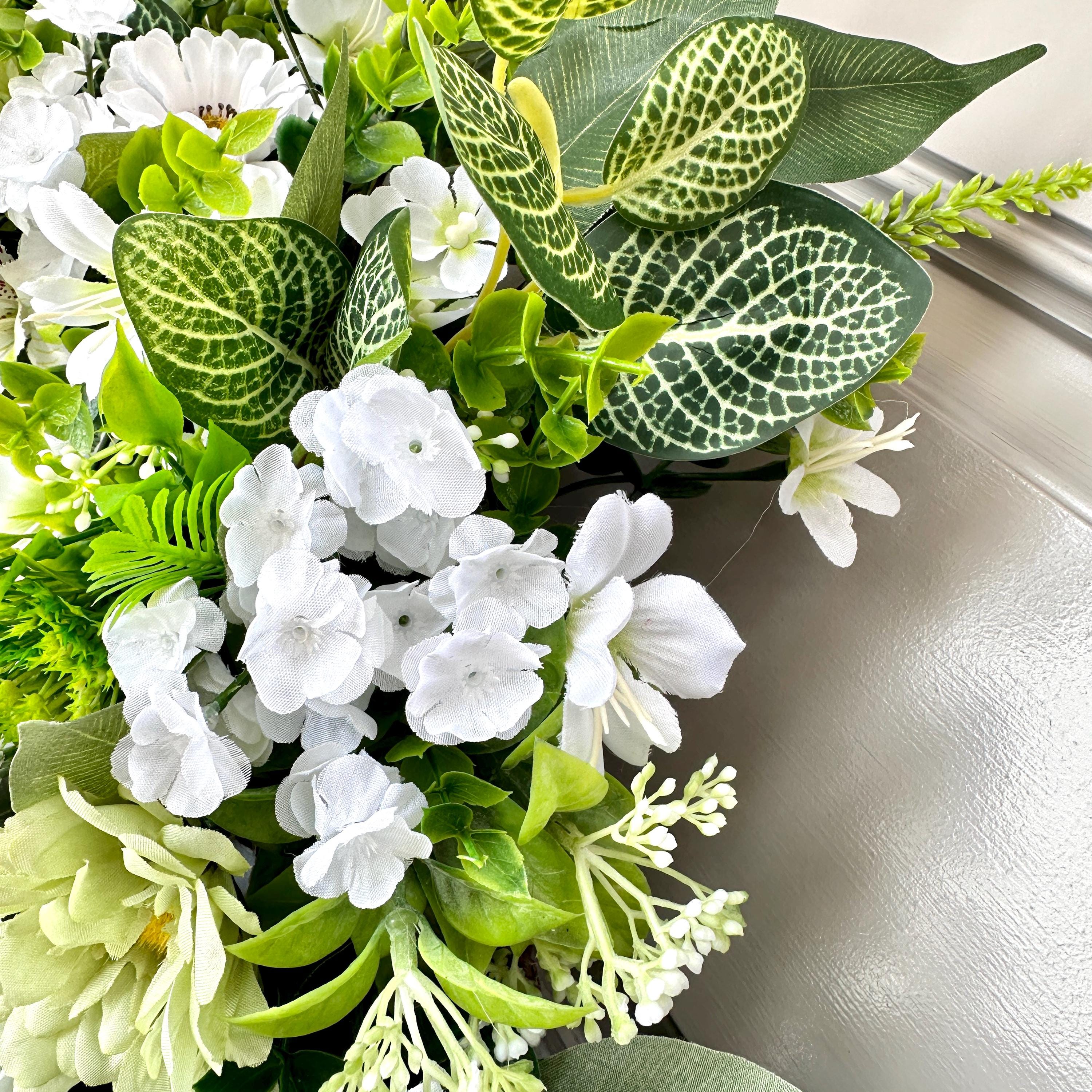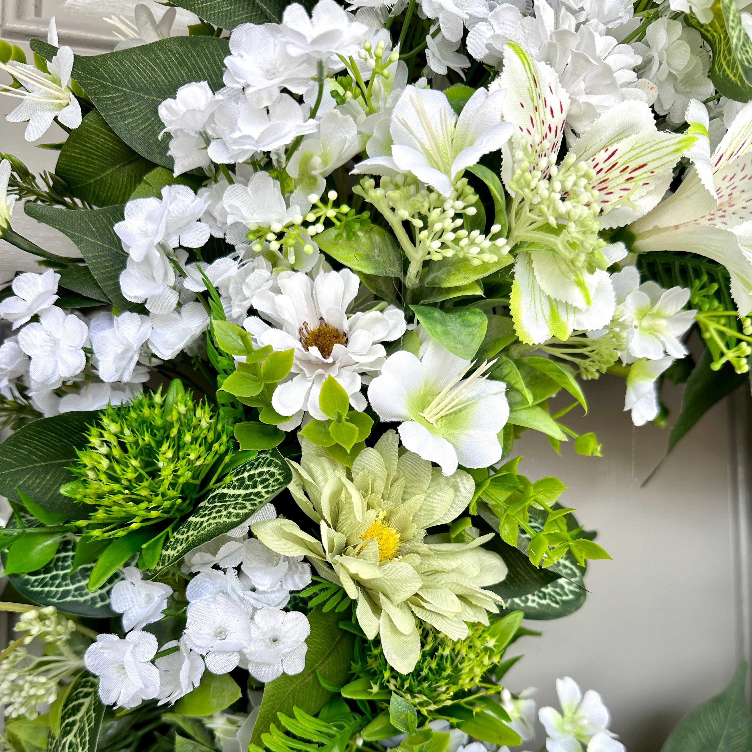 Mixed white flowers creating a peaceful entryway for multiple seasons. Crafted with meticulous attention to detail, this wreath blends an assortment of white blooms. Whether adorning a front door, or mantelpiece, this wreath exudes sophistication and charm. Approximately 22 inches across. A loop has been added to the back for hanging.