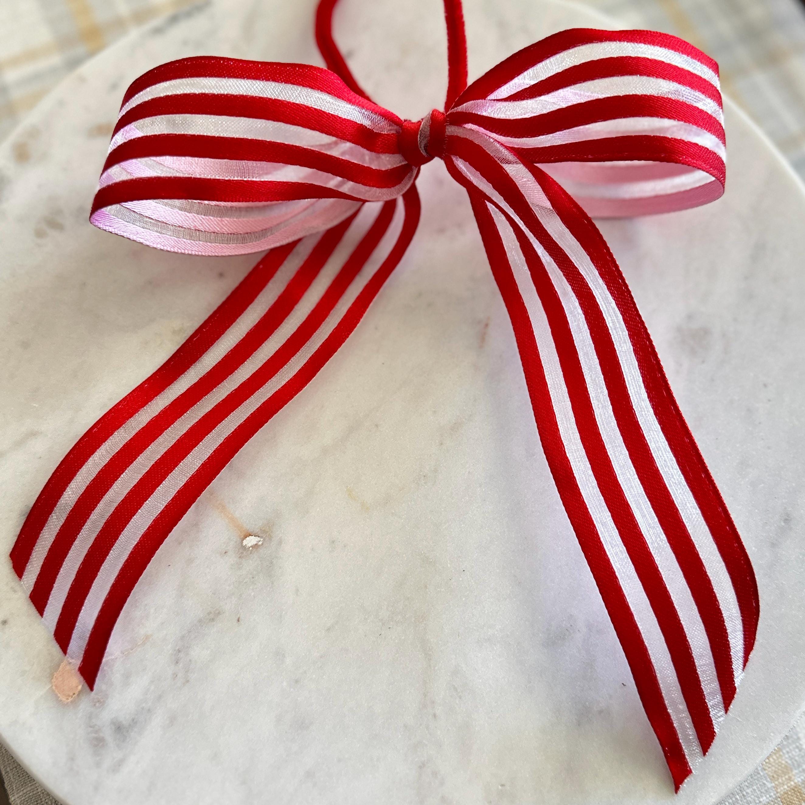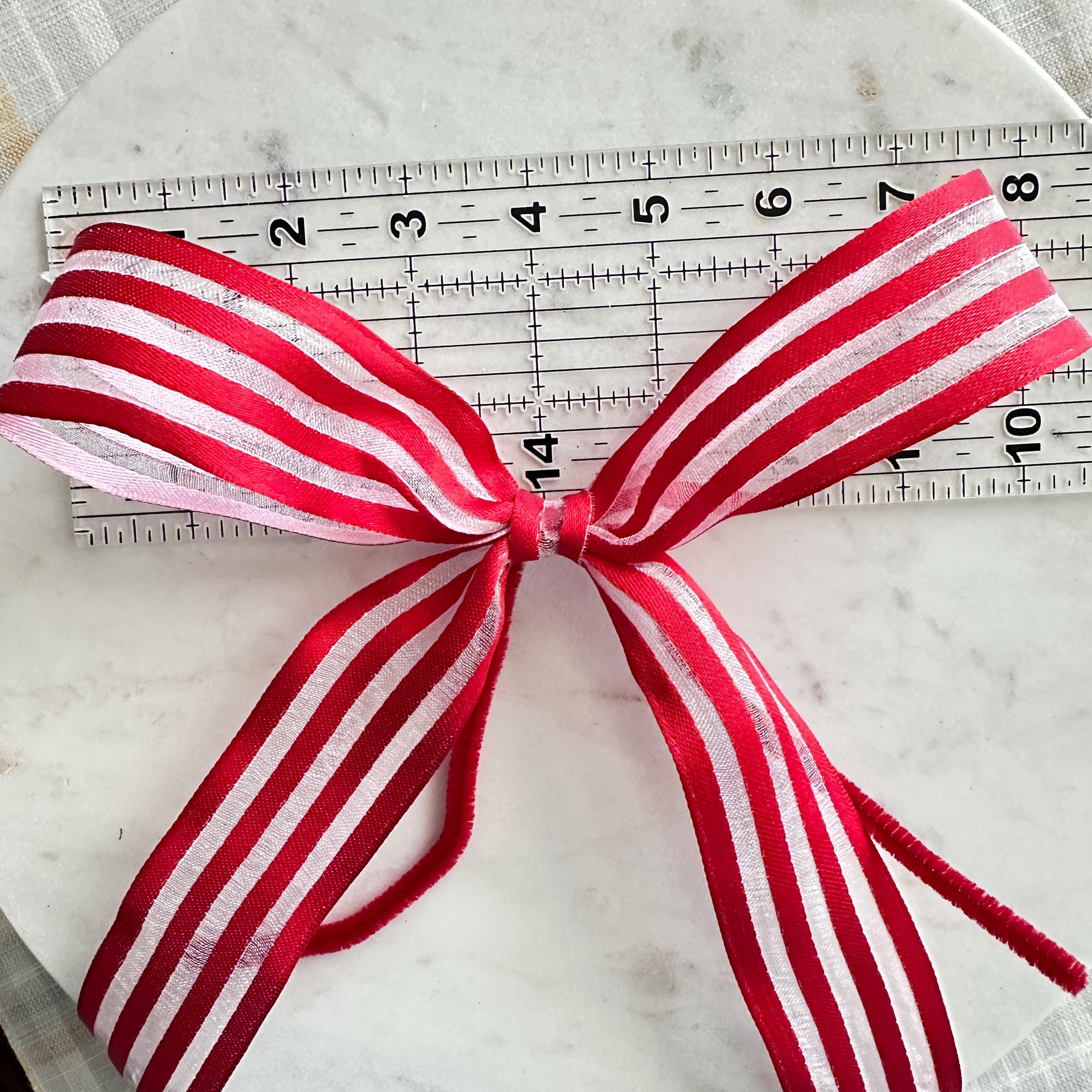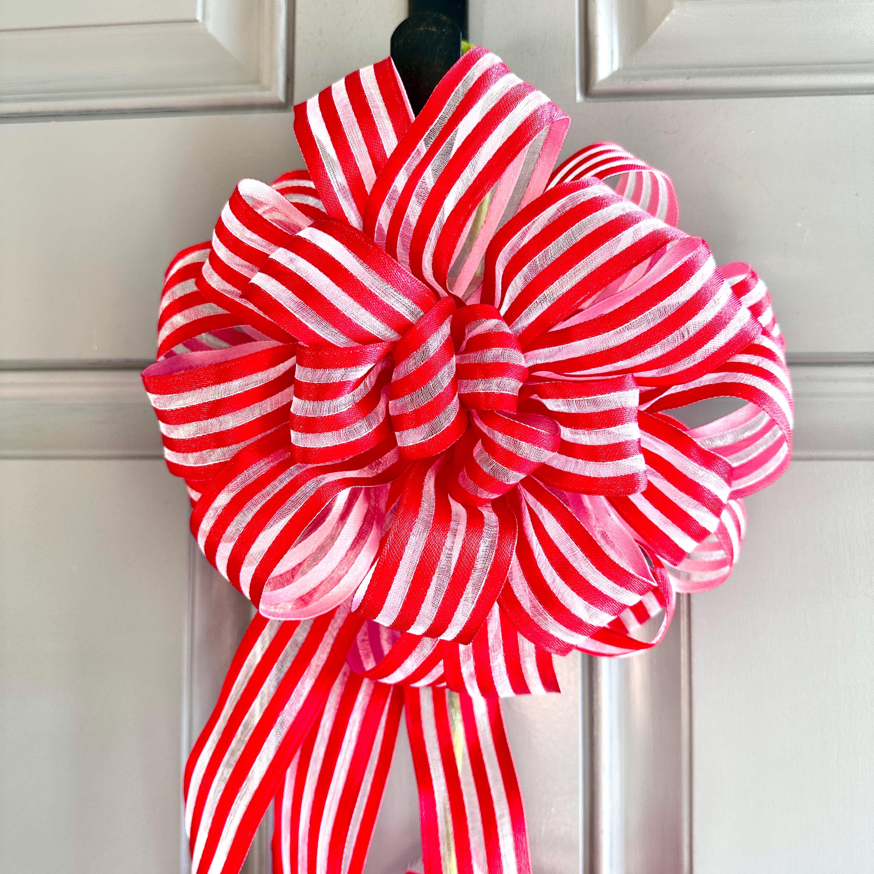 Red and White ribbon bows with chenille stem for easy decorating or accenting wreaths and garlands, staircase, lanterns, gift wrapping or crafting. Alternating satin and mesh is classic yet luxurious. Ten small bows are approximately 4" loops with 8" tails. One large bow is about 9" across (fluffed). You'll receive all 11 bows in a large box.