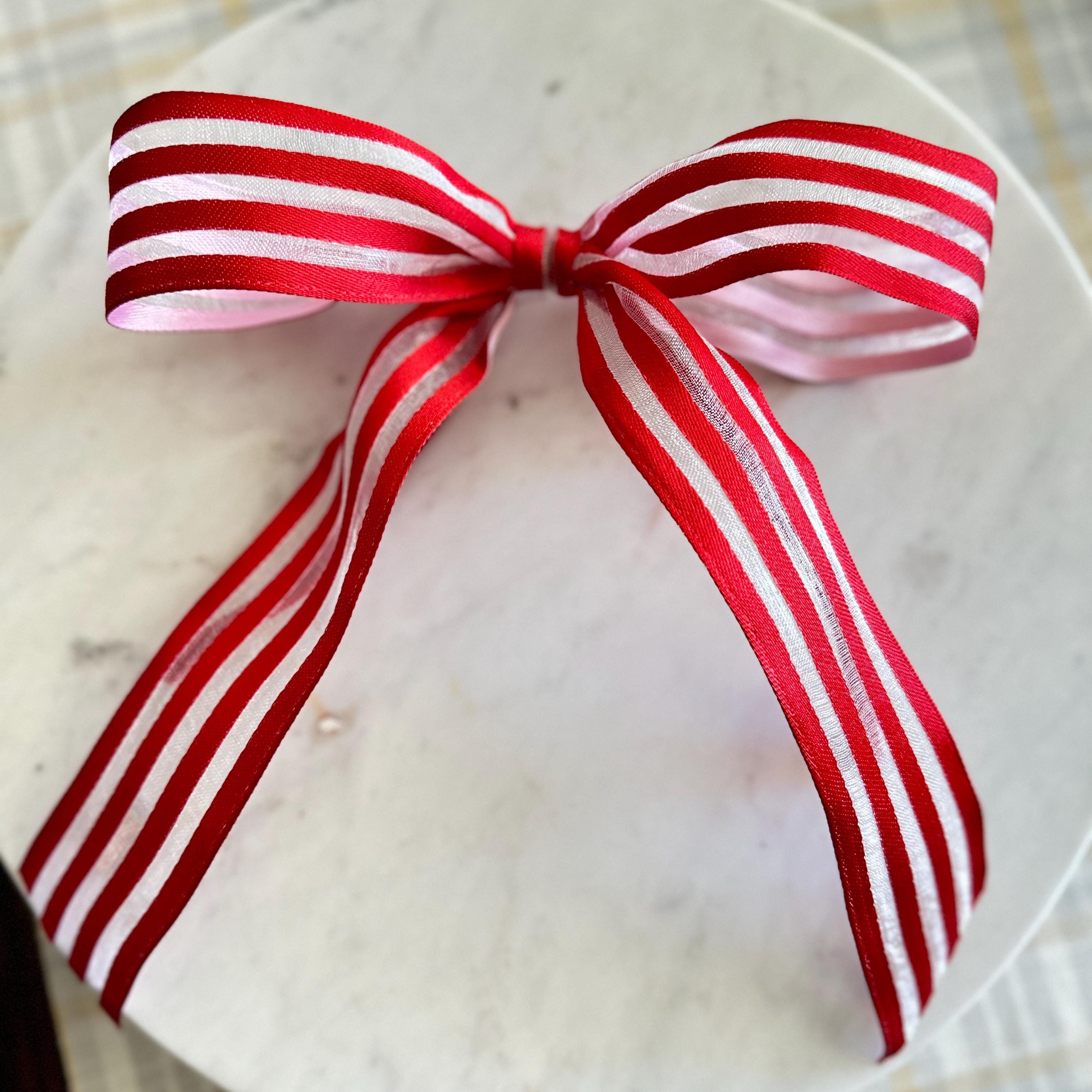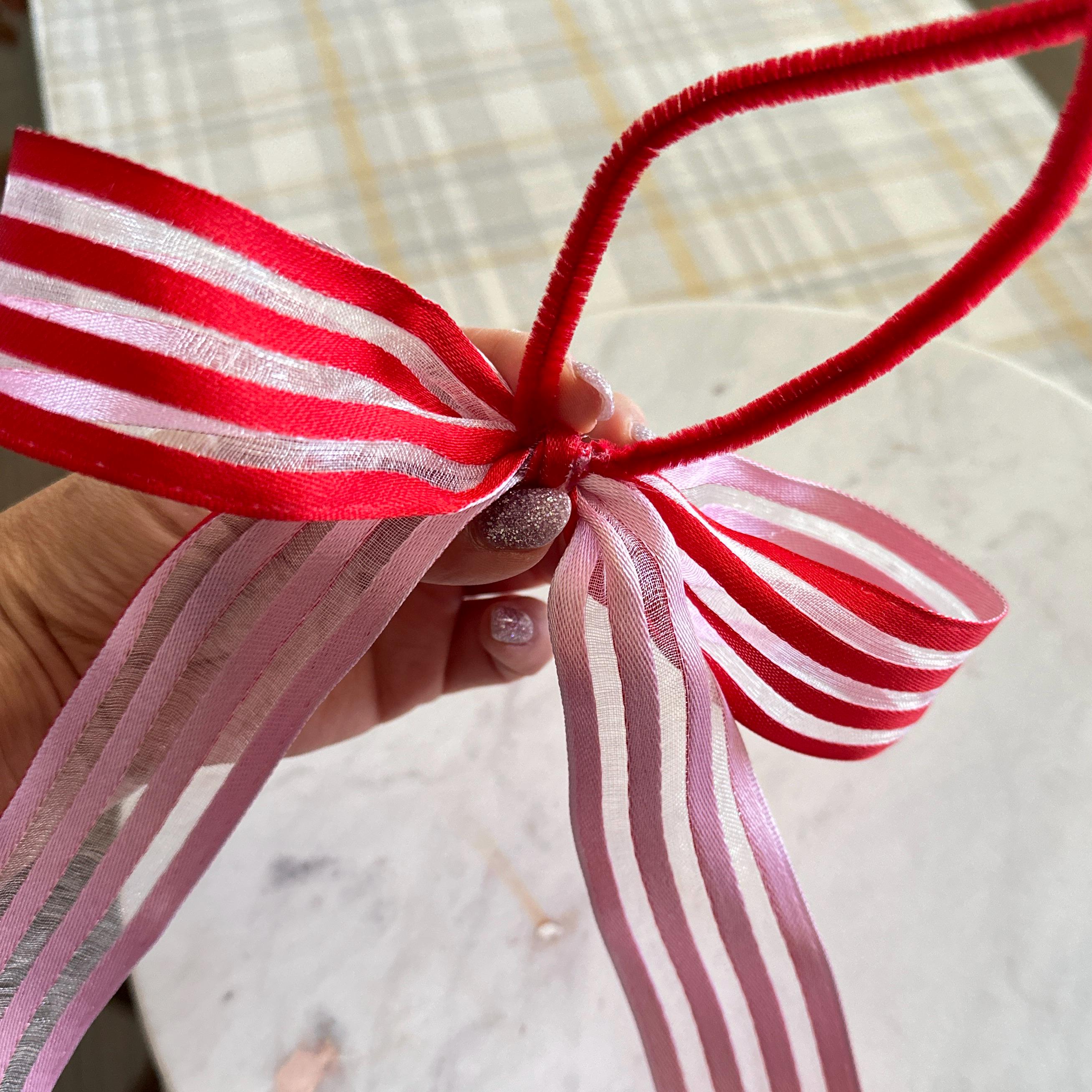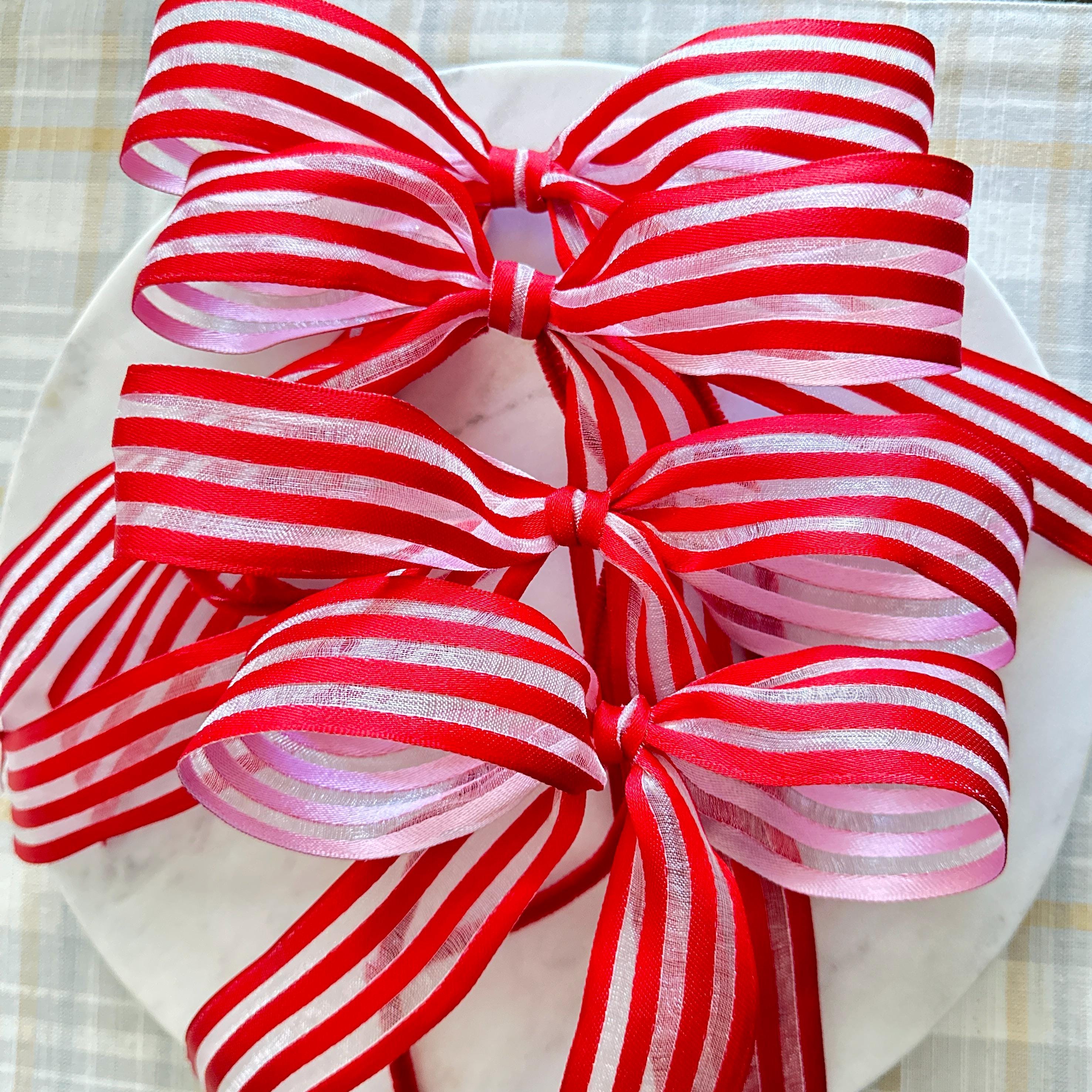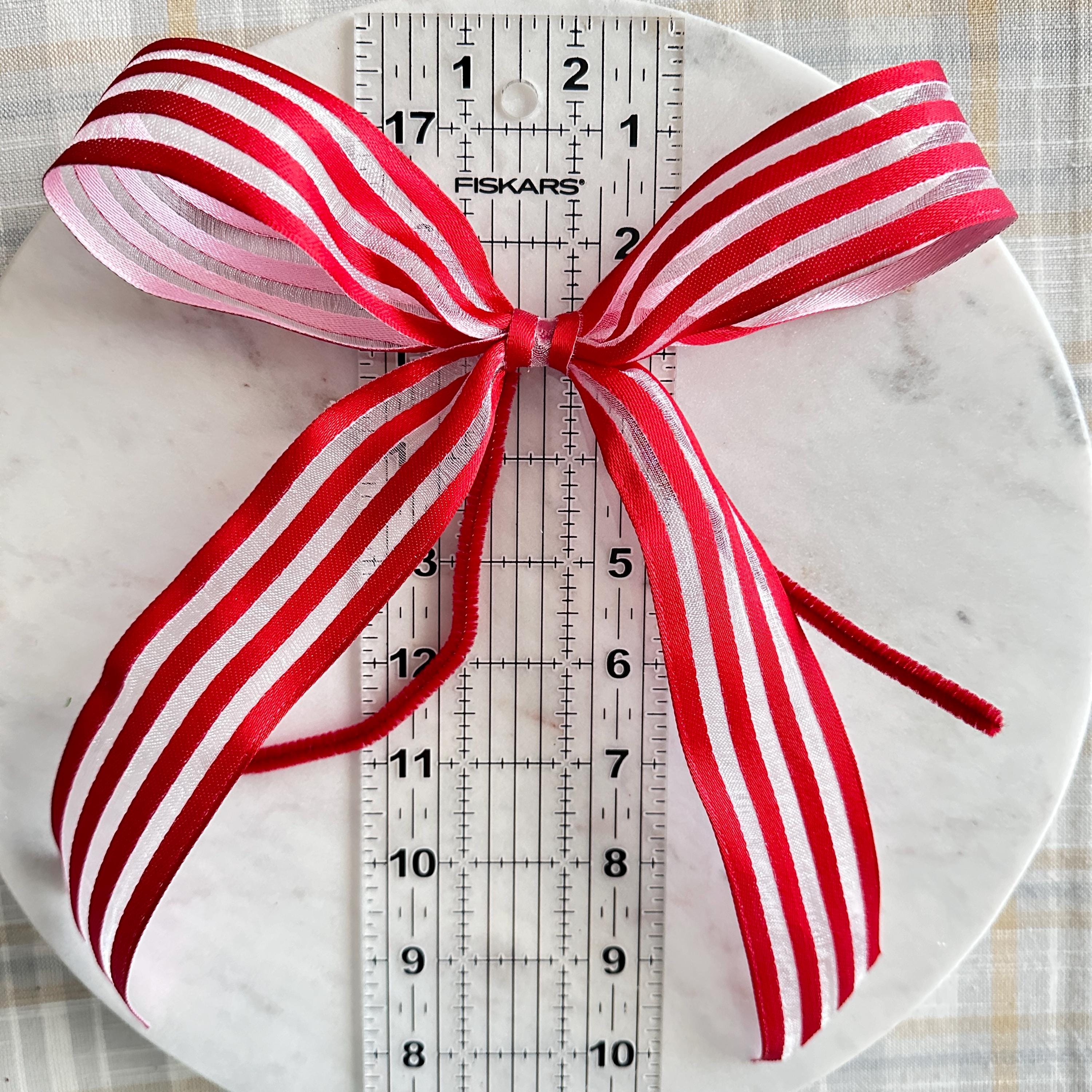 Red and White ribbon bows with chenille stem for easy decorating or accenting wreaths and garlands, staircase, lanterns, gift wrapping or crafting. Alternating satin and mesh is classic yet luxurious. Ten small bows are approximately 4" loops with 8" tails. One large bow is about 9" across (fluffed). You'll receive all 11 bows in a large box.
