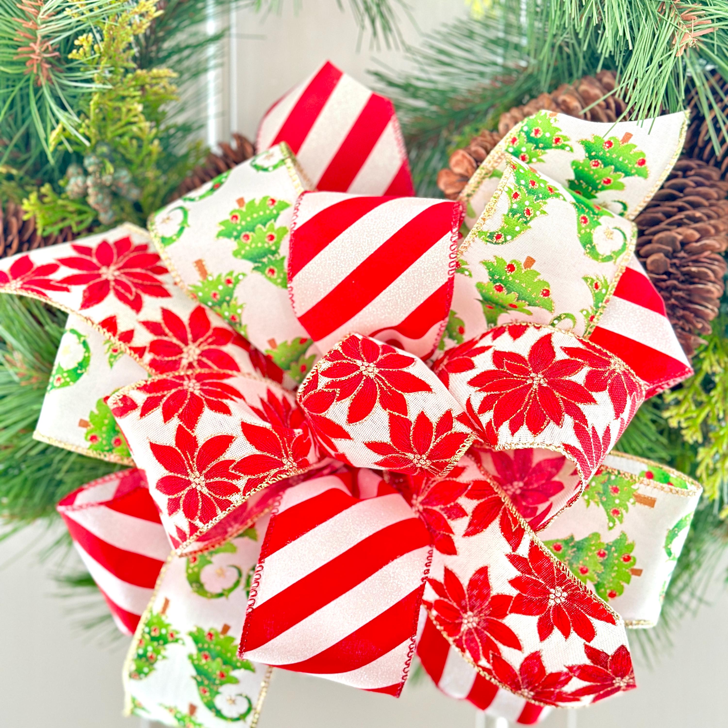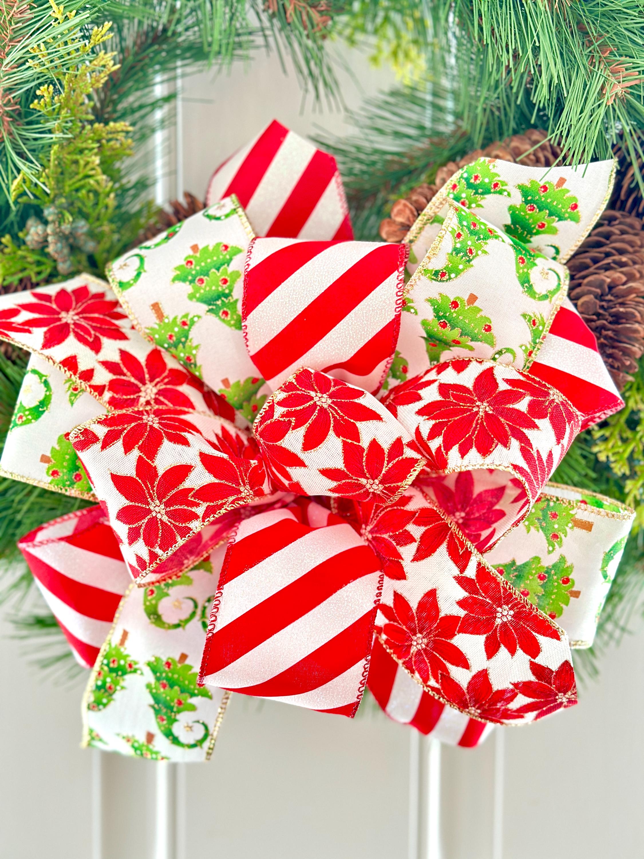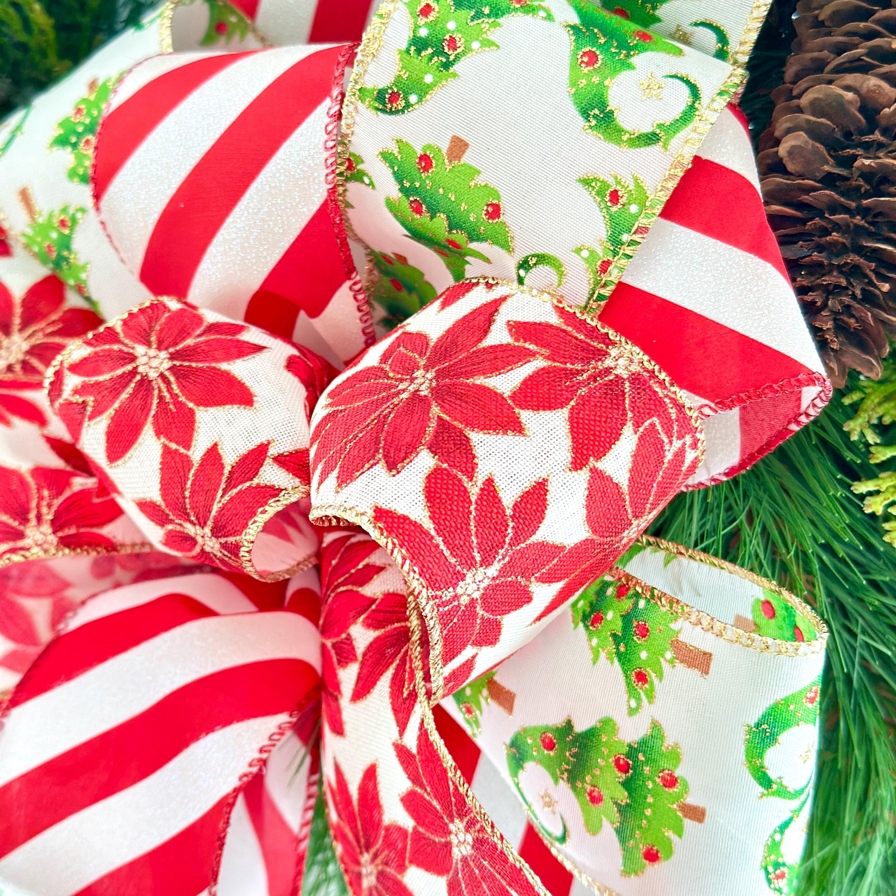A. wreath bow made with three 2.5" wired ribbons. This bow features festive green Christmas trees, red and white candy stripe, and red poinsettia ribbons. The playful mix of patterns brings a cheerful, holiday spirit to any wreath, garlands, lanterns, and gifts. Pictured on a 24" wreath for sizing reference - wreath NOT included. Approximately 10" x 10". A chenille stem is attached to the back for easy fastening.