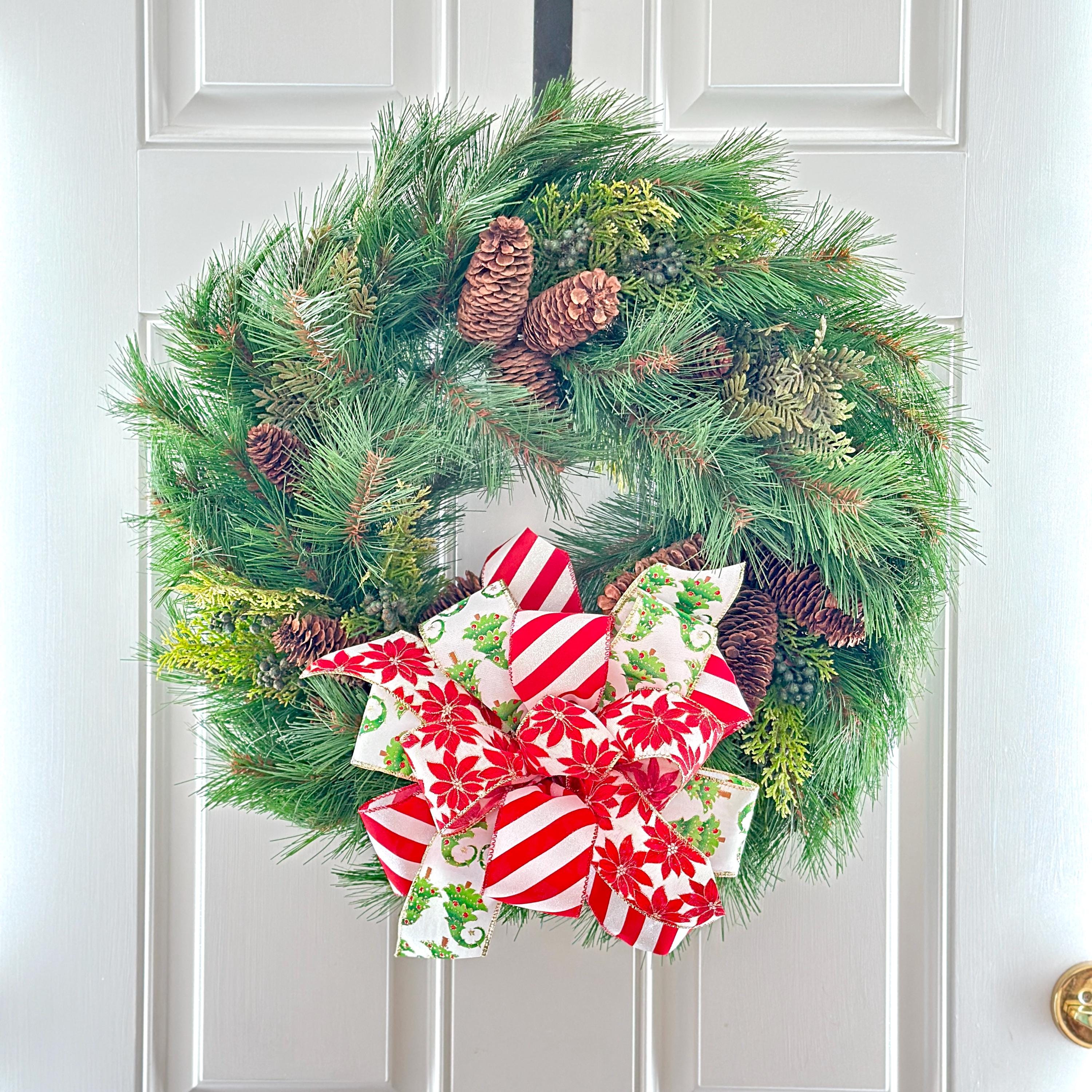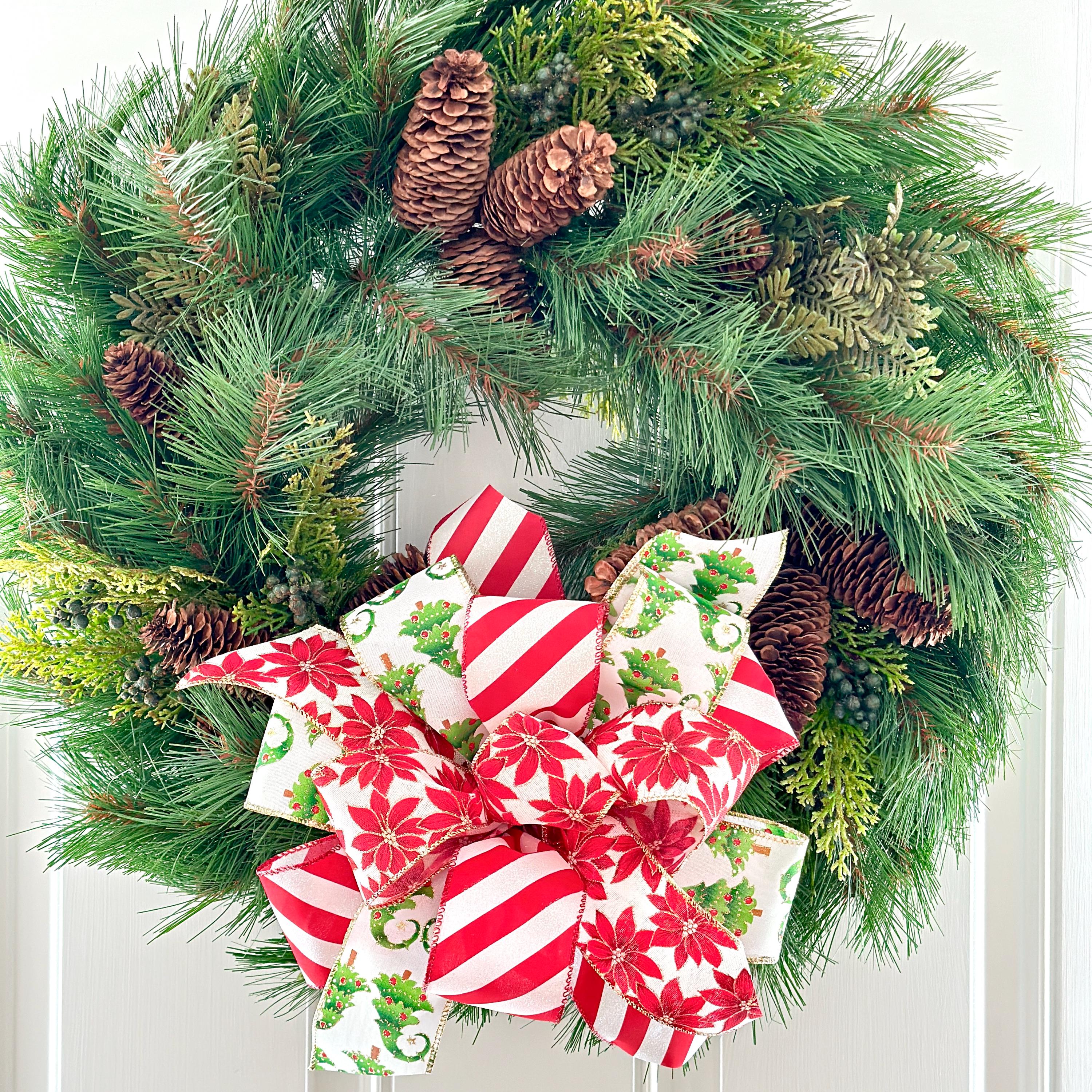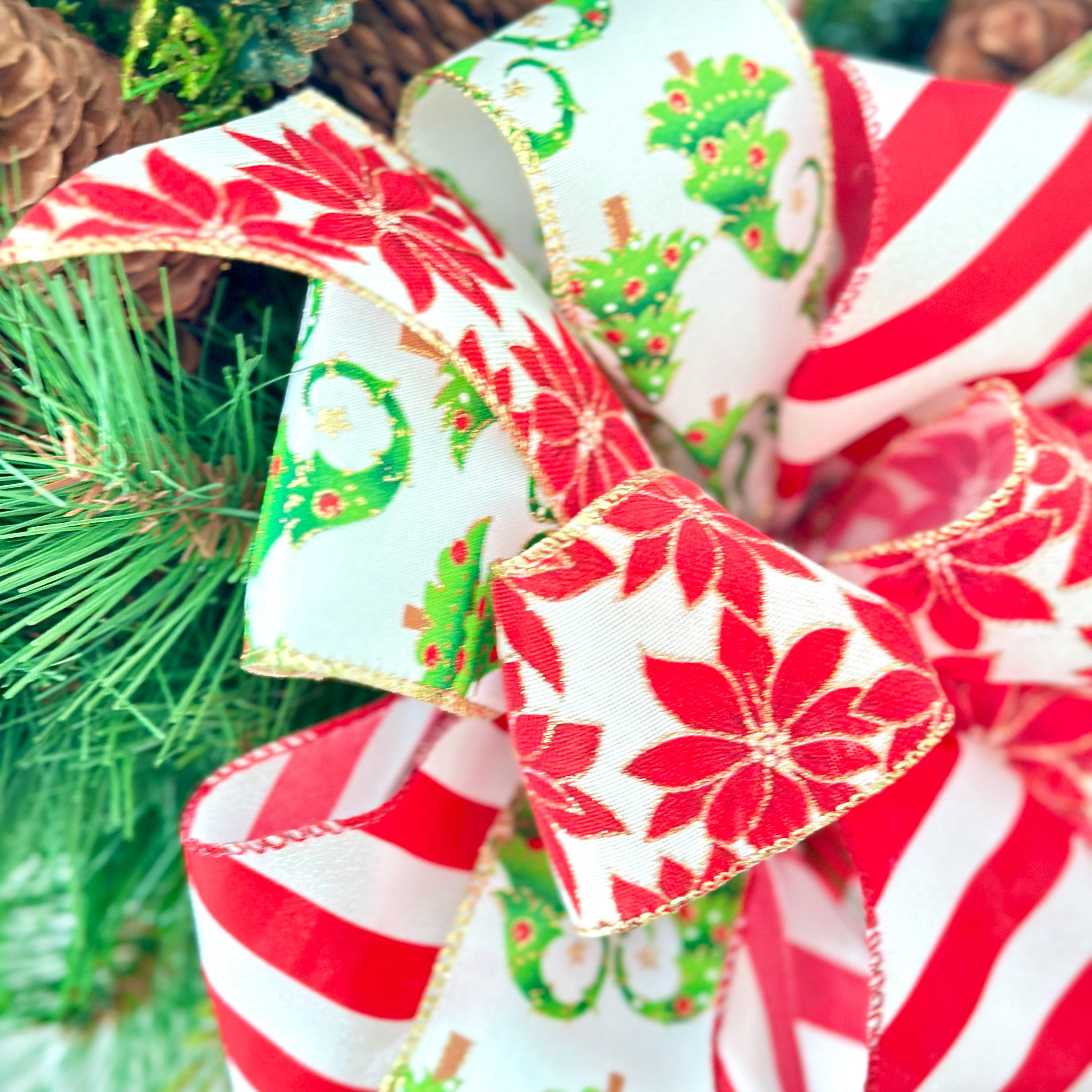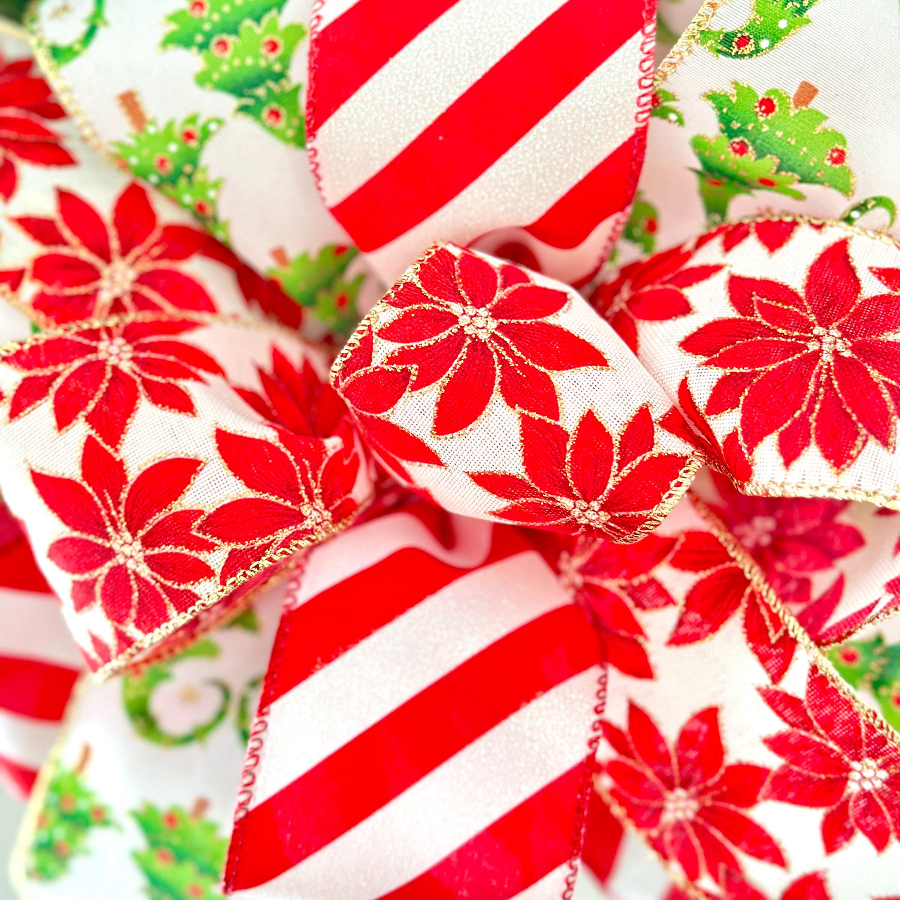 A. wreath bow made with three 2.5" wired ribbons. This bow features festive green Christmas trees, red and white candy stripe, and red poinsettia ribbons. The playful mix of patterns brings a cheerful, holiday spirit to any wreath, garlands, lanterns, and gifts. Pictured on a 24" wreath for sizing reference - wreath NOT included. Approximately 10" x 10". A chenille stem is attached to the back for easy fastening.