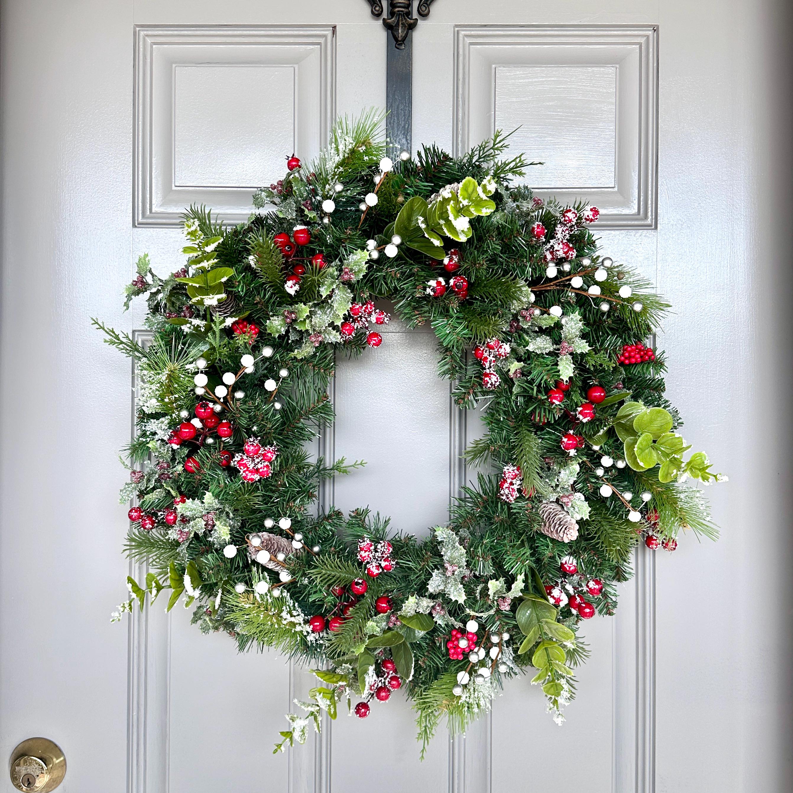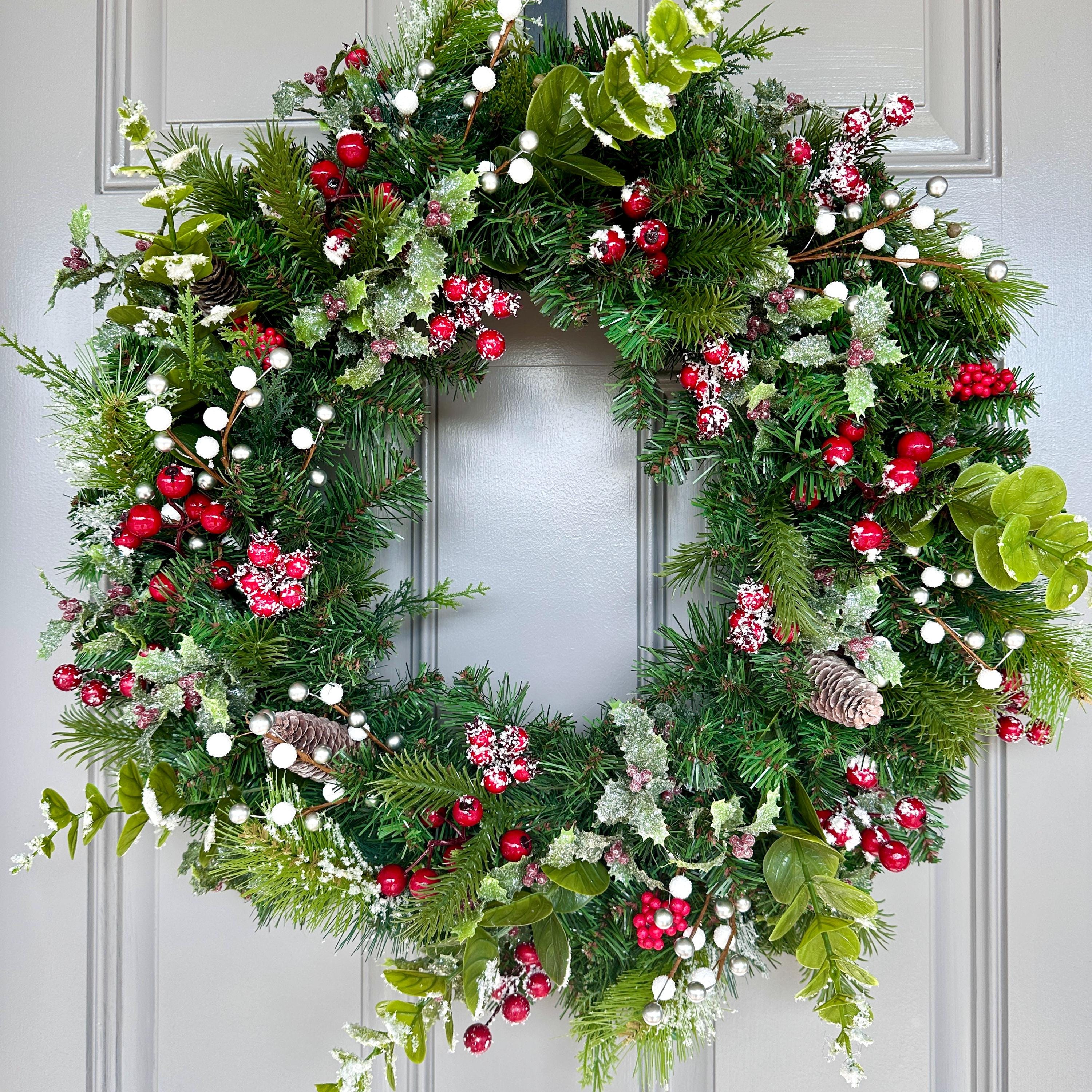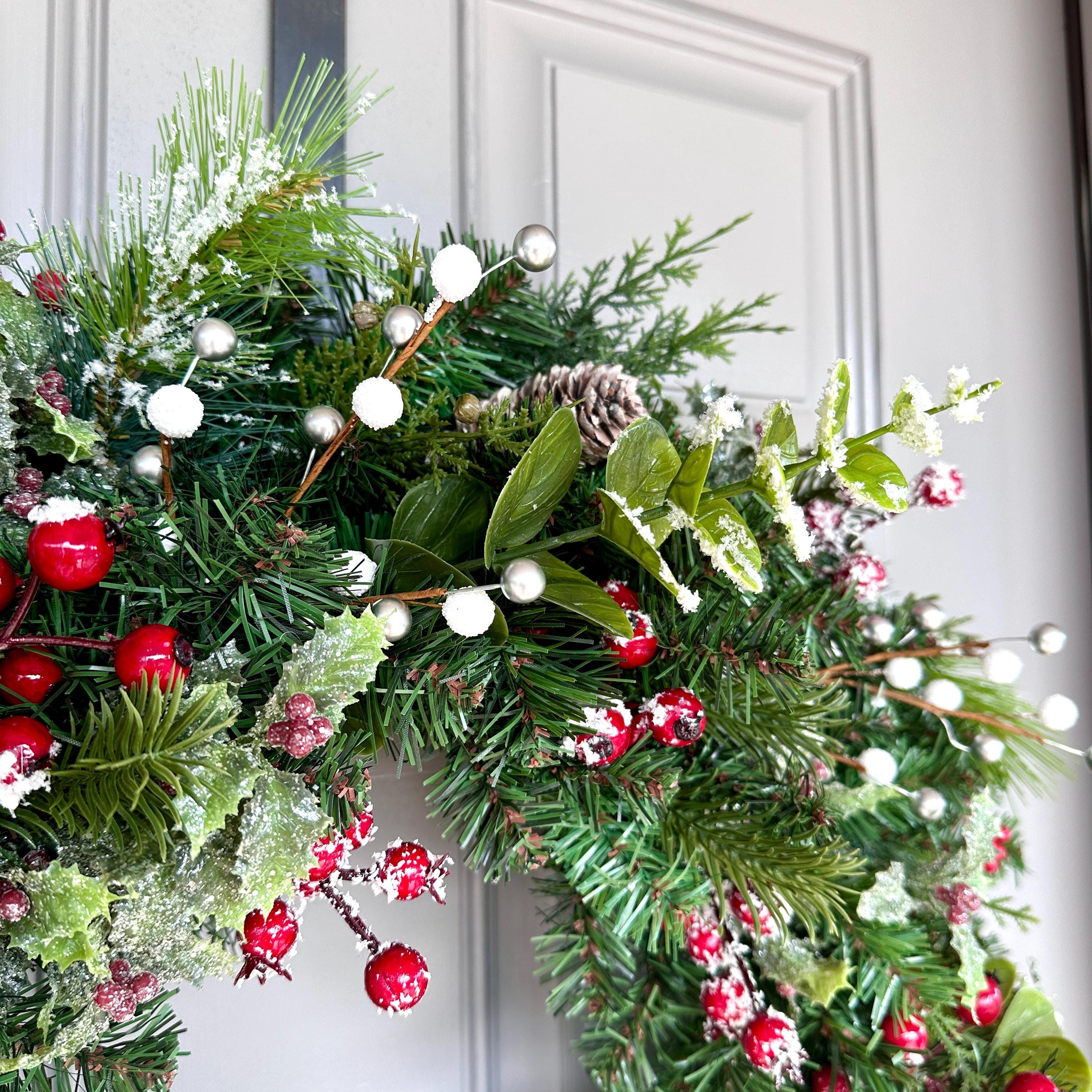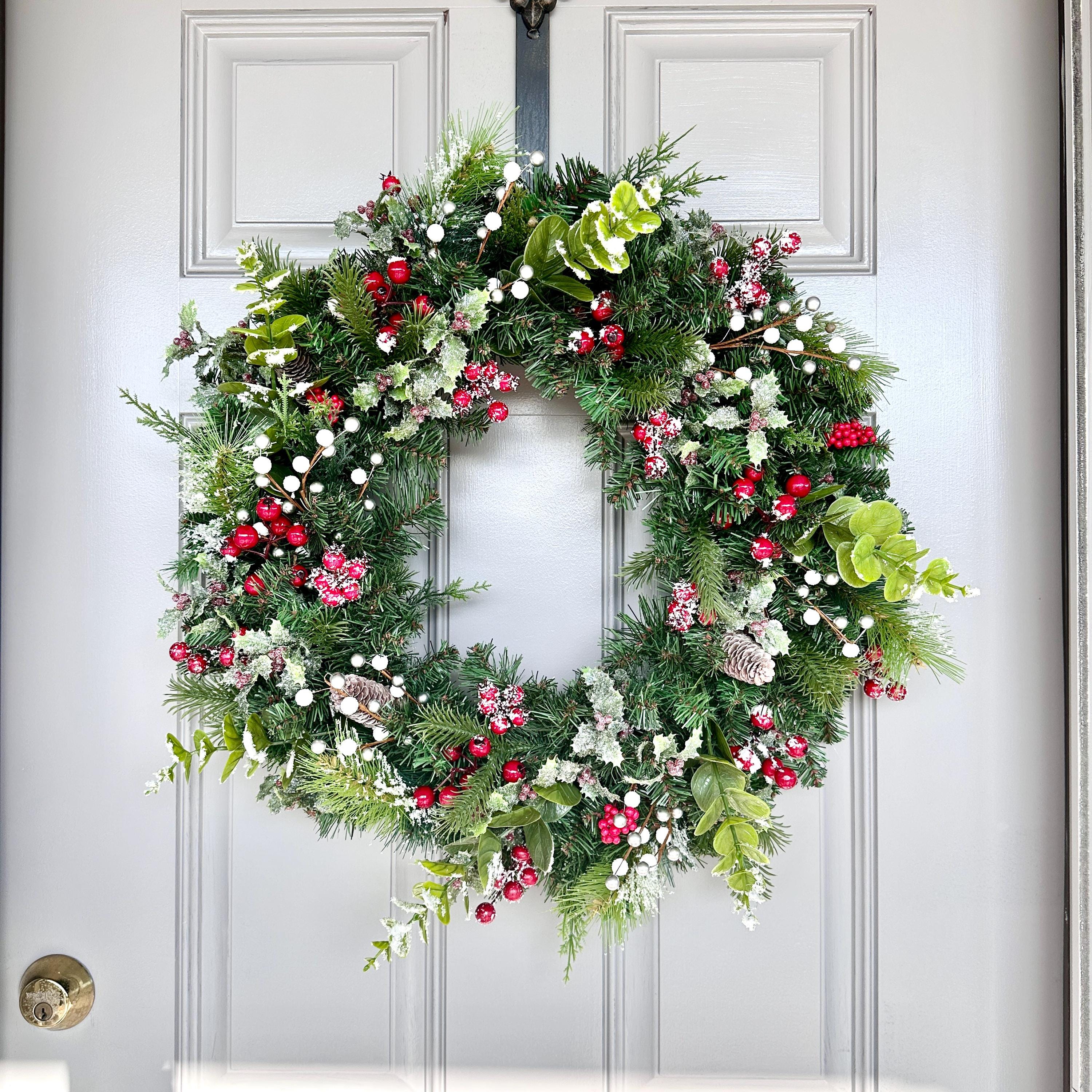 This beautiful Christmas wreath combines traditional greenery with pops of red berries, snowy white pinecones, and delicate white accents. Perfect for adding a festive touch to your front door or as a centerpiece in your home decor. Handmade with attention to detail, this wreath captures the timeless charm of the holiday season. A wonderful way to welcome guests and celebrate the warmth of the season. Approximately 23" across. The pictured is on a standard-sized door.