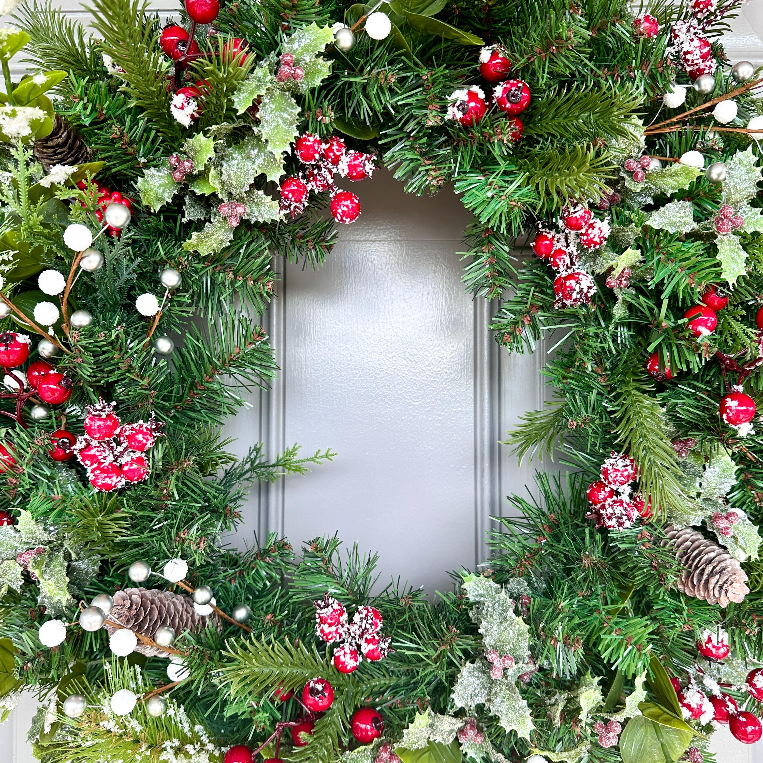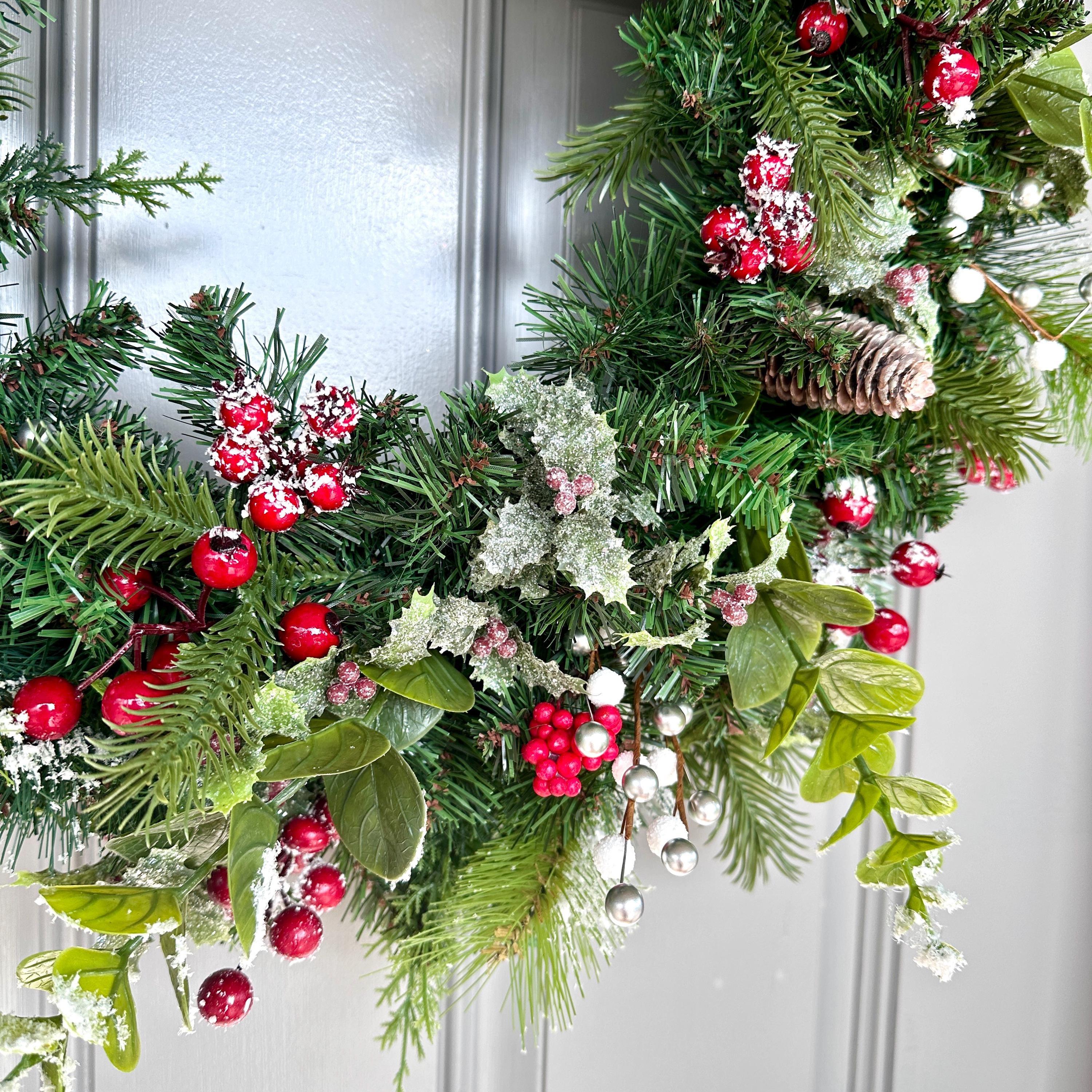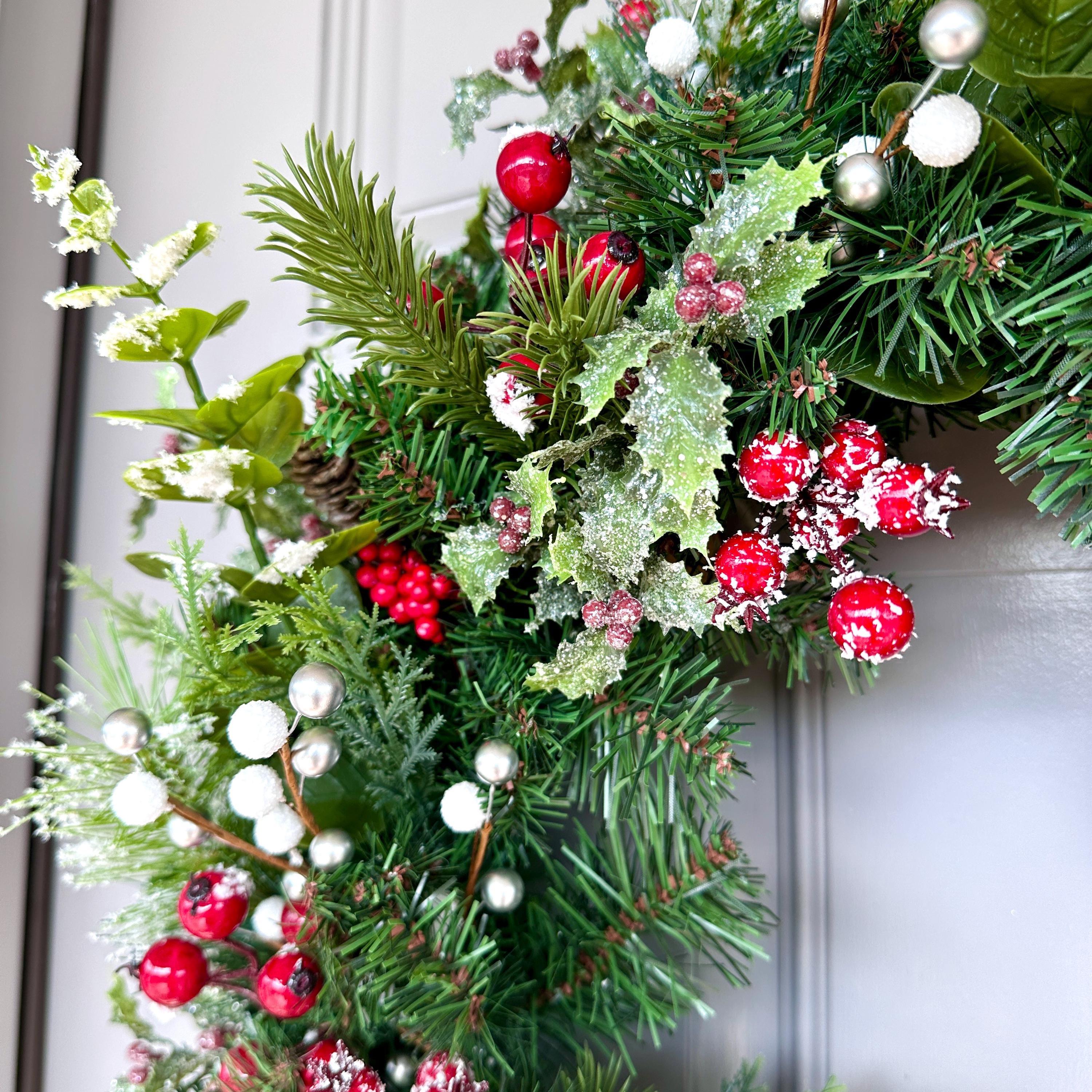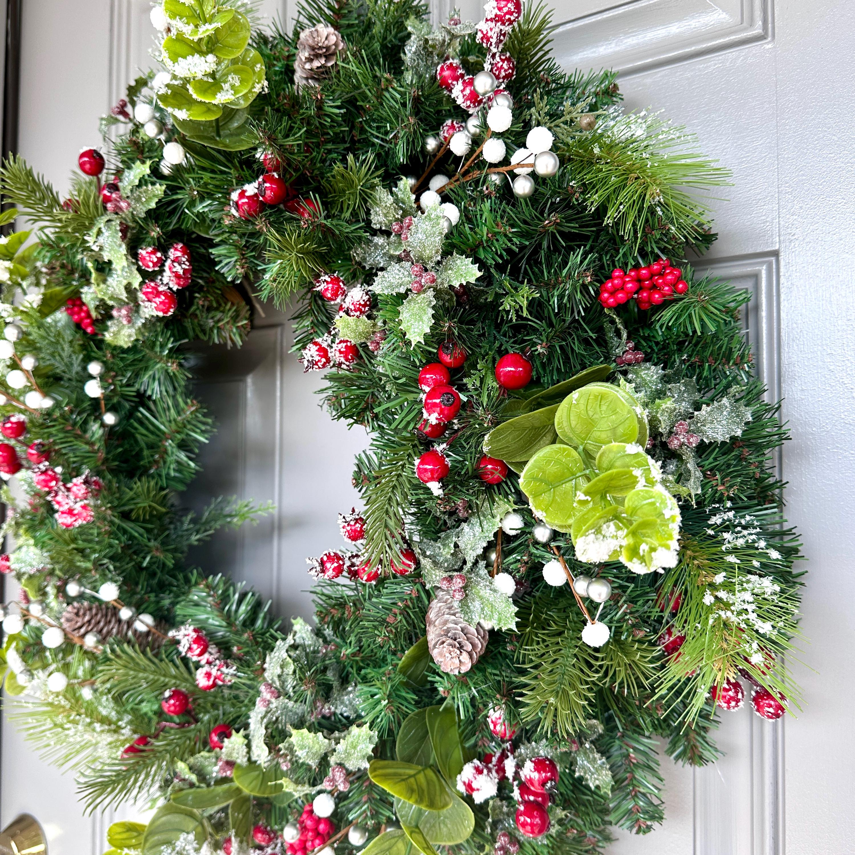This beautiful Christmas wreath combines traditional greenery with pops of red berries, snowy white pinecones, and delicate white accents. Perfect for adding a festive touch to your front door or as a centerpiece in your home decor. Handmade with attention to detail, this wreath captures the timeless charm of the holiday season. A wonderful way to welcome guests and celebrate the warmth of the season. Approximately 23" across. The pictured is on a standard-sized door.