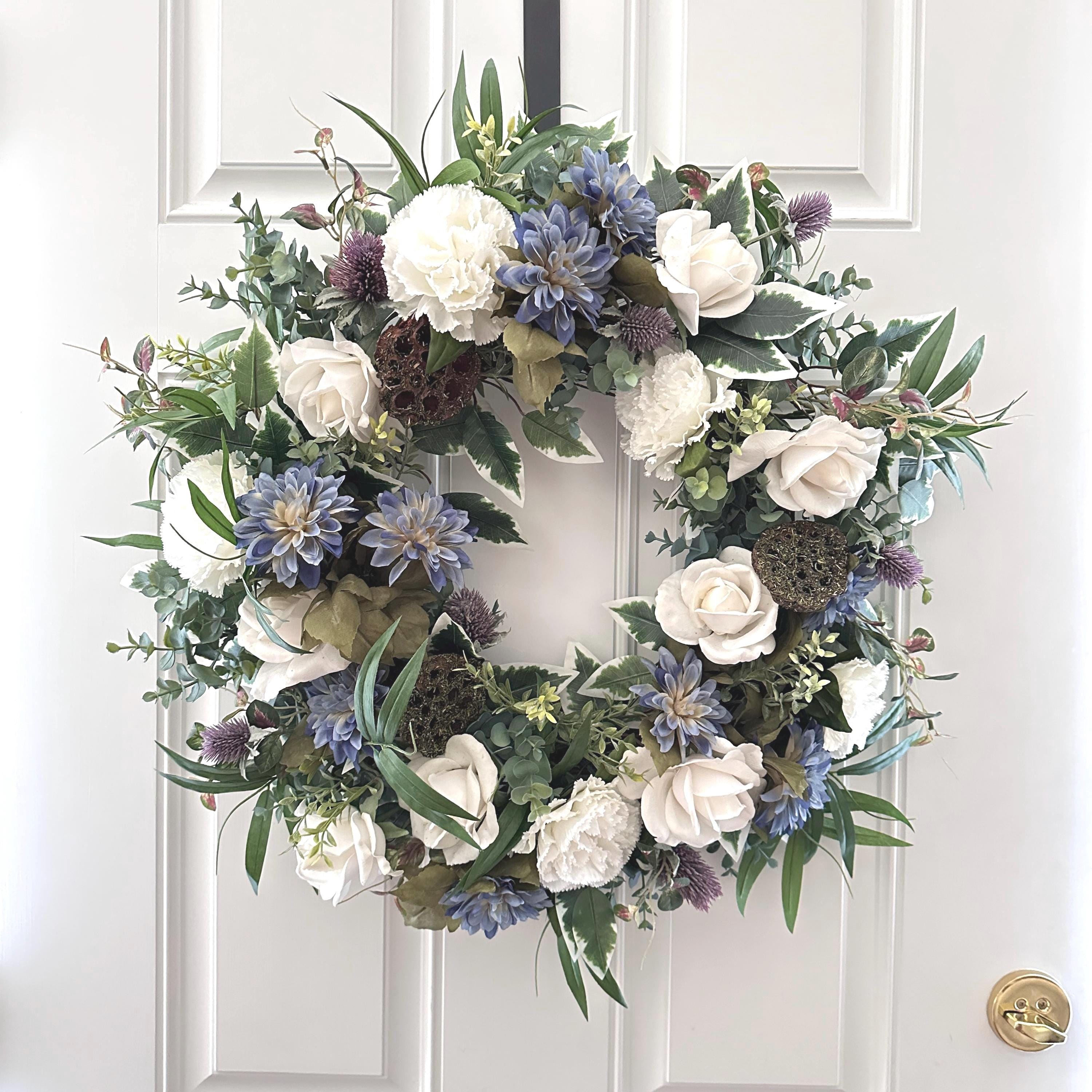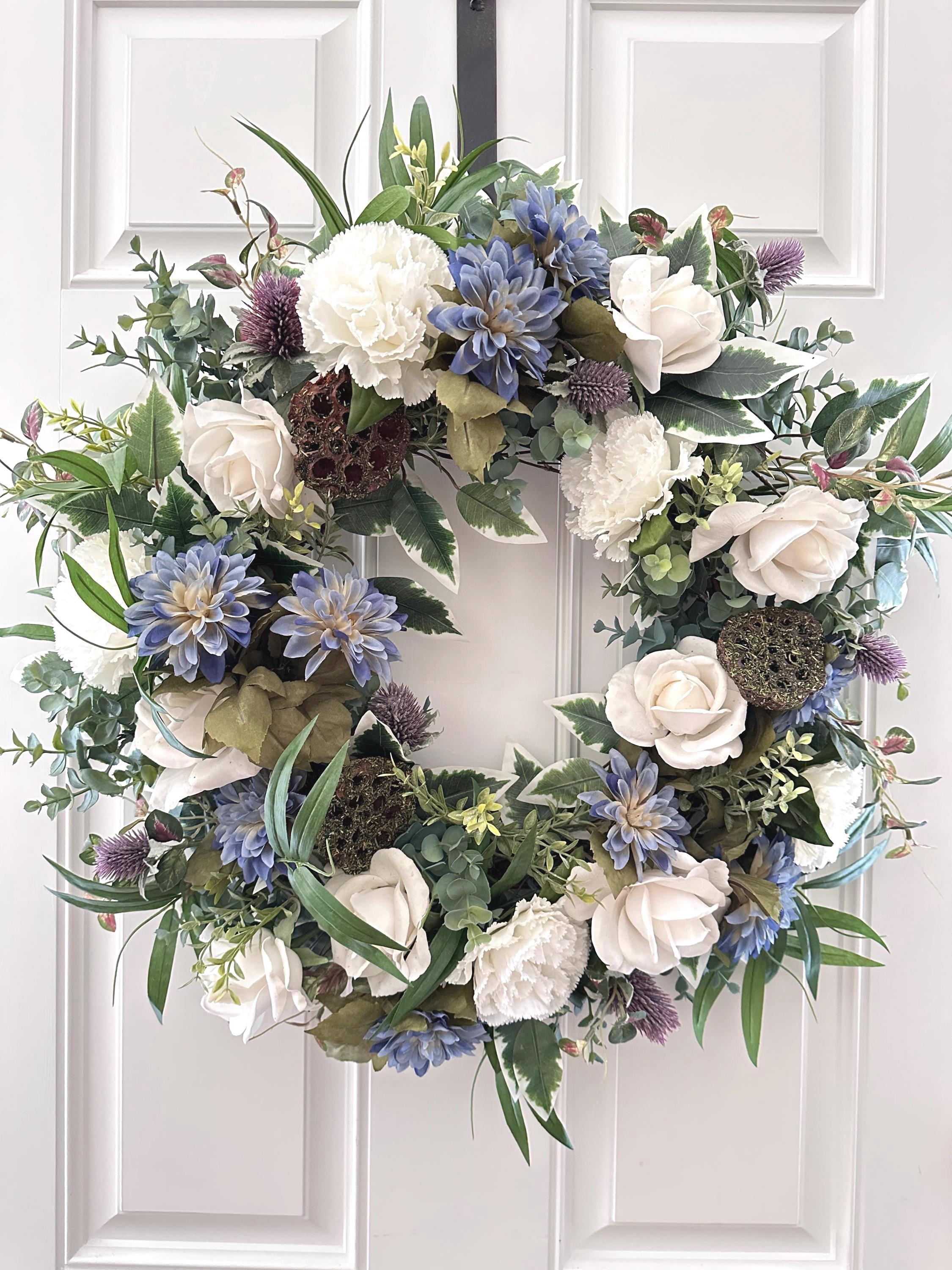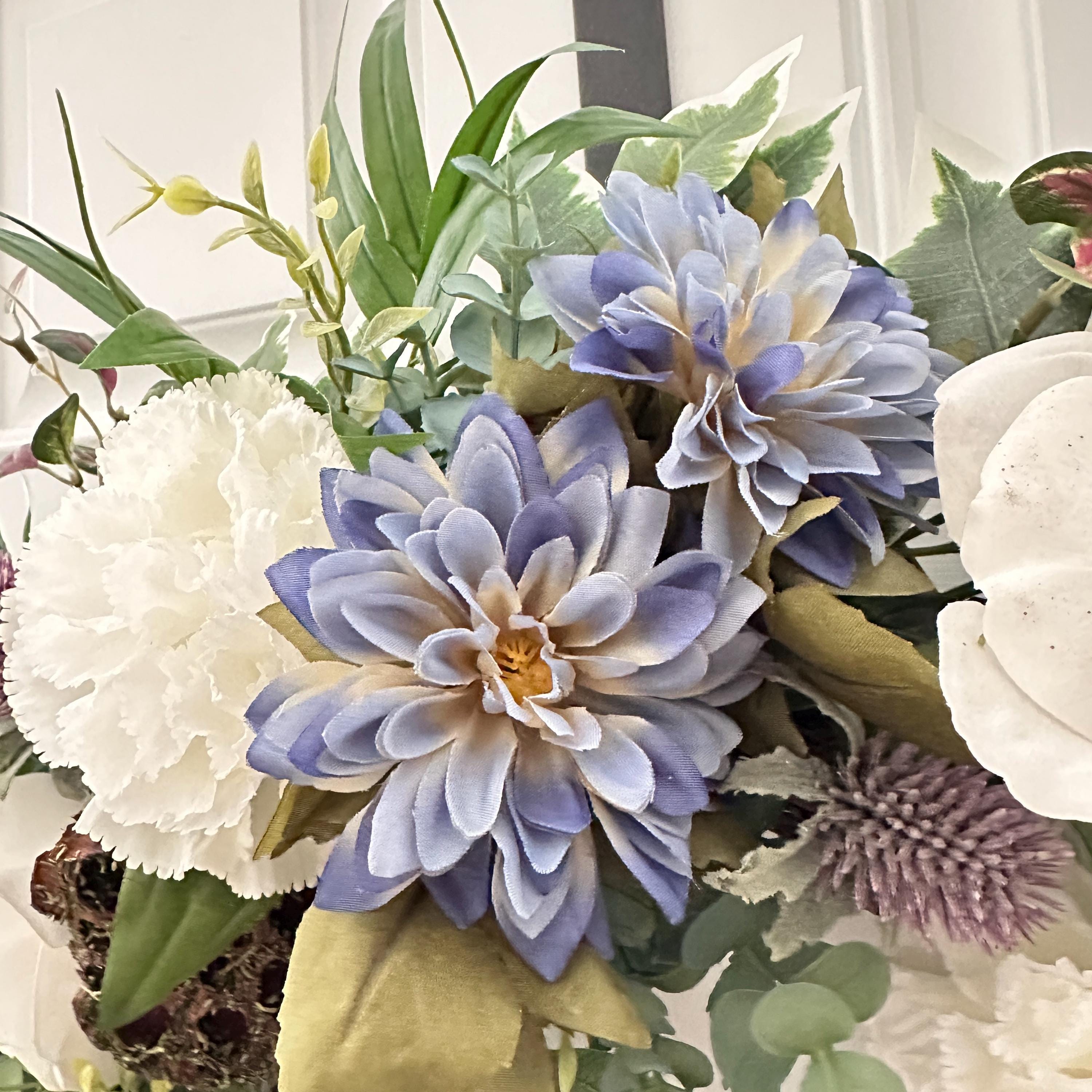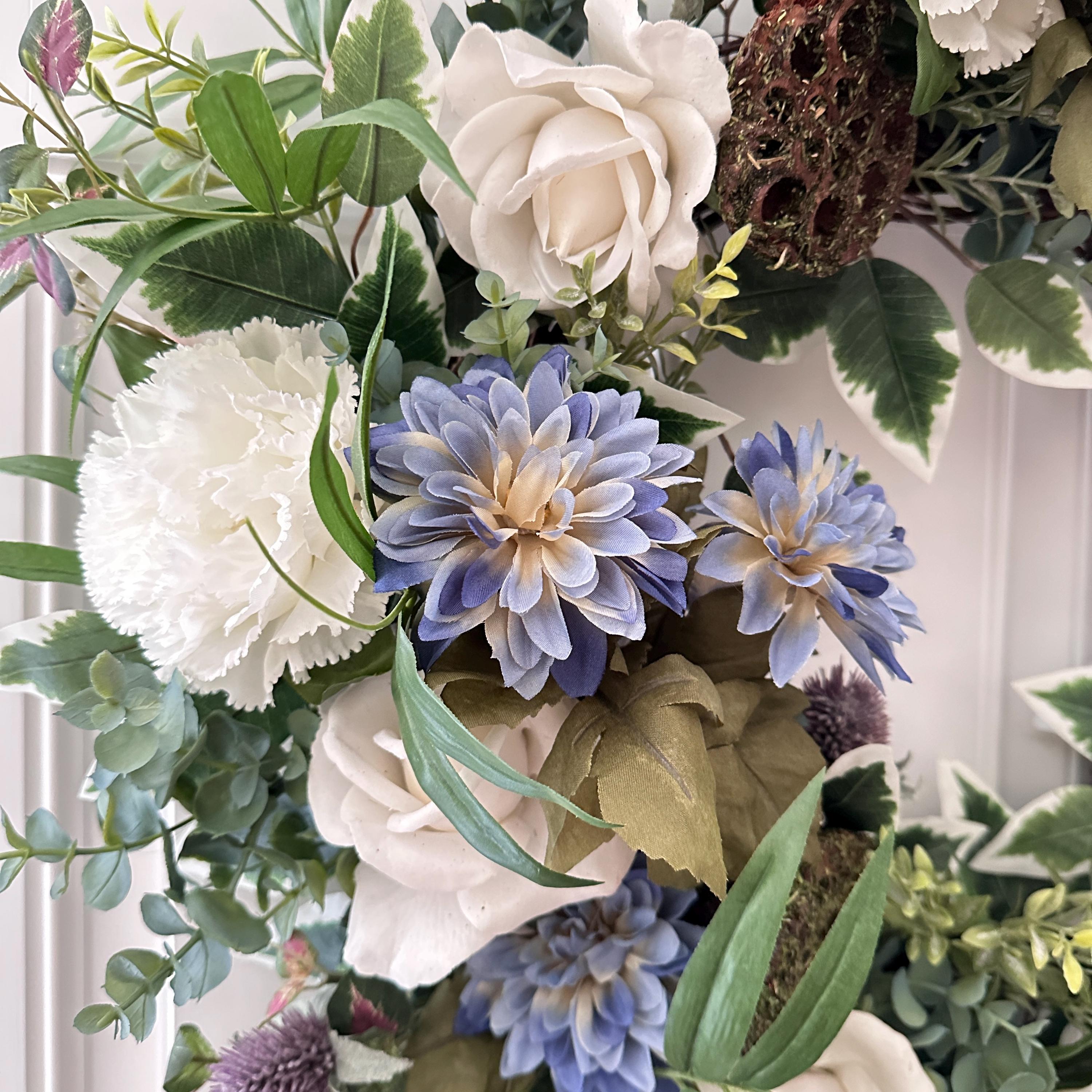 A timeless elegance of handcrafted blue and white floral wreath is made-to-order. Designed with a beautiful mix of silk roses, dahlias, and carnations, this wreath blends soft white tones with muted blue hues, accented by lush greenery and delicate filler flowers.