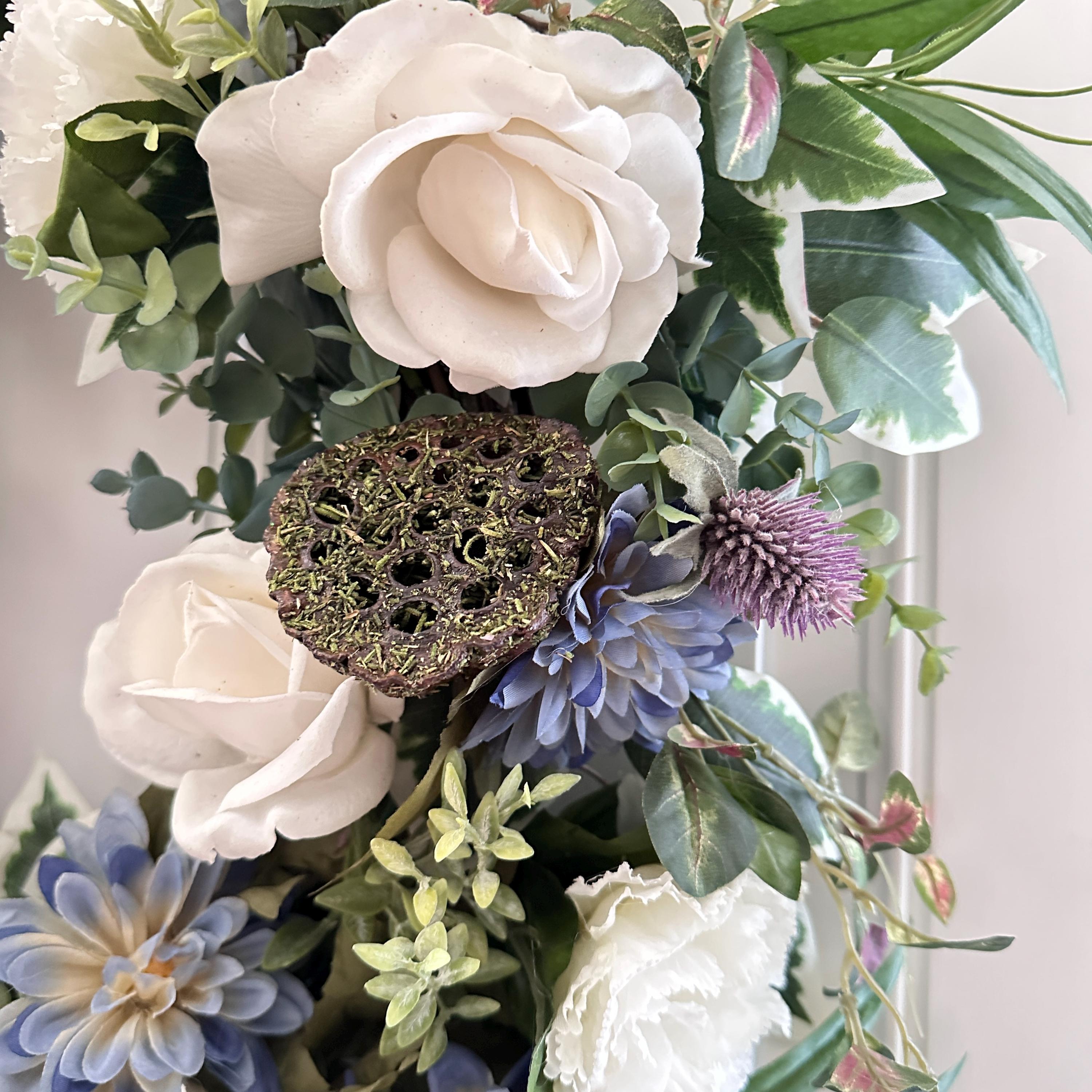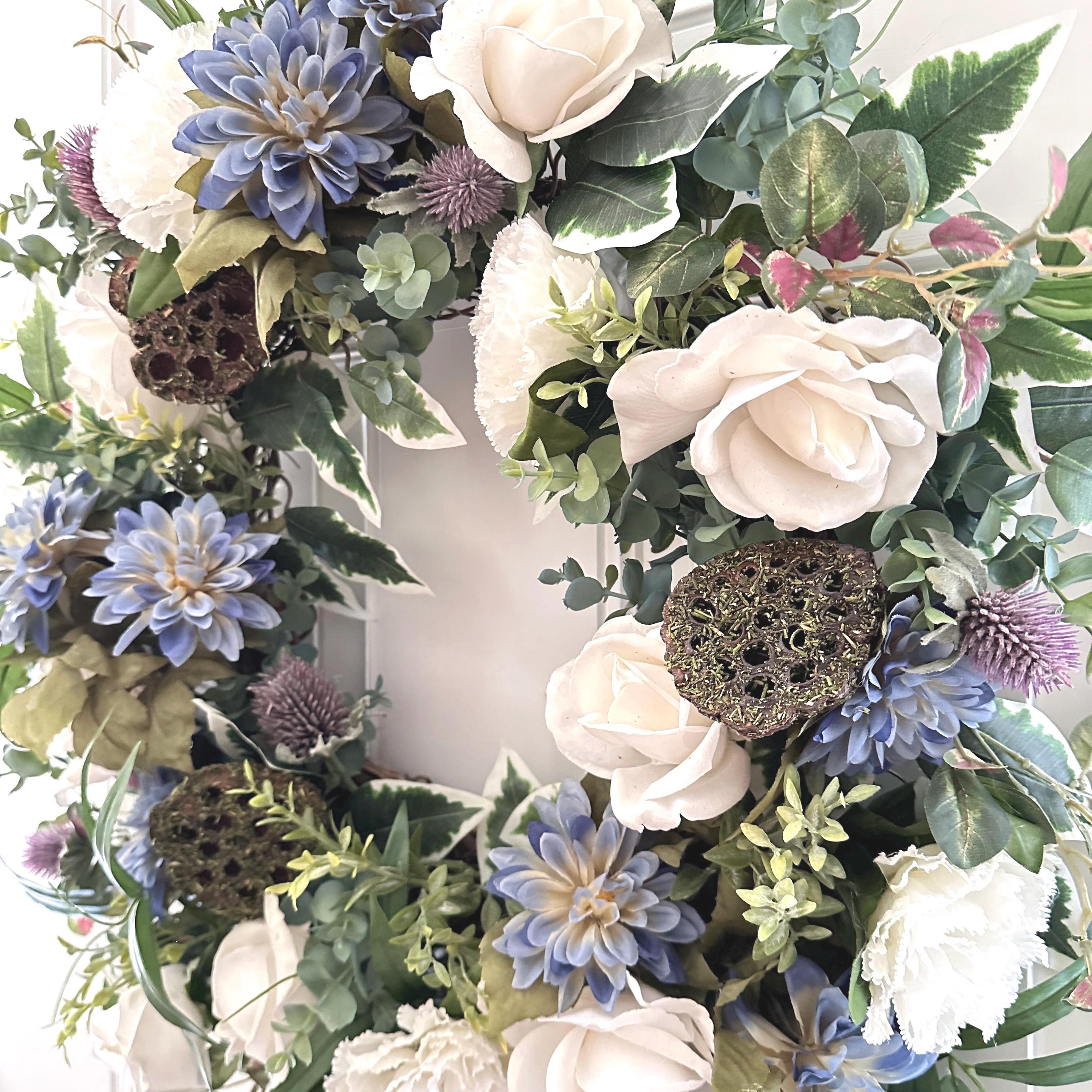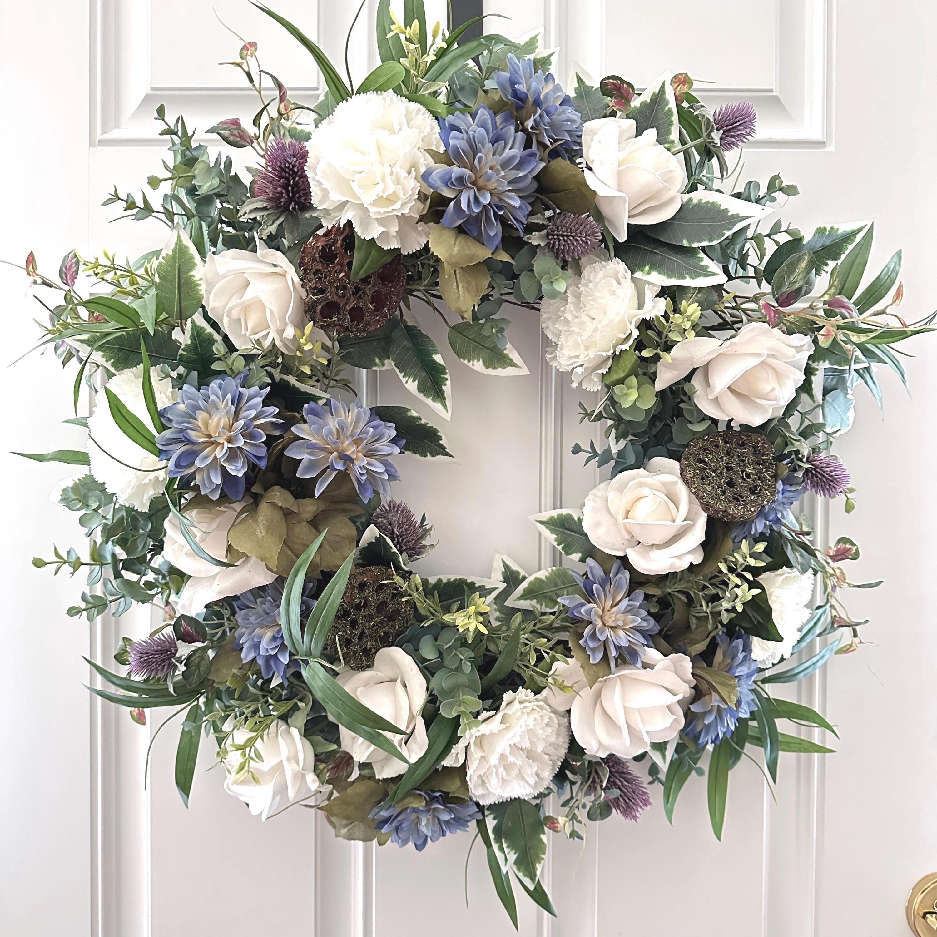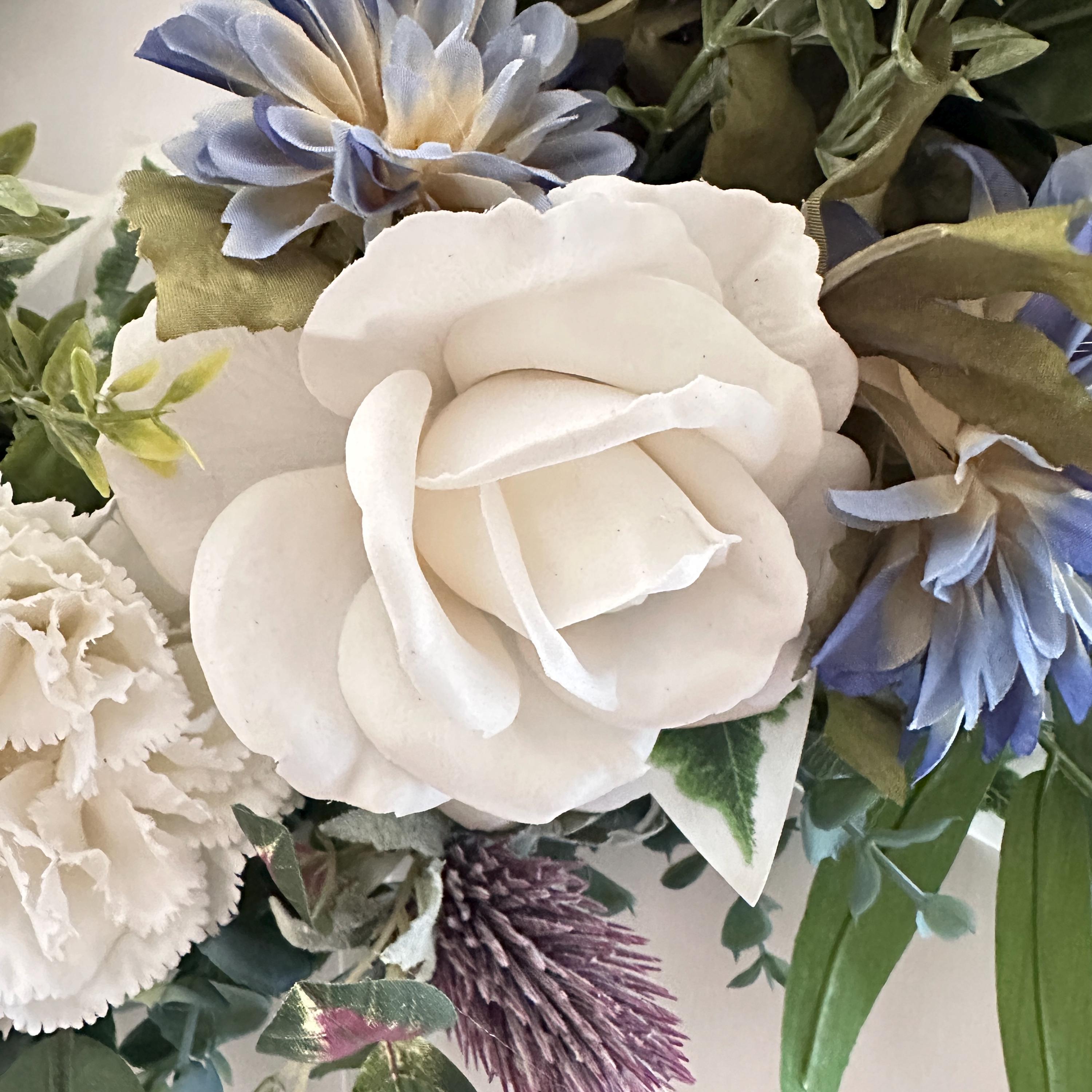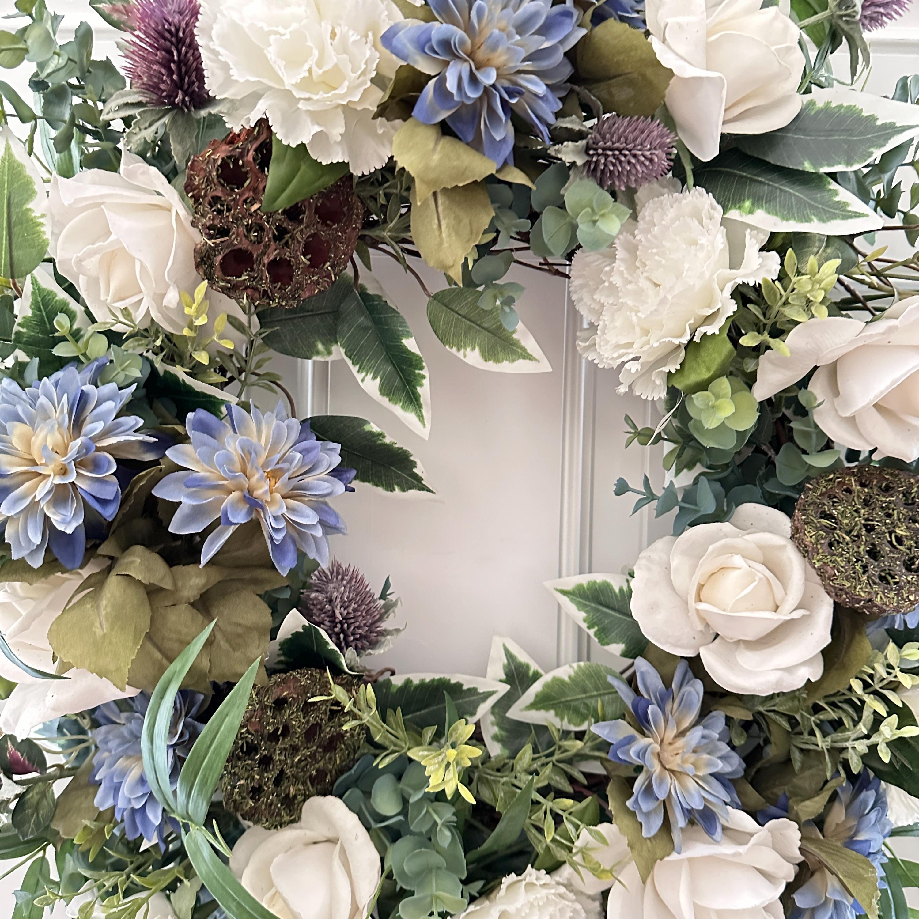 A timeless elegance of handcrafted blue and white floral wreath is made-to-order. Designed with a beautiful mix of silk roses, dahlias, and carnations, this wreath blends soft white tones with muted blue hues, accented by lush greenery and delicate filler flowers.