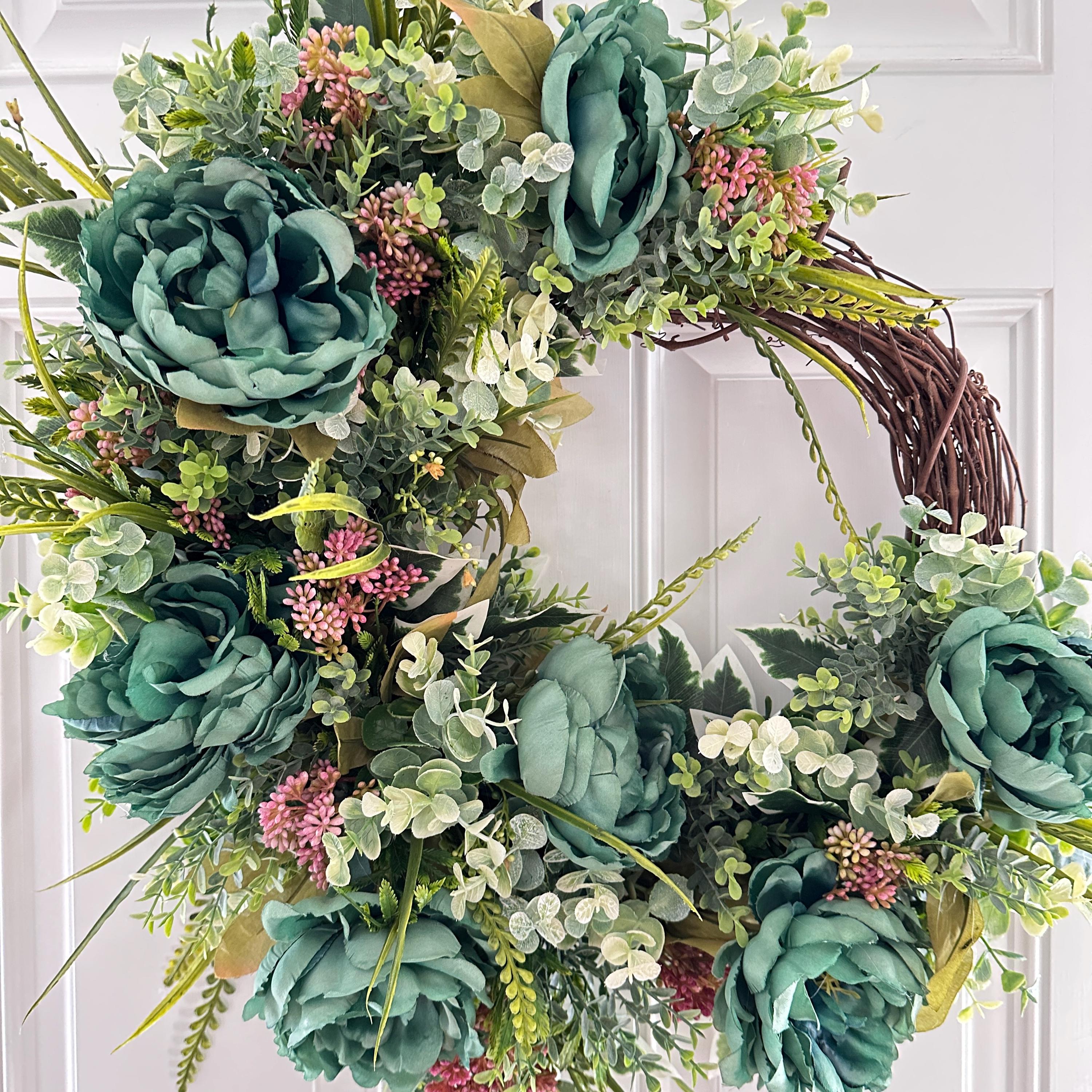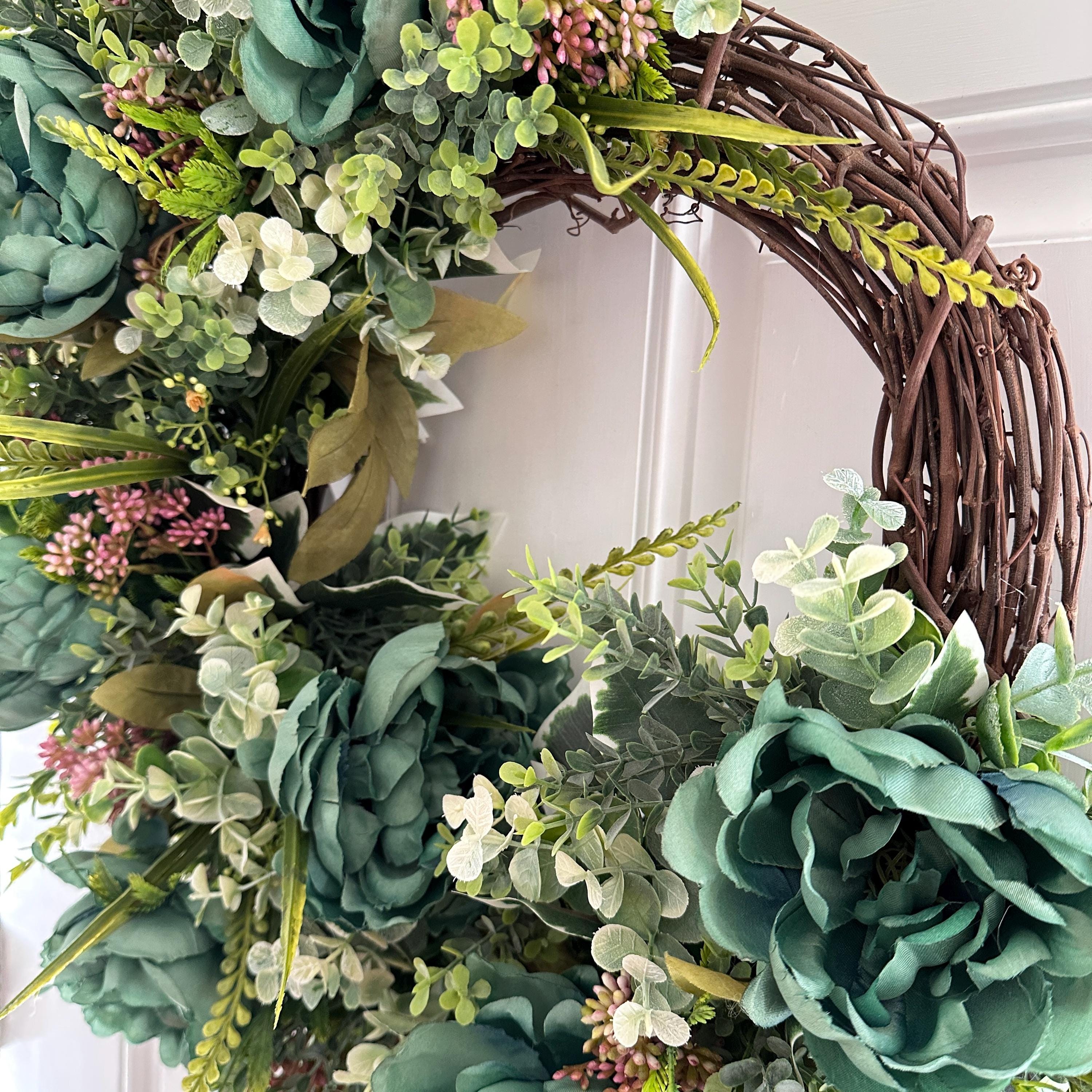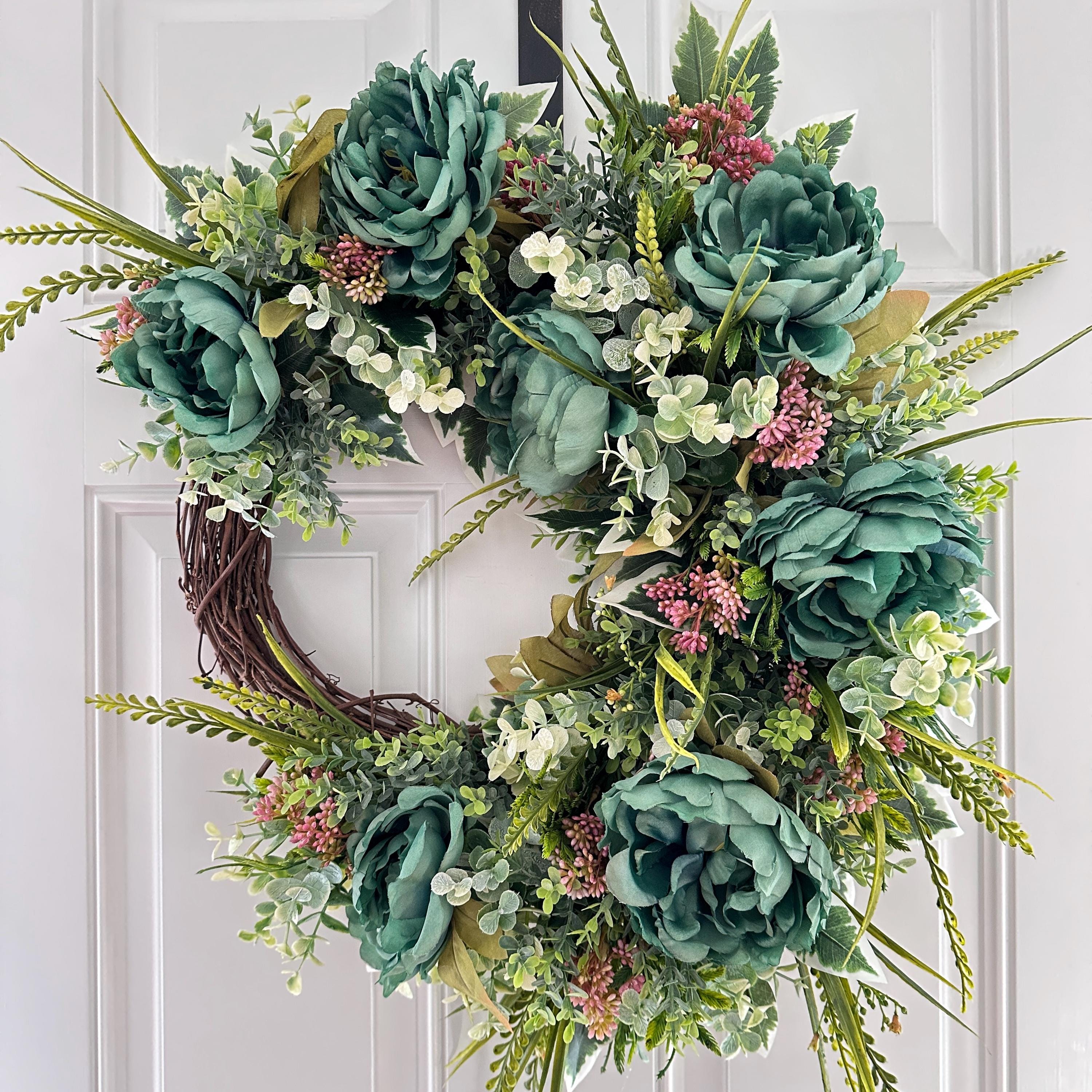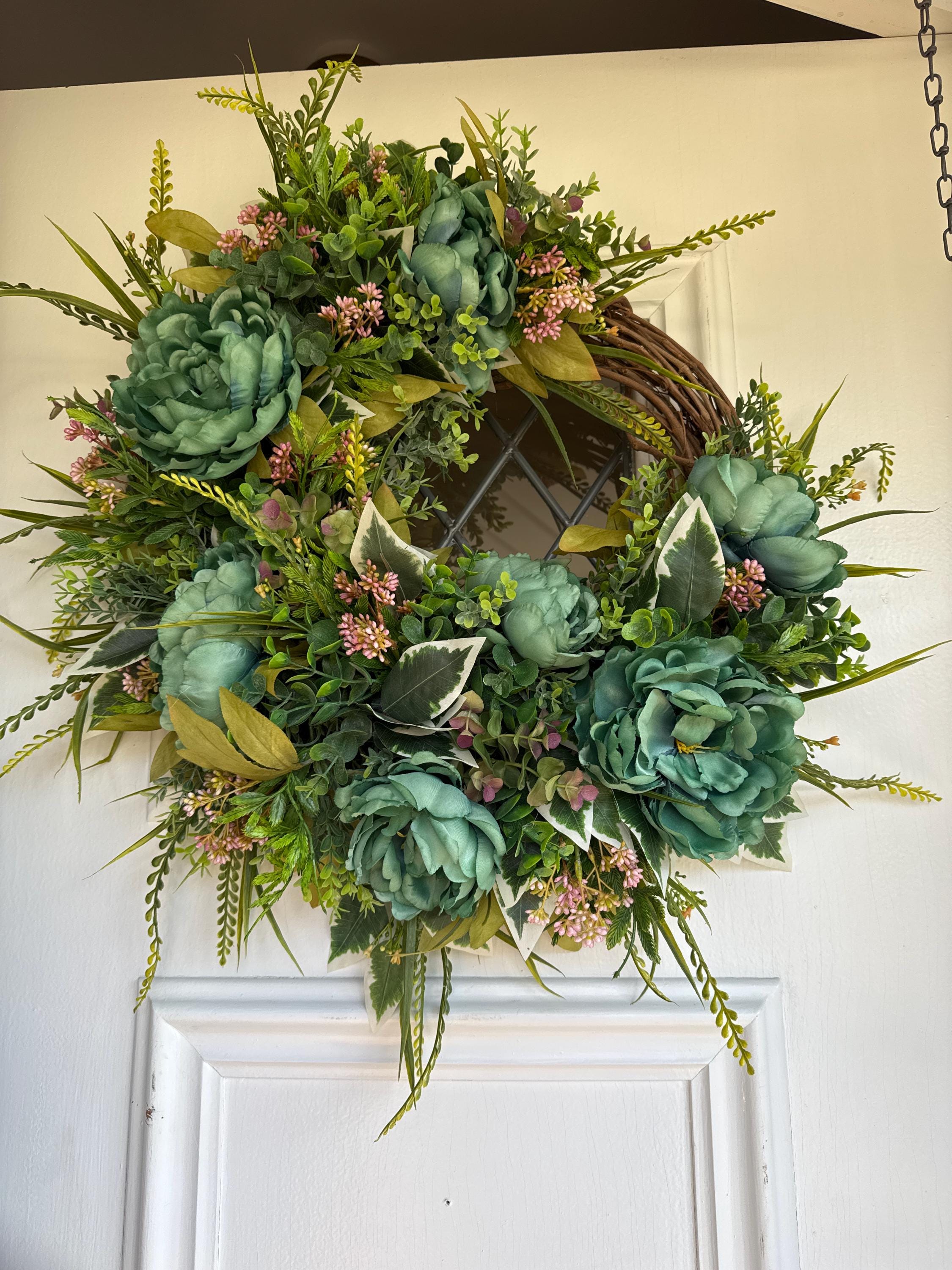 Lush teal peonies, button leaf saw grass greenery, and soft pink floral accents on a natural grapevine base. Perfect for spring, summer, or year-round display, this wreath adds a touch of elegance to any front door, entryway, or interior space. This wreath makes a wonderful gift for Mother's Day, birthdays, or new homeowners. It’s a unique way to bring warmth and charm to any home. Approximately 26" from leaf tip to leaf tip.