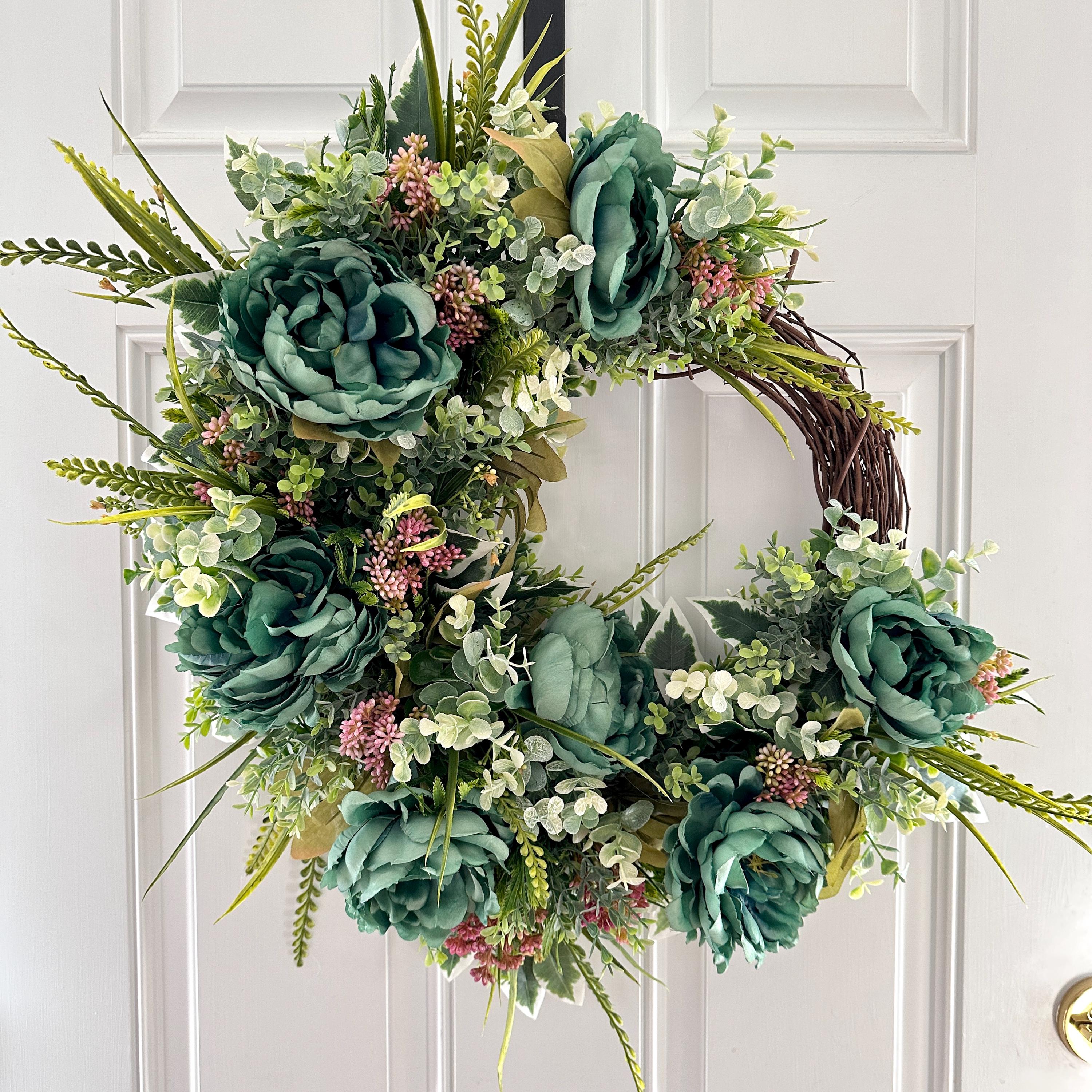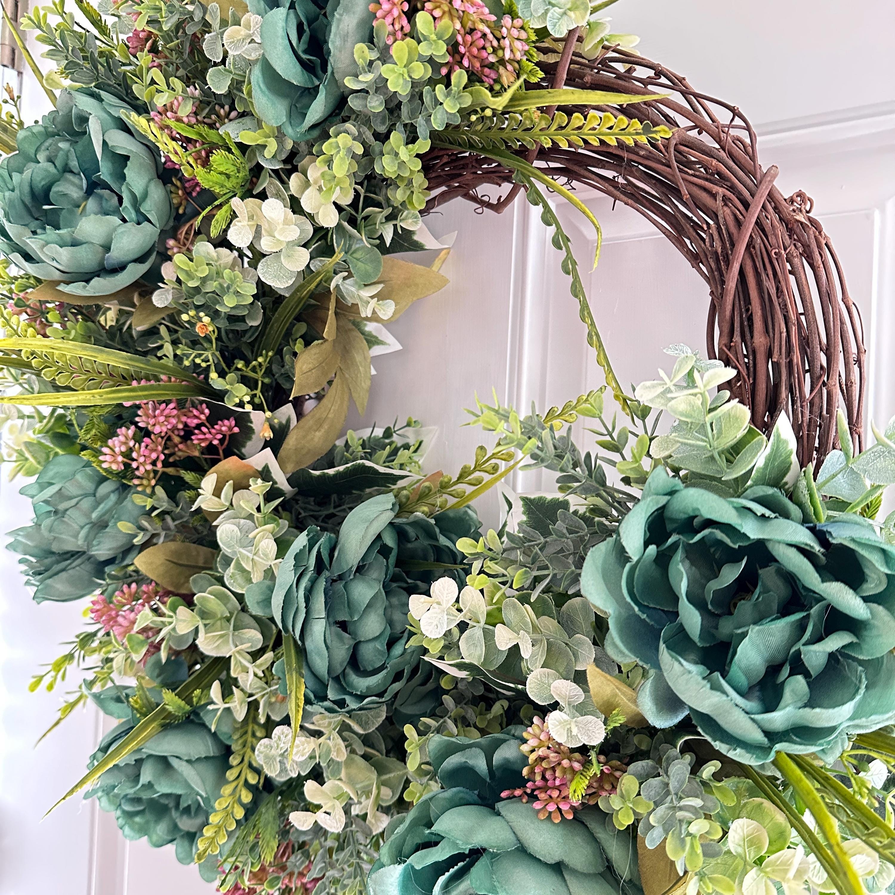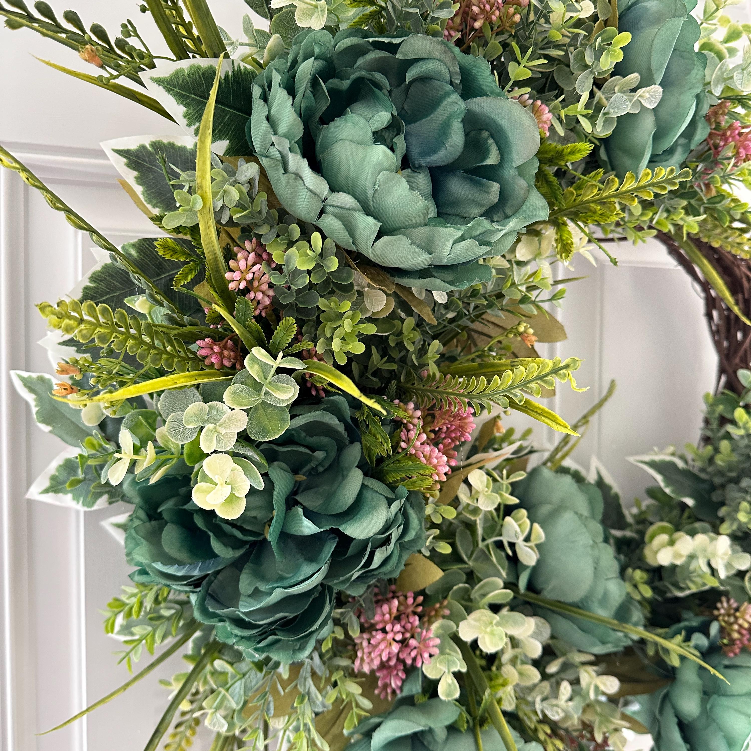 Lush teal peonies, button leaf saw grass greenery, and soft pink floral accents on a natural grapevine base. Perfect for spring, summer, or year-round display, this wreath adds a touch of elegance to any front door, entryway, or interior space. This wreath makes a wonderful gift for Mother's Day, birthdays, or new homeowners. It’s a unique way to bring warmth and charm to any home. Approximately 26" from leaf tip to leaf tip.