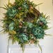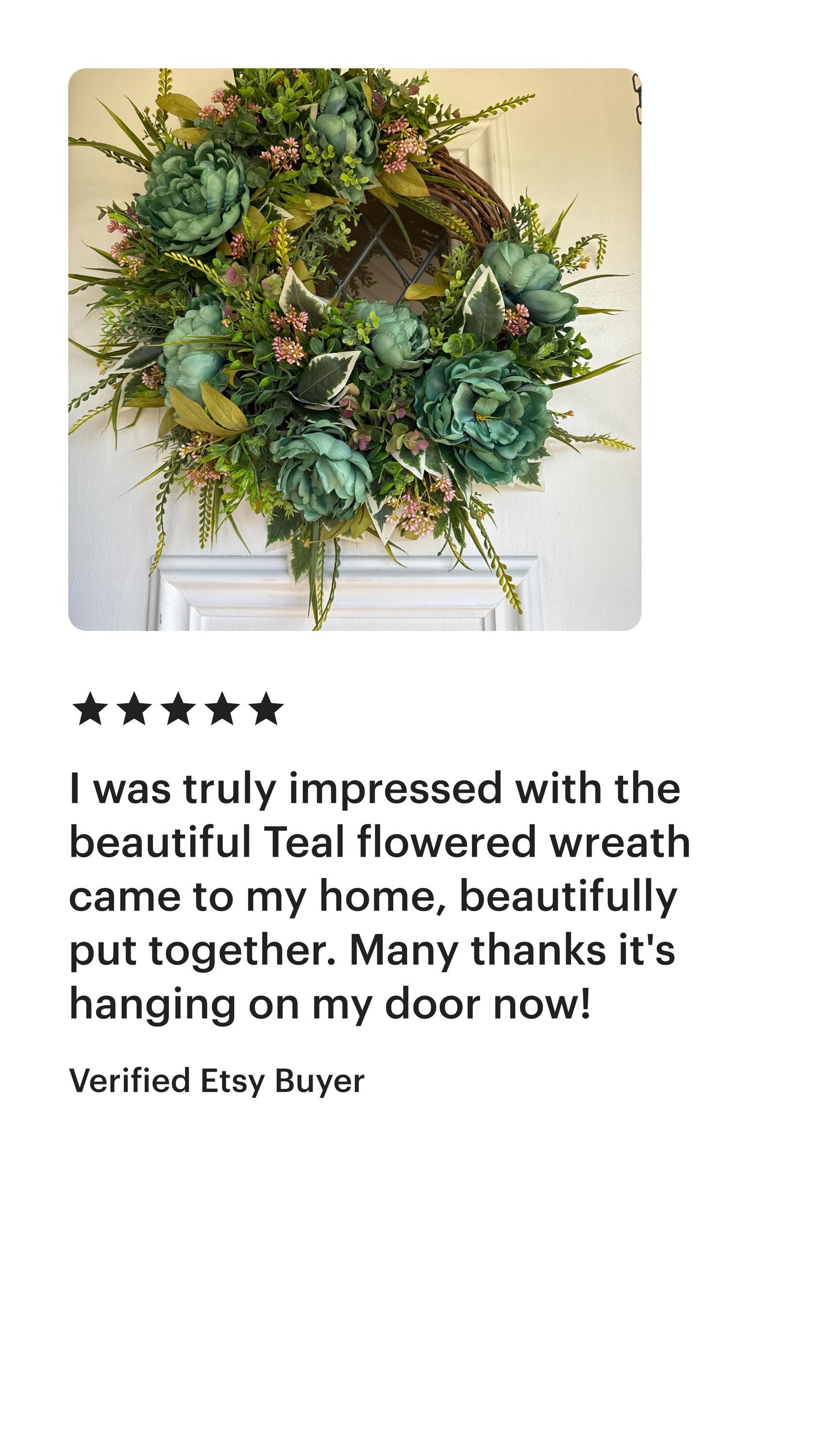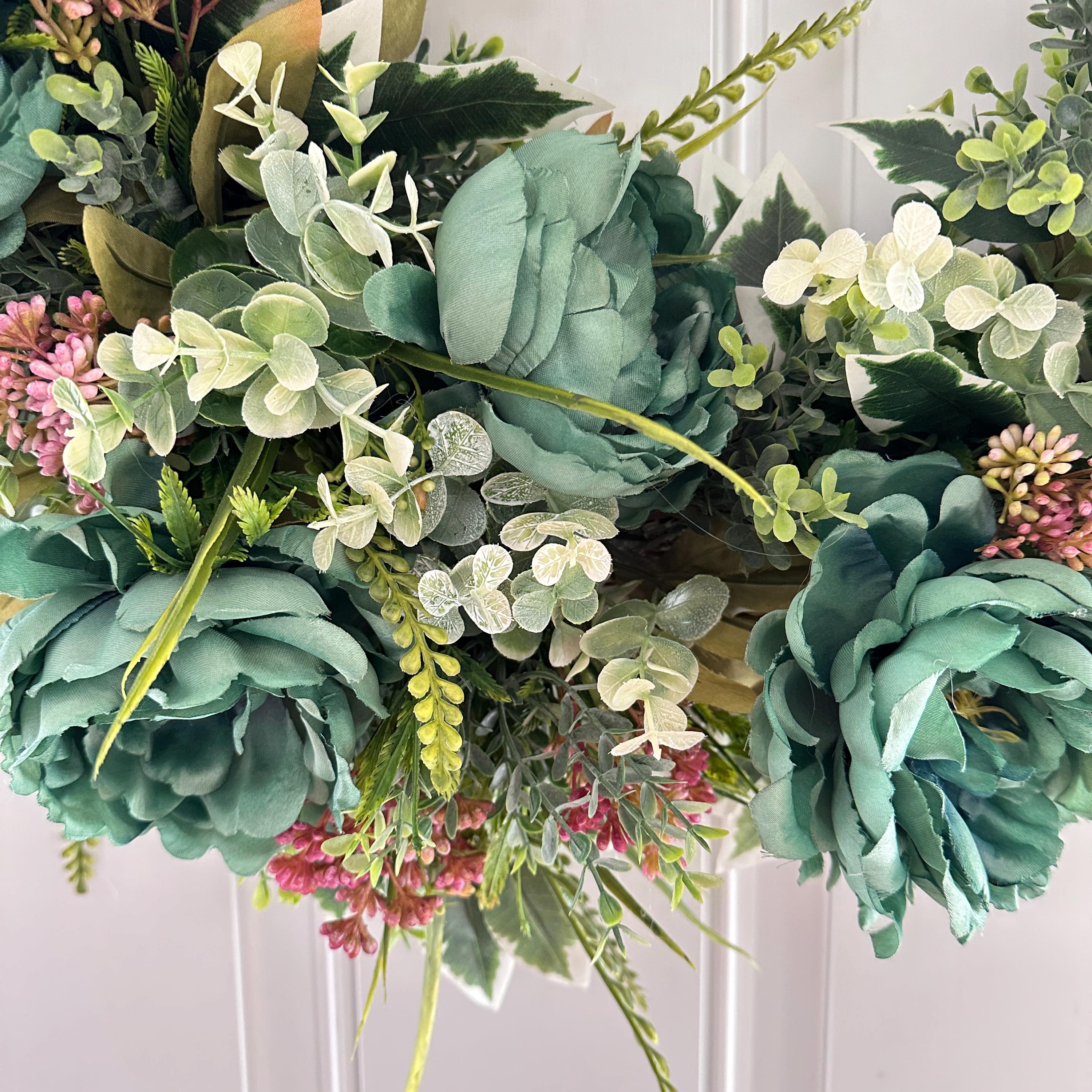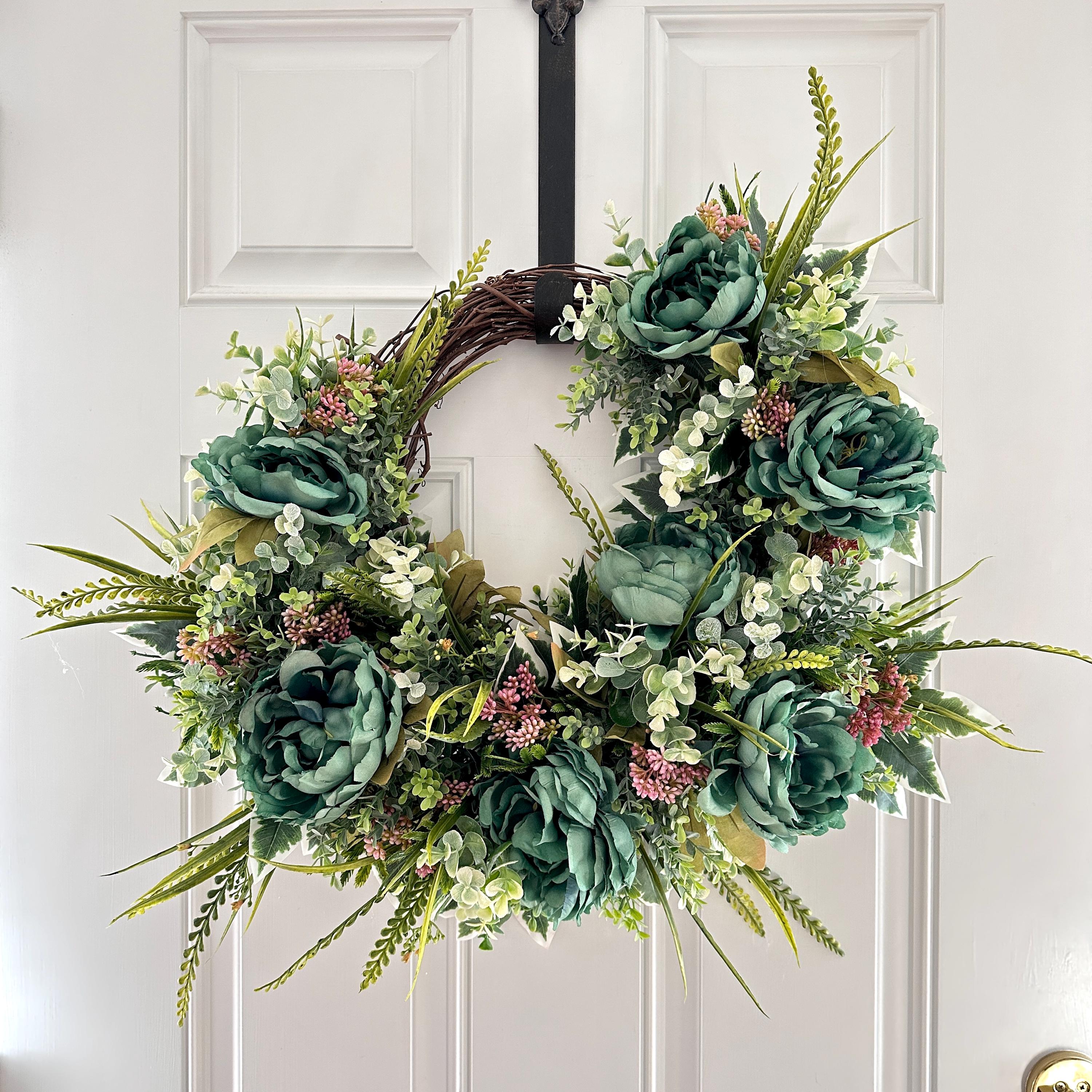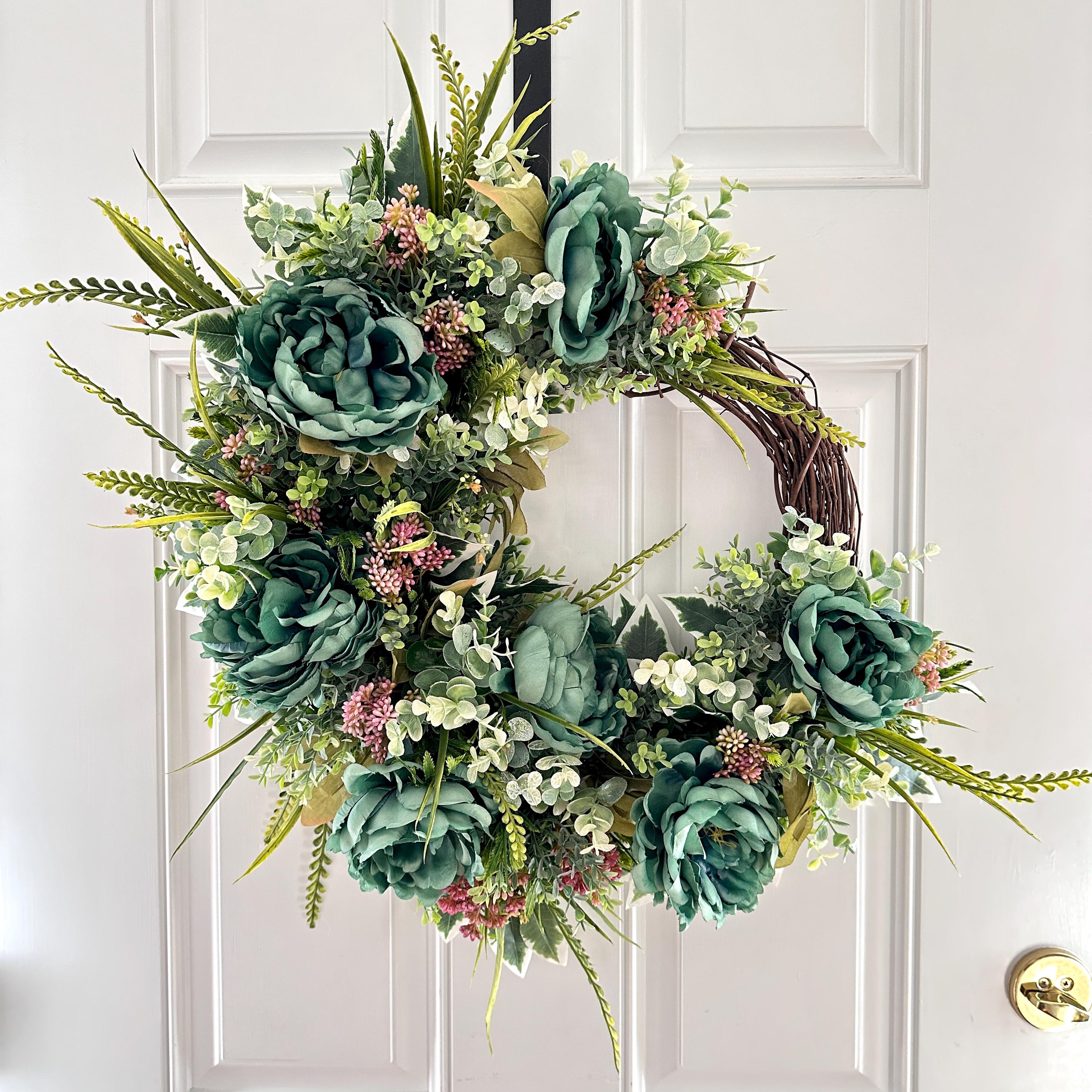 Lush teal peonies, button leaf saw grass greenery, and soft pink floral accents on a natural grapevine base. Perfect for spring, summer, or year-round display, this wreath adds a touch of elegance to any front door, entryway, or interior space. This wreath makes a wonderful gift for Mother's Day, birthdays, or new homeowners. It’s a unique way to bring warmth and charm to any home. Approximately 26" from leaf tip to leaf tip.