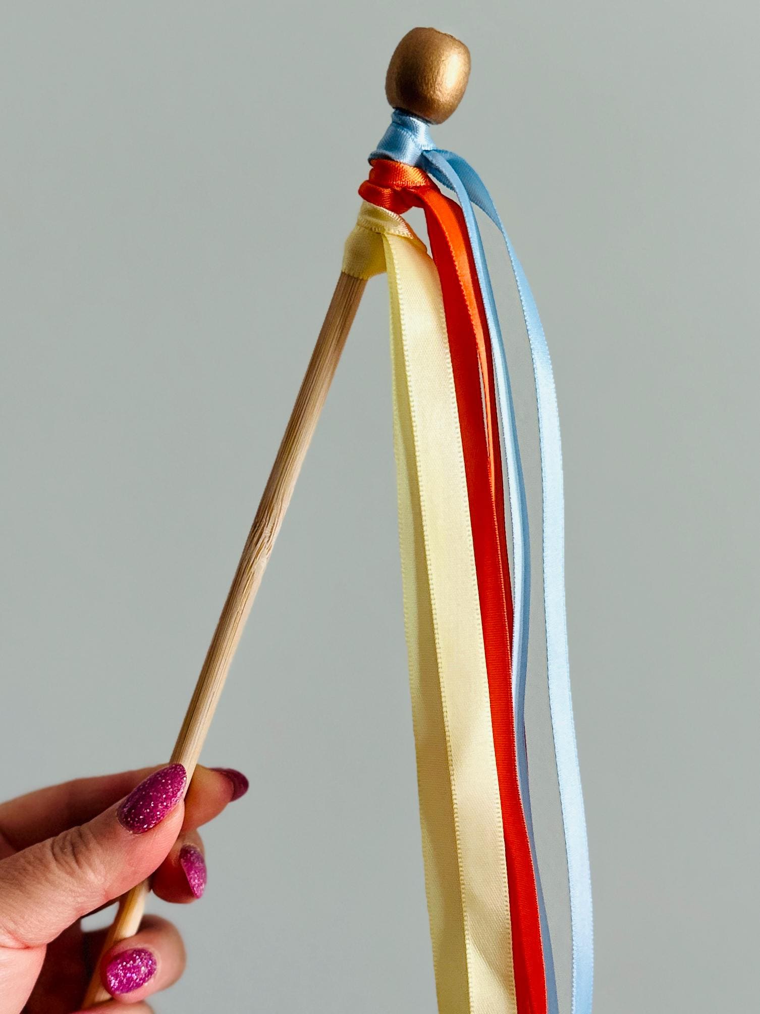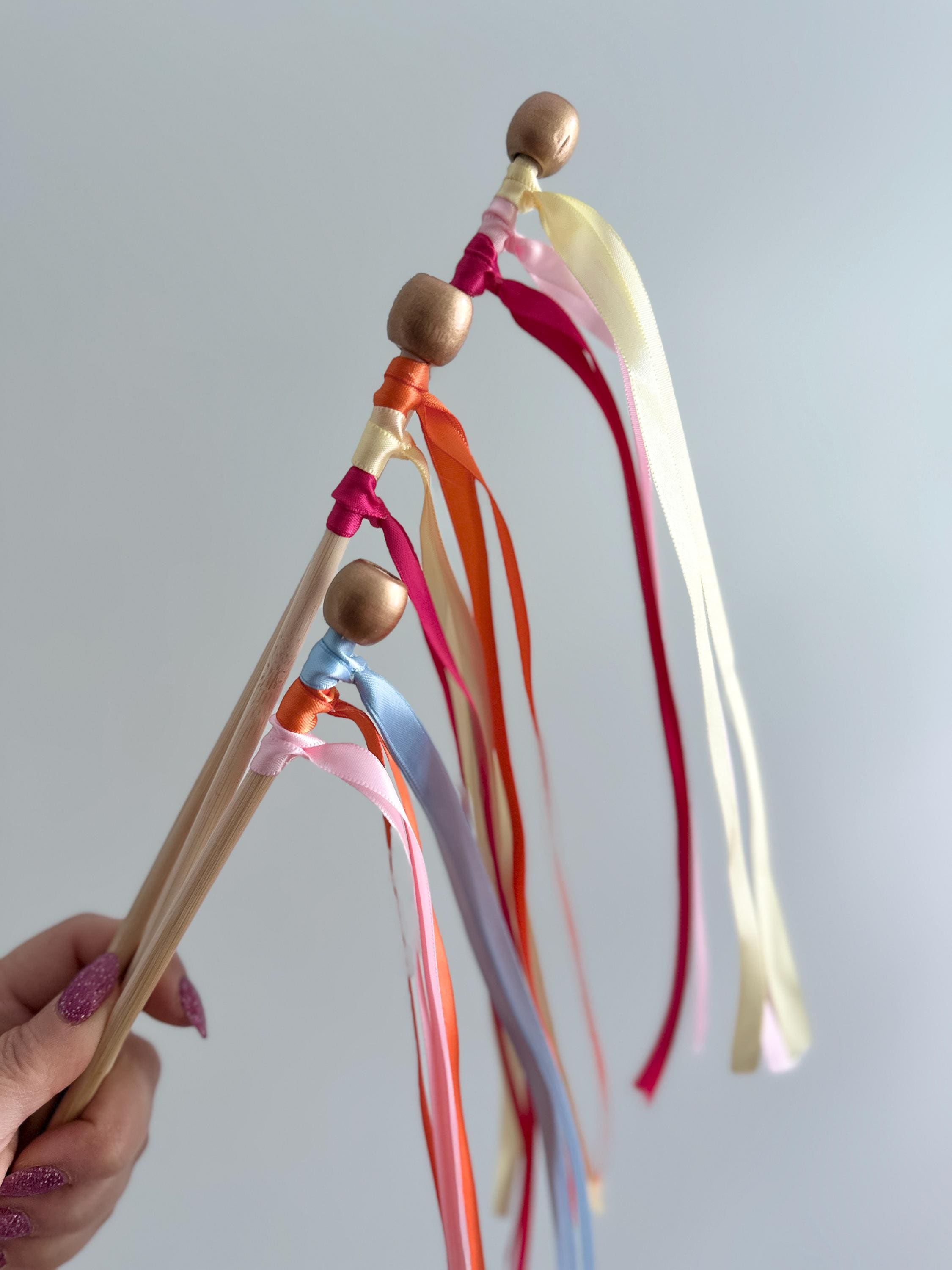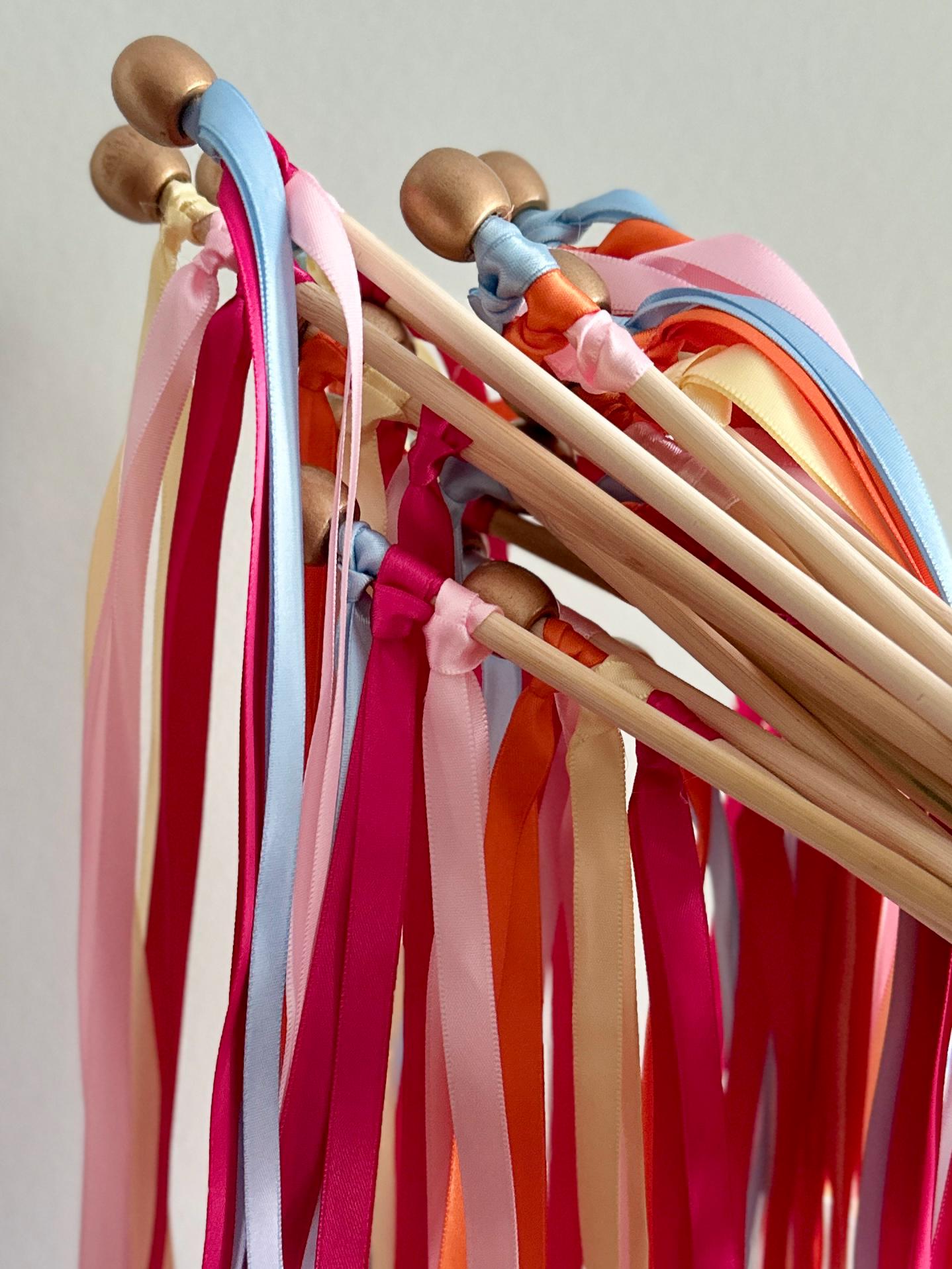Hand-tied and glued satin ribbons in bright, joyful colors