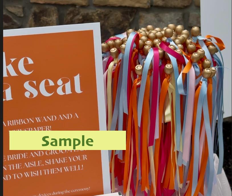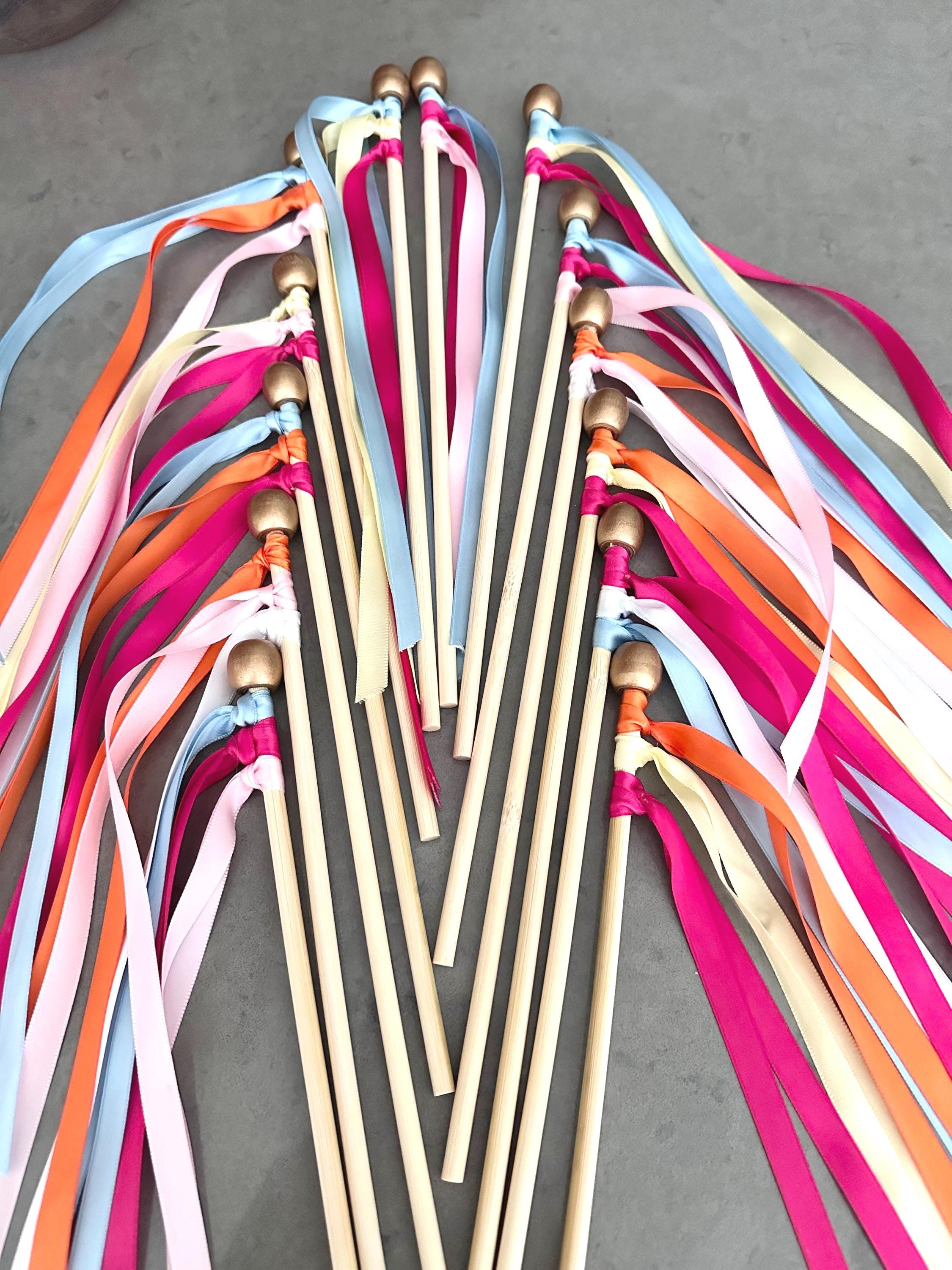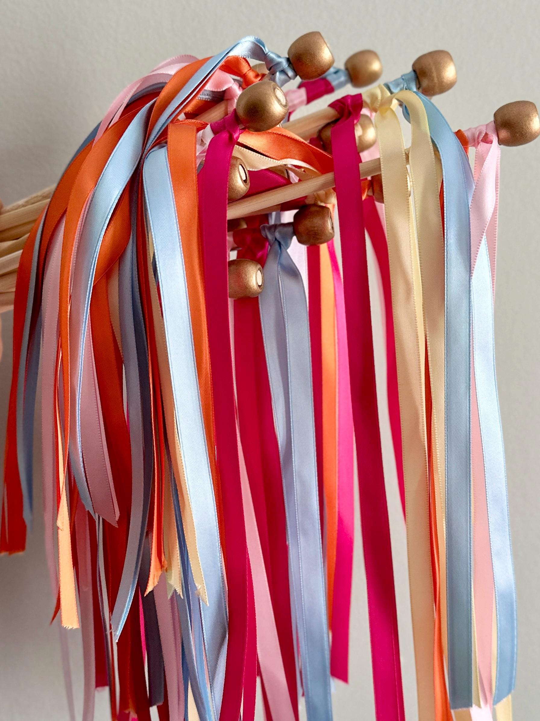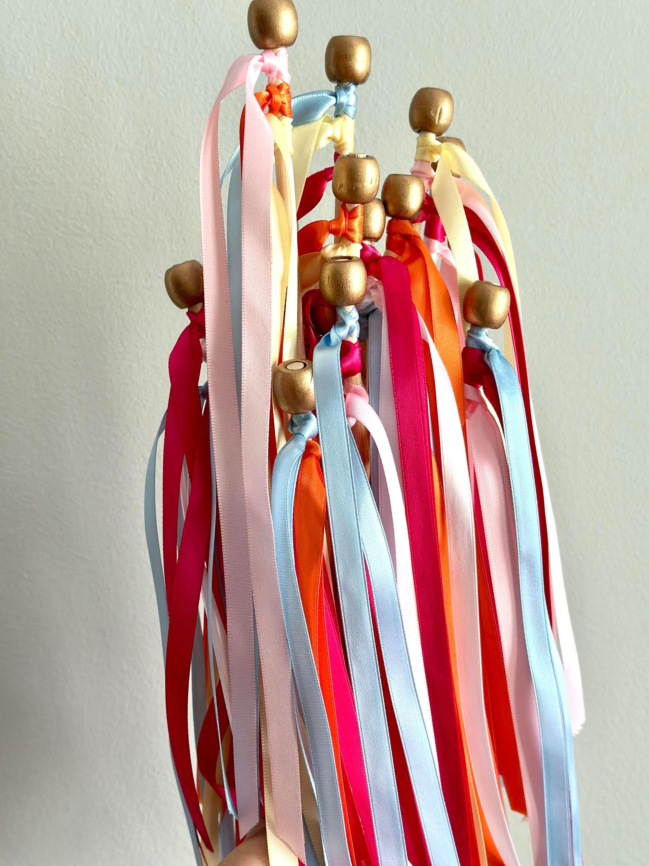 Celebrate with these vibrant wedding ribbon wands featuring satin streamers with gold tips. Perfect for wedding send-offs, birthday party favors and photo ops. These ribbon streamers add an elegant and fun flair to your event photos and memories. You'll receive random color selection SET of 10 wands.