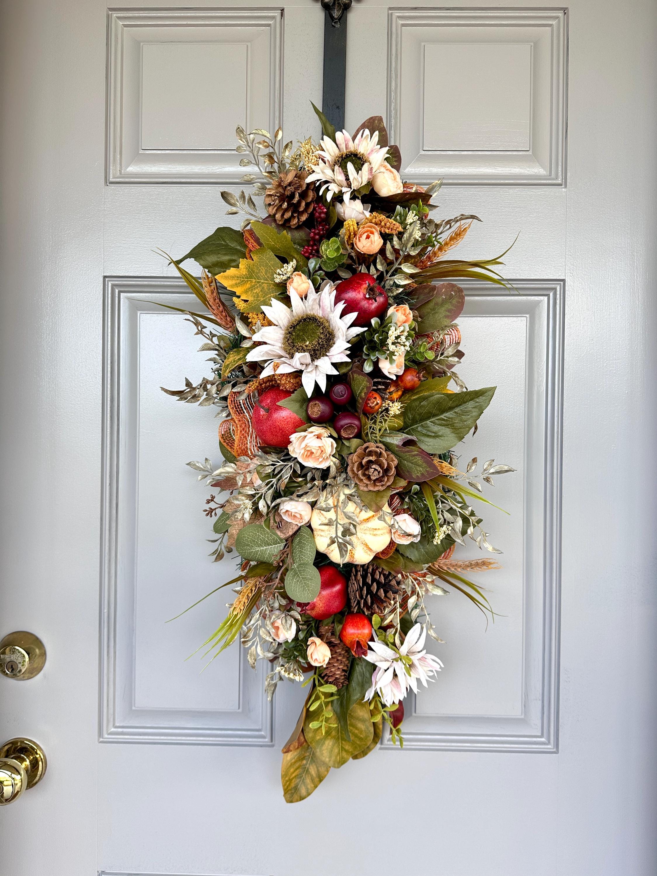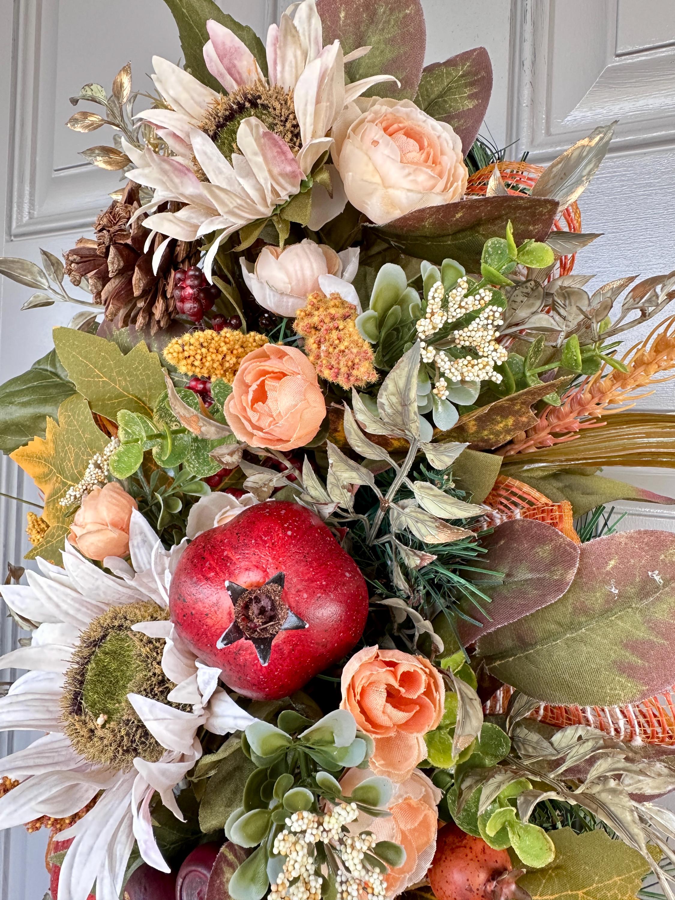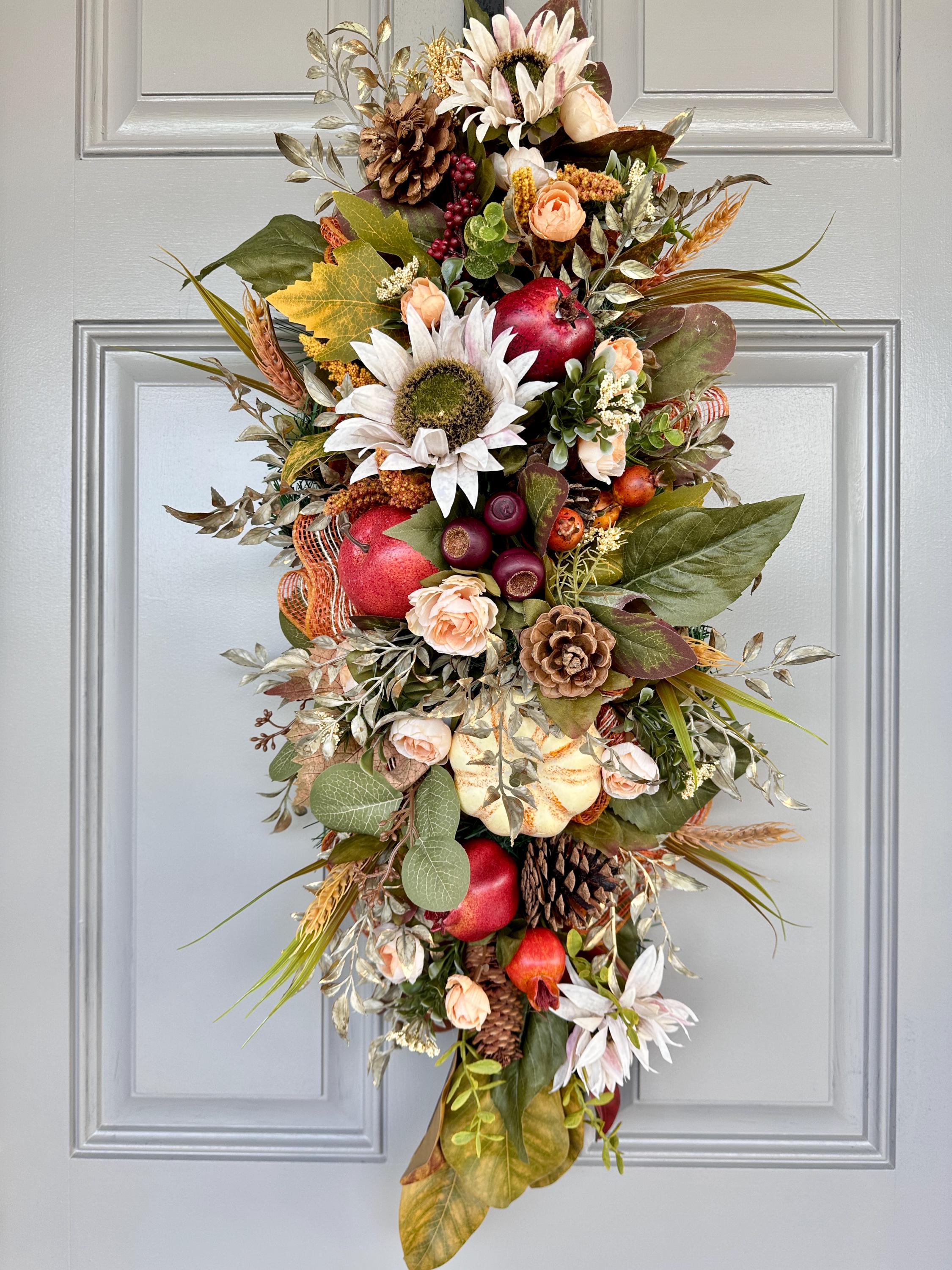Fall door swag designed to be an elegant alternative to the traditional wreath. Overflowing with lifelike florals and natural accents, this vertical swag features creamy sunflowers, realistic pomegranates, rustic pinecones, autumn leaves, pumpkins, and textured greenery. Approximately 30-inches long.