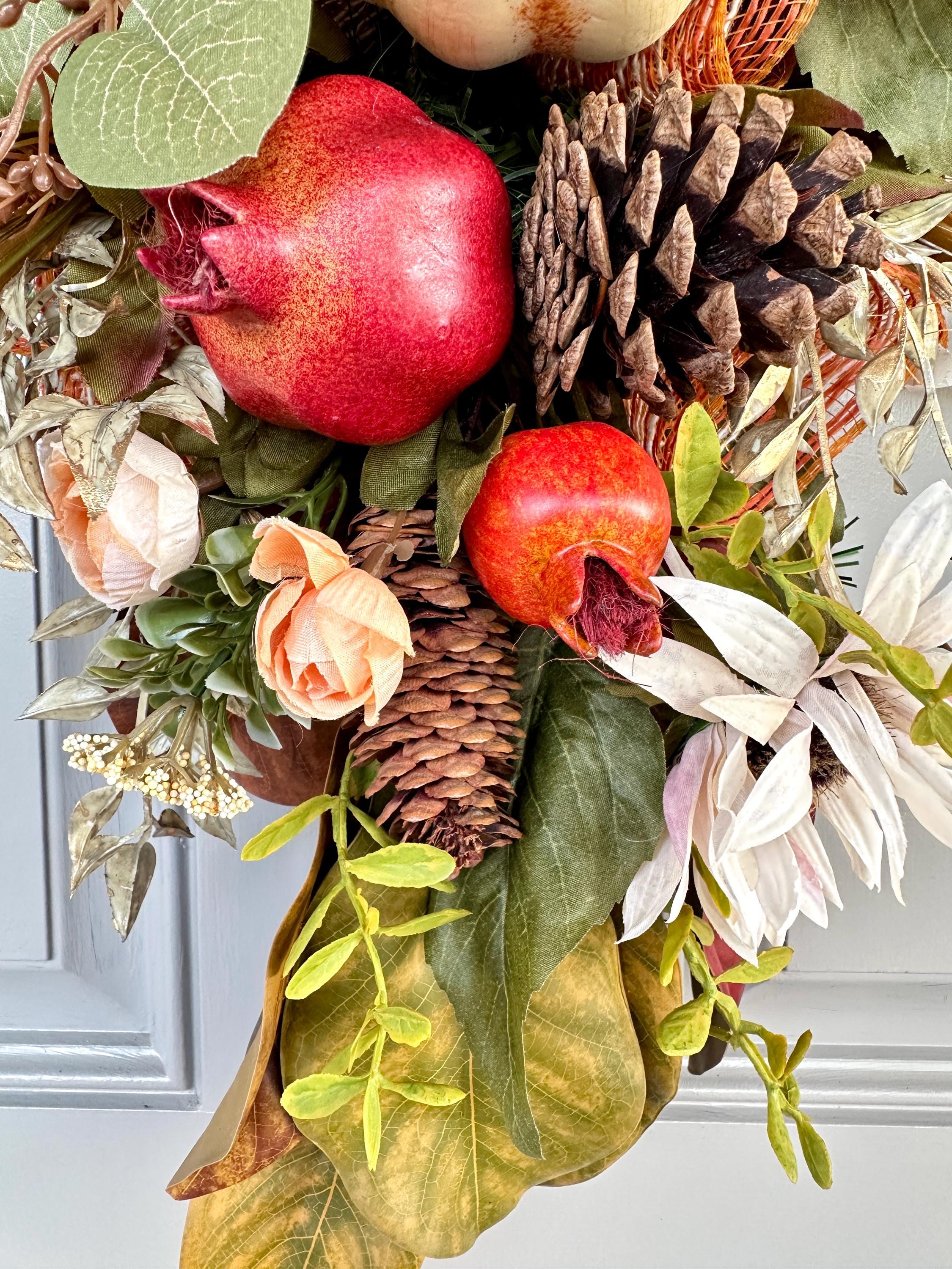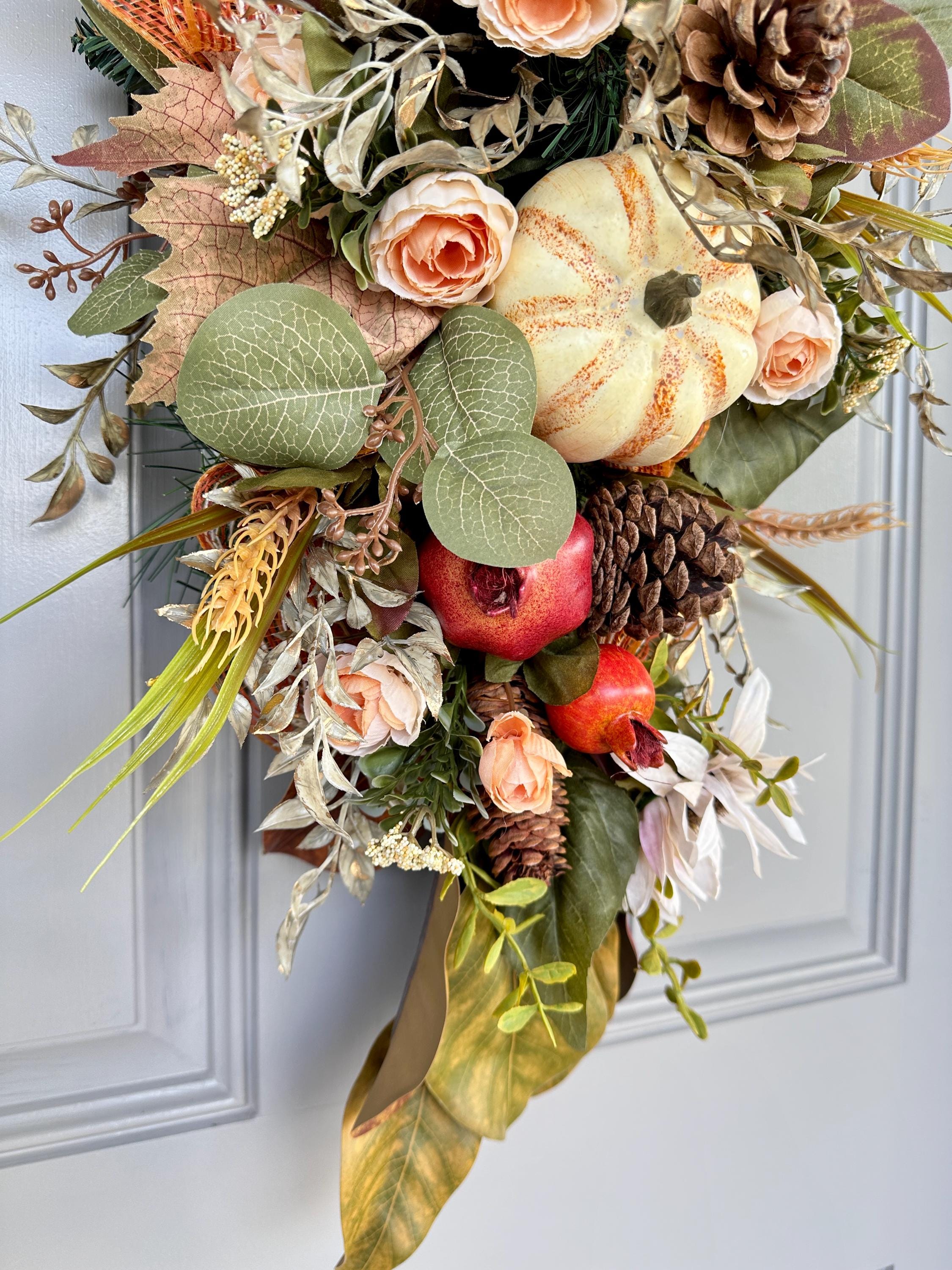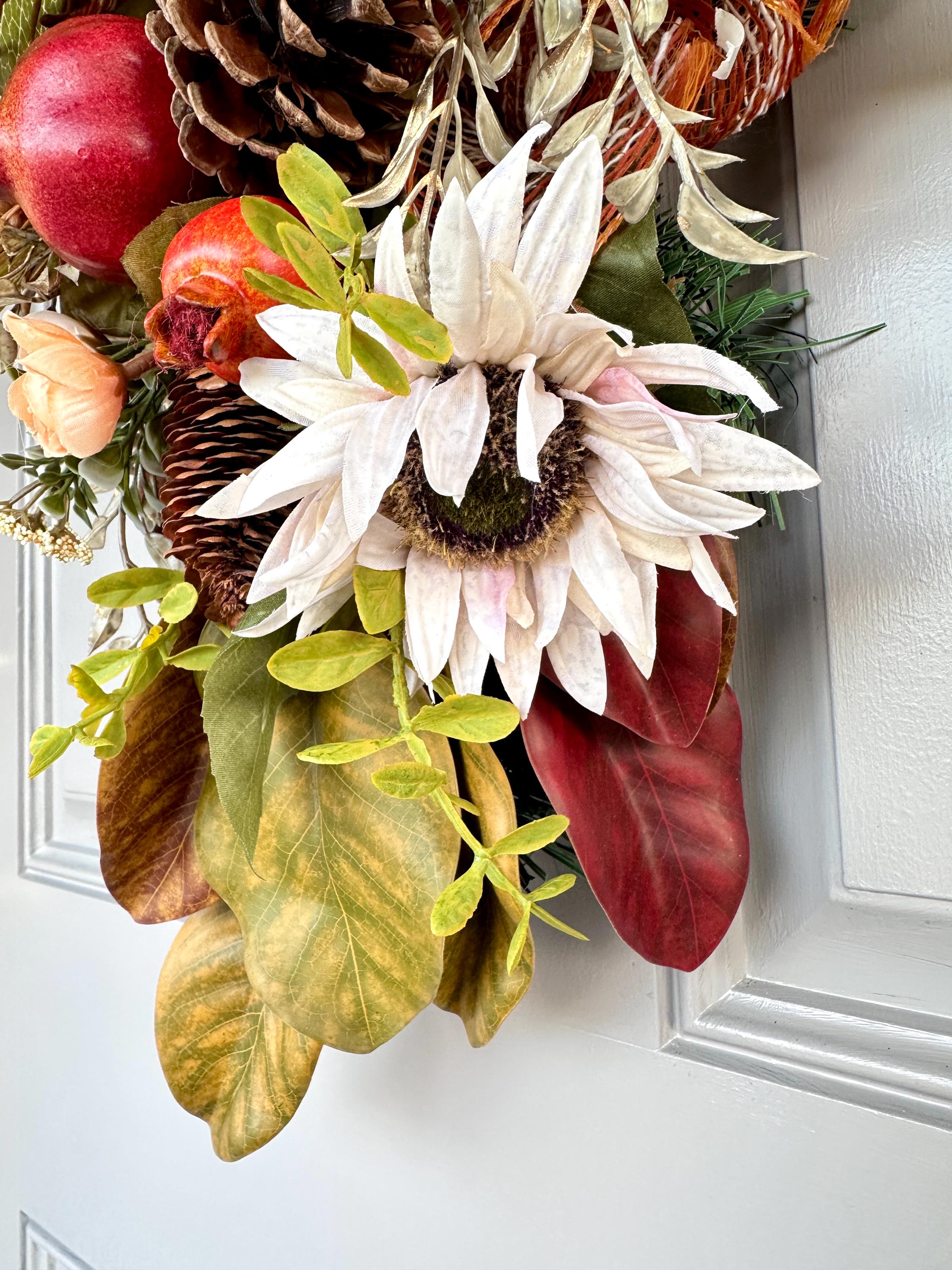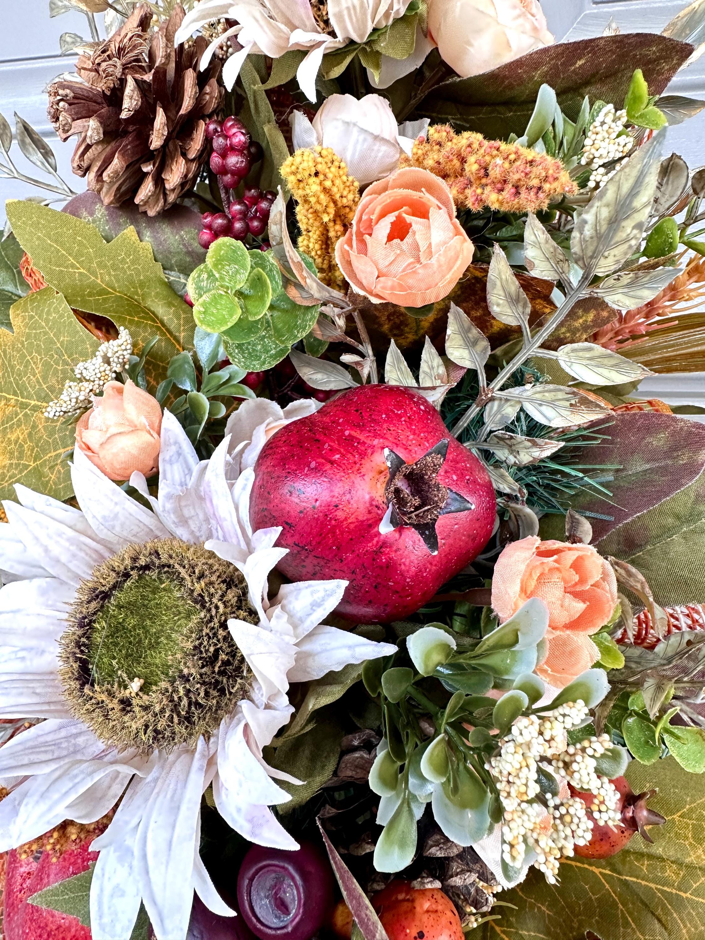 Fall door swag designed to be an elegant alternative to the traditional wreath. Overflowing with lifelike florals and natural accents, this vertical swag features creamy sunflowers, realistic pomegranates, rustic pinecones, autumn leaves, pumpkins, and textured greenery. Approximately 30-inches long.