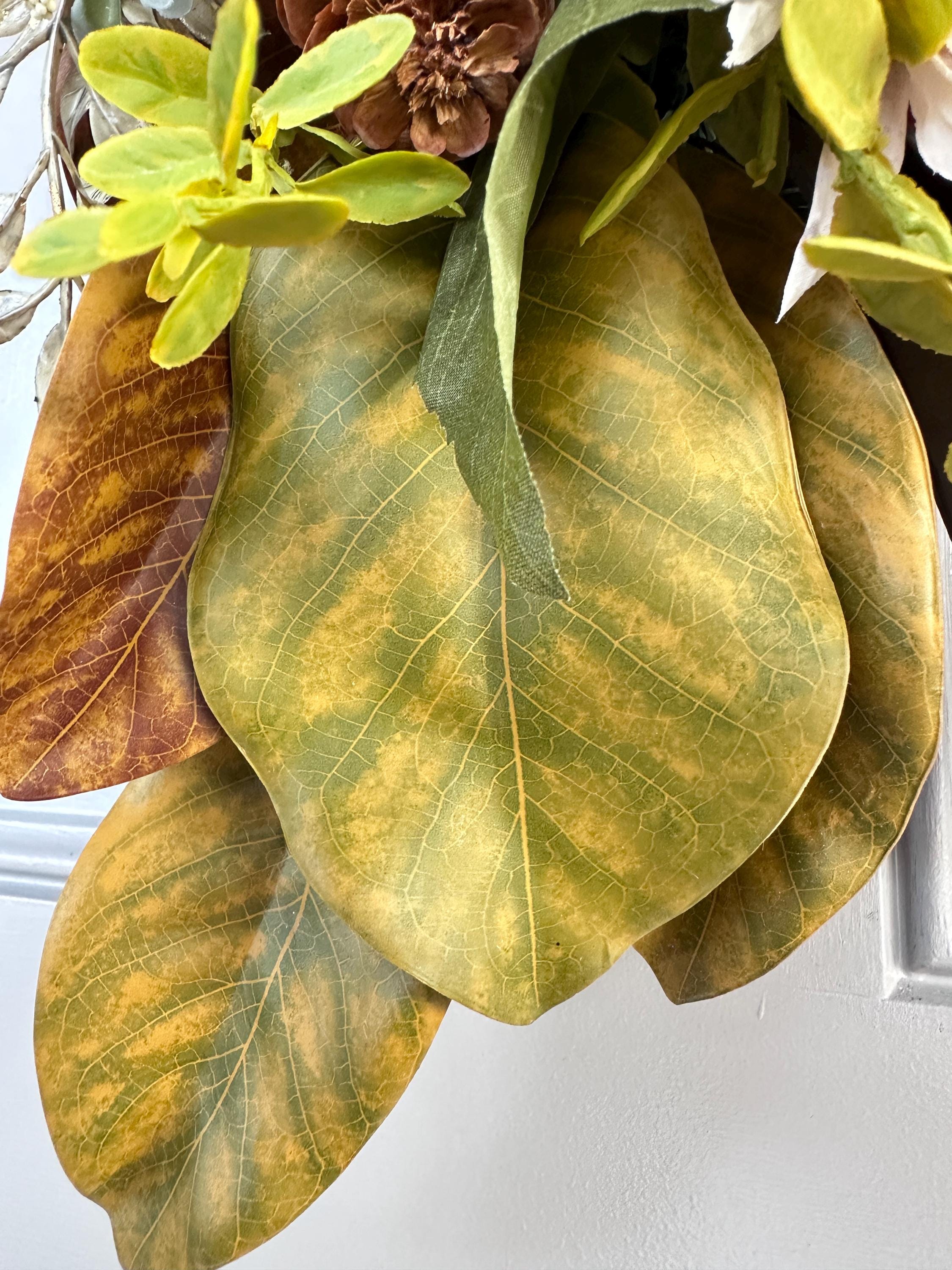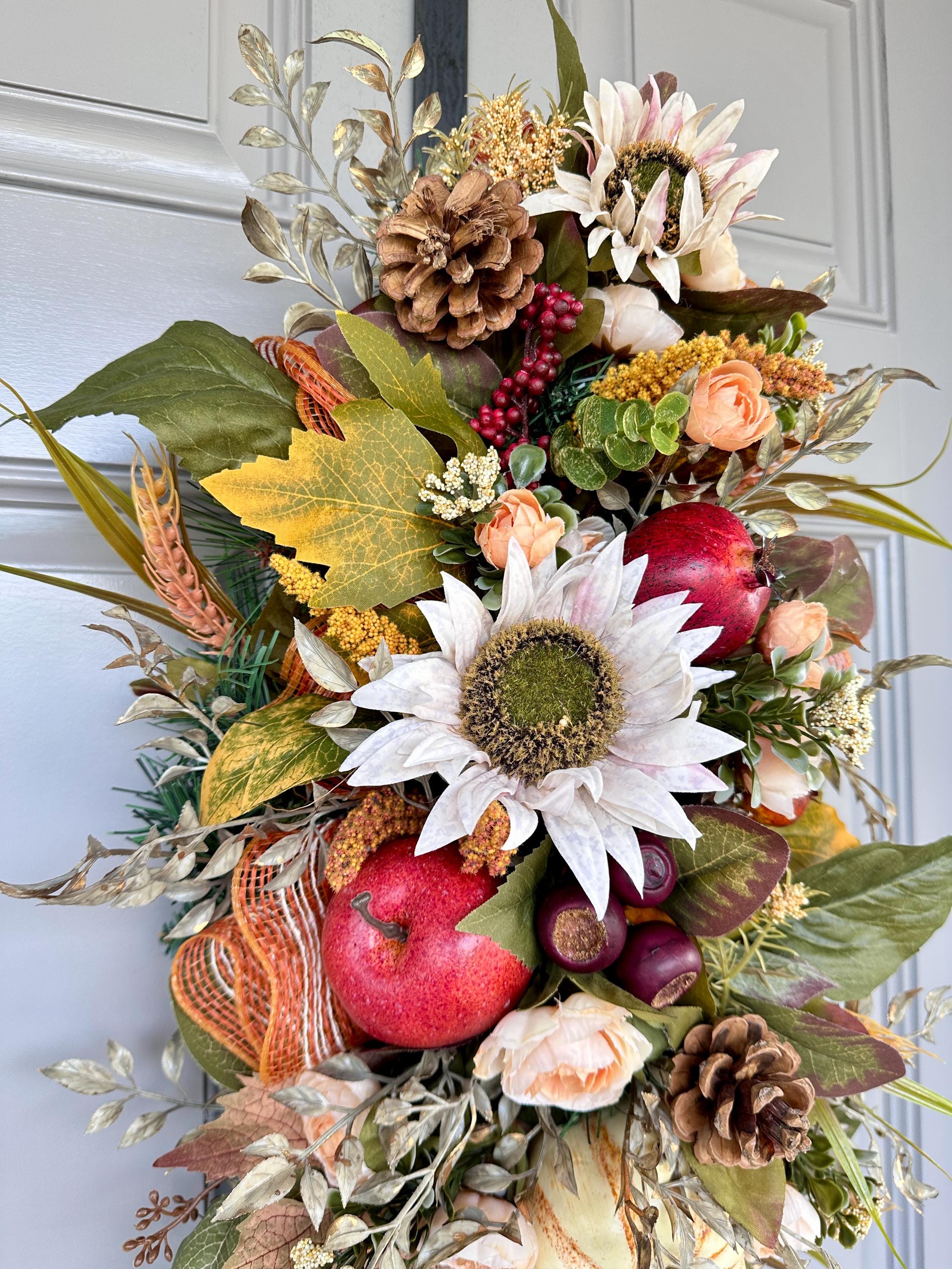 Beautiful autumn swag with fruit and sunflowers that’s very well made. Arrived carefully packaged.