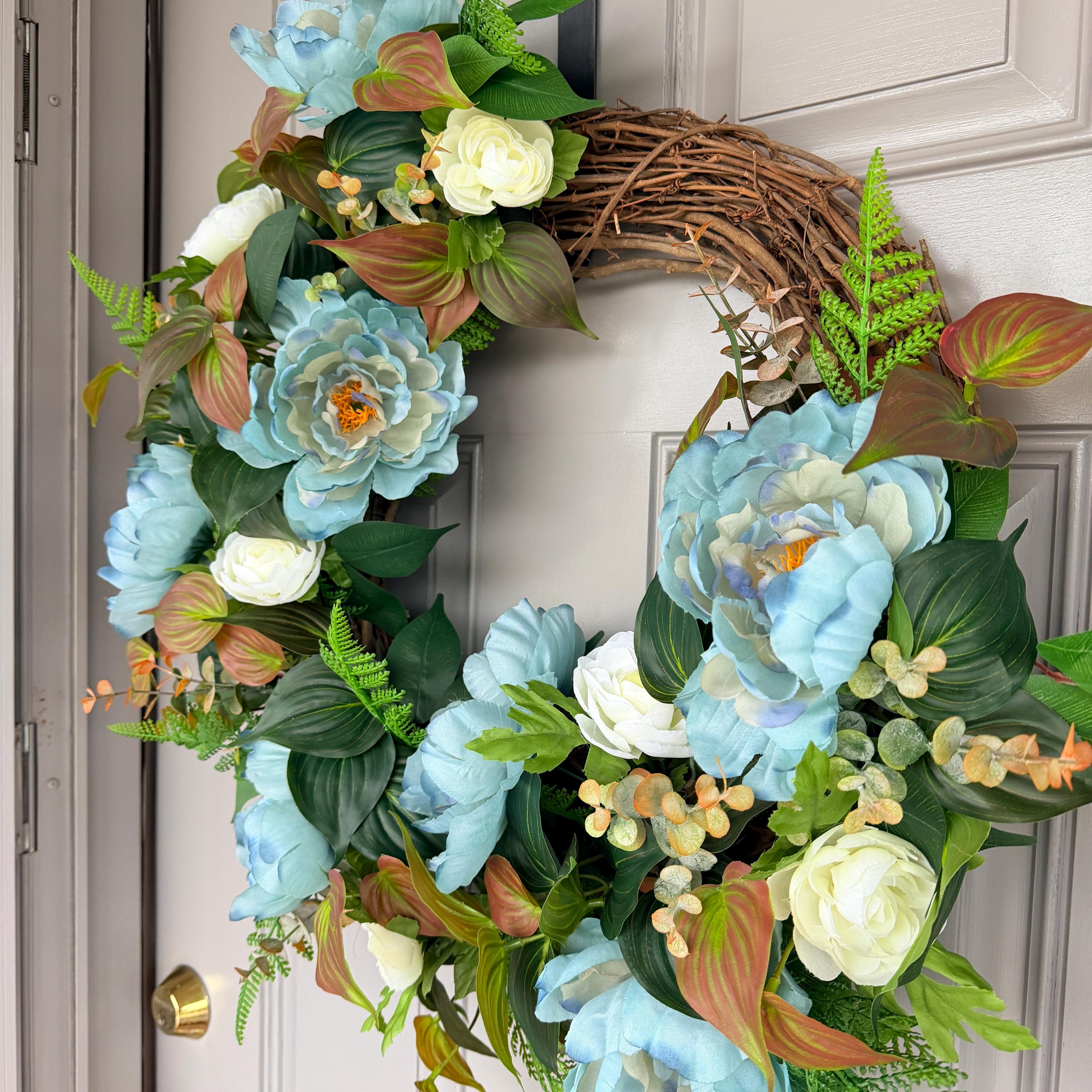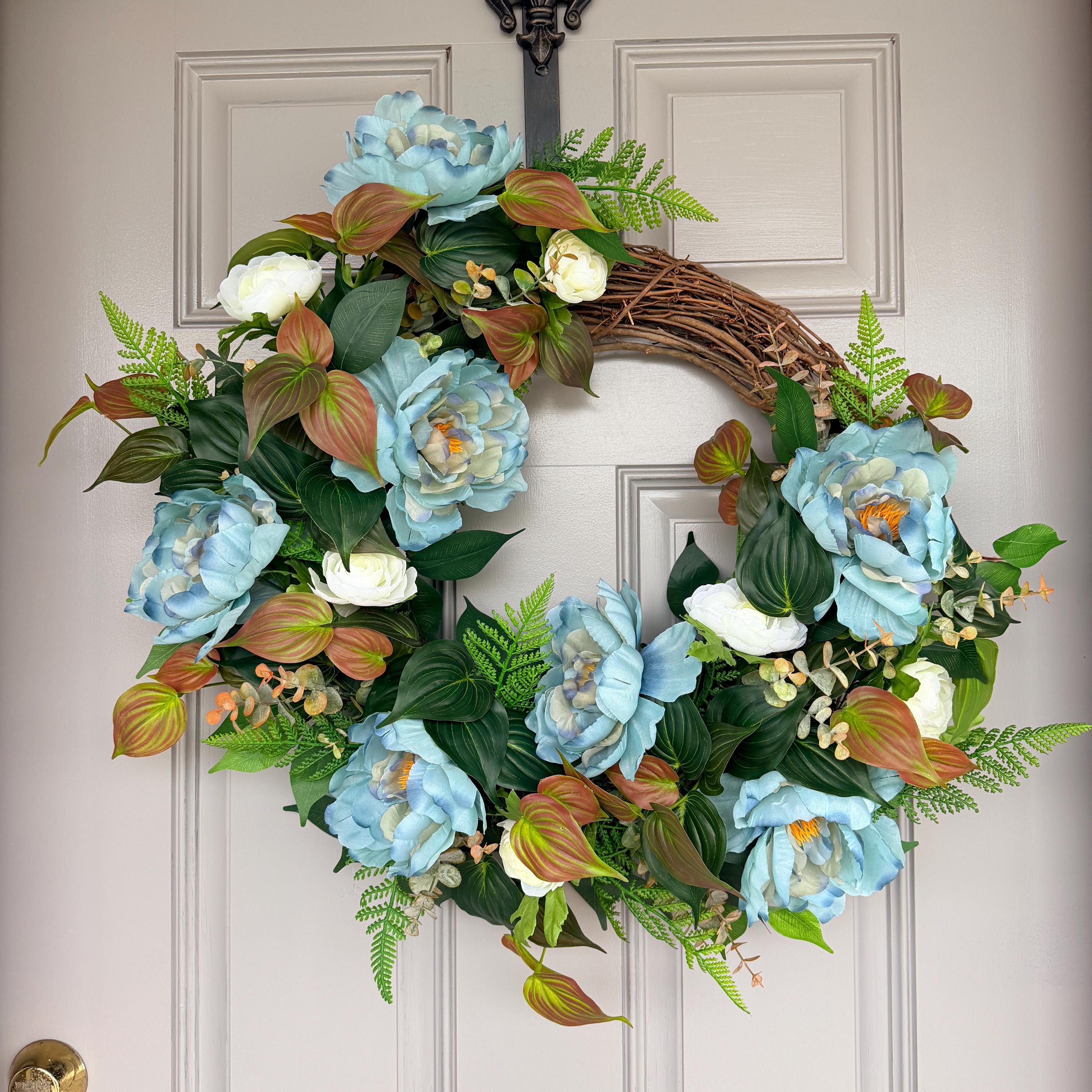 Blue peonies with creamy white ranunculus and layered greenery arranged on a natural grapevine base. Its calming color palette and full design make it a timeless choice for spring, summer, and everyday décor. A rare one of a kind. Pictured on a standard-sized front door; 25-inches across.