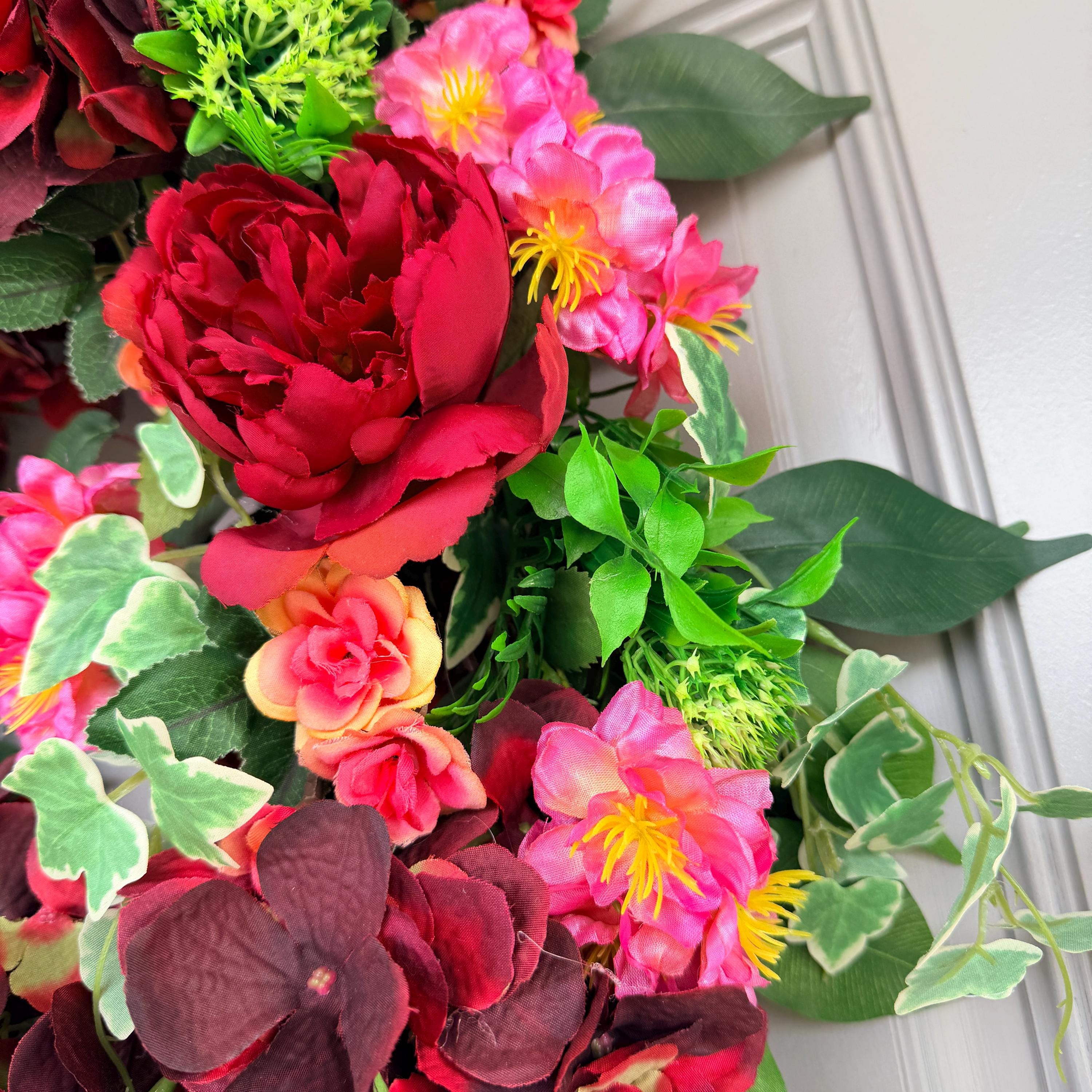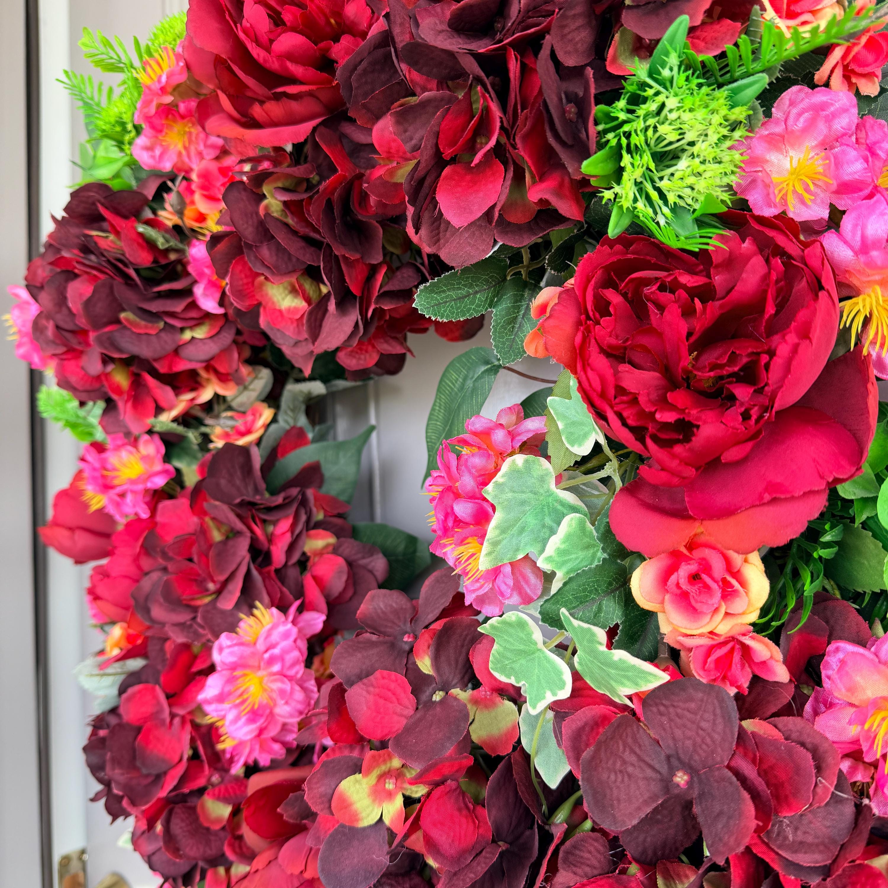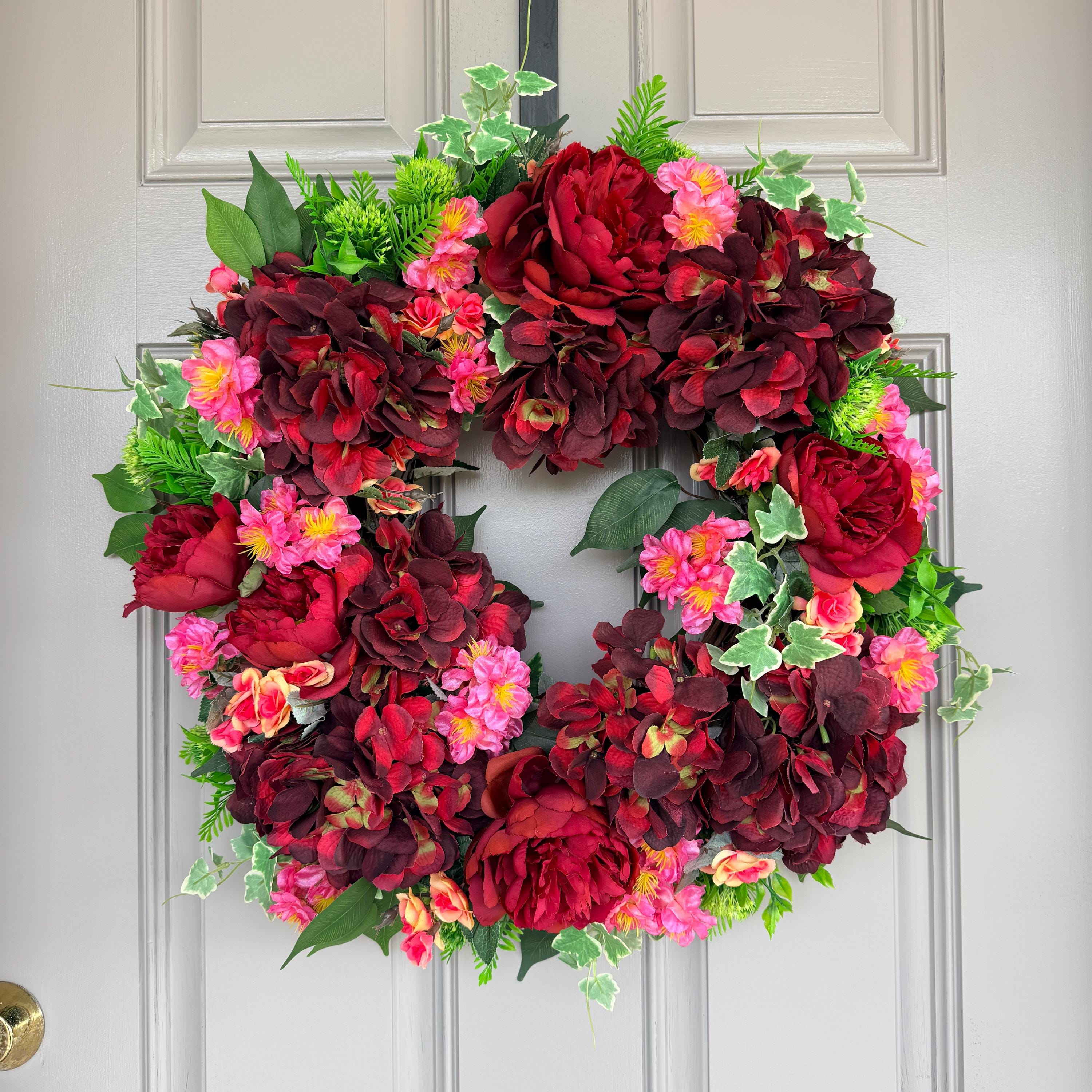 Deep burgundy peonies, soft pink blossoms, and layered greenery for a full, romantic look. Rare, one of a kind, designed with care and attention to detail, it brings warmth and elegance; perfect for spring, summer, or year-round display, making a beautiful statement for everyday décor, weddings, anniversaries, housewarmings, or thoughtful gifting. 23" across; pictured on a standard sized front door.